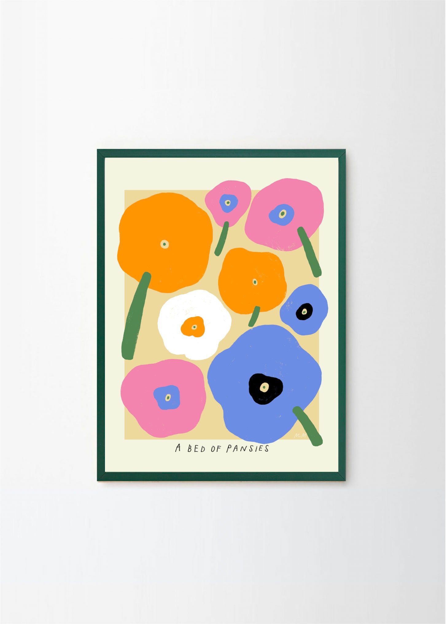 The artwork A Bed Of Pansies by Madelen Möllard depicts blue, pink and orange pansies. The colors makes it perfect for a walnut or green colored frame, with or without passepartout.