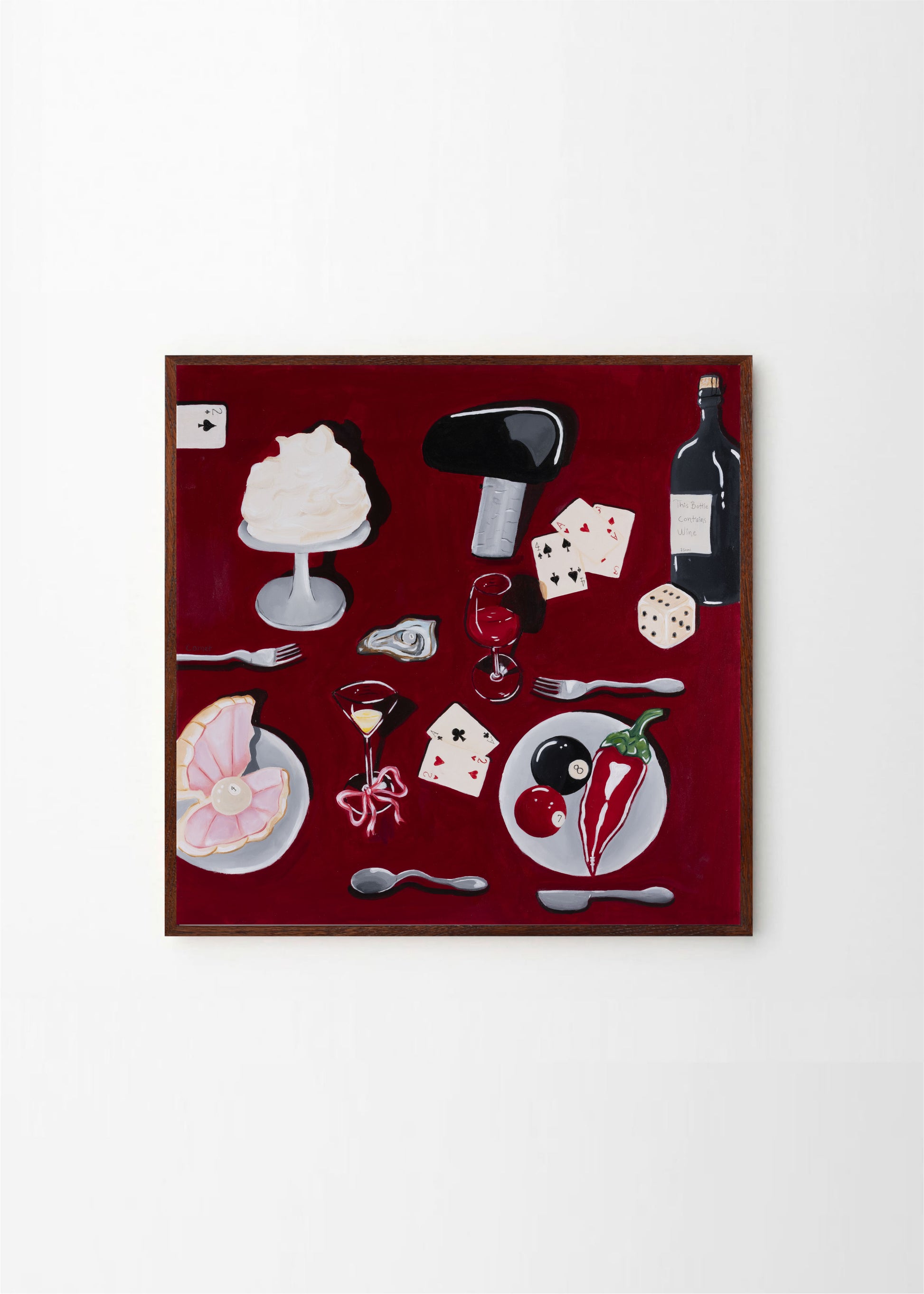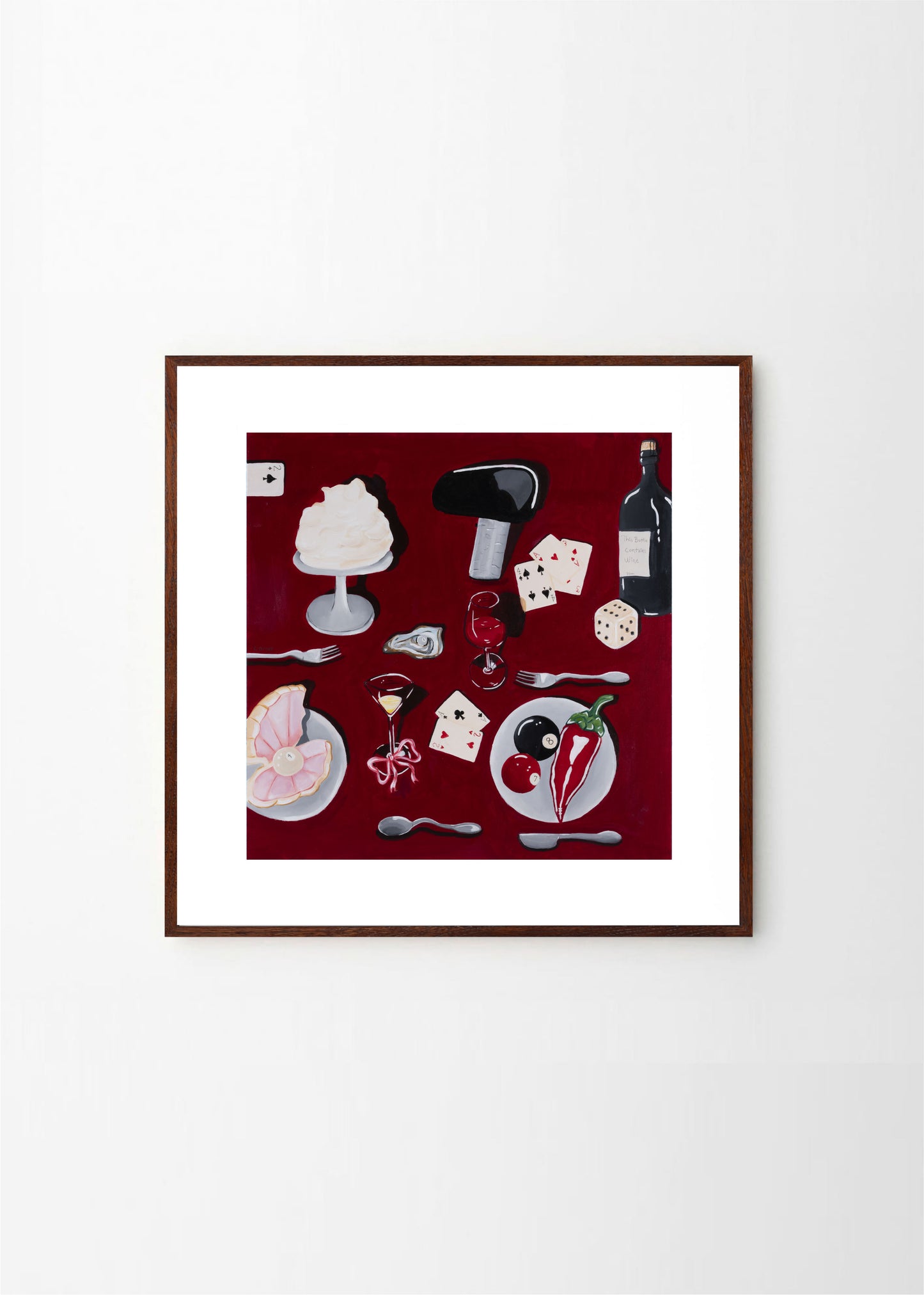The square artwork A Night to Remember by Moa Comet depicts a fruit dinner as it should look. The red and black colors makes it perfect for a black or walnut frame, with or without passepartout.
