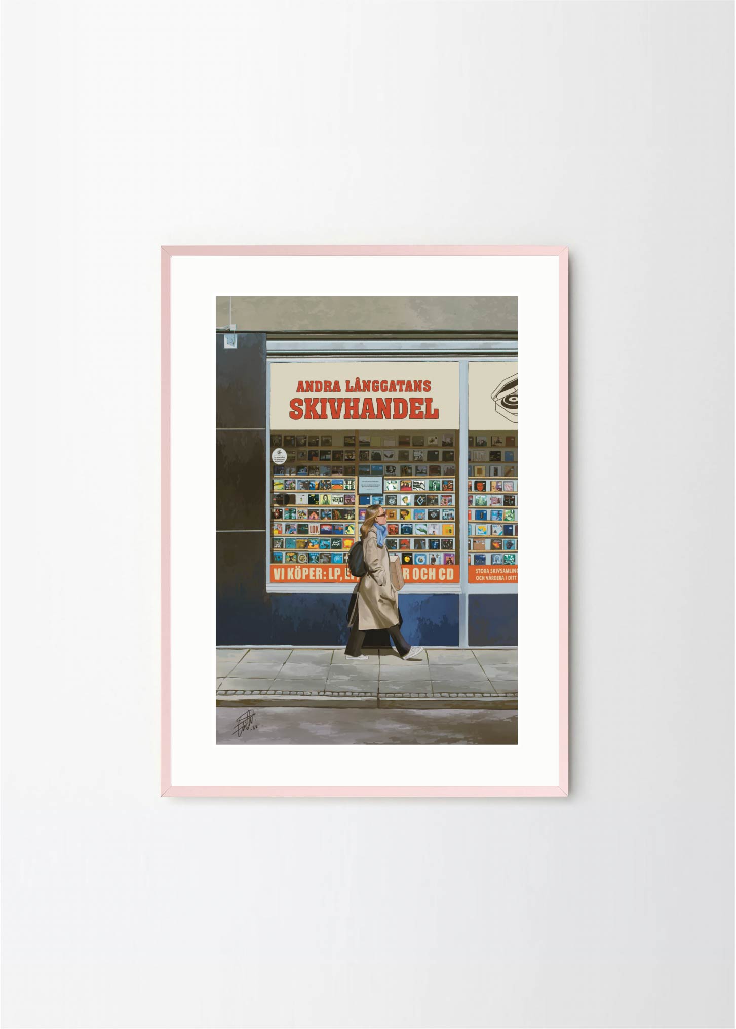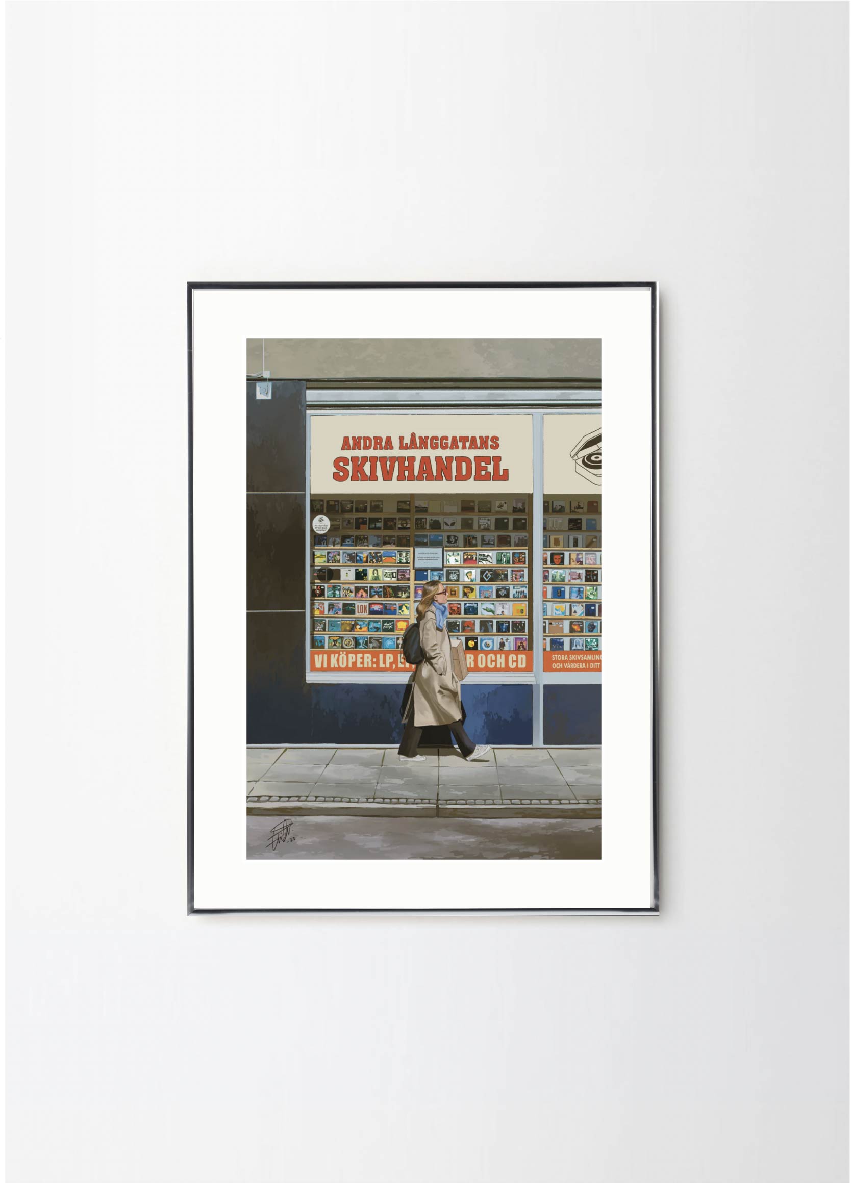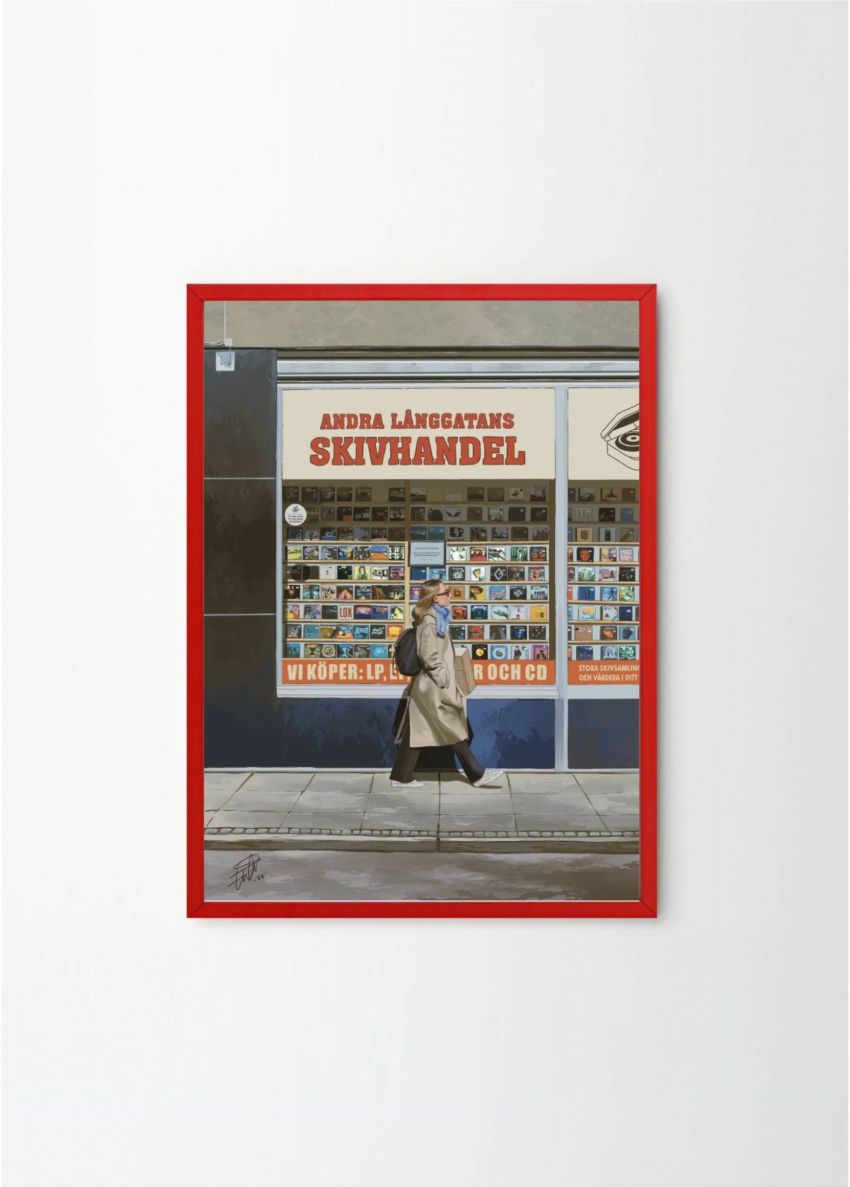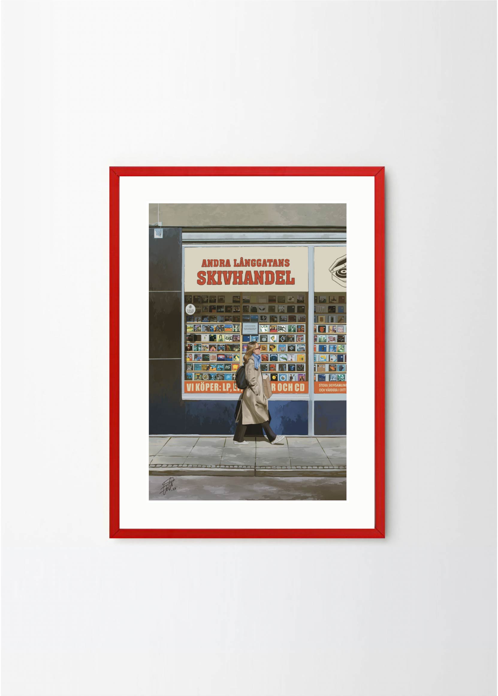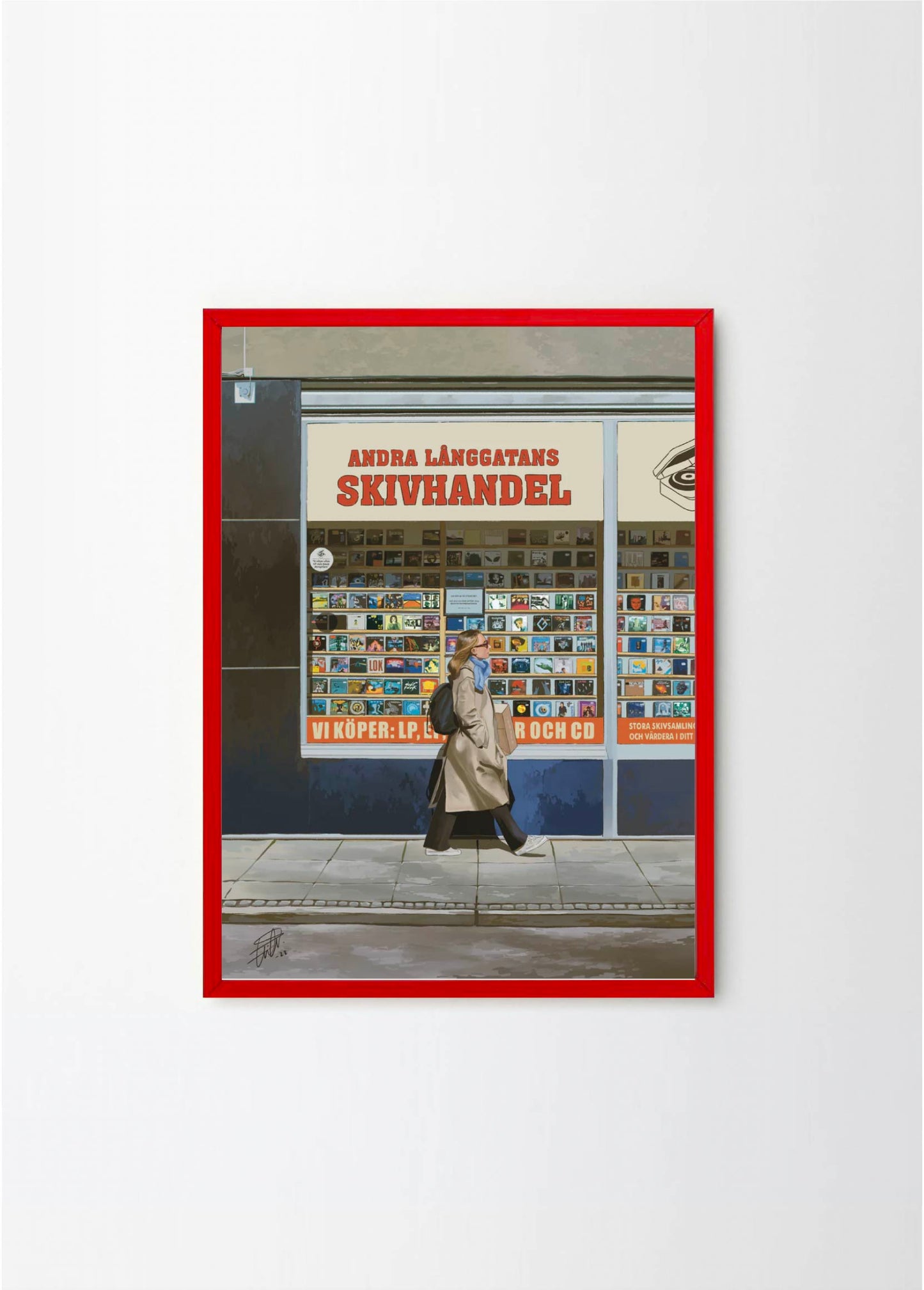 This artwork depicts a girl walking in front of the vinyl shop at Andra Långgatan in Gothenburg. The lovely red and grey colors makes it perfect for a red or black frame , with or without a passepartout.