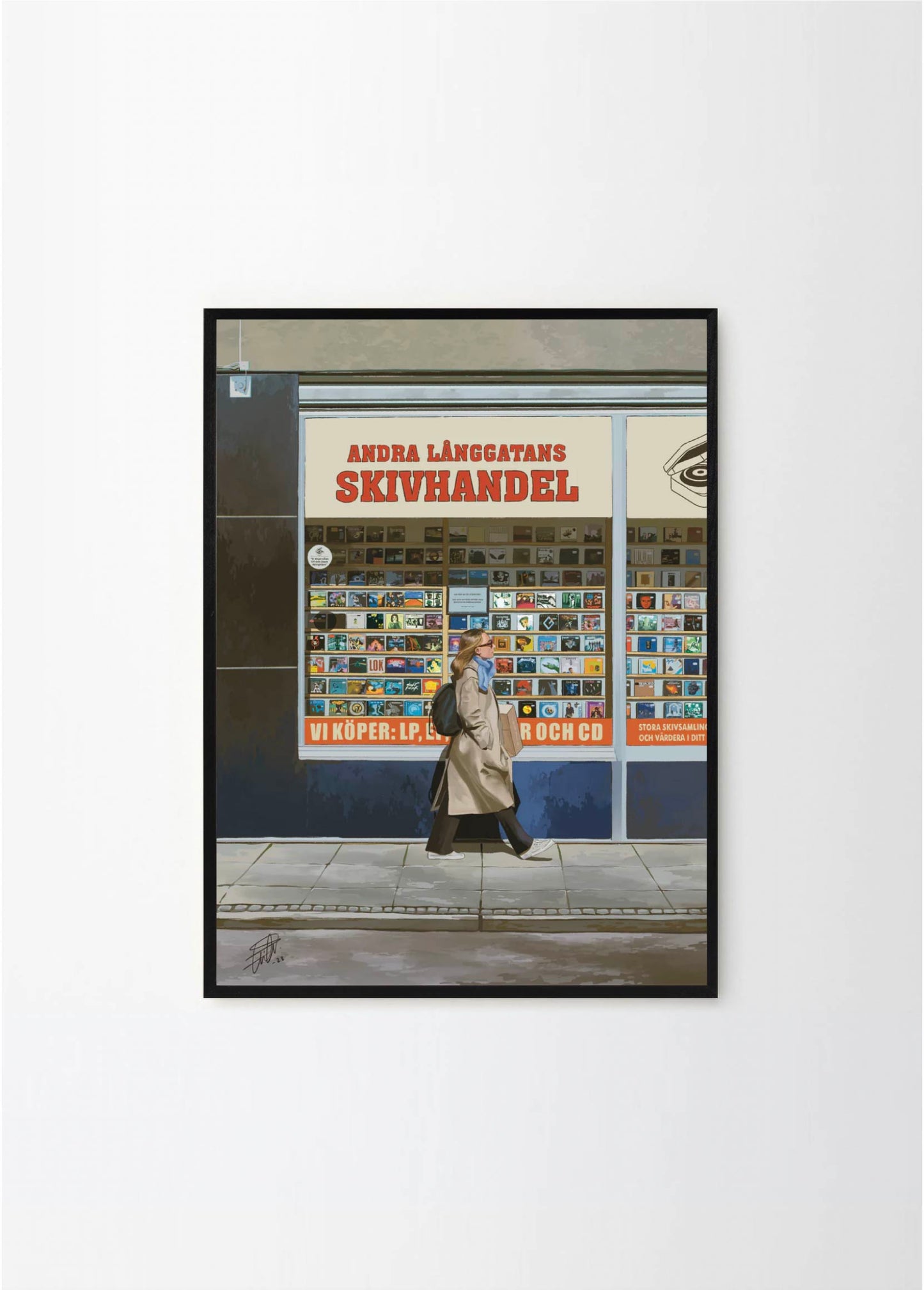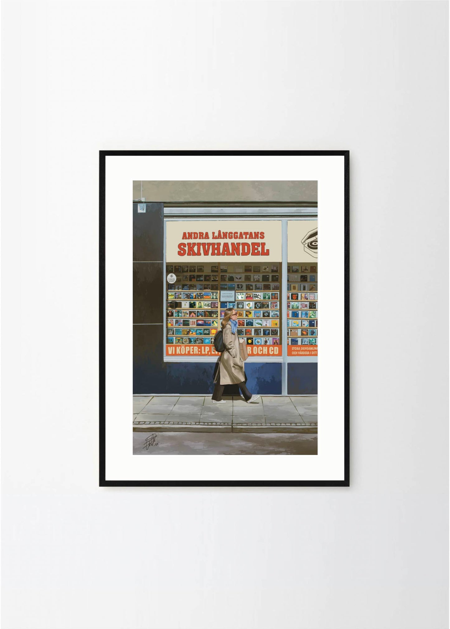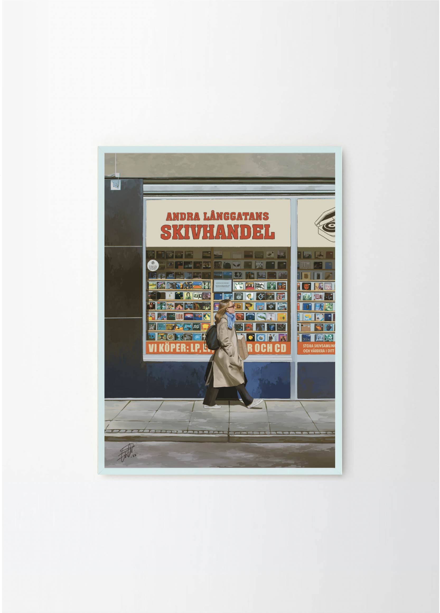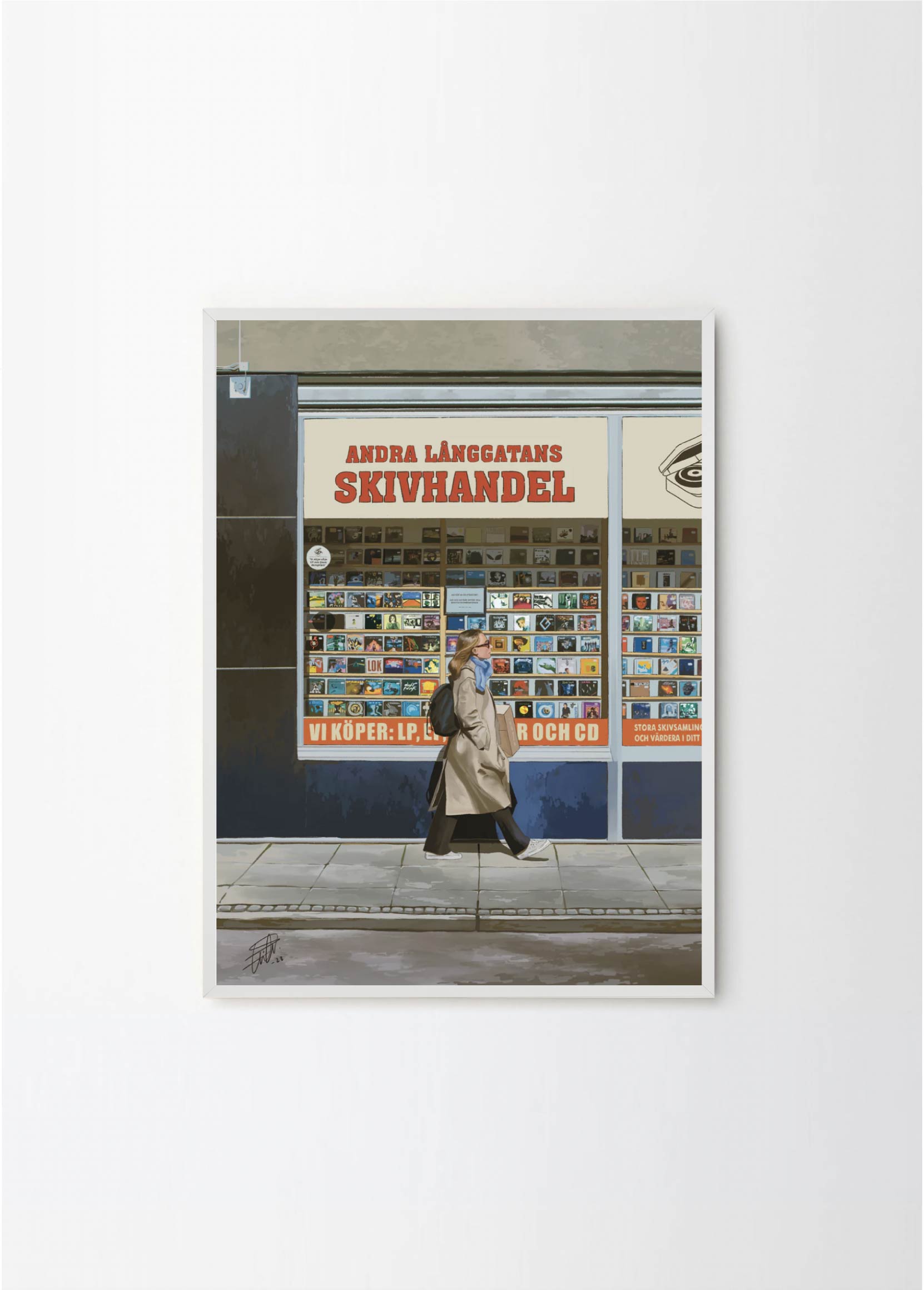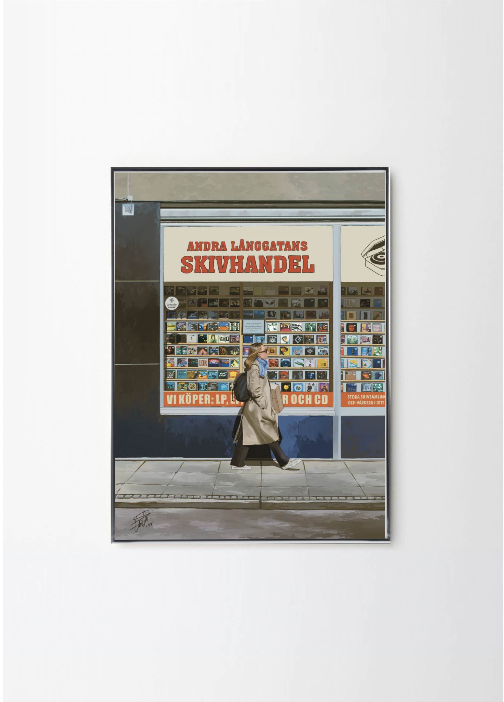 This artwork depicts a girl walking in front of the vinyl shop at Andra Långgatan in Gothenburg. The lovely red and grey colors makes it perfect for a red or black frame , with or without a passepartout.