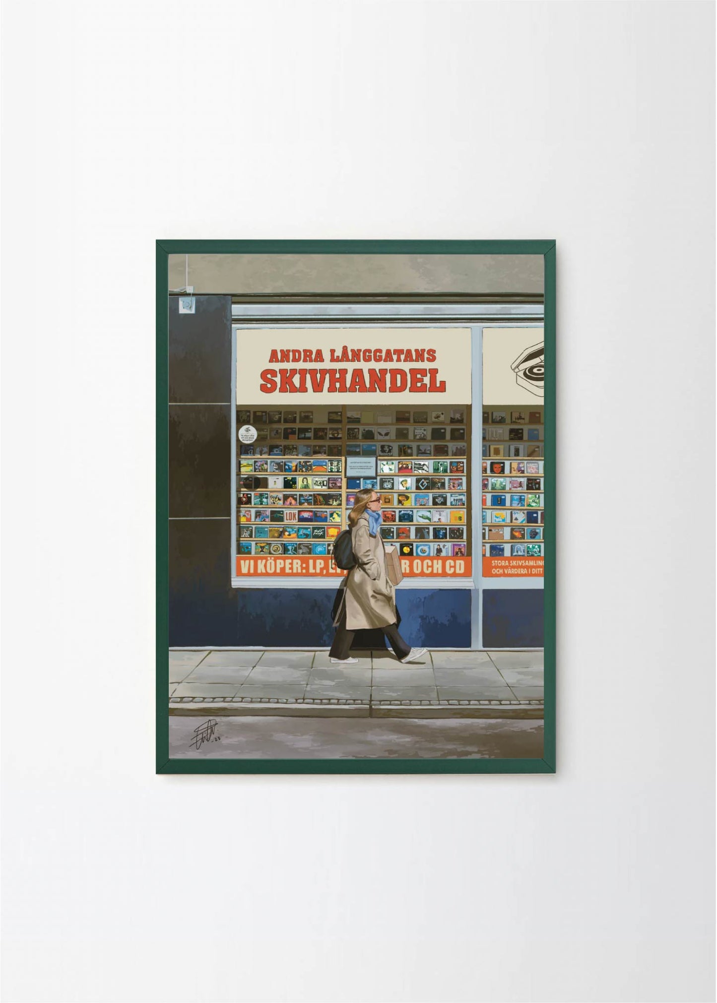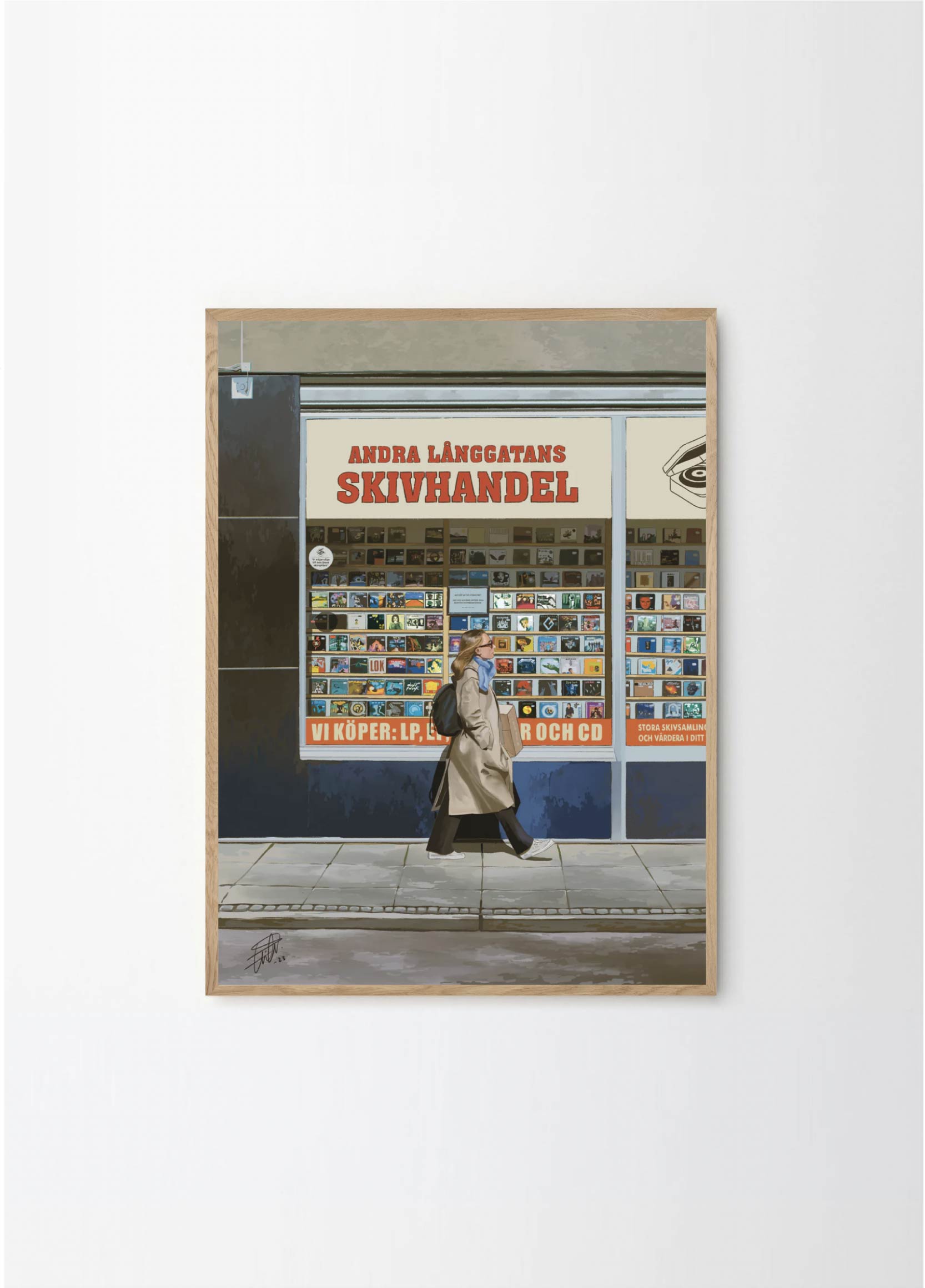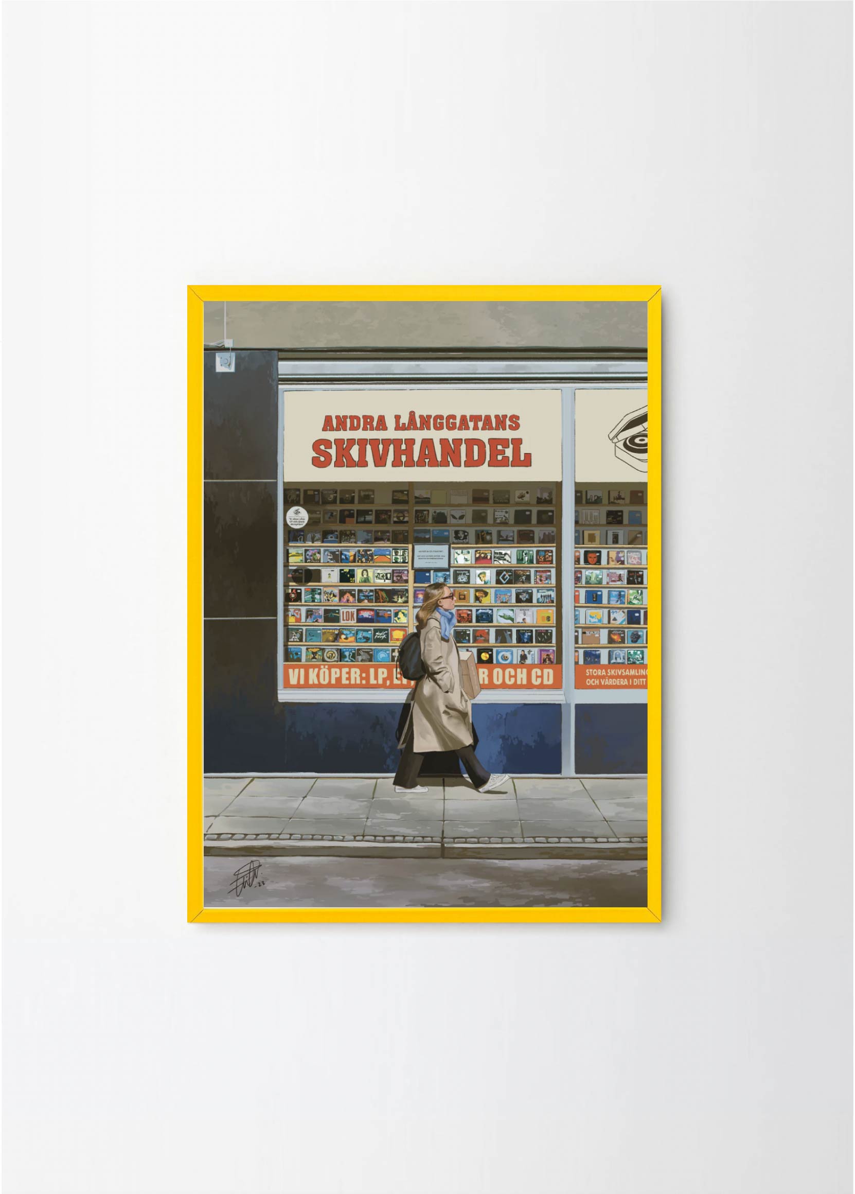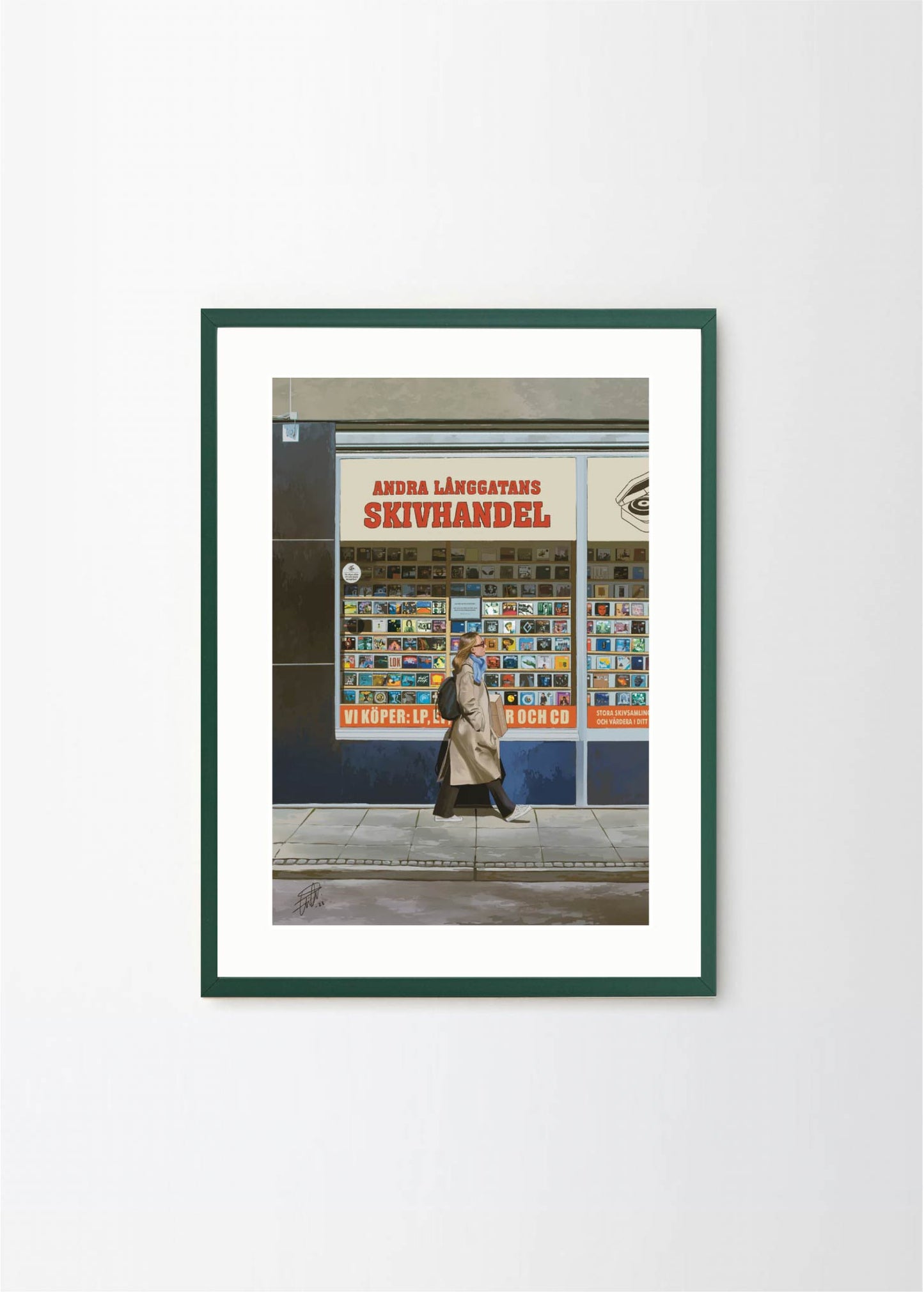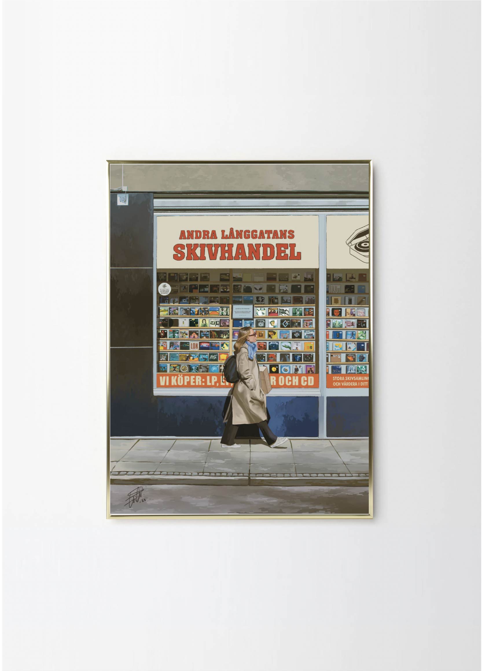 This artwork depicts a girl walking in front of the vinyl shop at Andra Långgatan in Gothenburg. The lovely red and grey colors makes it perfect for a red or black frame , with or without a passepartout.