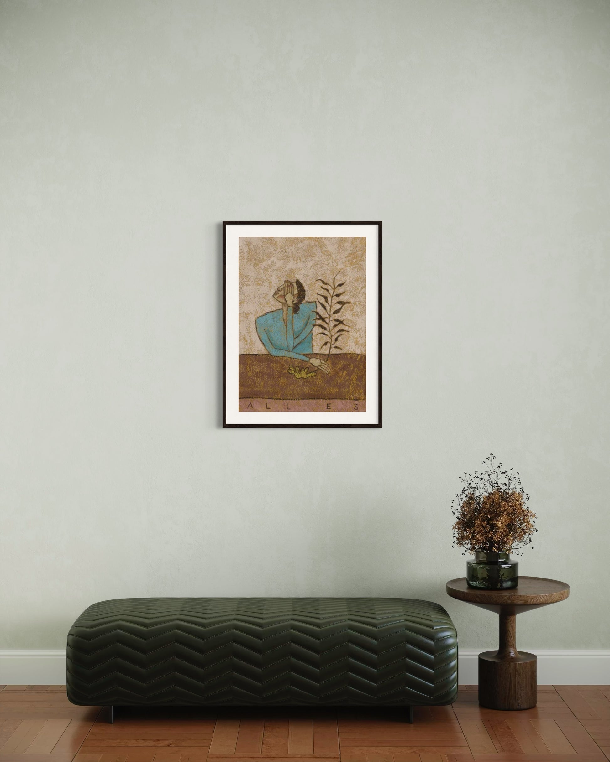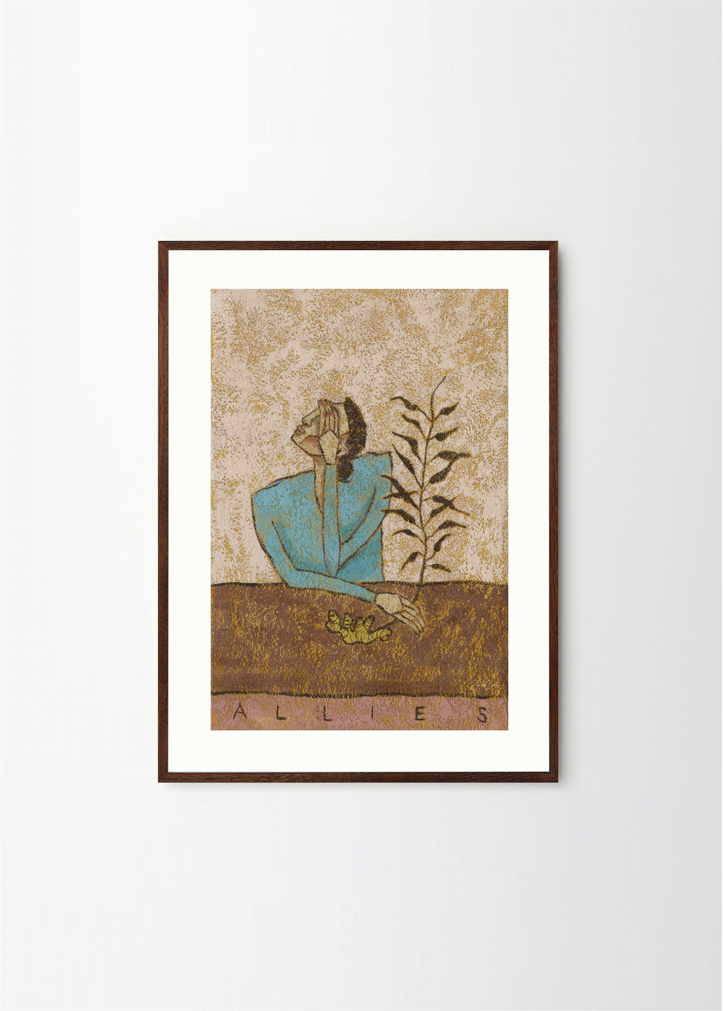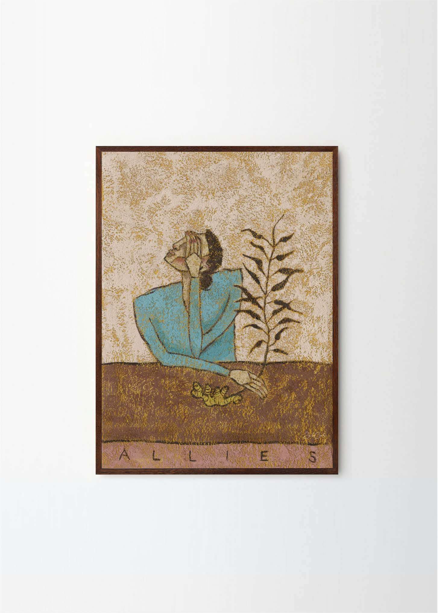 In Allies, Julie Celina creates a symbolic portrait of quiet companionship—between human, plant, and insect. A thoughtful figure rests at a table, flanked by a leafy stem and a small green caterpillar, suggesting trust, tenderness, and the unseen bonds of life.
