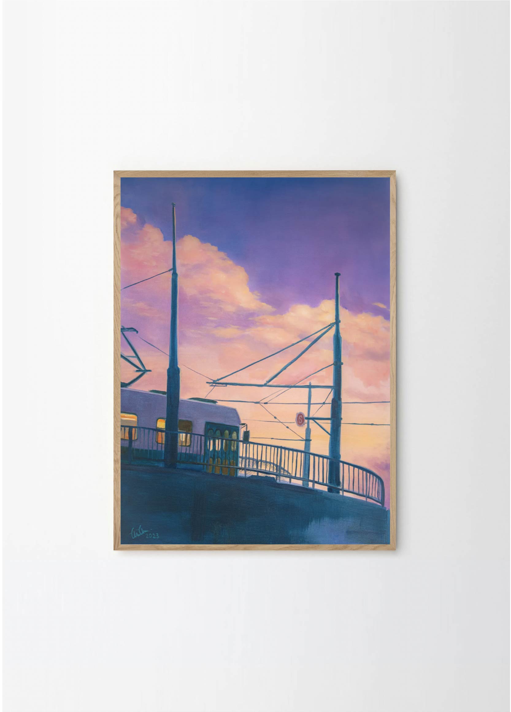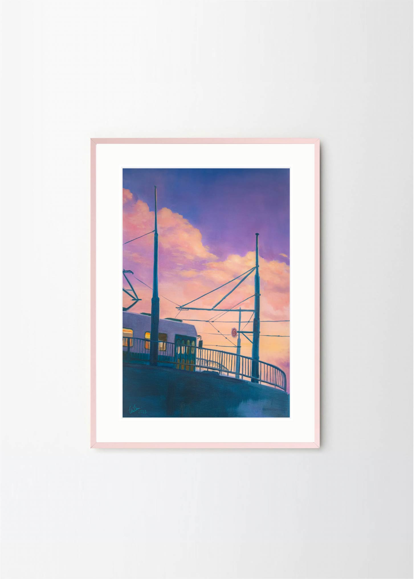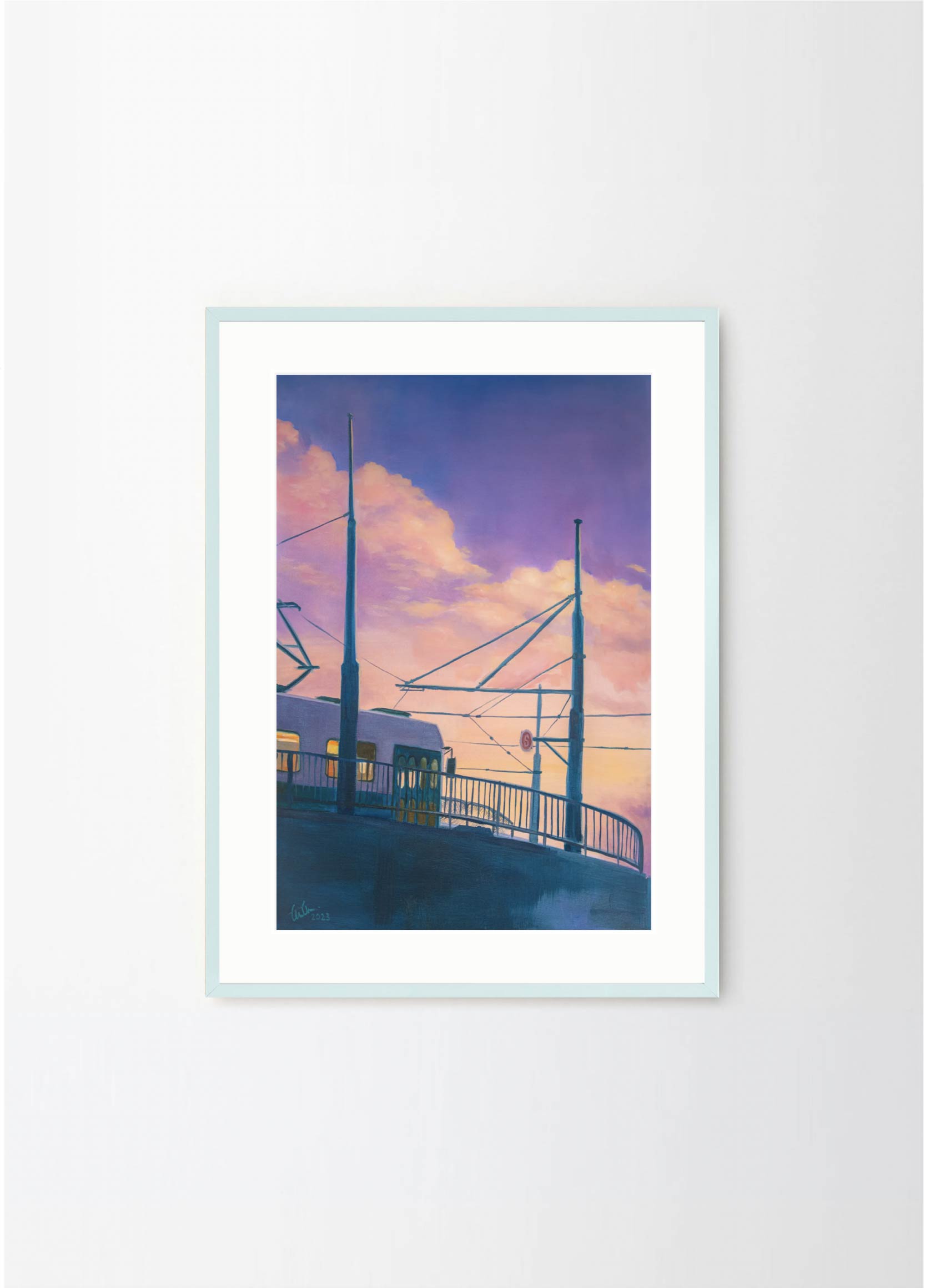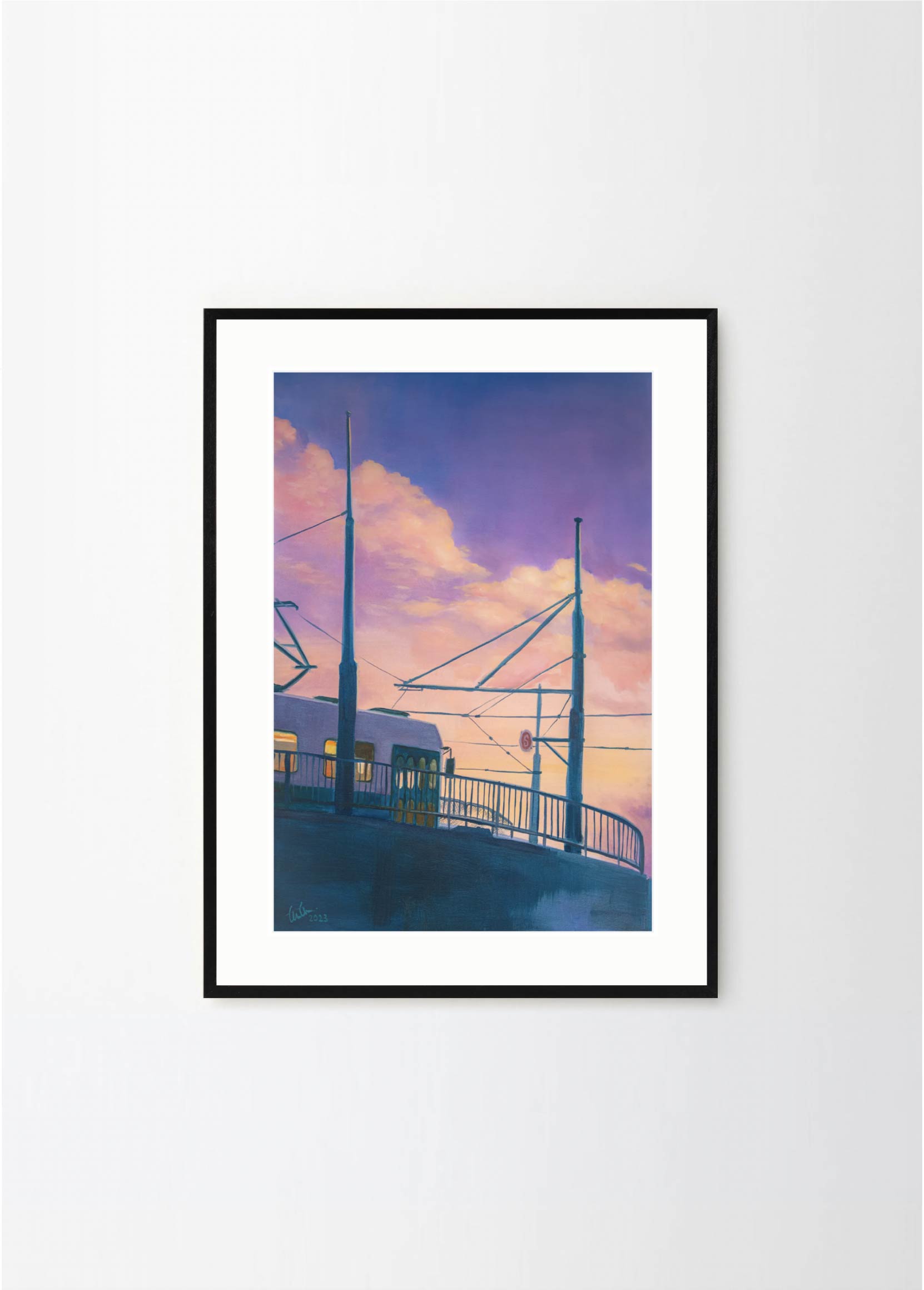 This artwork depicts a tram of Gothenburg. The lovely pink and purple colors makes it perfect for a walnut or purple frame , with or without a passepartout.