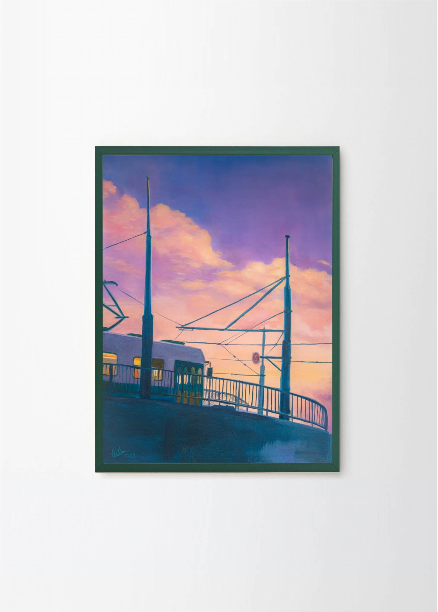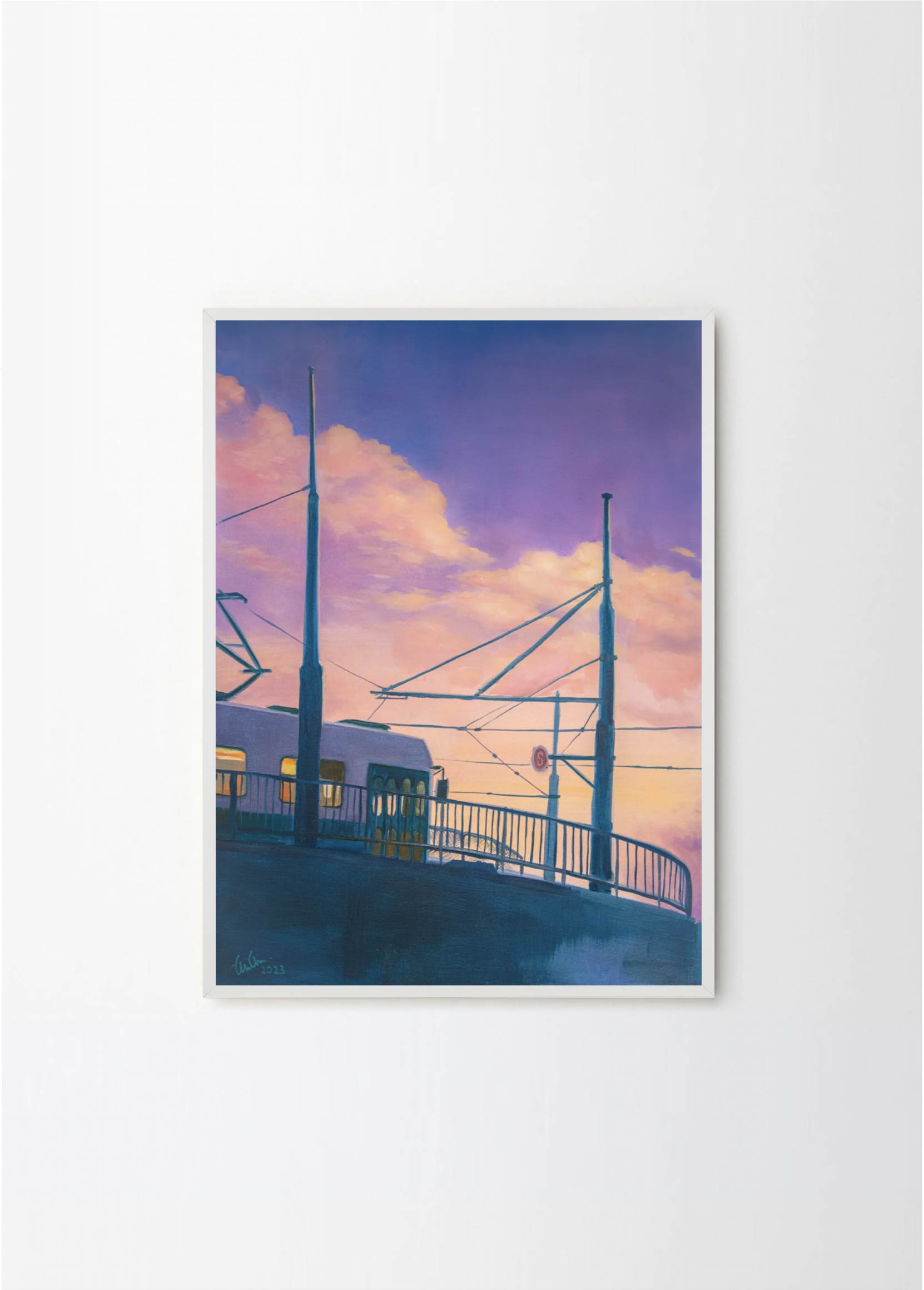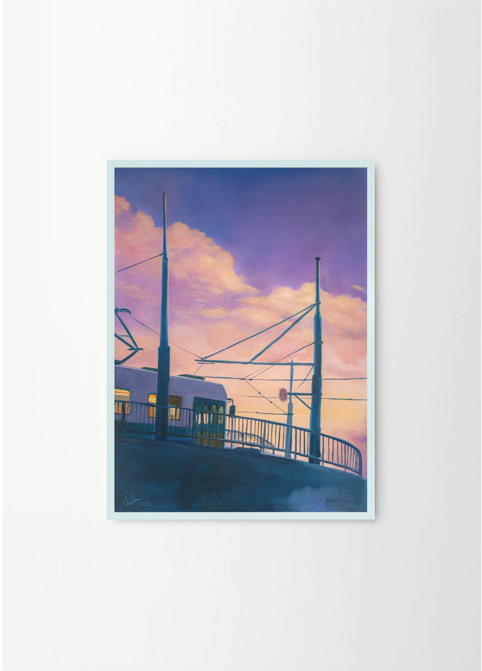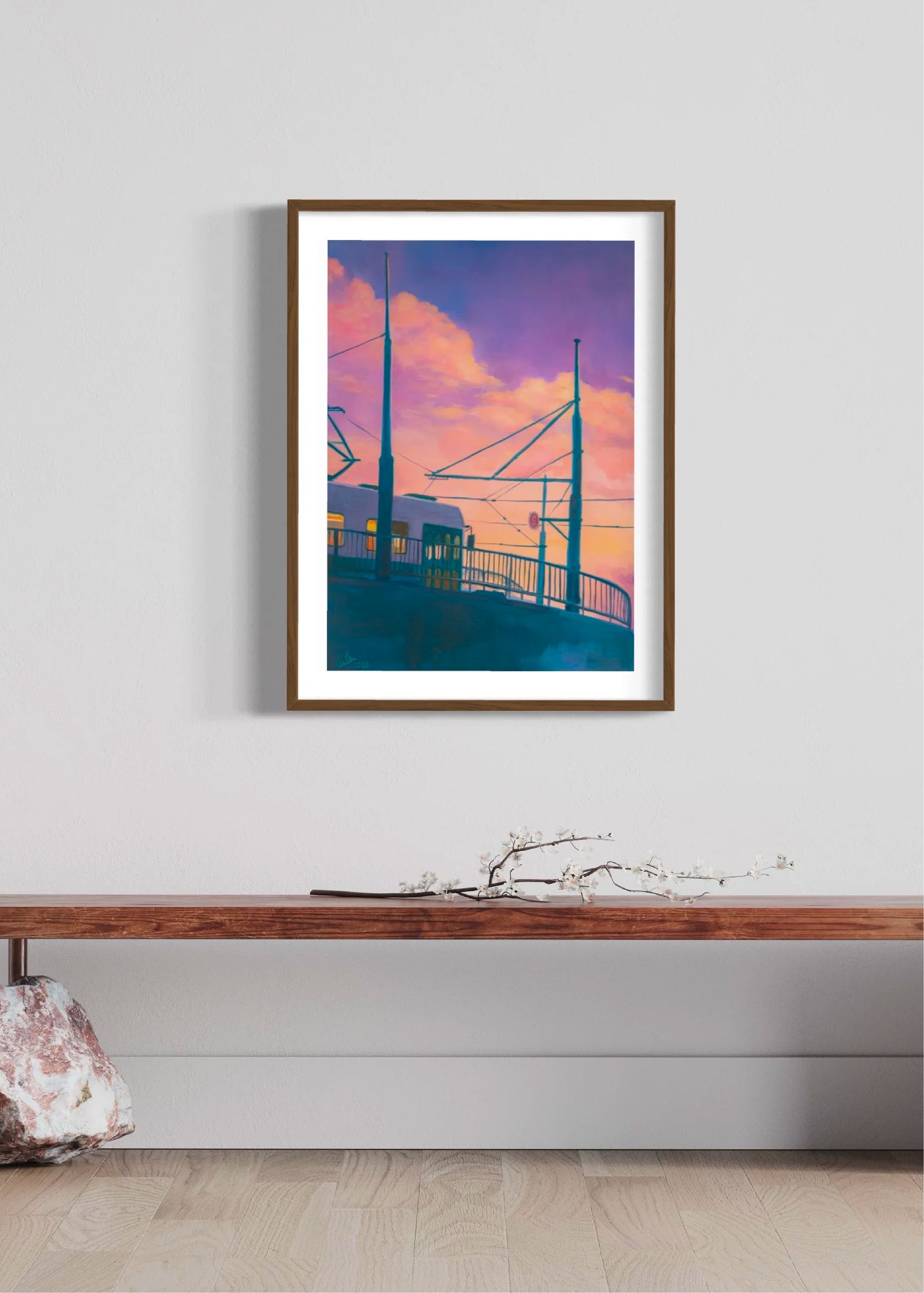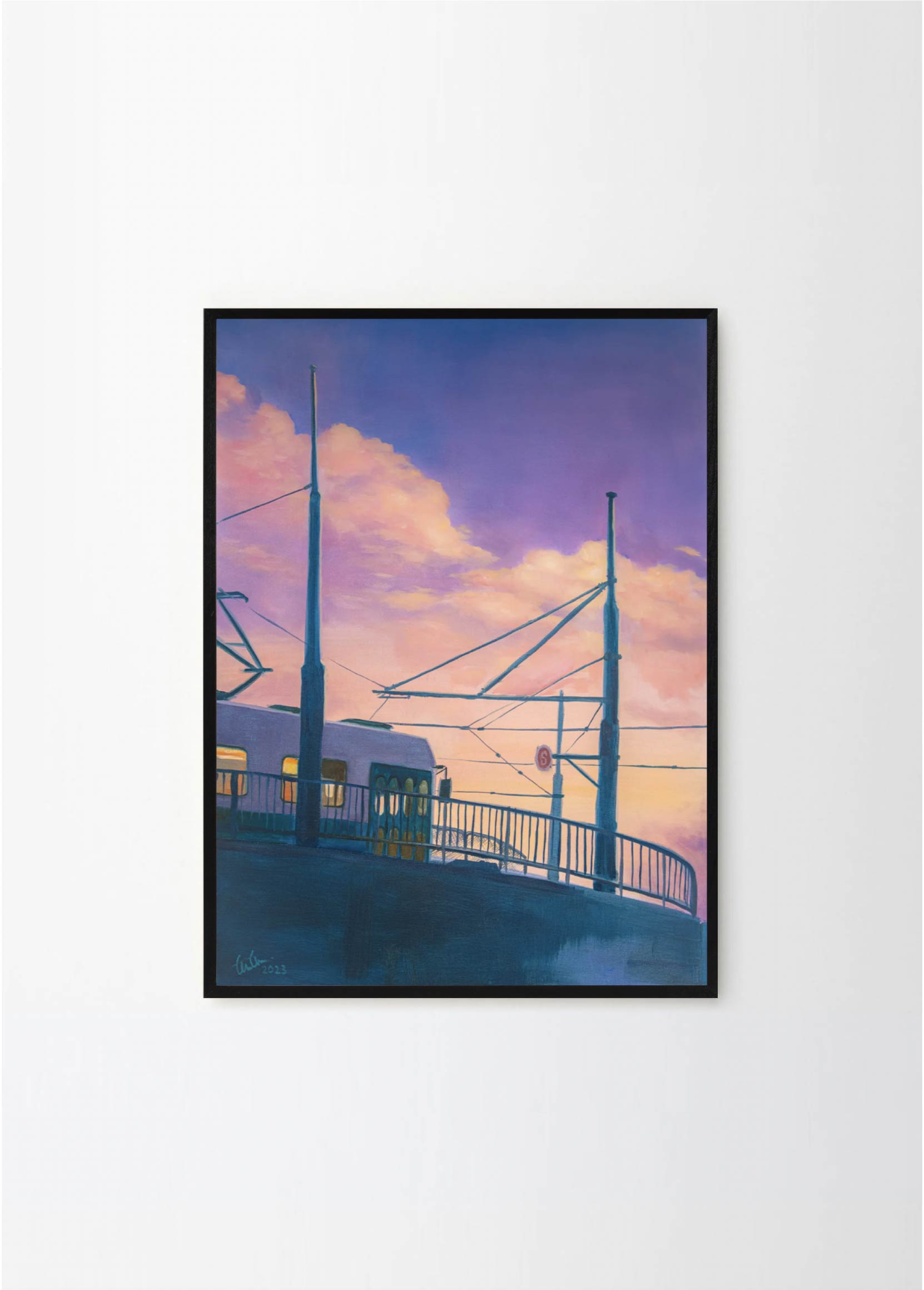 This artwork depicts a tram of Gothenburg. The lovely pink and purple colors makes it perfect for a walnut or purple frame , with or without a passepartout.