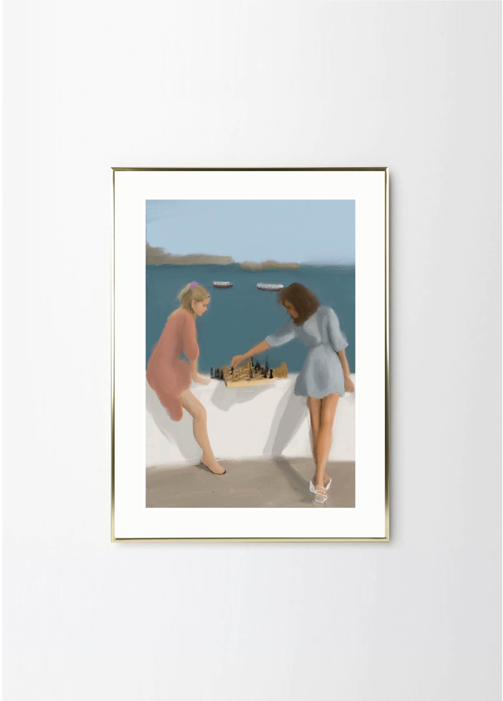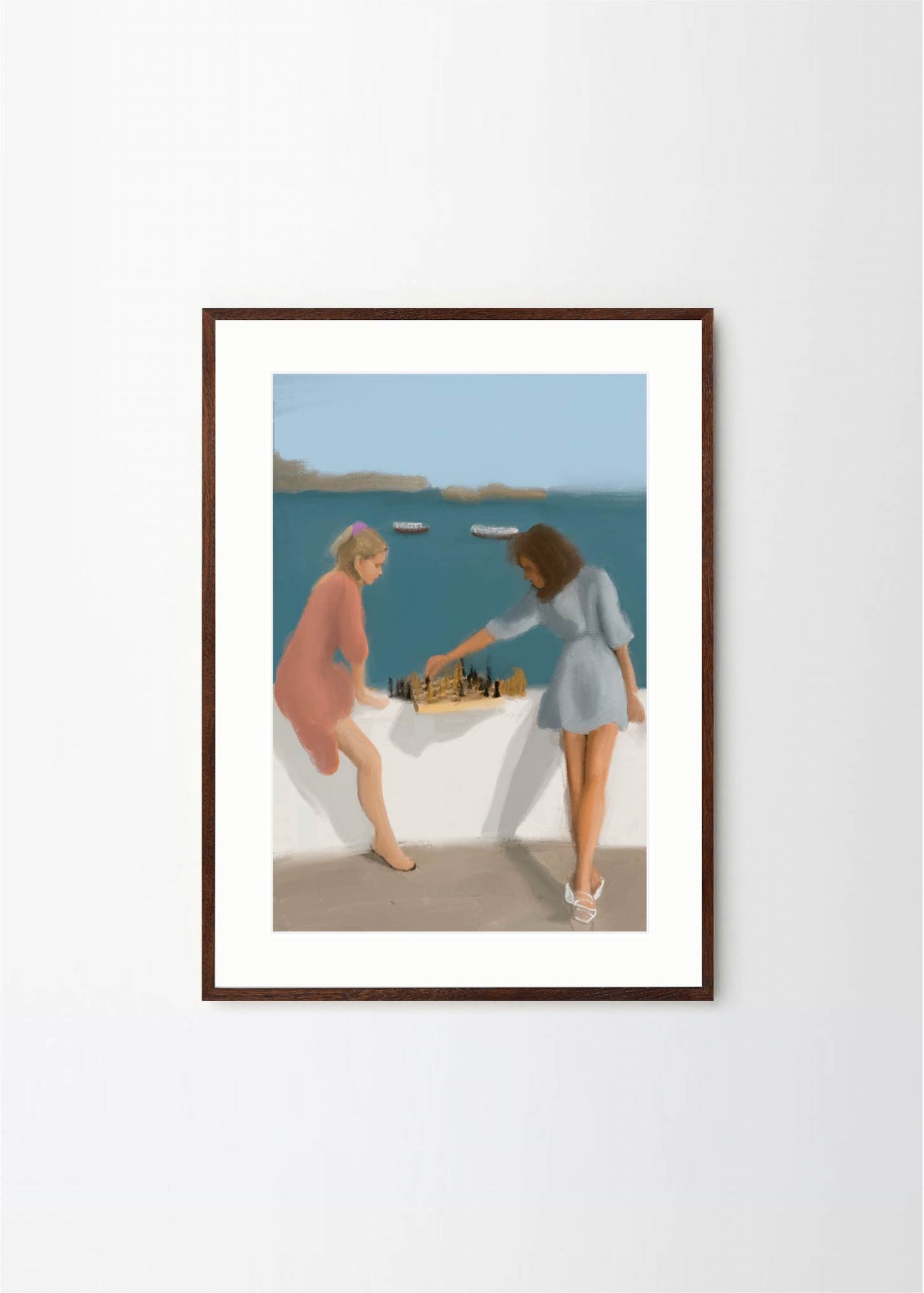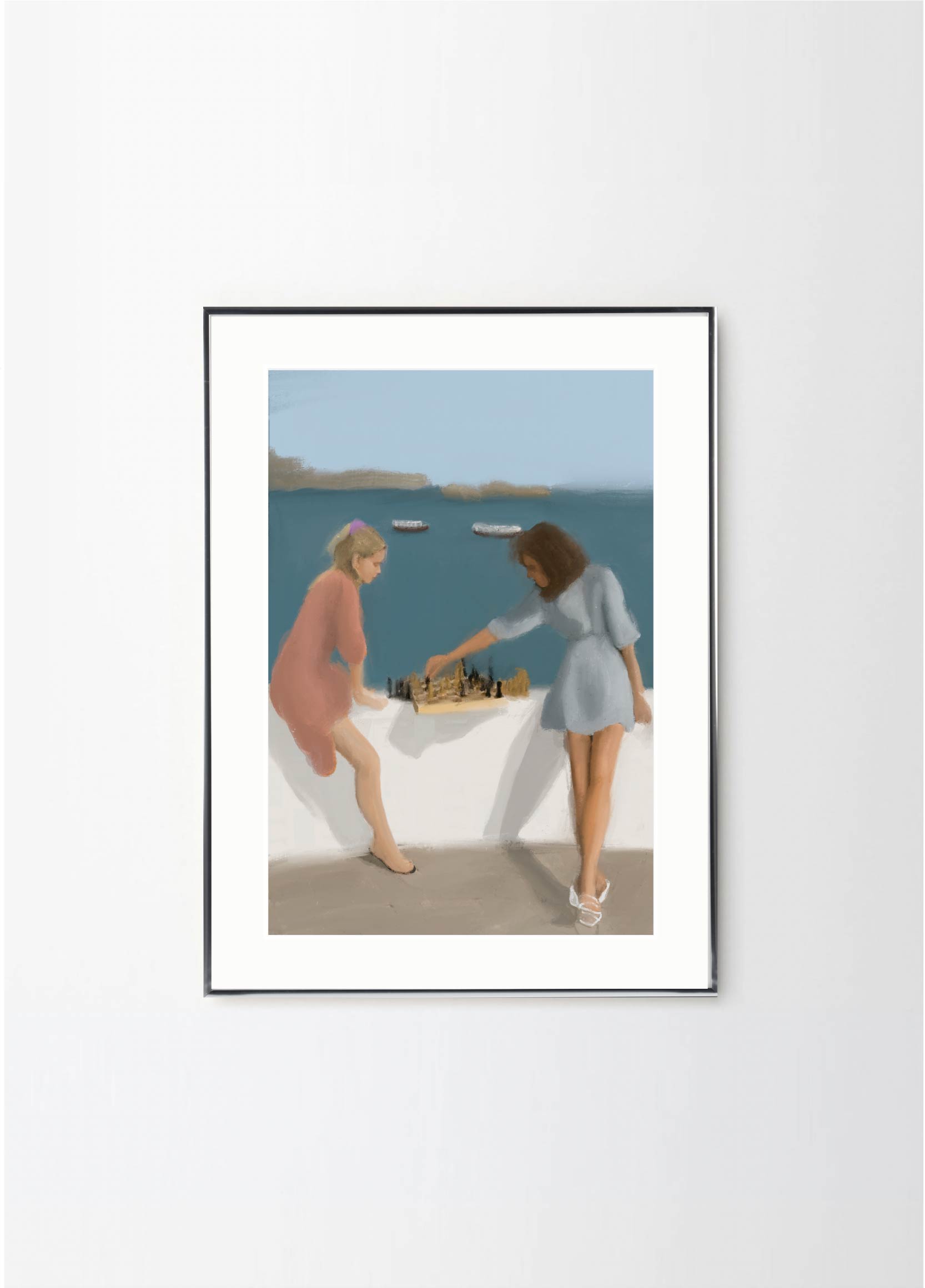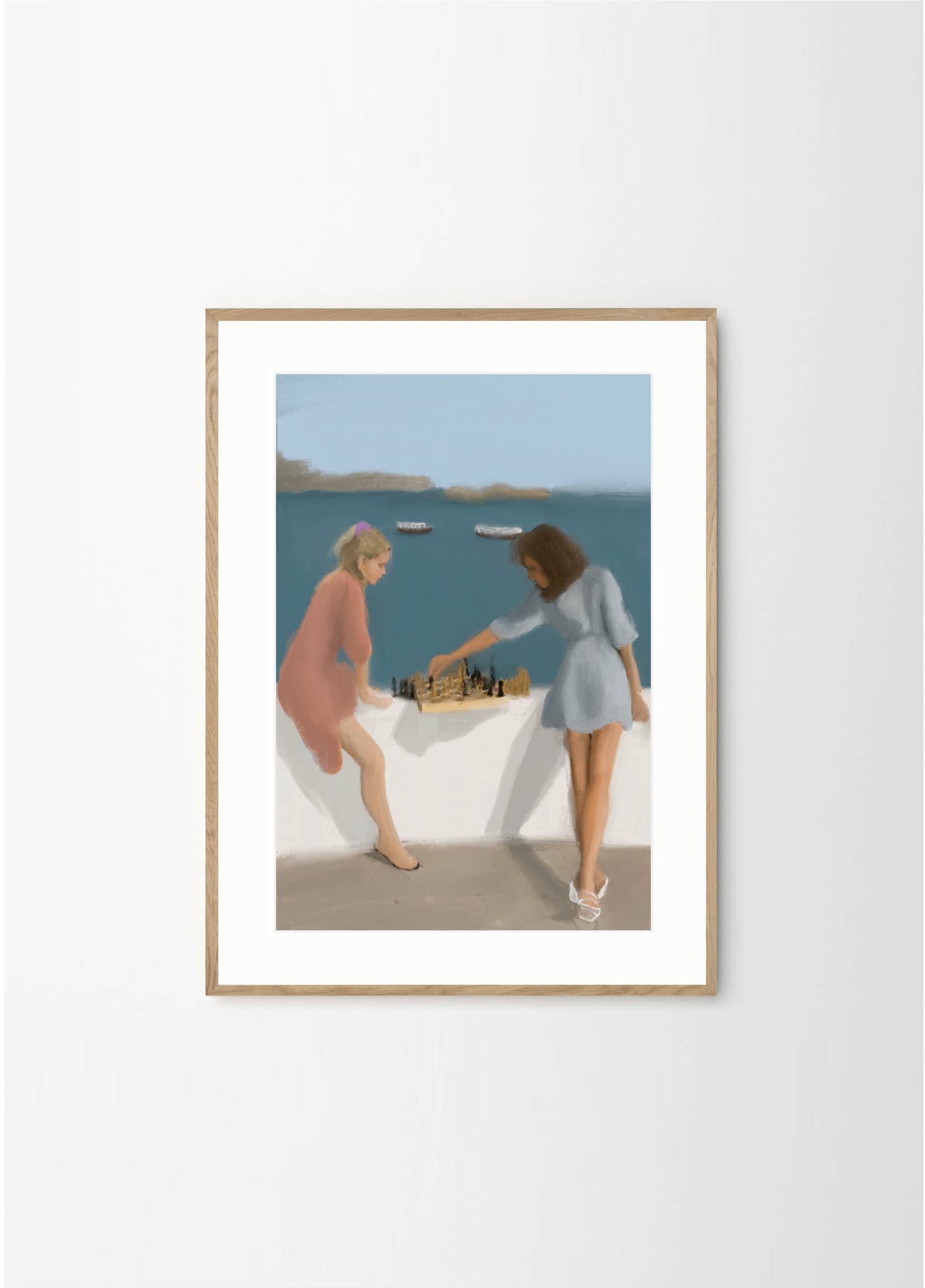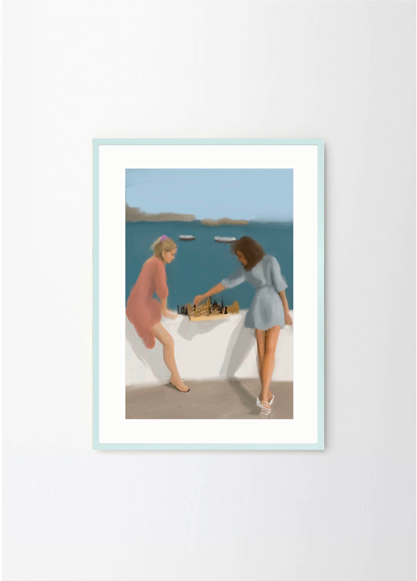 This artwork depicts two girls playing chess by the Mediterranean. The delightful light blue and gray colors make "Aningslöst Tidsfördriv" perfect for a walnut frame with a passepartout. A significant characteristic of Estelle Graf's work is that she almost always works with satire.