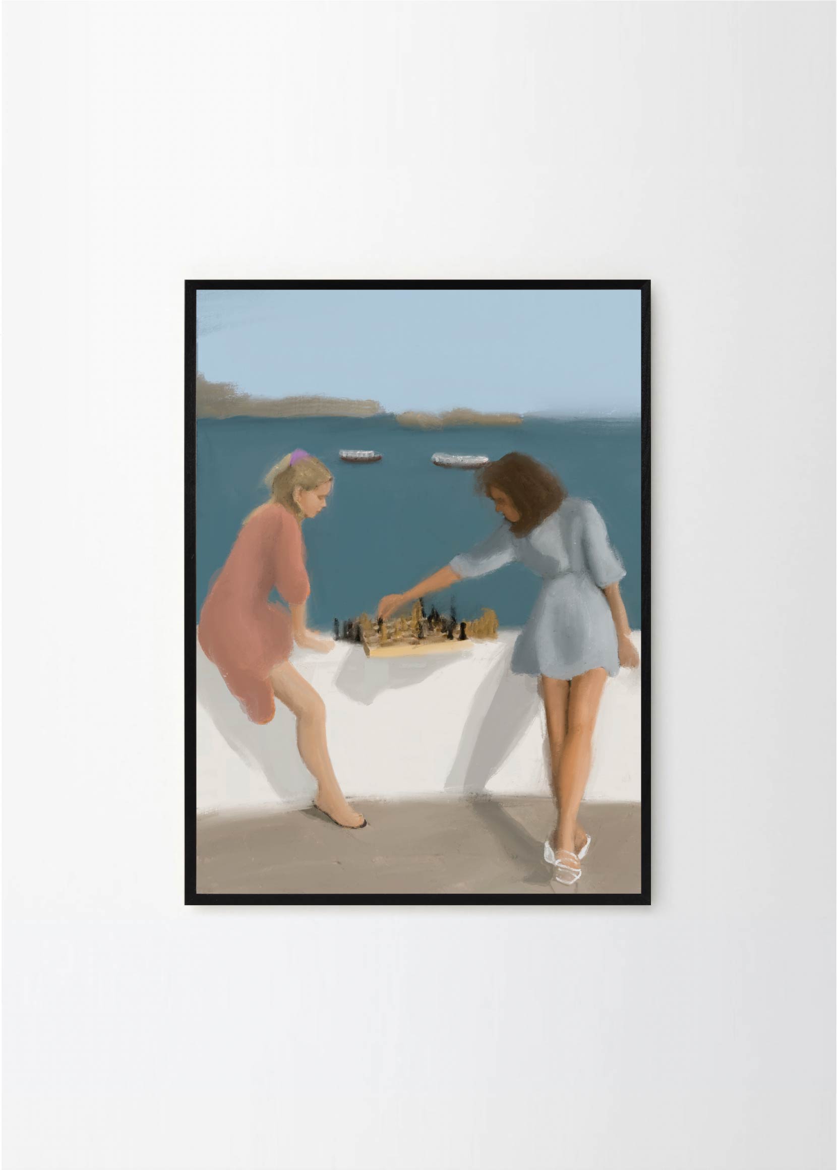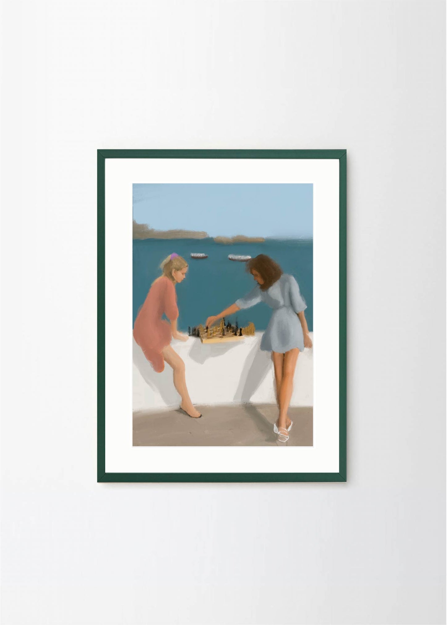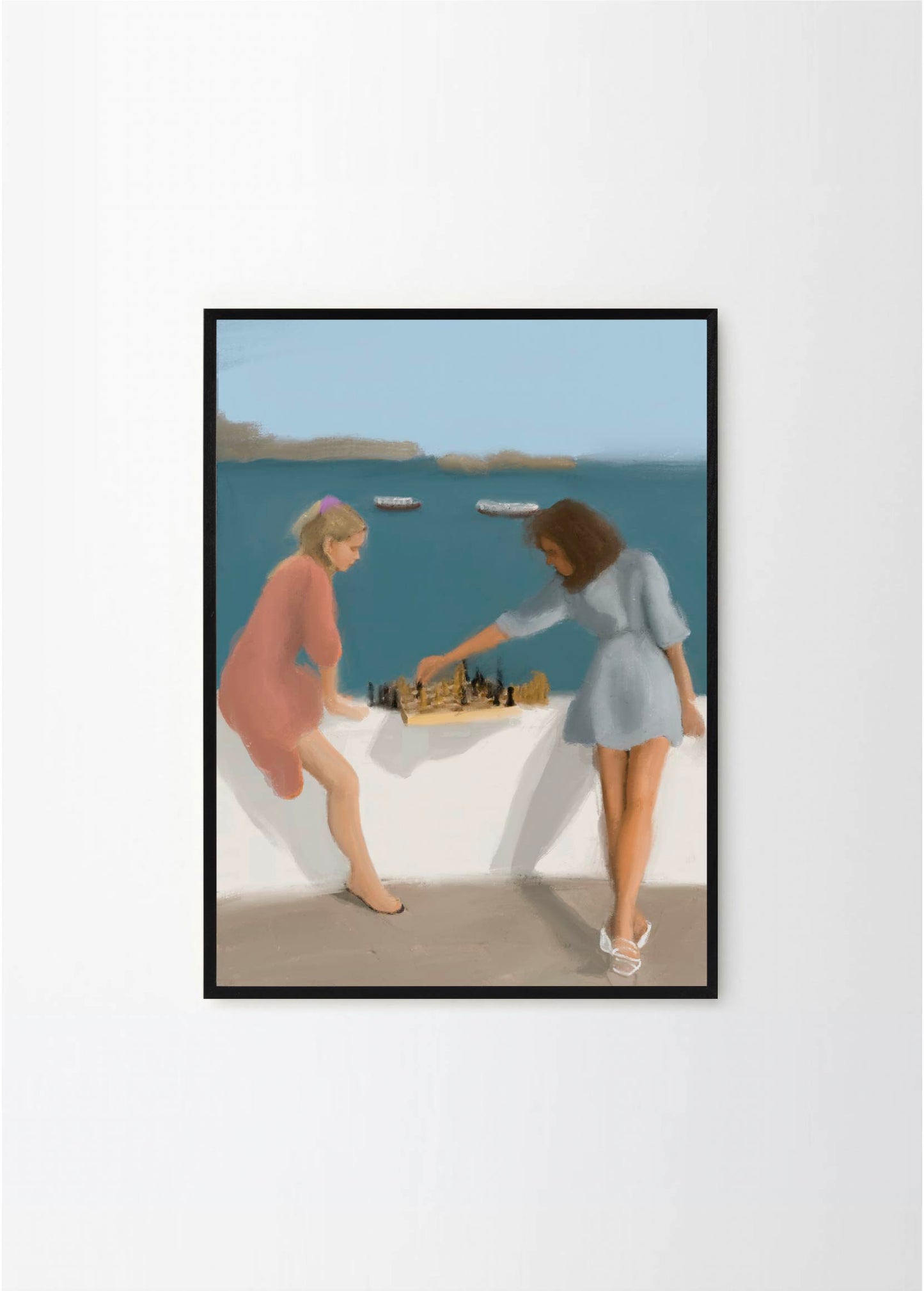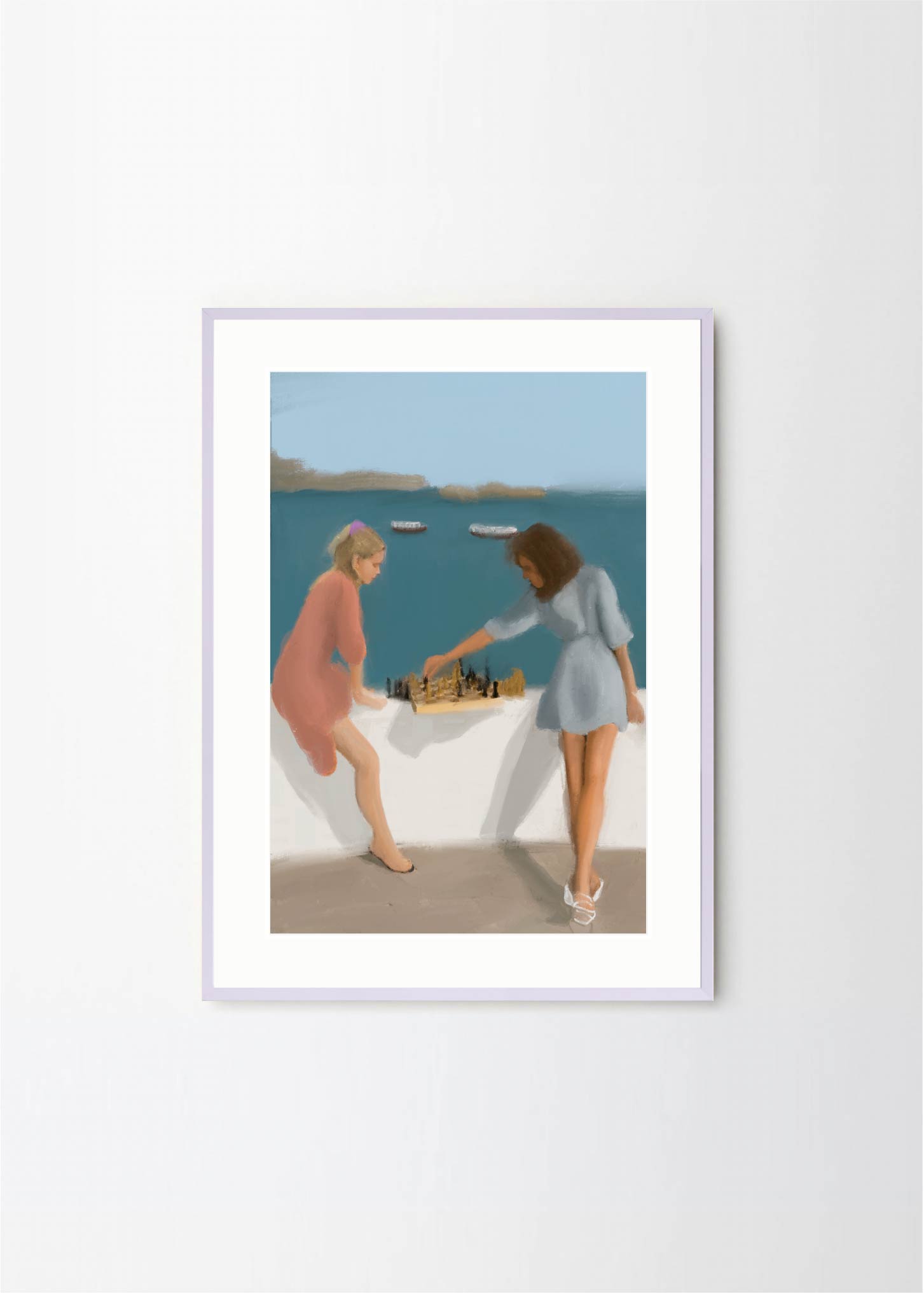 This artwork depicts two girls playing chess by the Mediterranean. The delightful light blue and gray colors make "Aningslöst Tidsfördriv" perfect for a walnut frame with a passepartout. A significant characteristic of Estelle Graf's work is that she almost always works with satire.