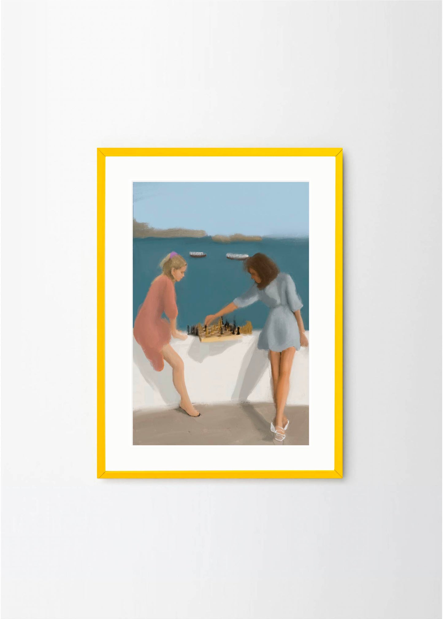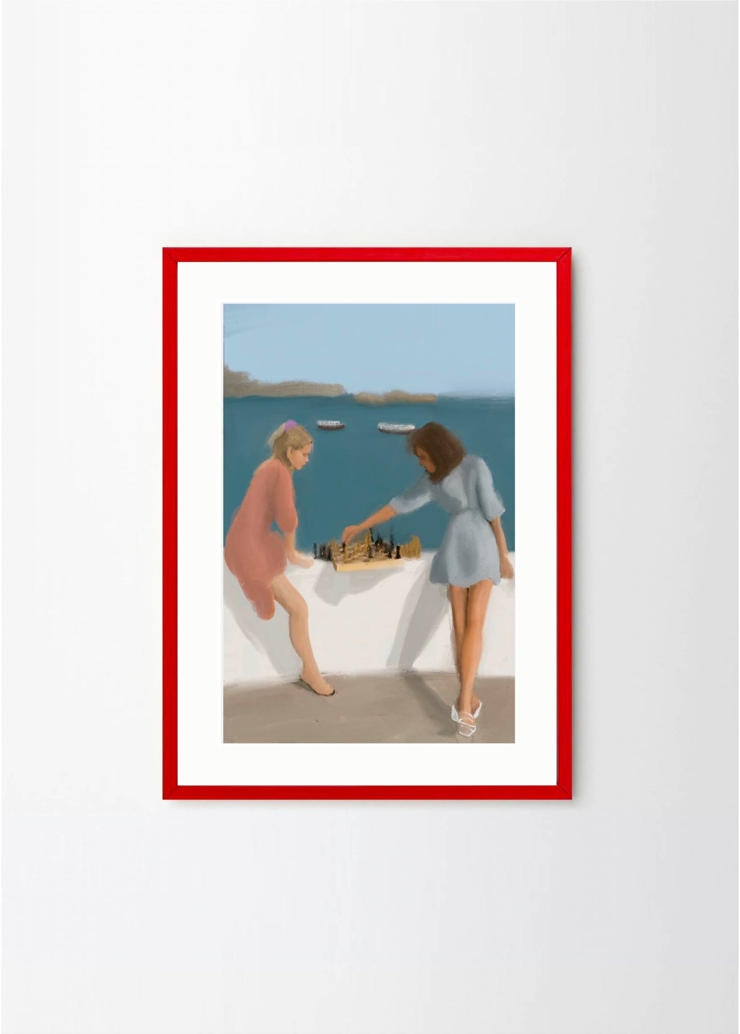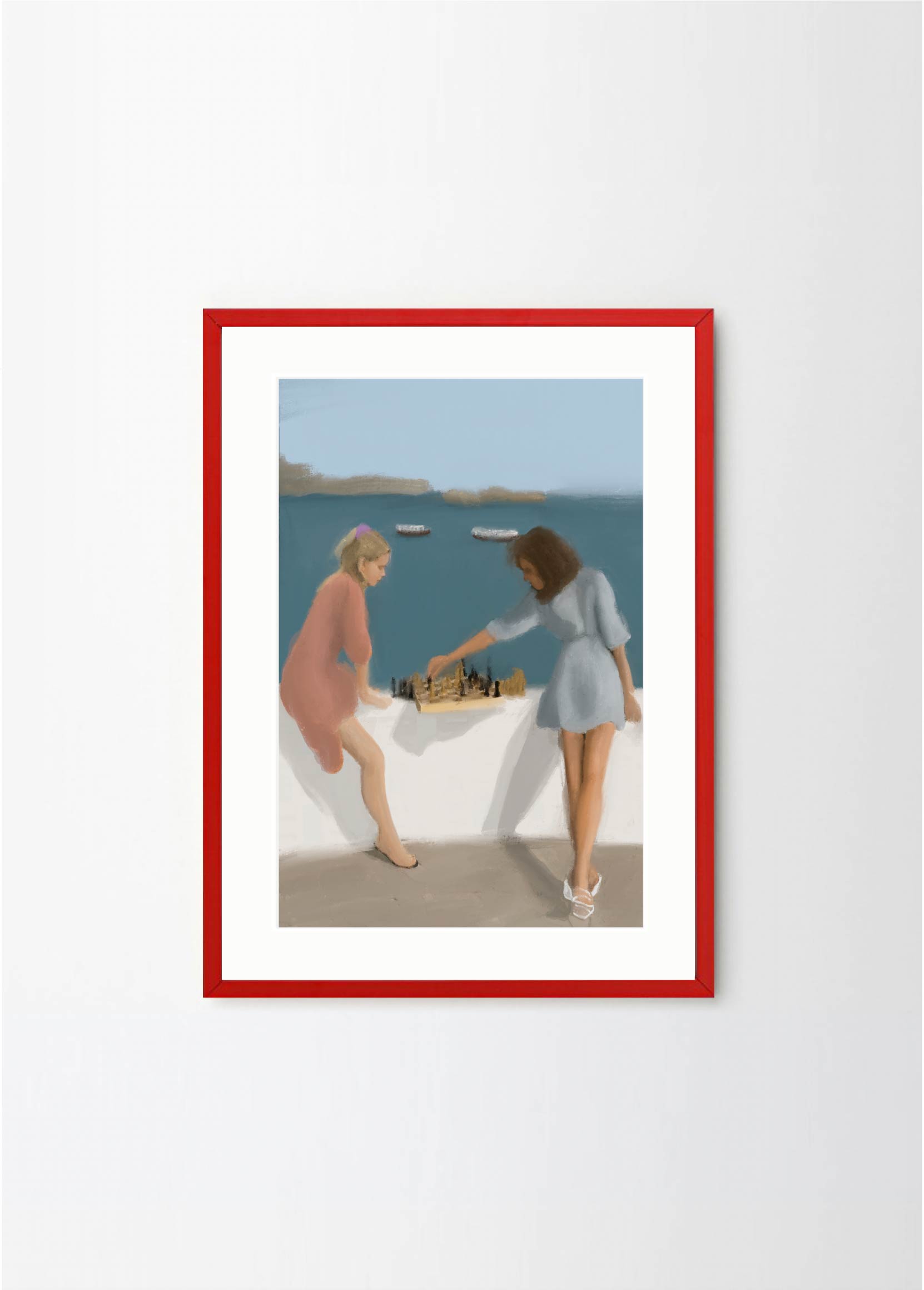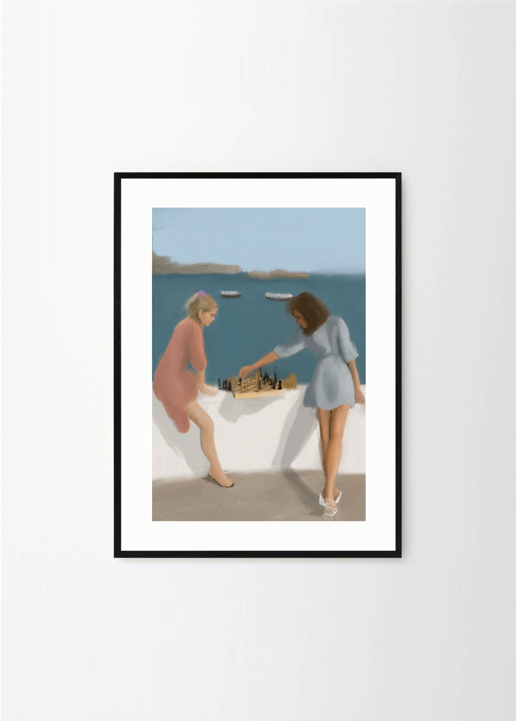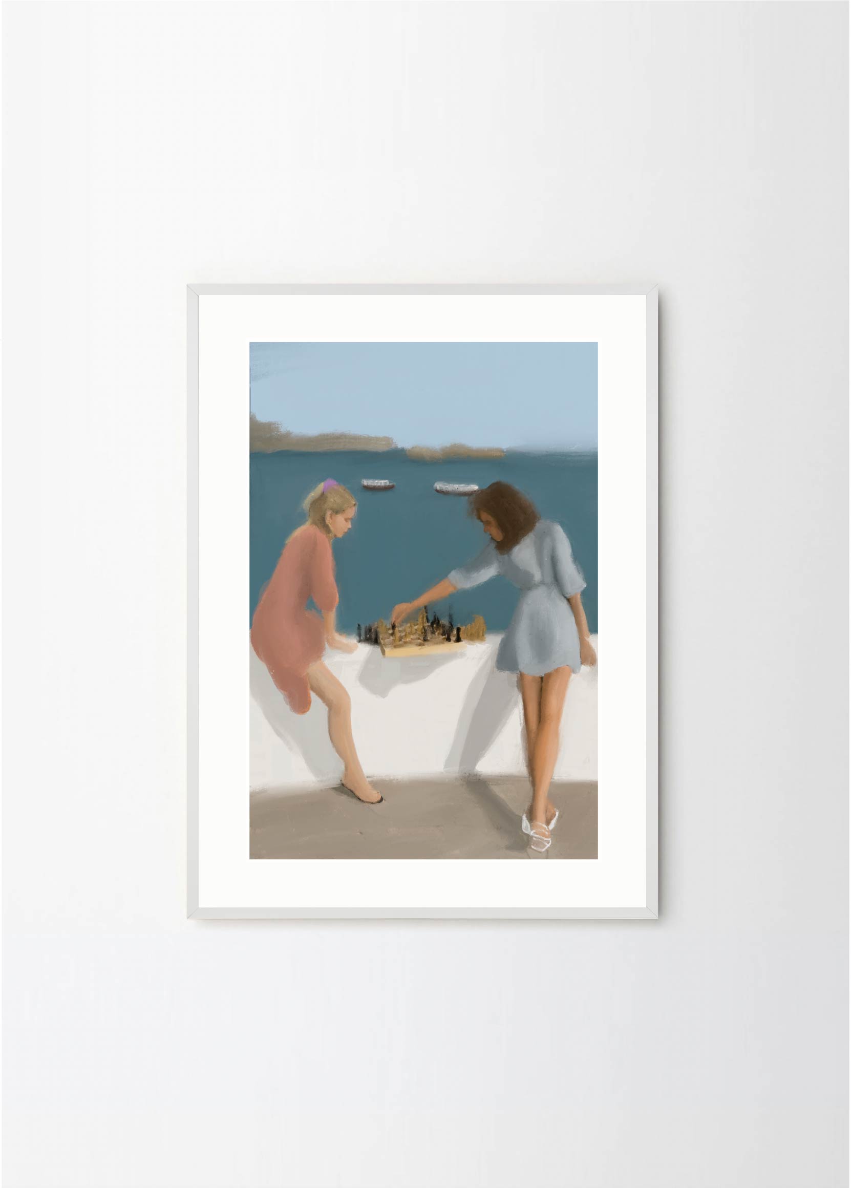 This artwork depicts two girls playing chess by the Mediterranean. The delightful light blue and gray colors make "Aningslöst Tidsfördriv" perfect for a walnut frame with a passepartout. A significant characteristic of Estelle Graf's work is that she almost always works with satire.