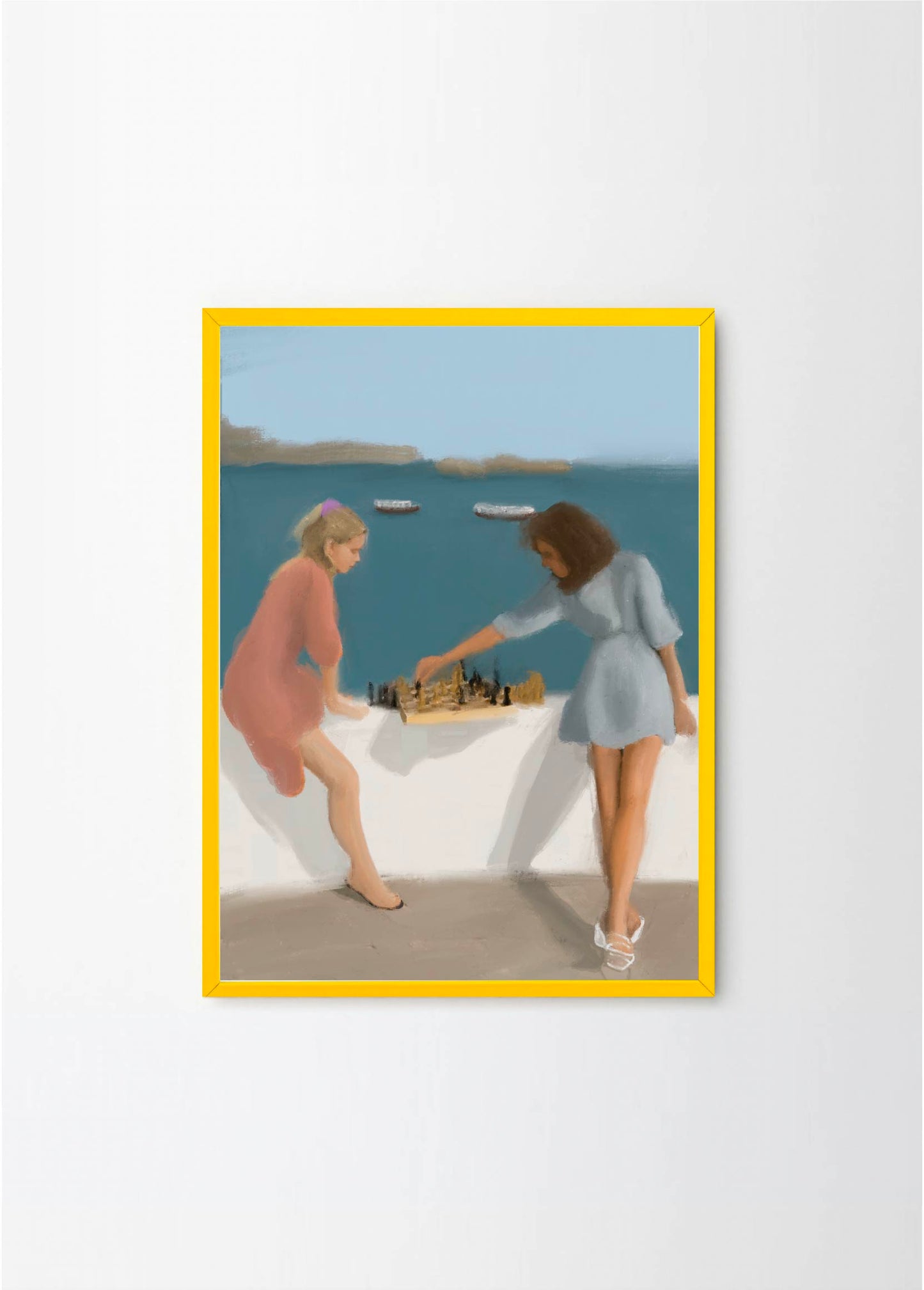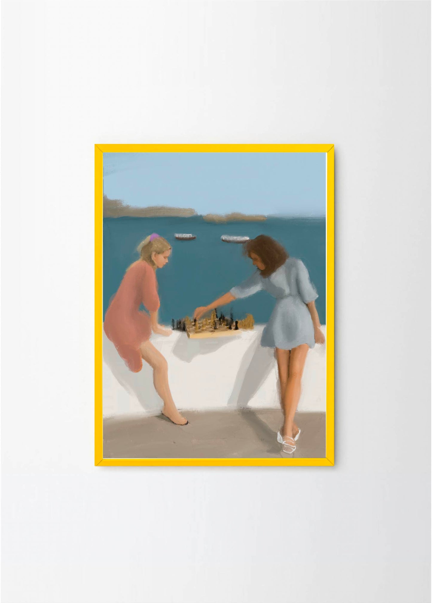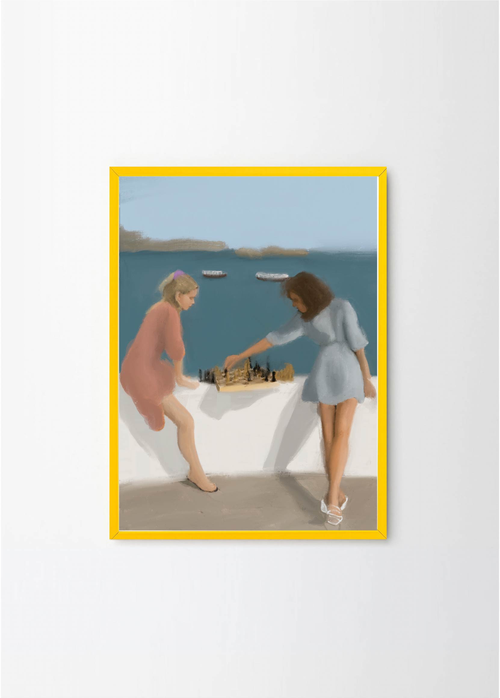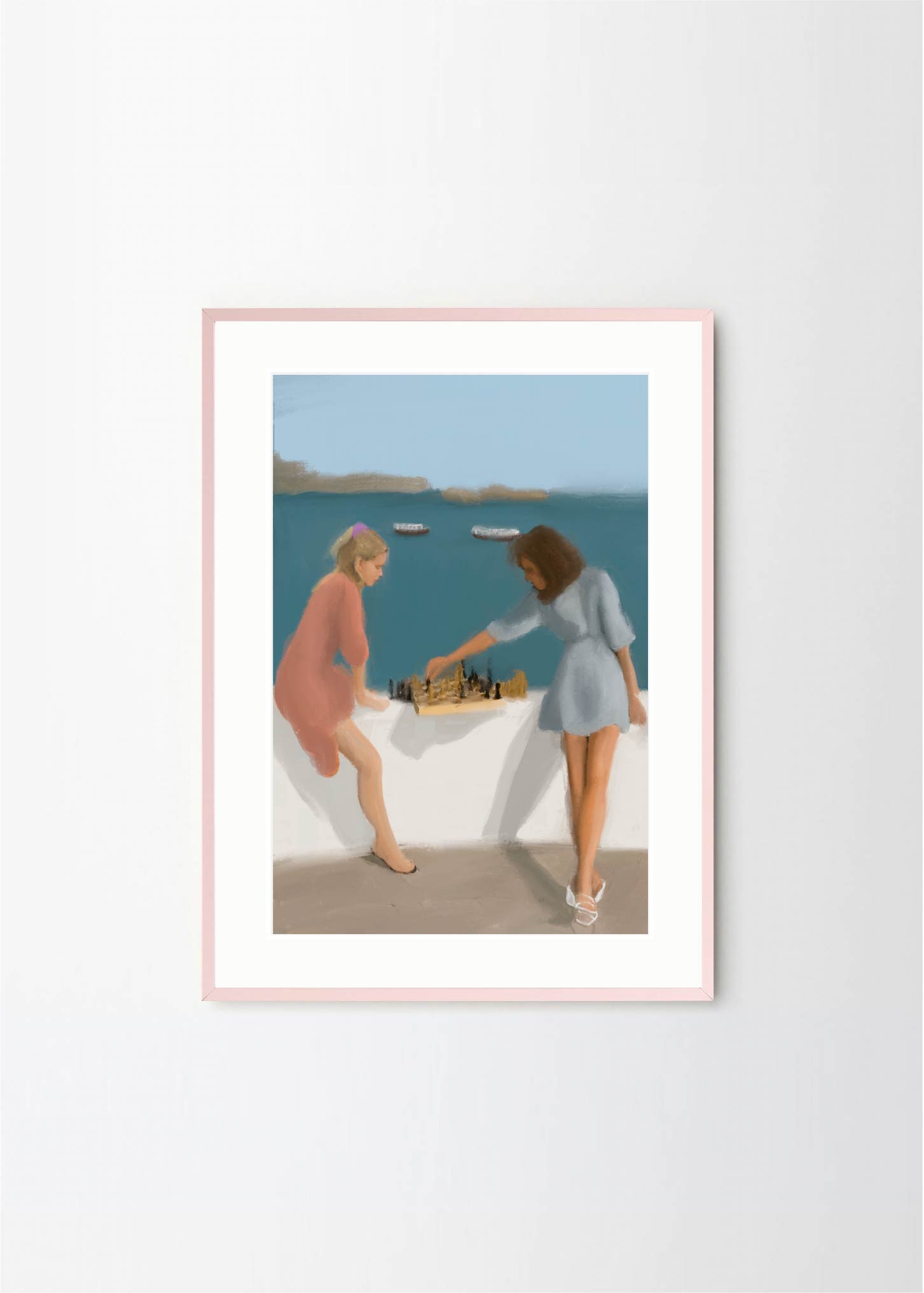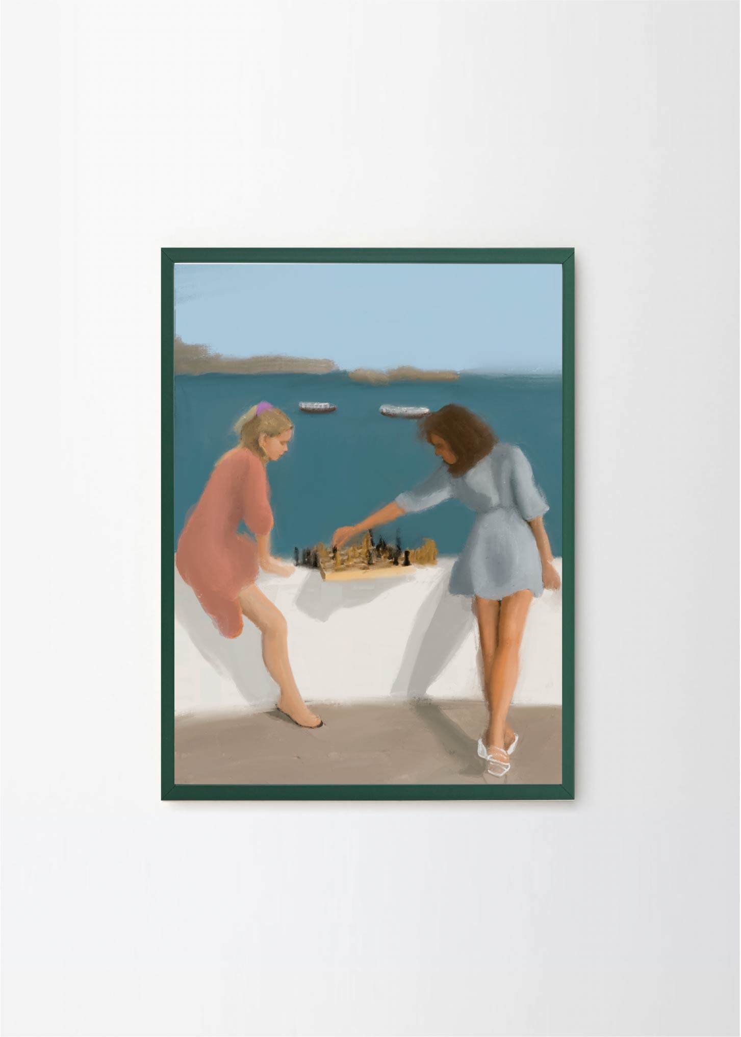 This artwork depicts two girls playing chess by the Mediterranean. The delightful light blue and gray colors make "Aningslöst Tidsfördriv" perfect for a walnut frame with a passepartout. A significant characteristic of Estelle Graf's work is that she almost always works with satire.