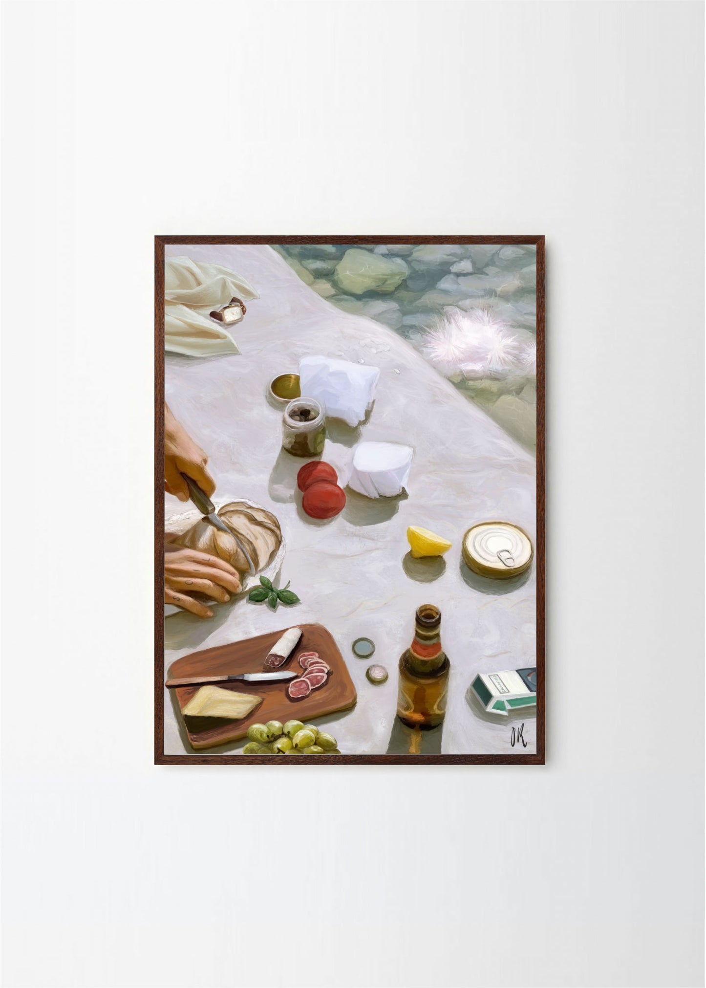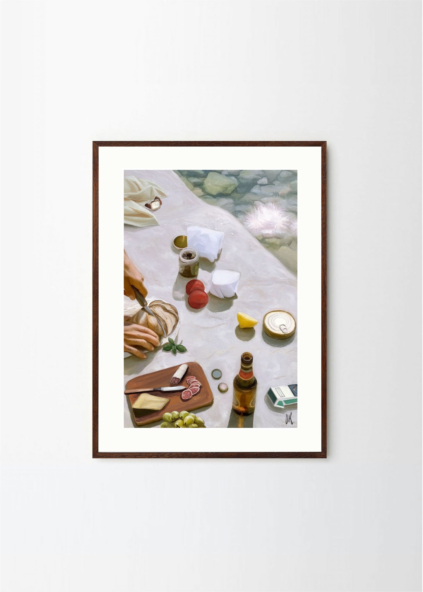 The illustration of a sea food dinner reminds us all about sea and summer happiness. This food poster with tones of yellow, grey, beige and brown would bee perfect with a walnut, green or whit frame.