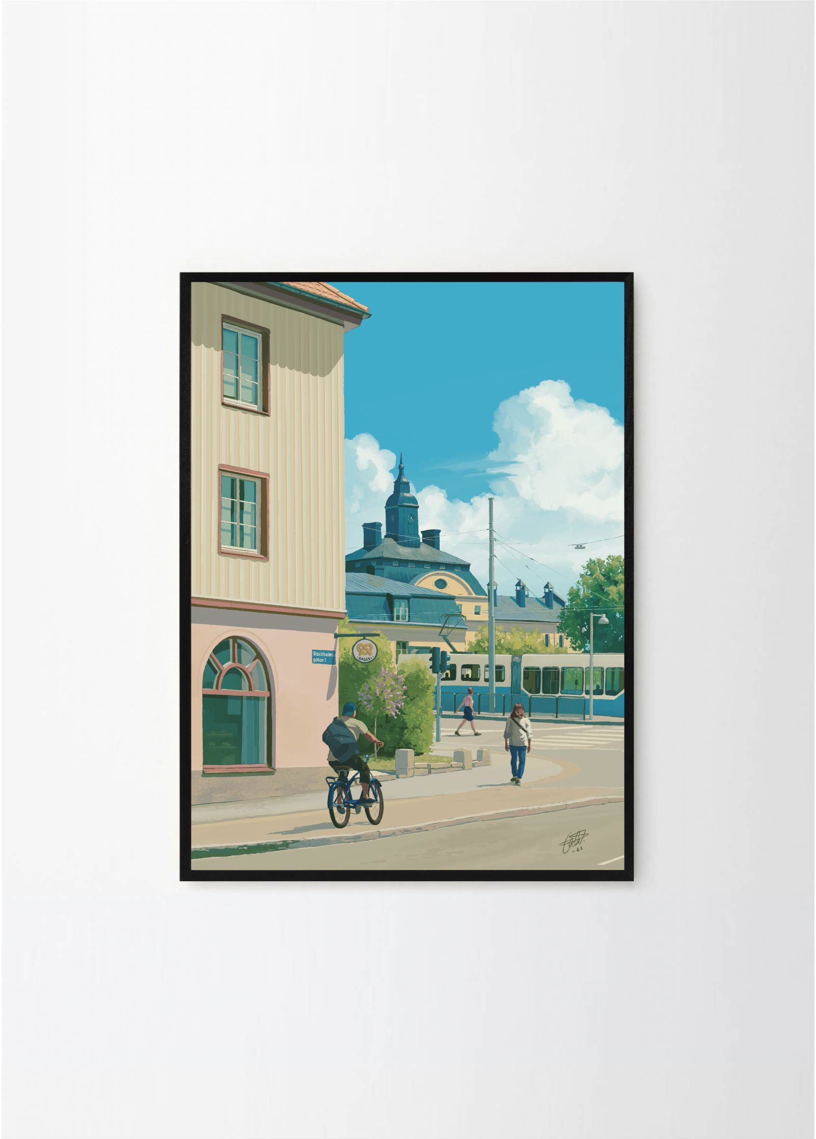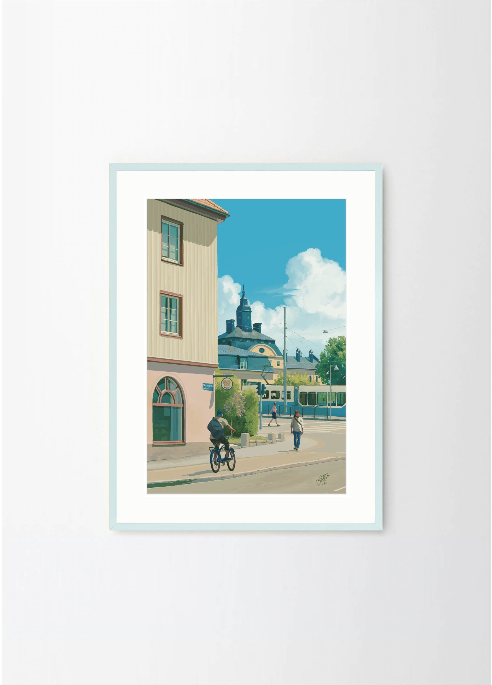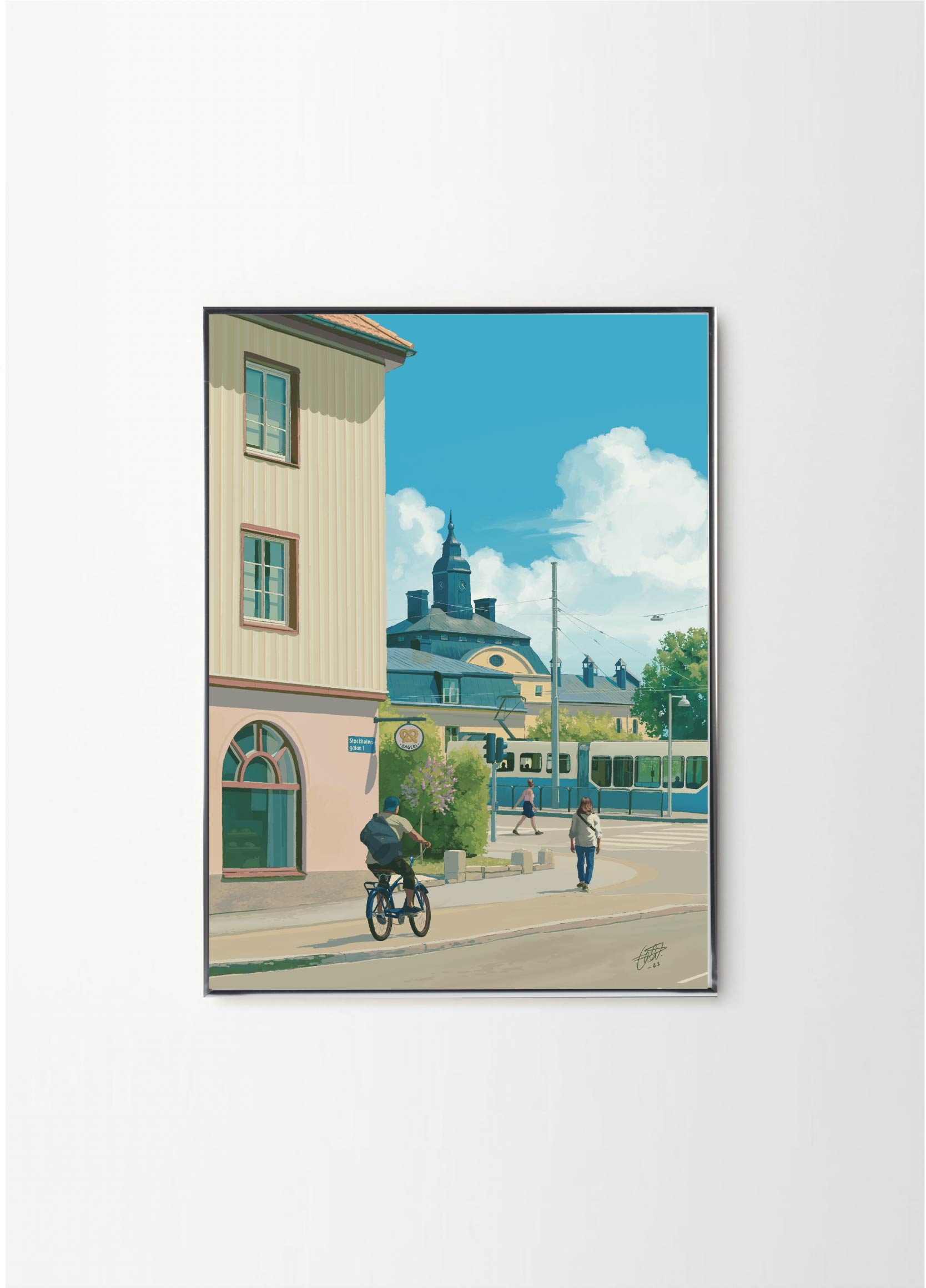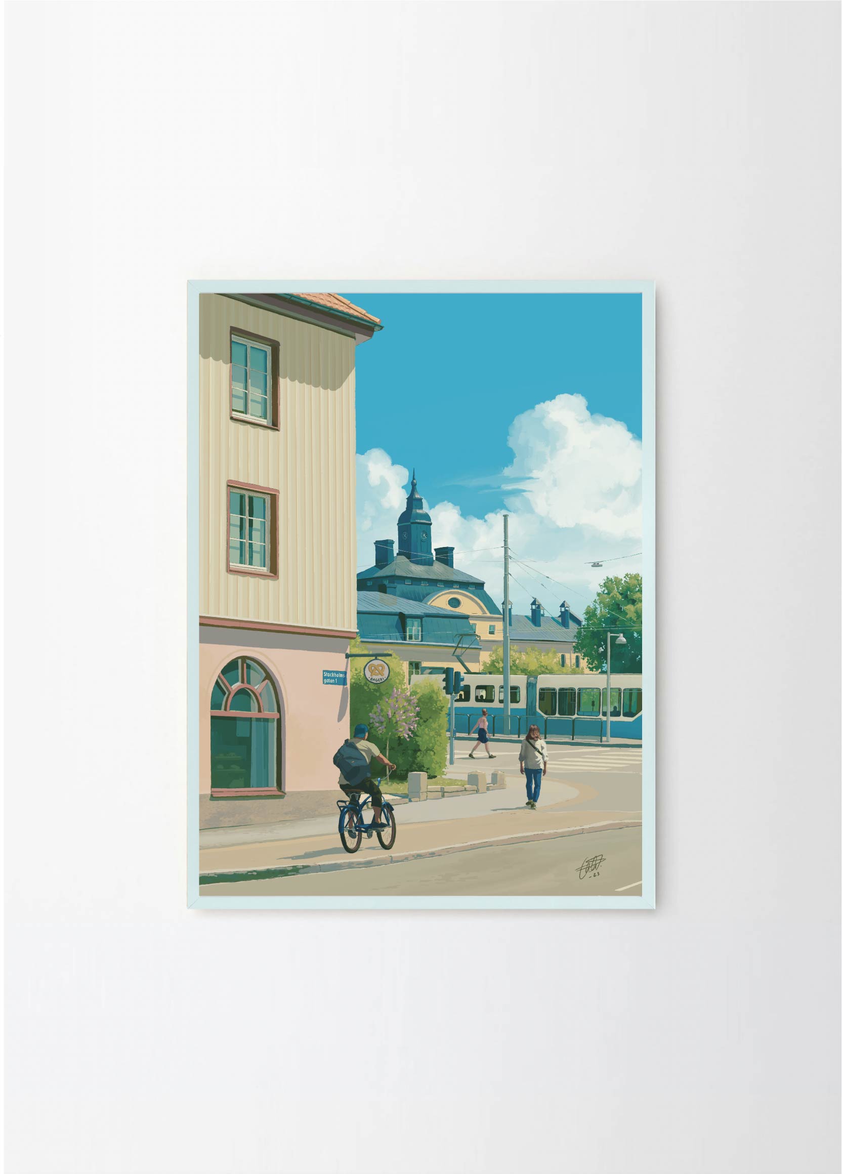 This artwork depicts a block in the neighborhood Bagaregården in Gothenburg. The lovely blue and beig colors makes it perfect for a pastelle, white or oak frame , with or without a passepartout.