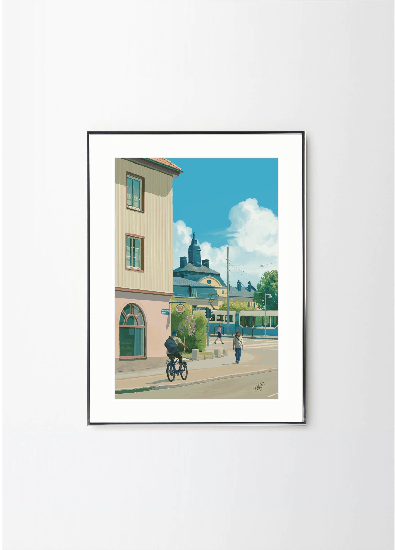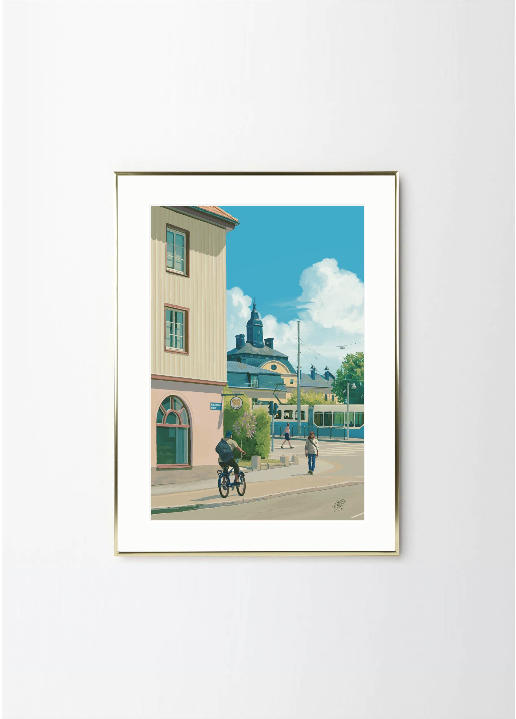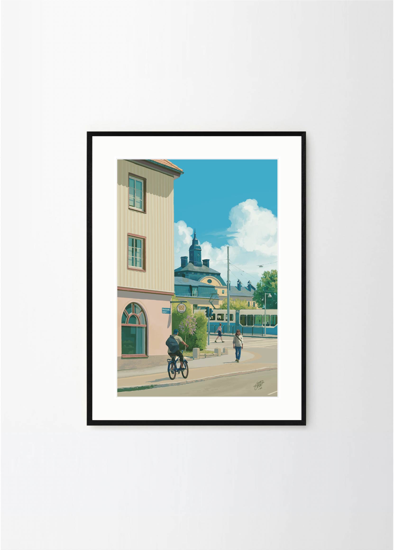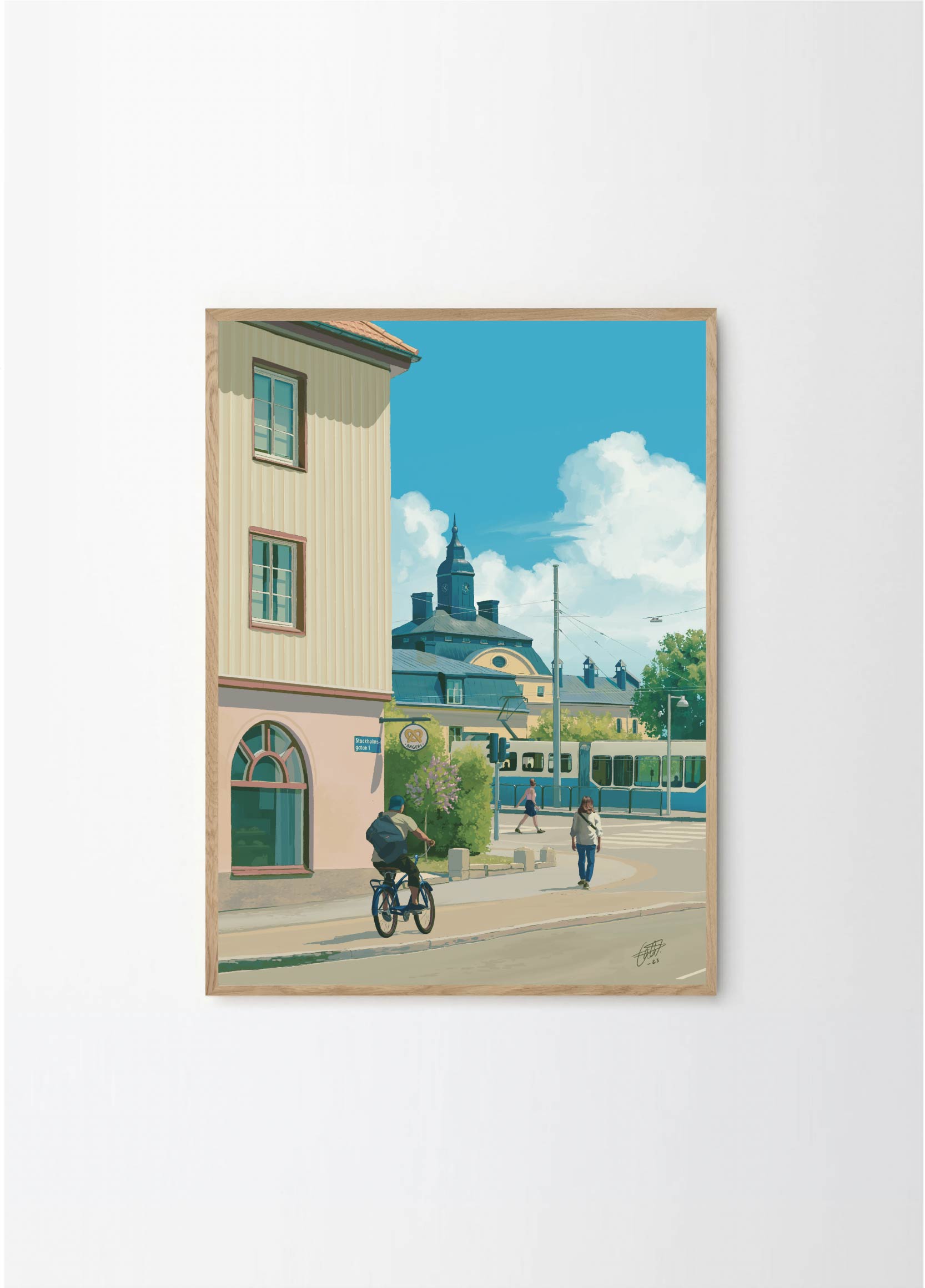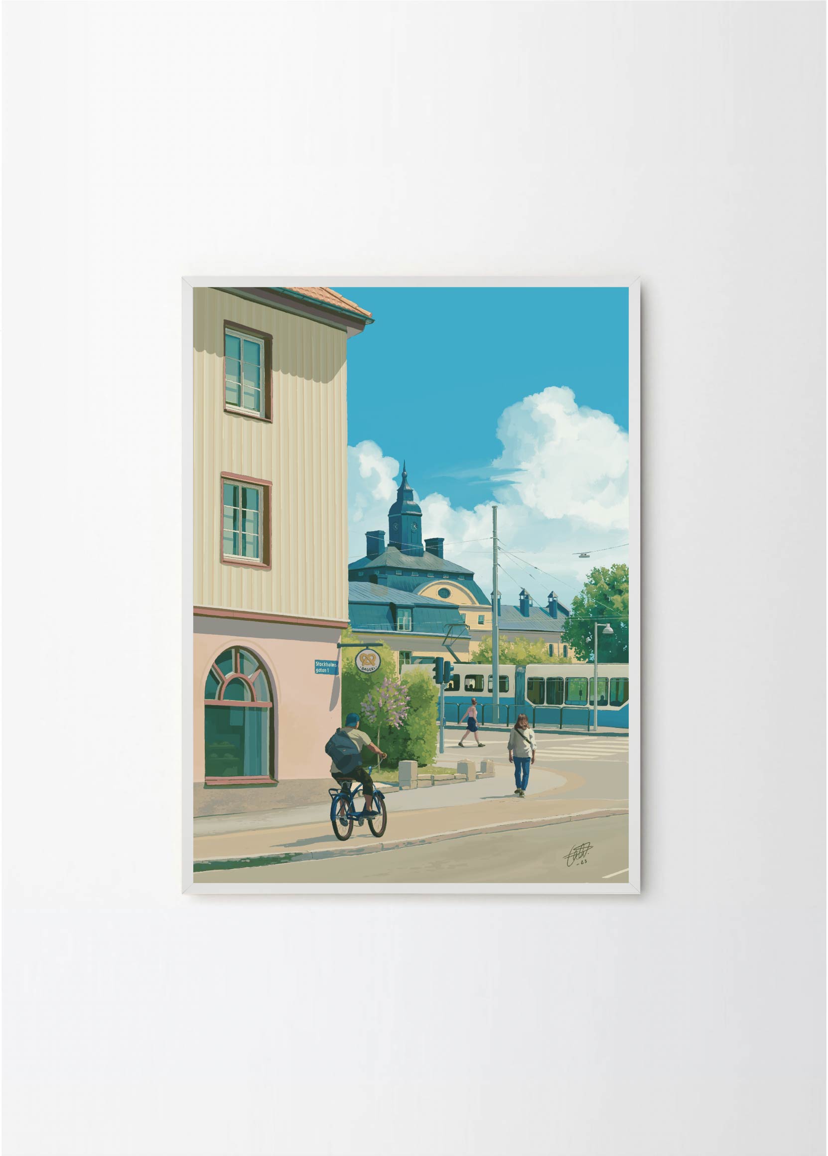 This artwork depicts a block in the neighborhood Bagaregården in Gothenburg. The lovely blue and beig colors makes it perfect for a pastelle, white or oak frame , with or without a passepartout.