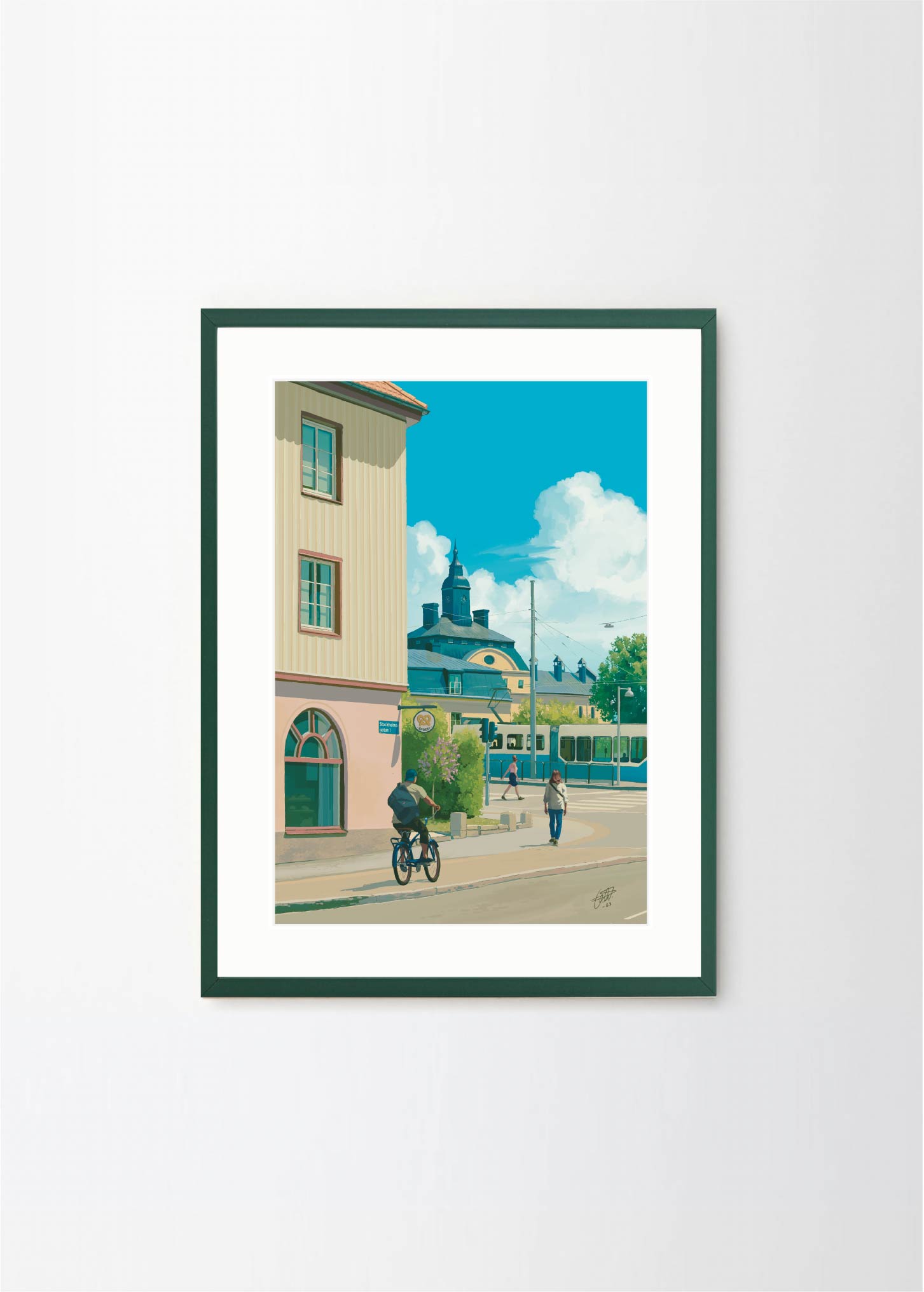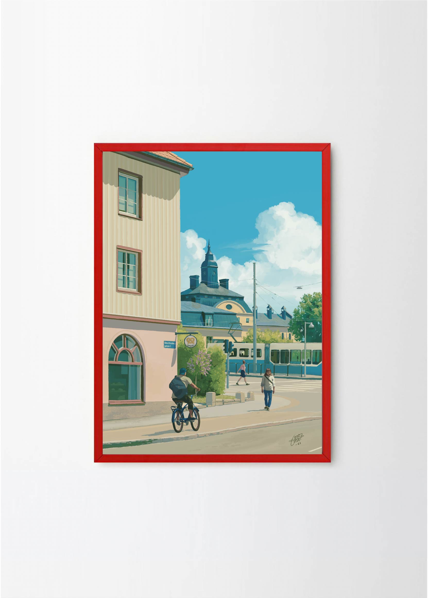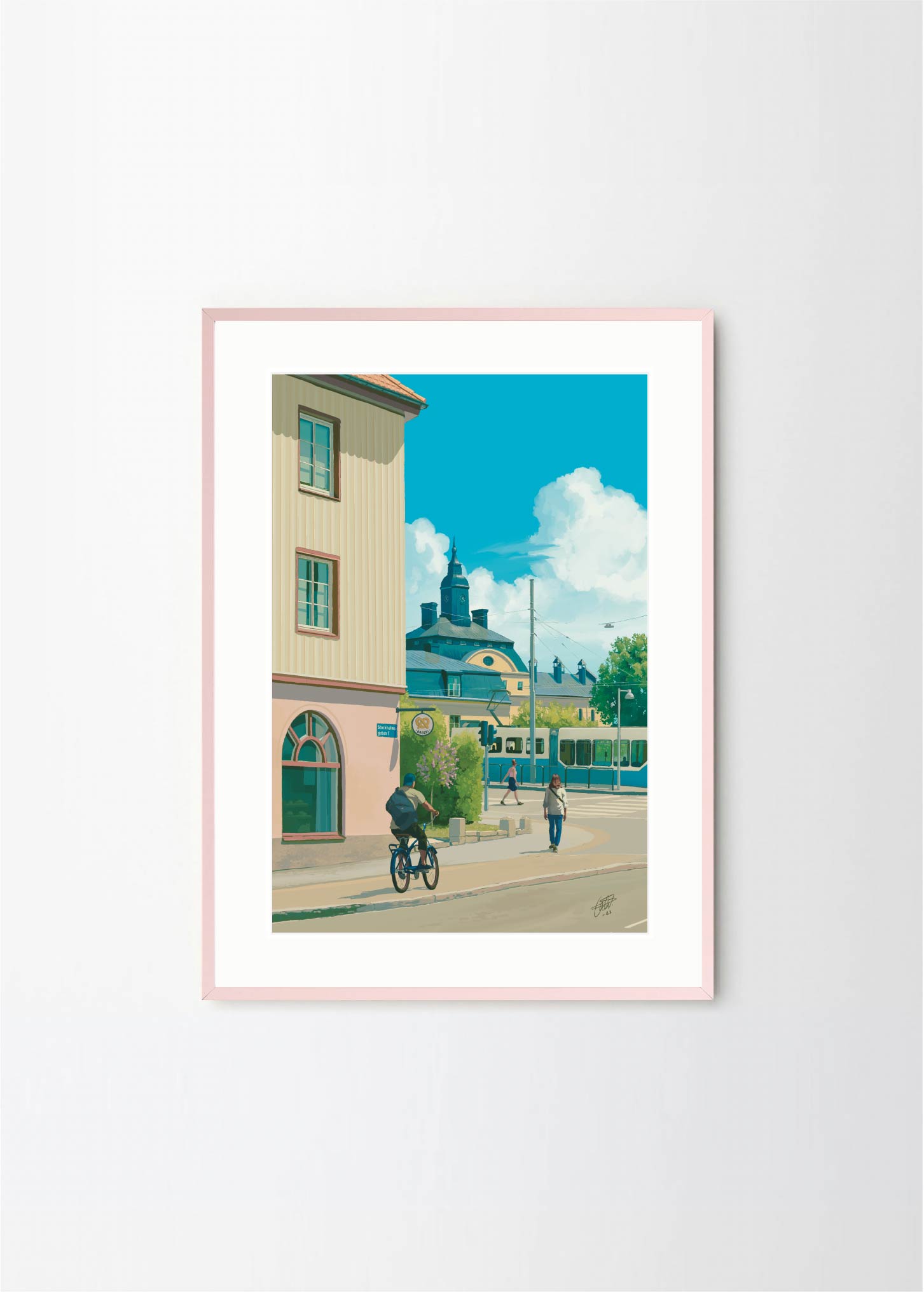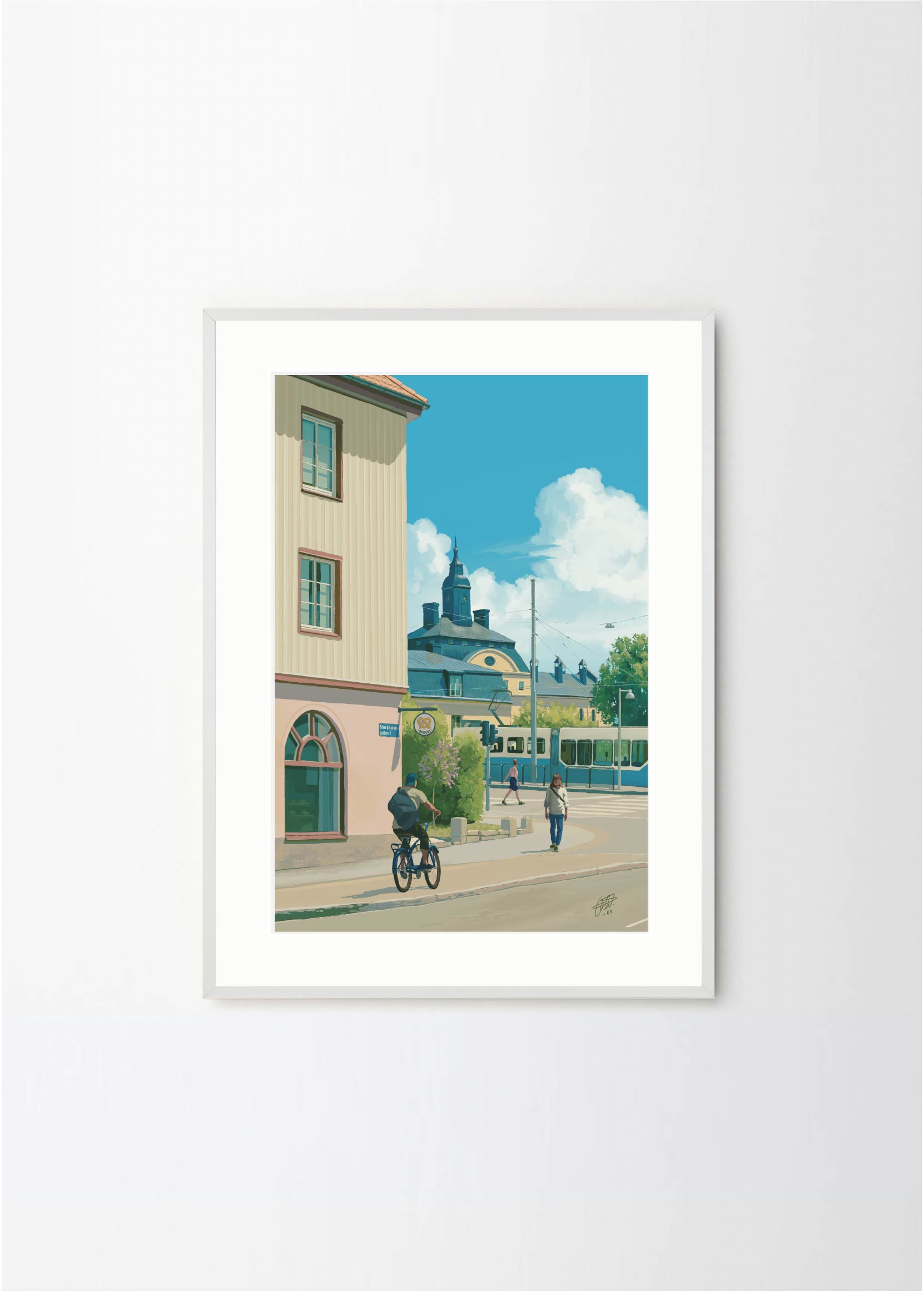 This artwork depicts a block in the neighborhood Bagaregården in Gothenburg. The lovely blue and beig colors makes it perfect for a pastelle, white or oak frame , with or without a passepartout.