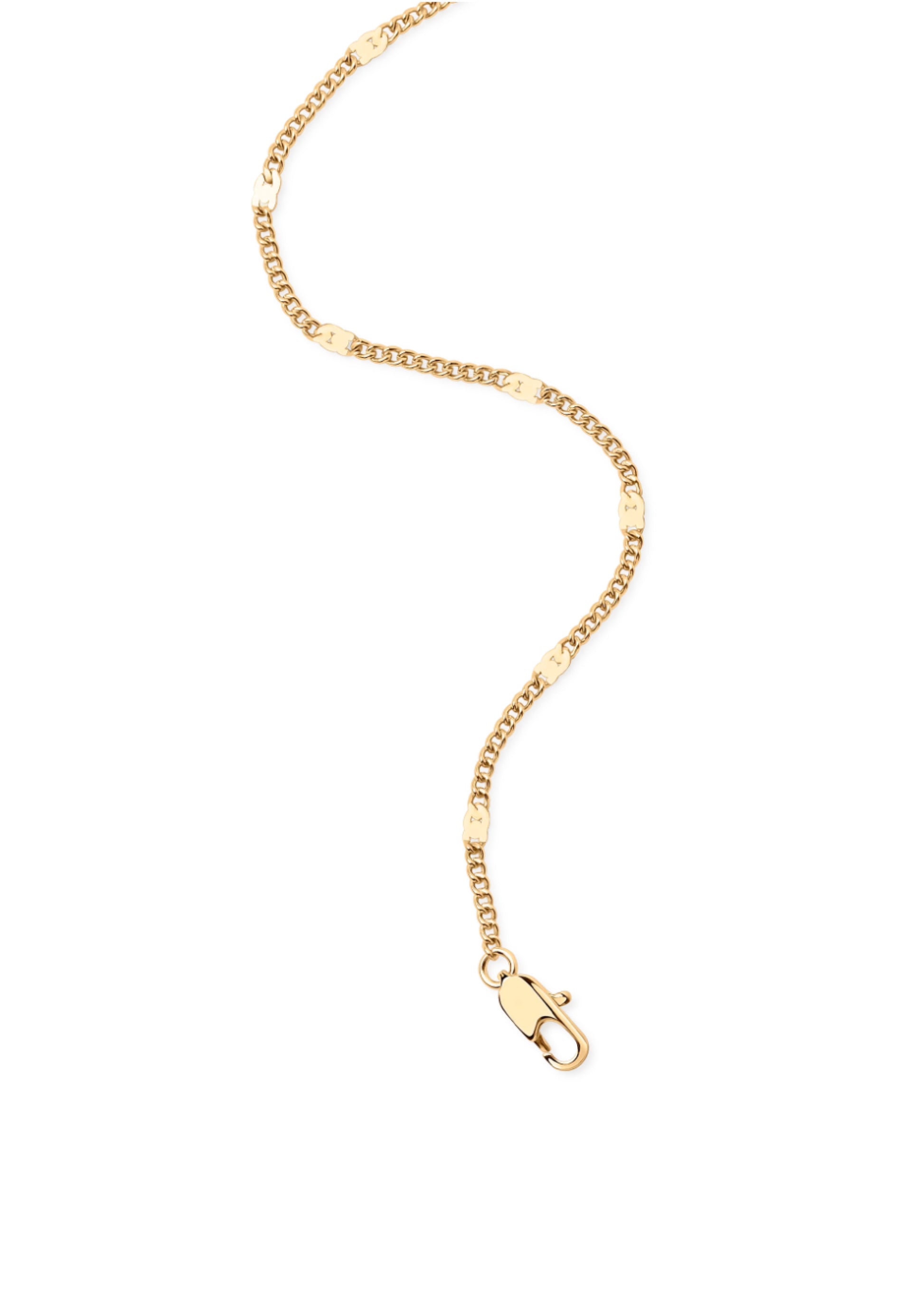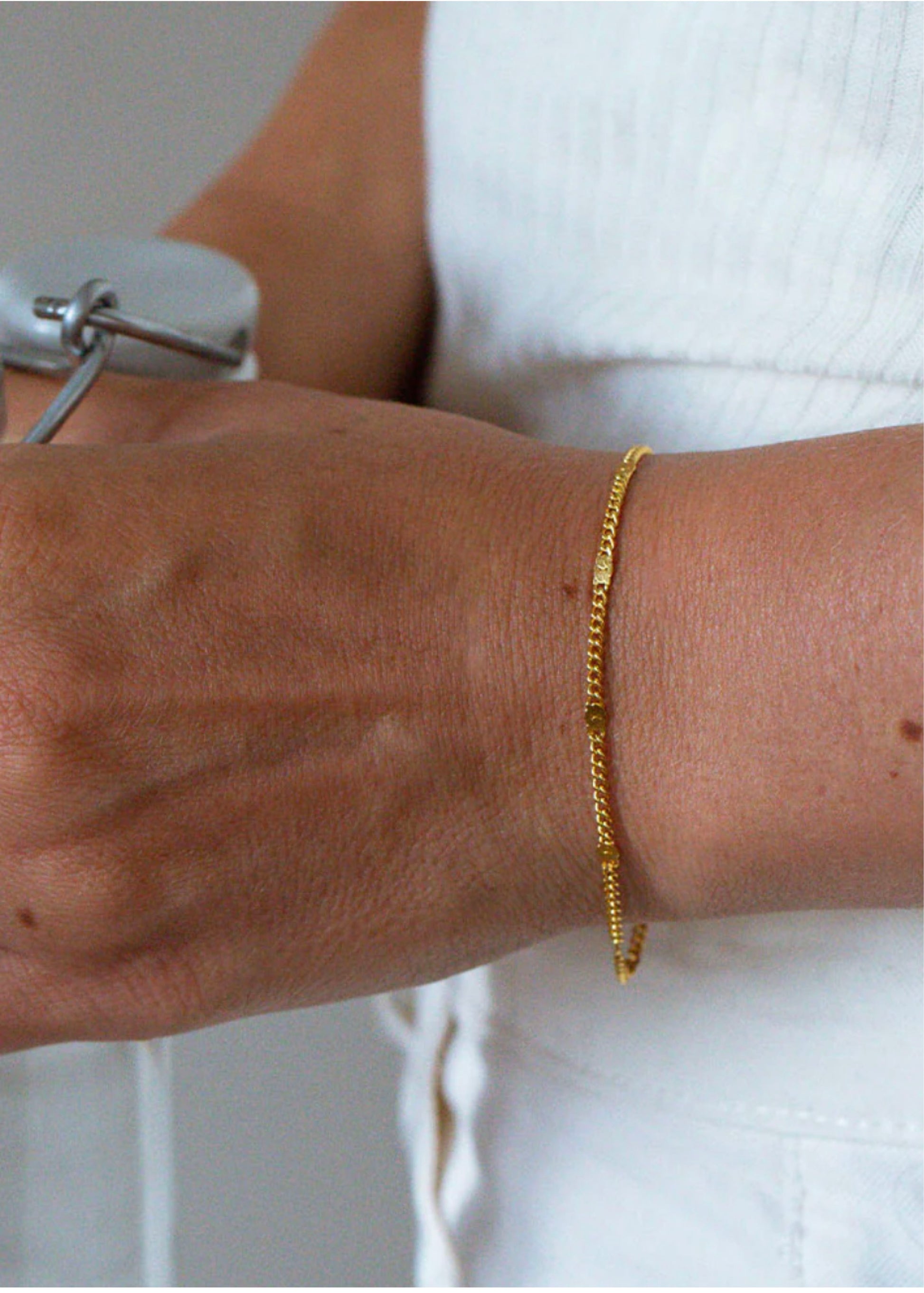 Our Beaded Curb Chain Bracelet is a simple and elegant bracelet to add to your favorite summer outfit. You can stack it both with other bracelets or wear by it self for a simple and minimalistic look, and is a must have on your wrist this summer. A perfect match with our Baeded Curb Chain Anklet Silver for a full look. The bracelet is made of 18k gold plated brass and measures 16cm with a possible extension of 2cm and is also available in silver.