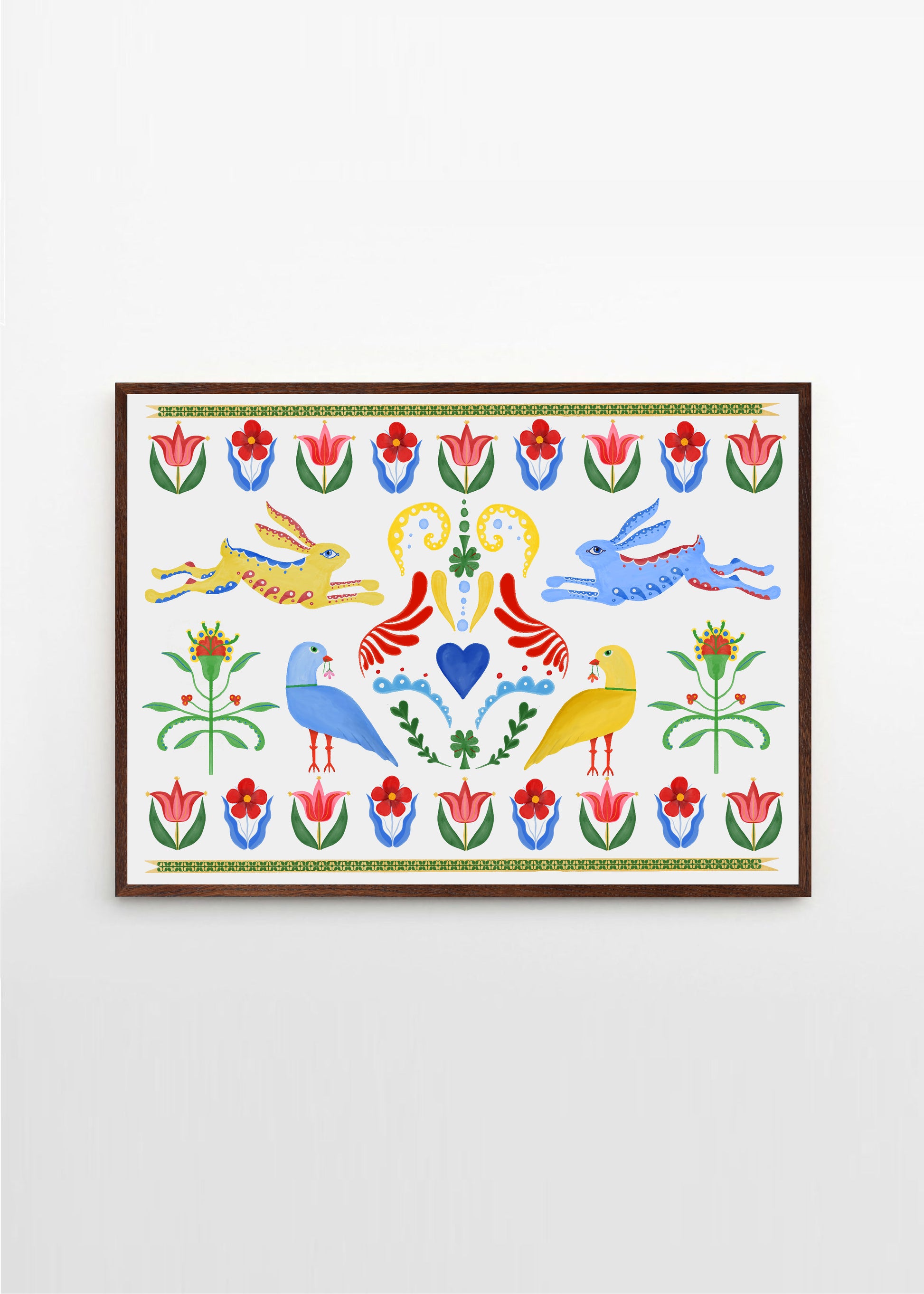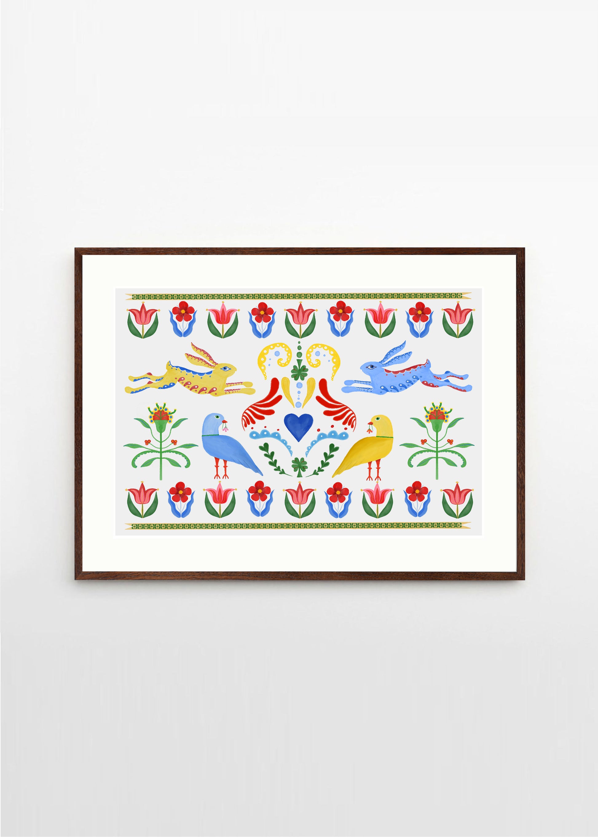 The illustration of a traditional swedish inpired, but quite innovative artwork depicting rabbit, birds and florals. This animal poster with tones of green, red, and blue really captures traditional scandinavian design. This artwork would be perfect with a walnut or green frame.
