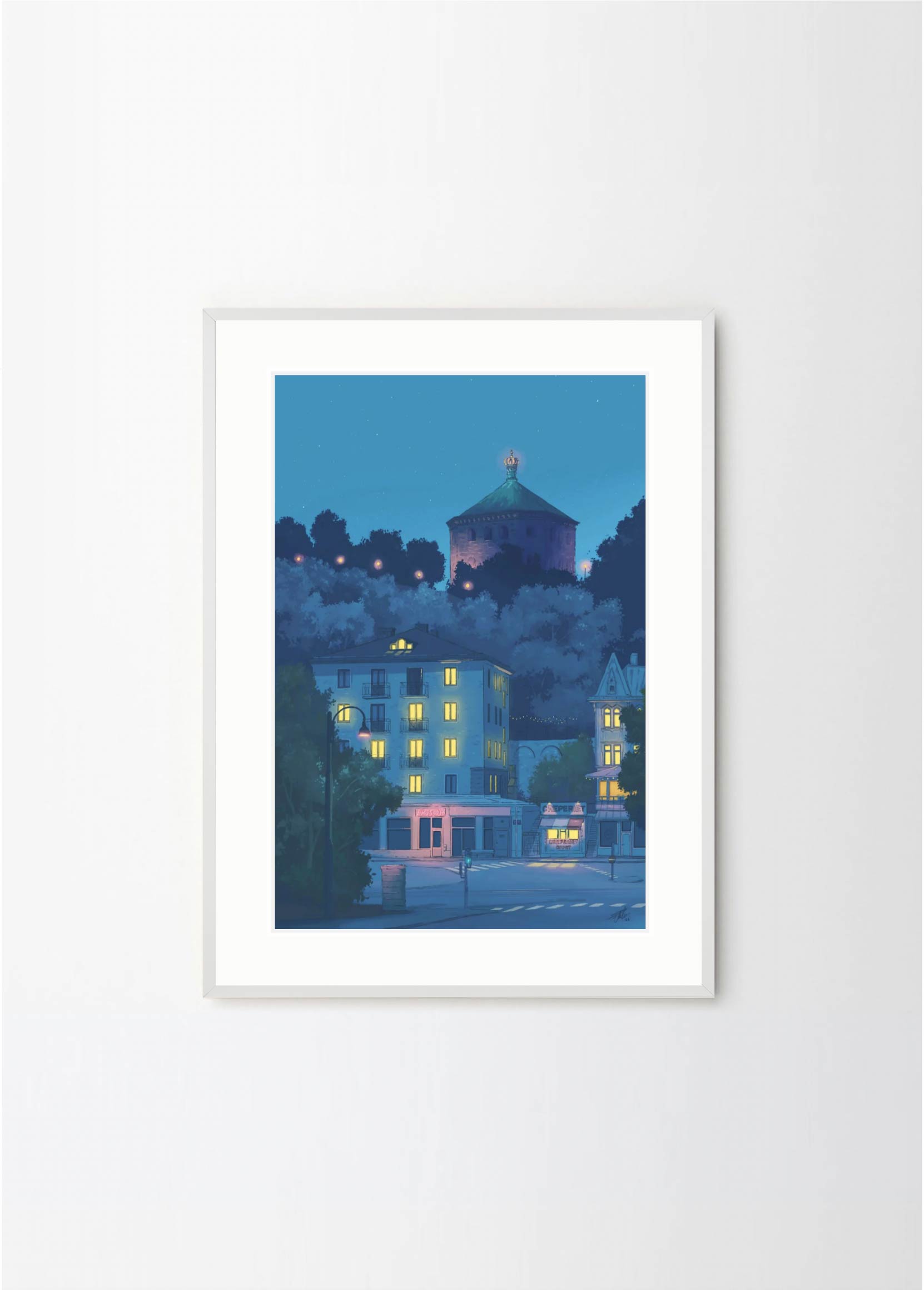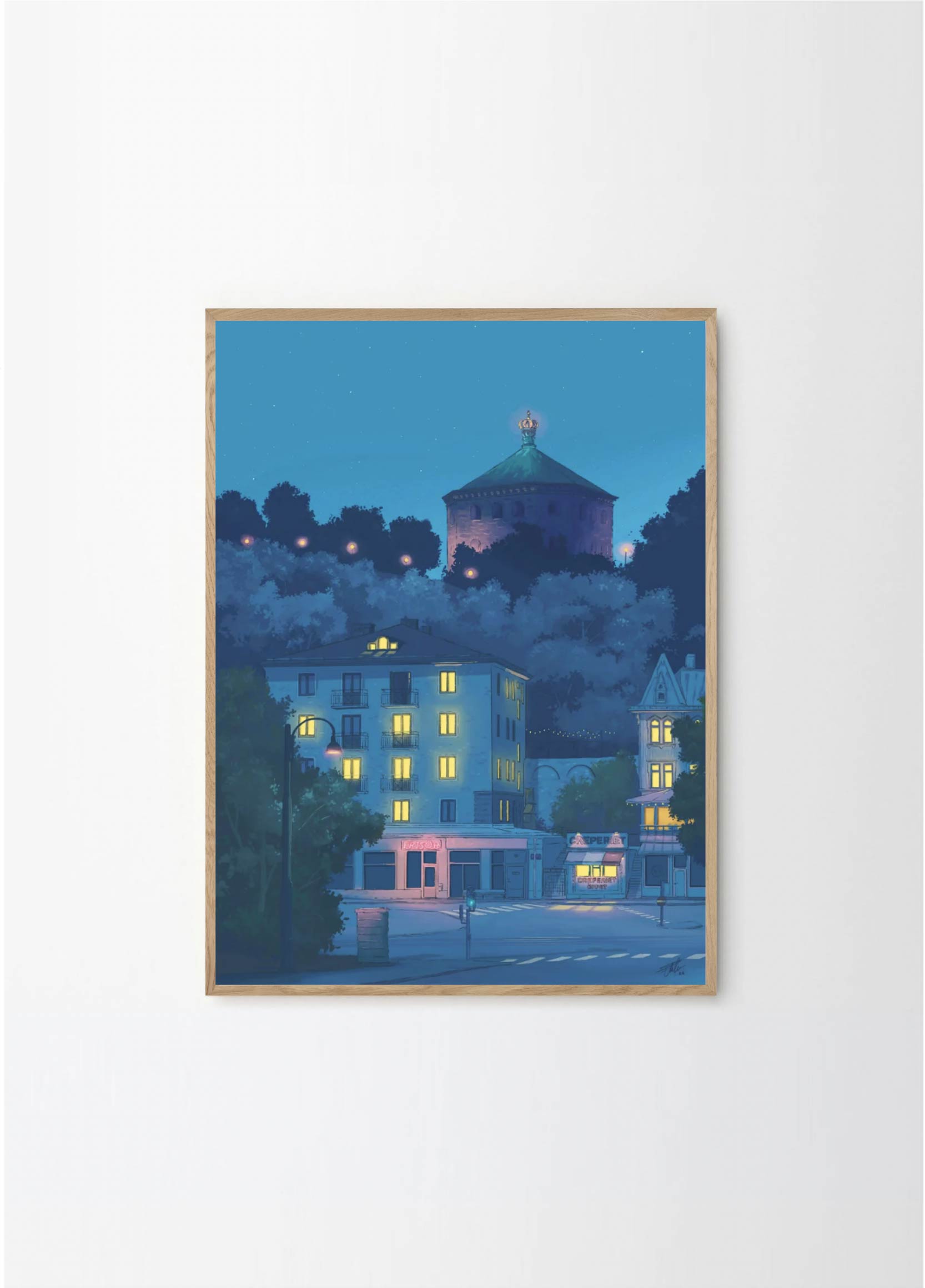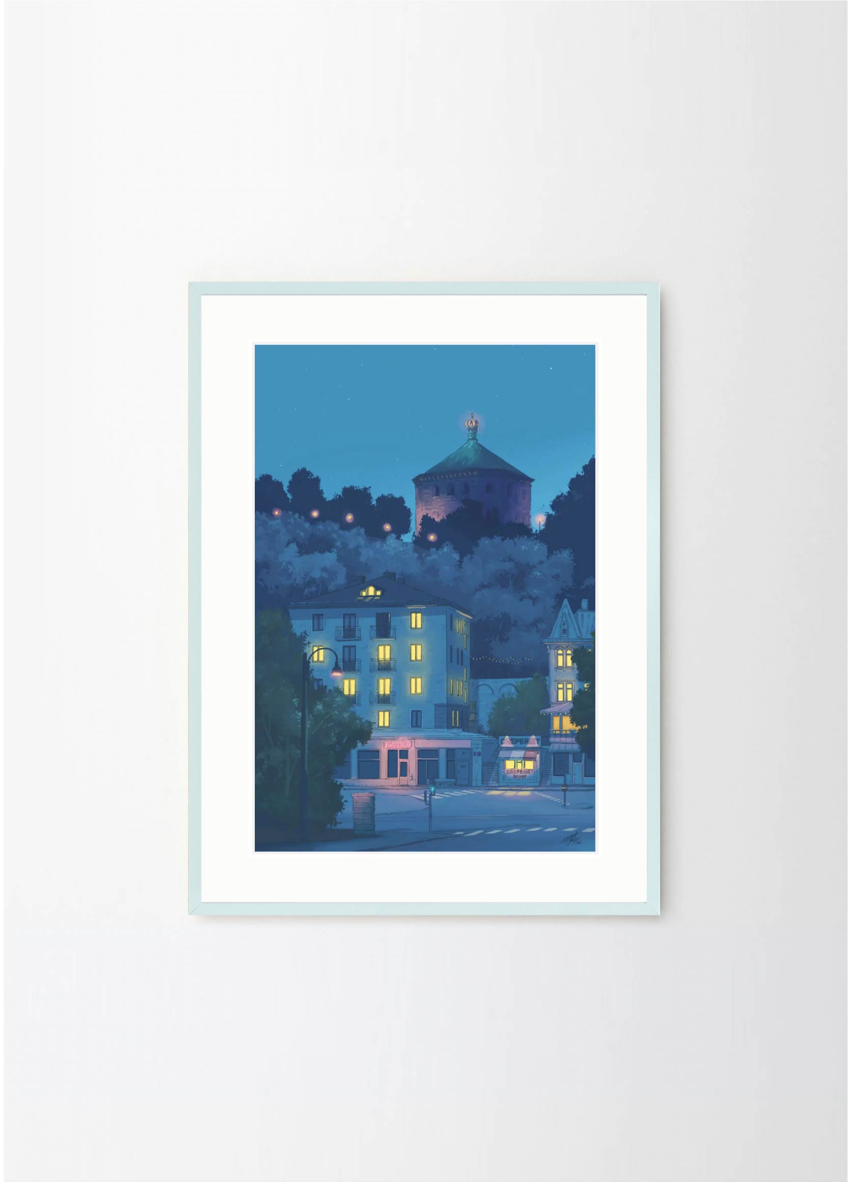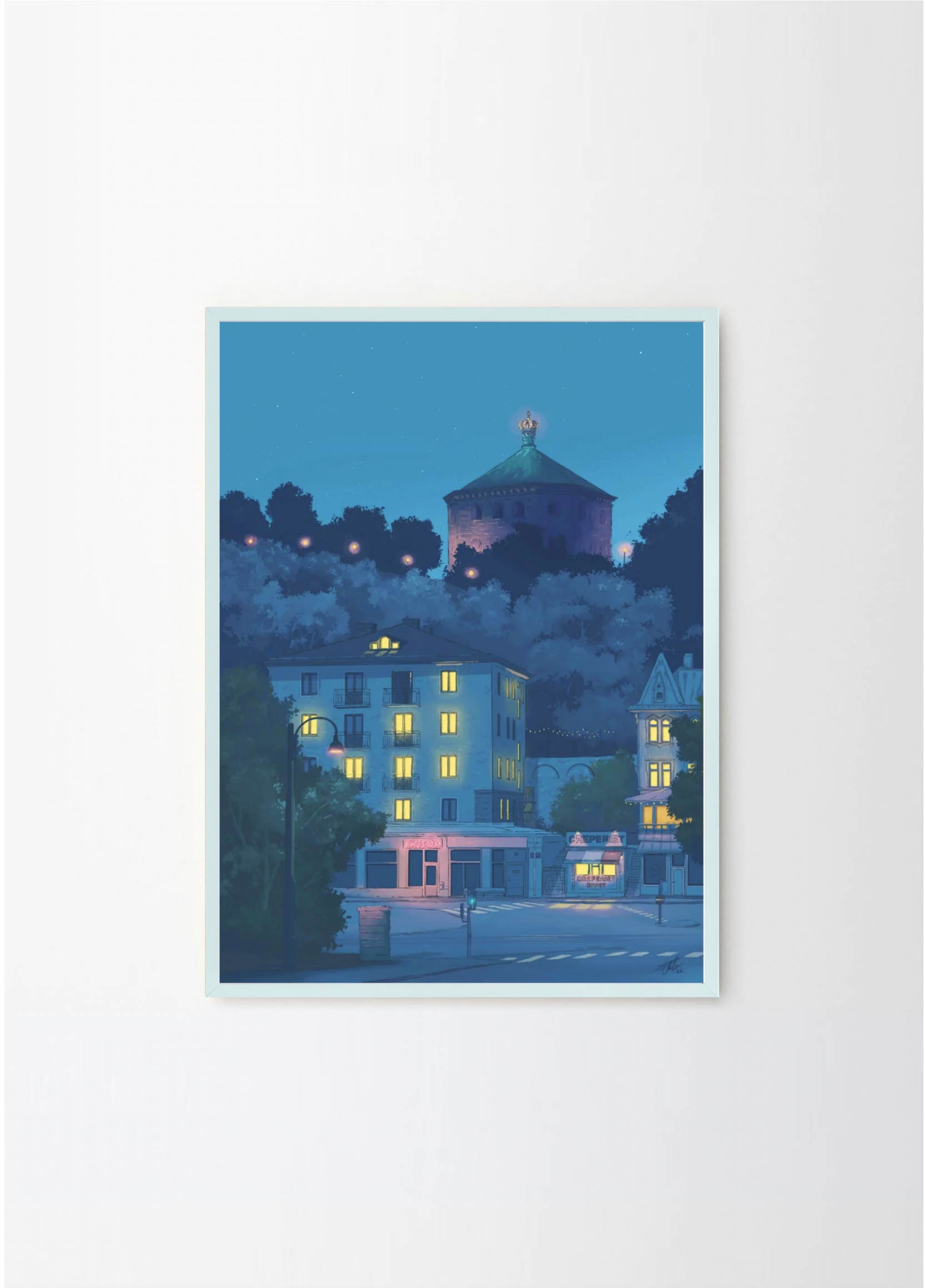 This artwork depicts one of the prettiest blocks in the neighborhood Linné in Gothenburg, featuring the Crepe place and Skansen Kronan. The lovely blue colors makes it perfect for a black or green frame , with or without a passepartout.
