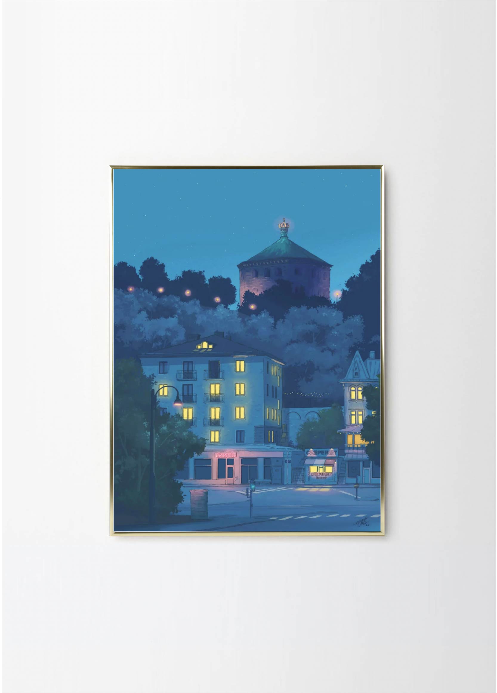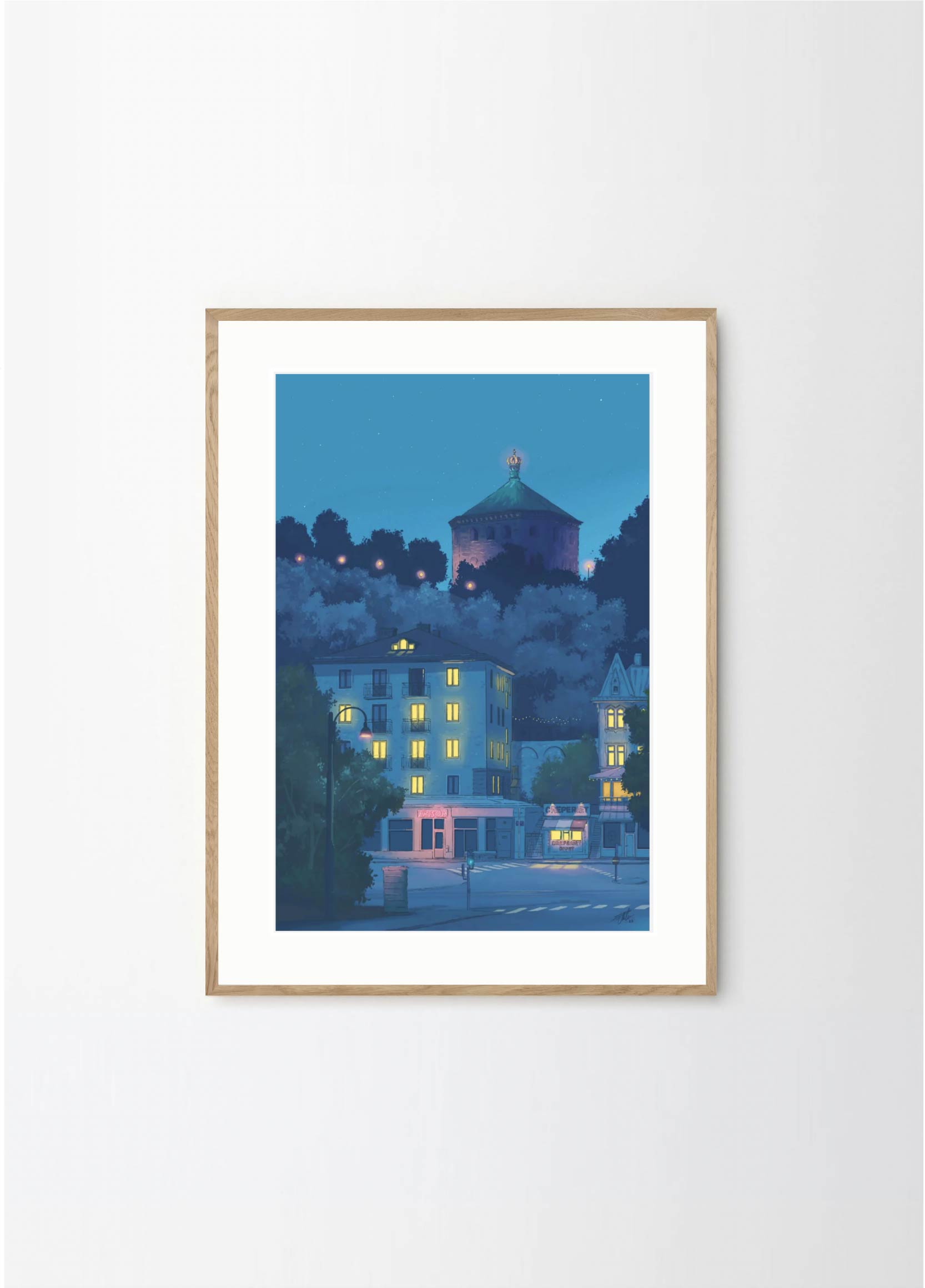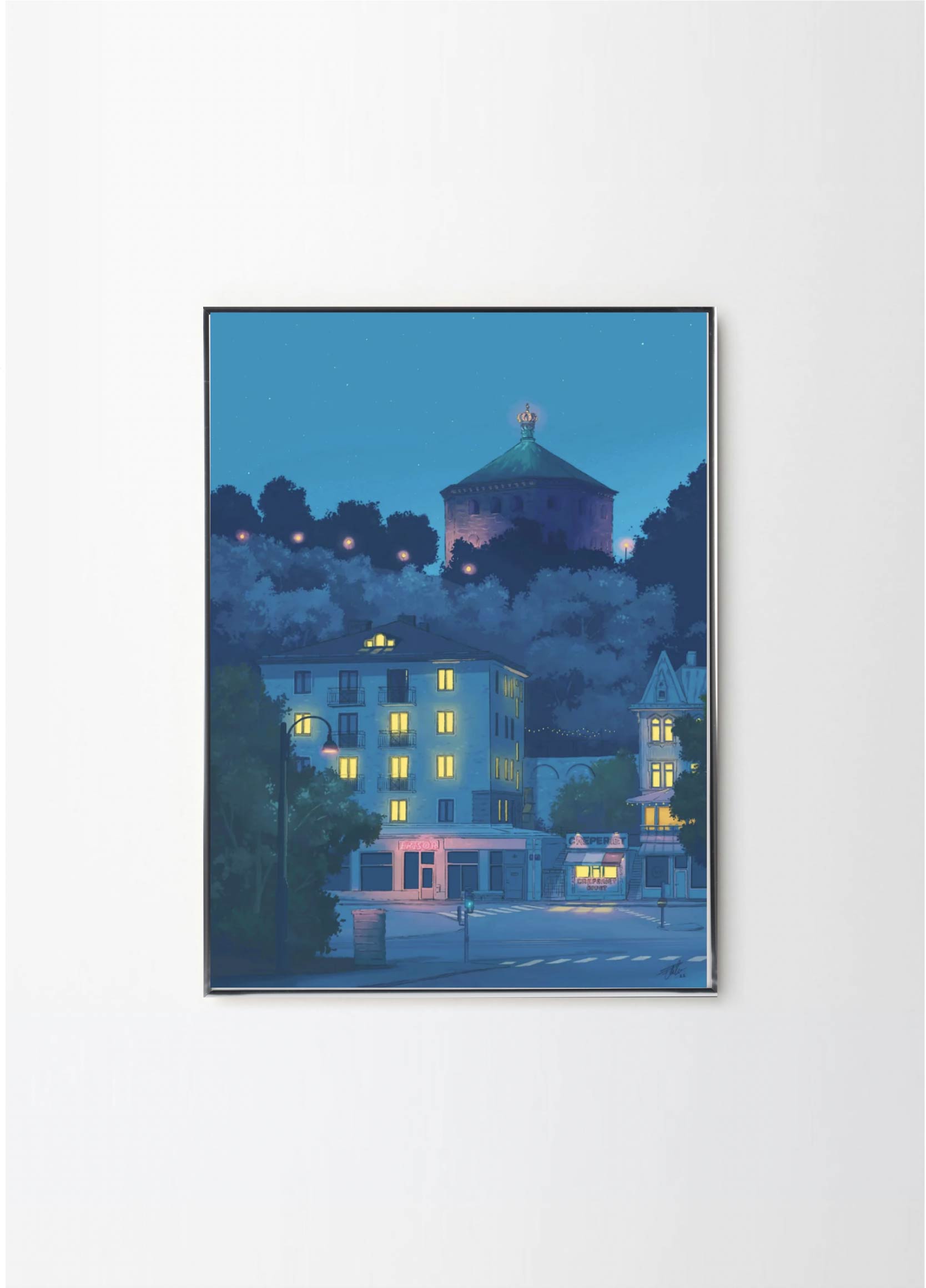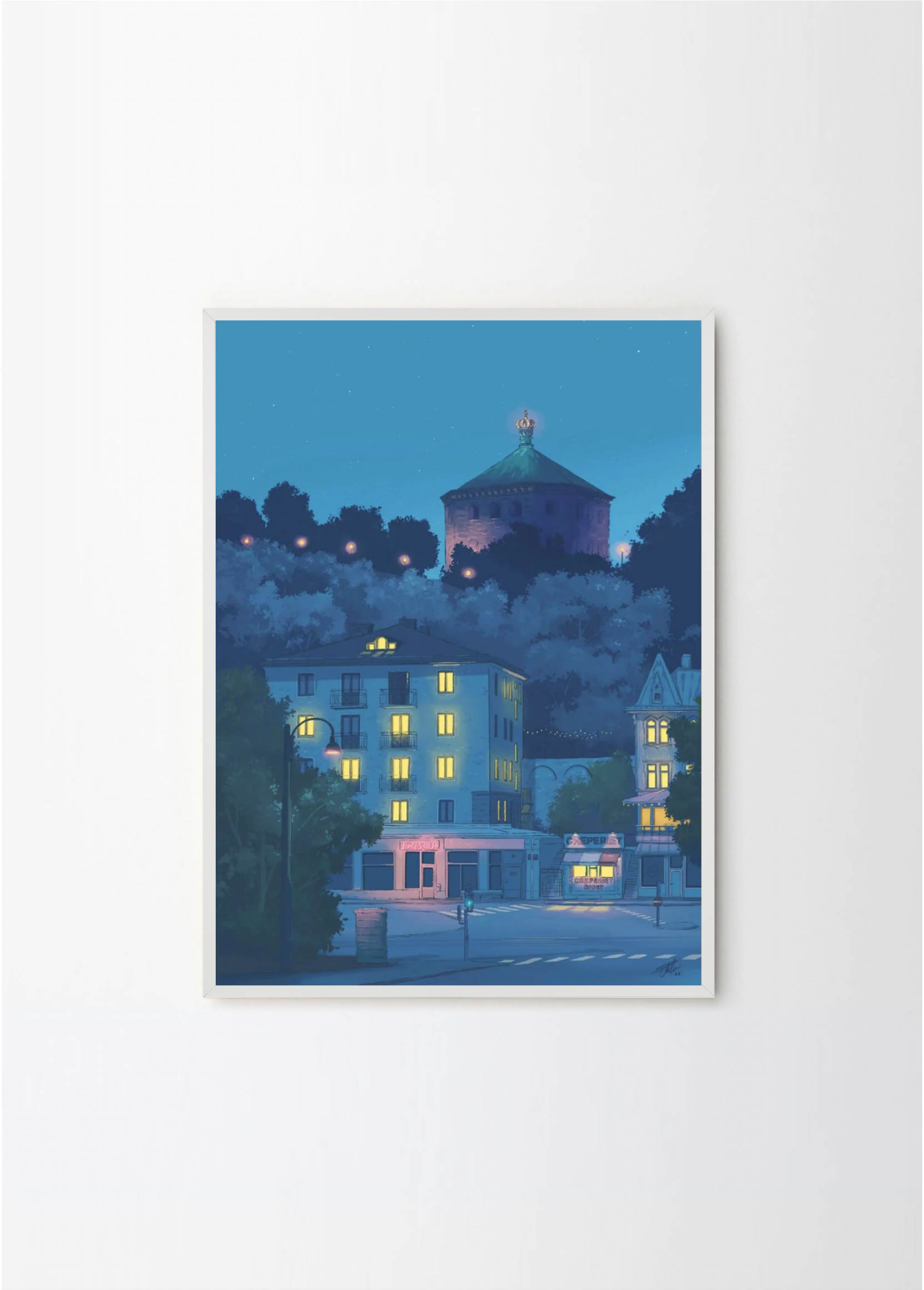 This artwork depicts one of the prettiest blocks in the neighborhood Linné in Gothenburg, featuring the Crepe place and Skansen Kronan. The lovely blue colors makes it perfect for a black or green frame , with or without a passepartout.