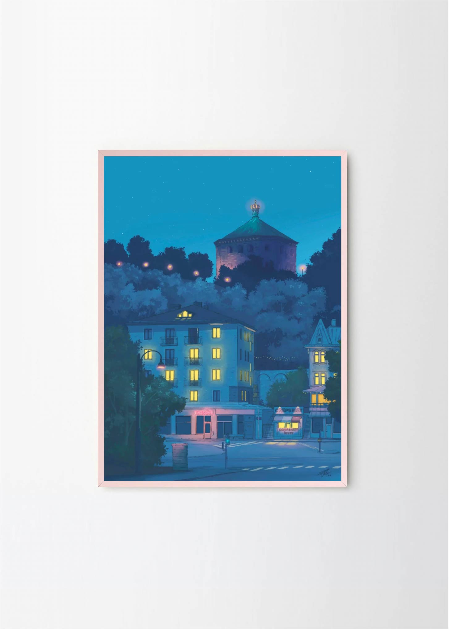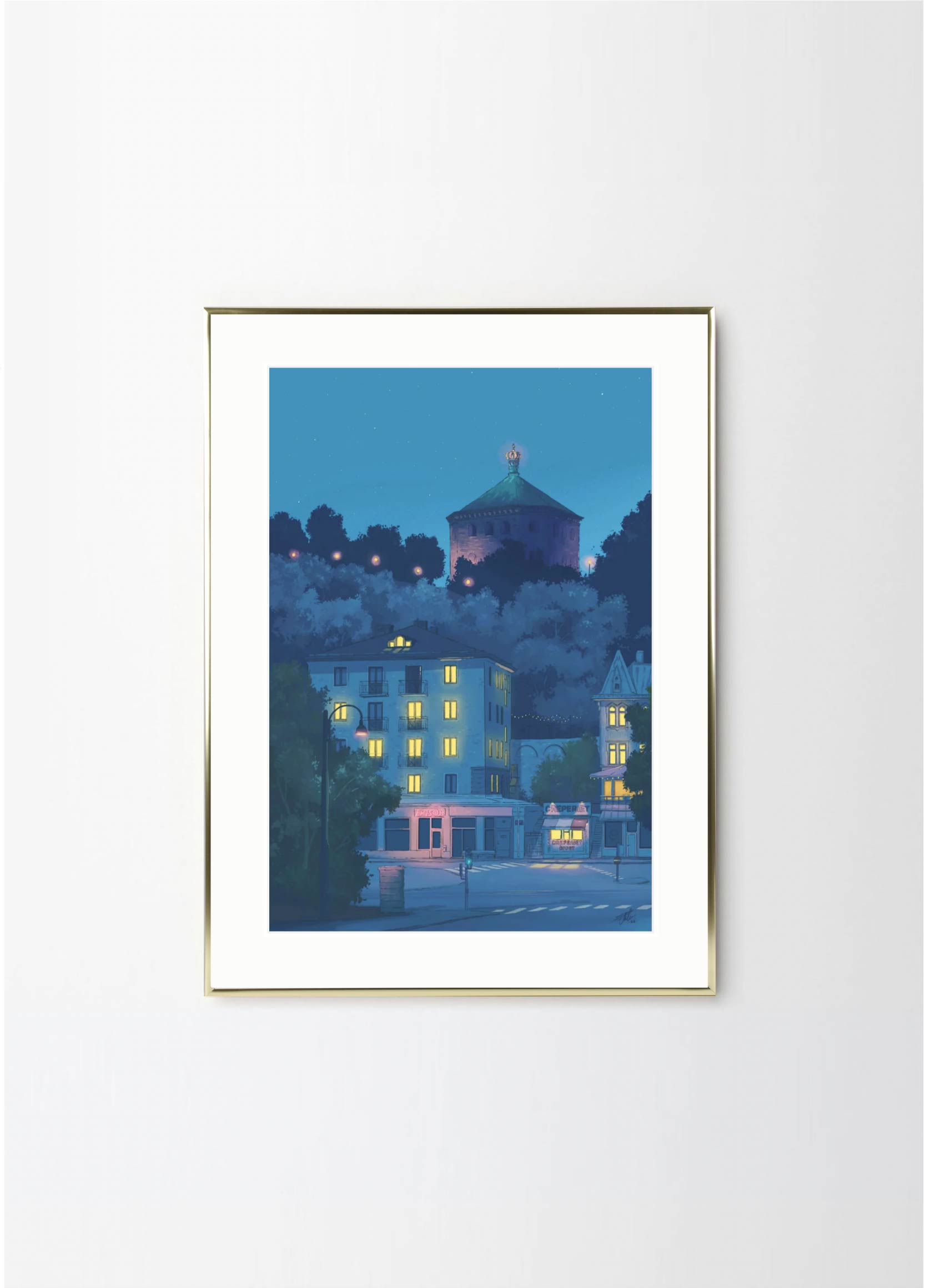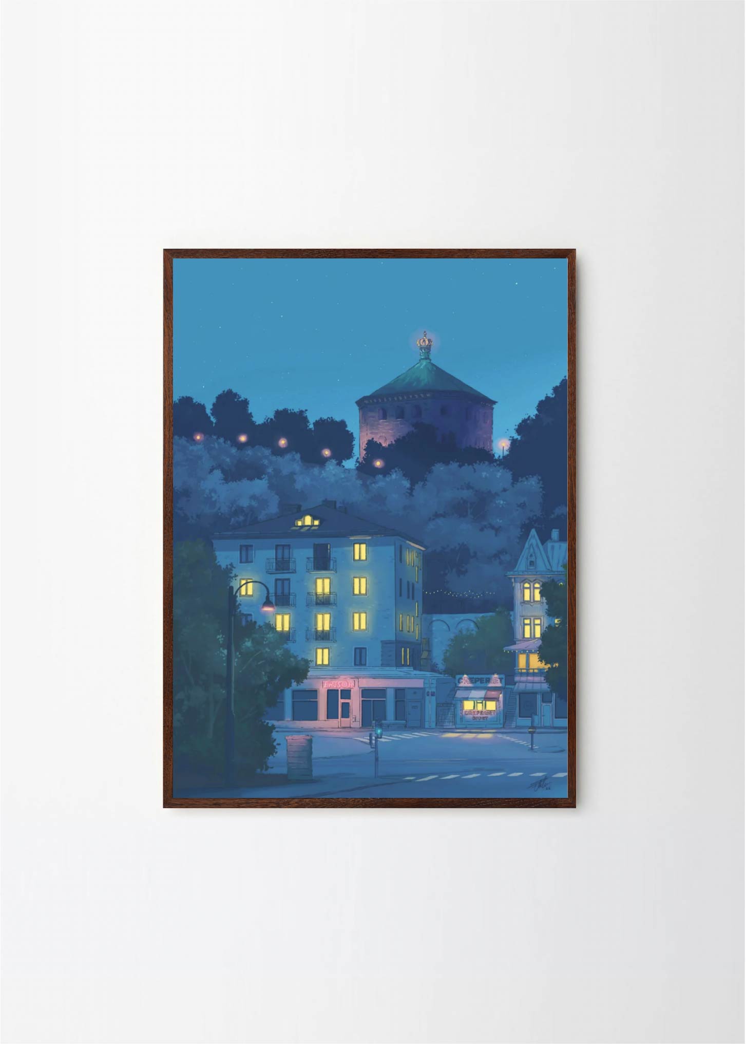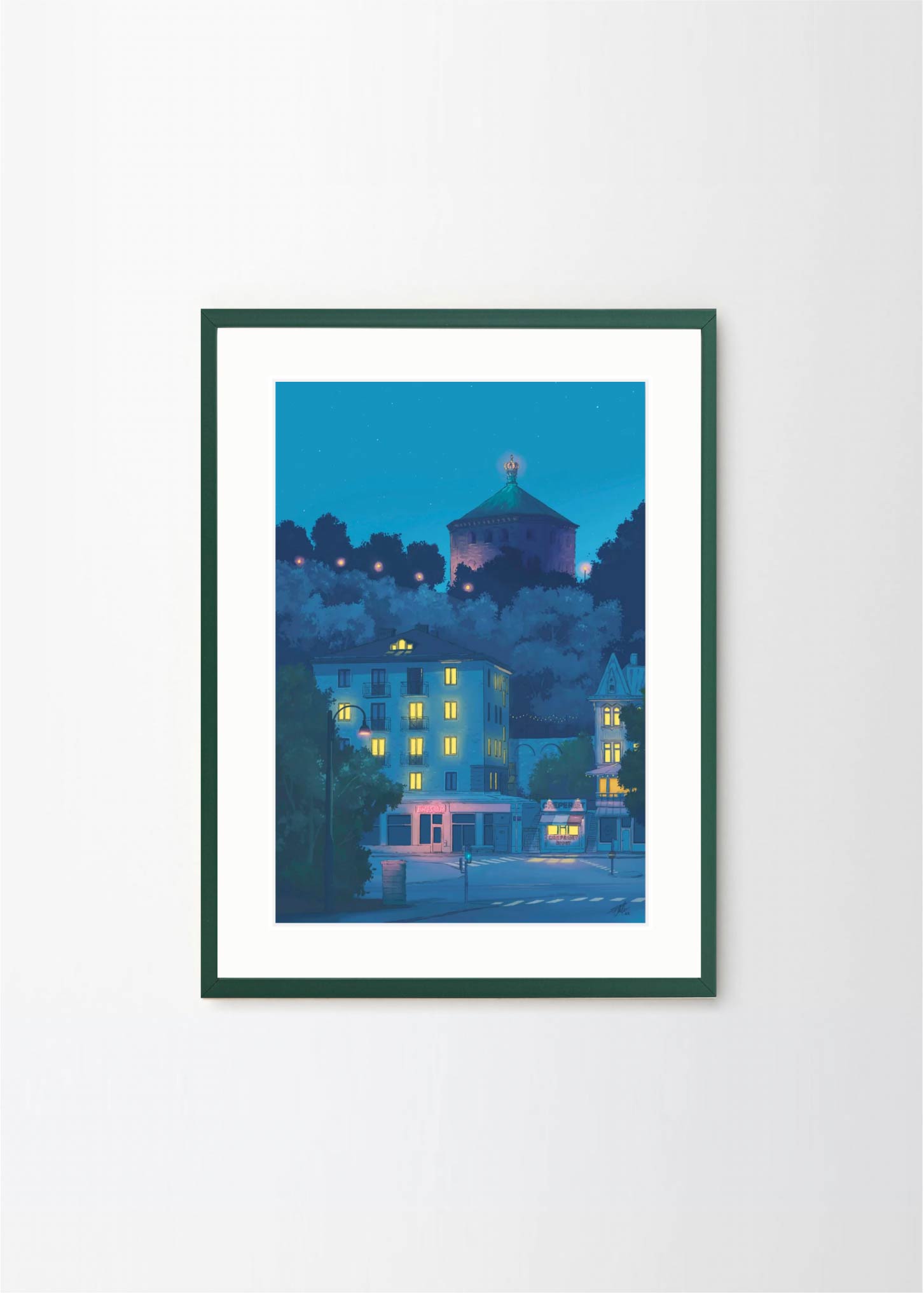 This artwork depicts one of the prettiest blocks in the neighborhood Linné in Gothenburg, featuring the Crepe place and Skansen Kronan. The lovely blue colors makes it perfect for a black or green frame , with or without a passepartout.