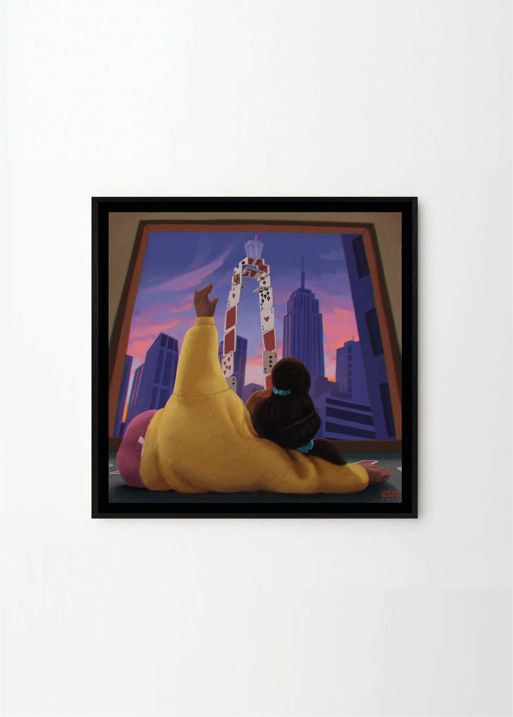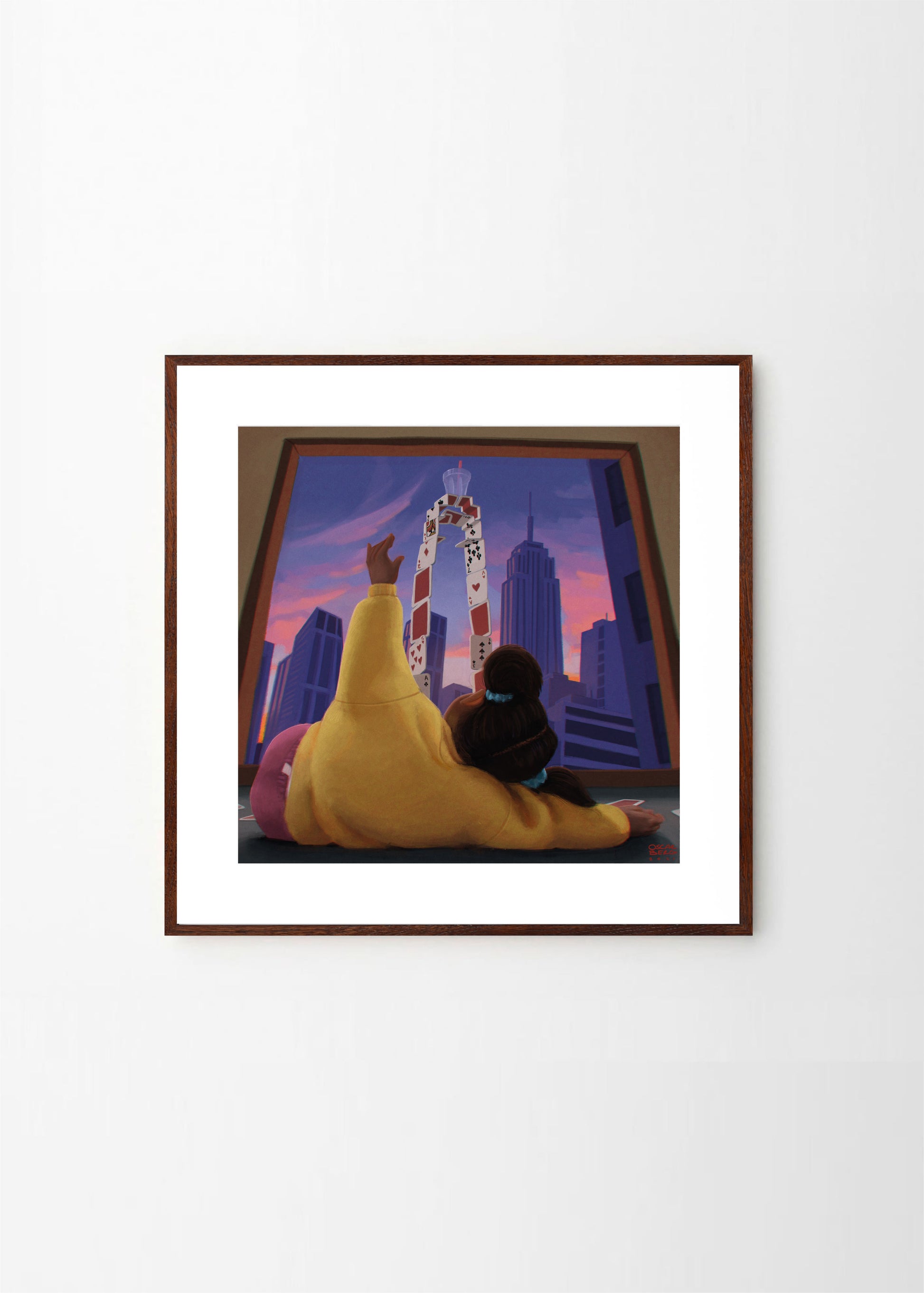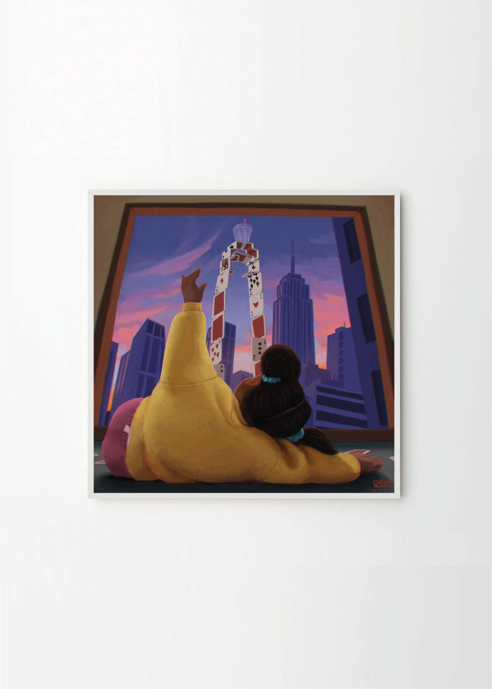 The square artwork Empire by Oscar Berg depicts an illustration of a girl building a tower of cards, resembling NYC. The yellow, brown and dark colors makes it perfect for a walnut or black frame.