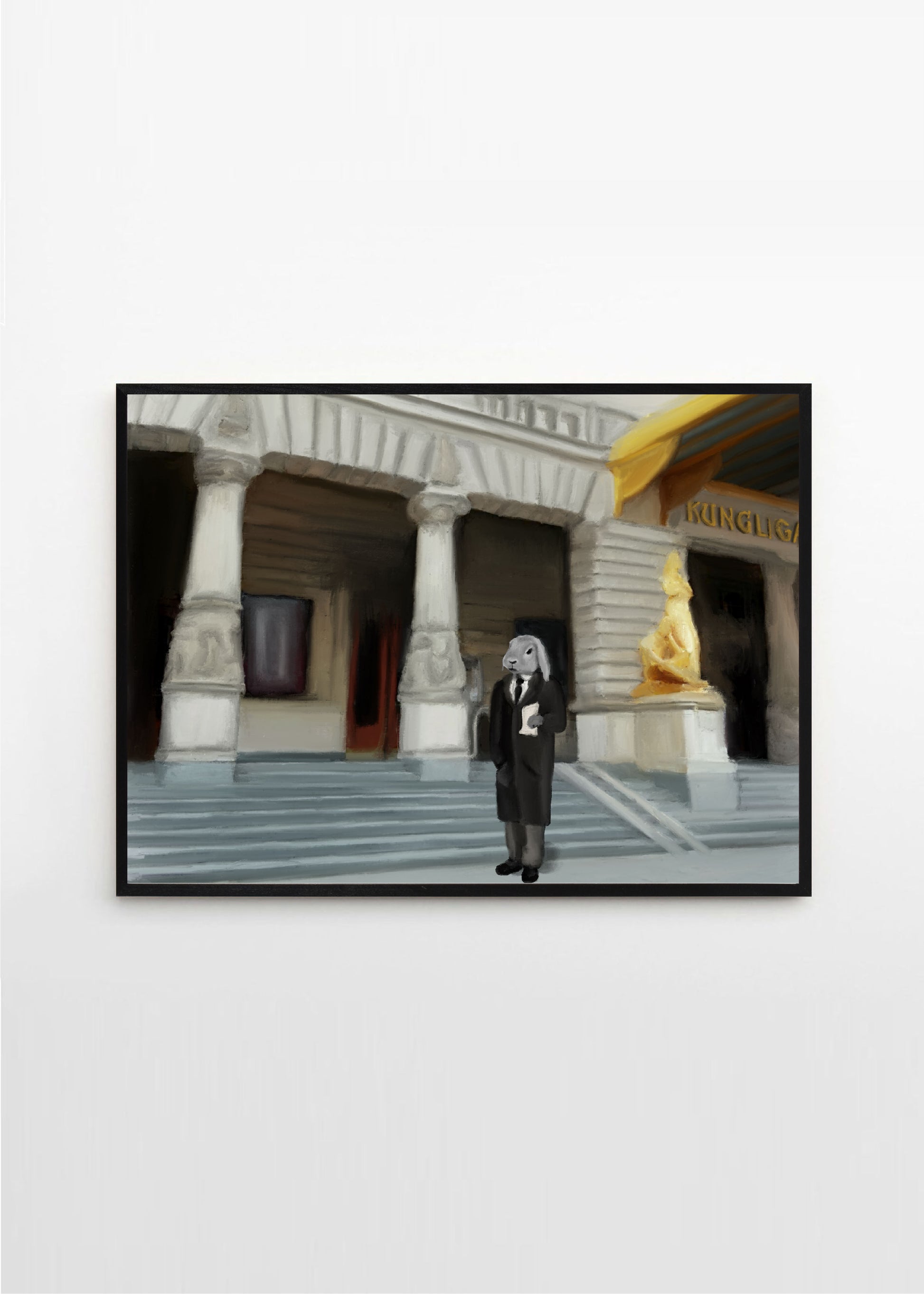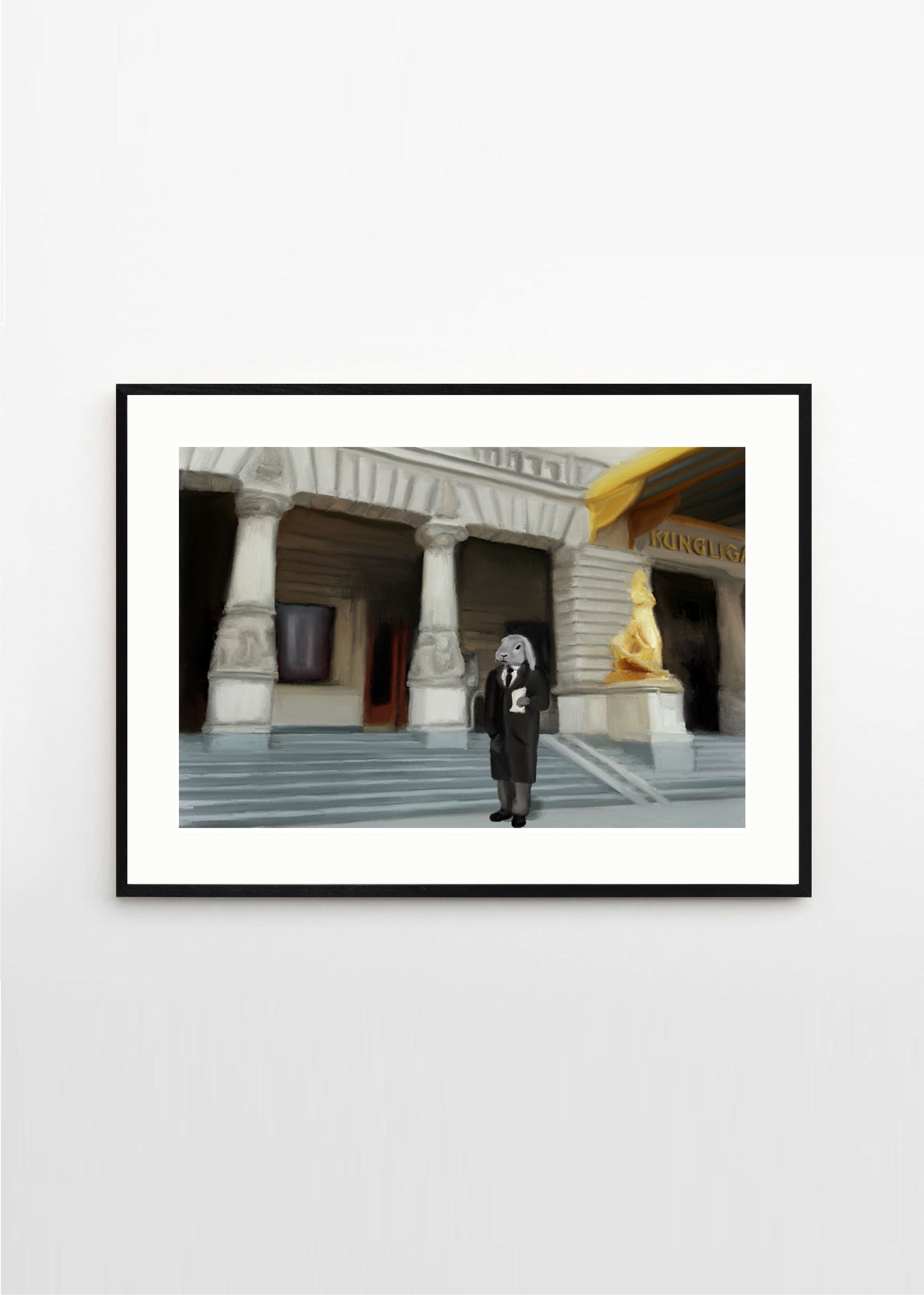 This lovely depicts a cute rabbit dressed to attend the iconic Stockholm theatre Dramaten. The grey, black and yellowcolors makes it perfect for a black, silver or walnut frame with a passepartout. A significant characteristic of Estelle Graf's work is that she almost always works with satire.