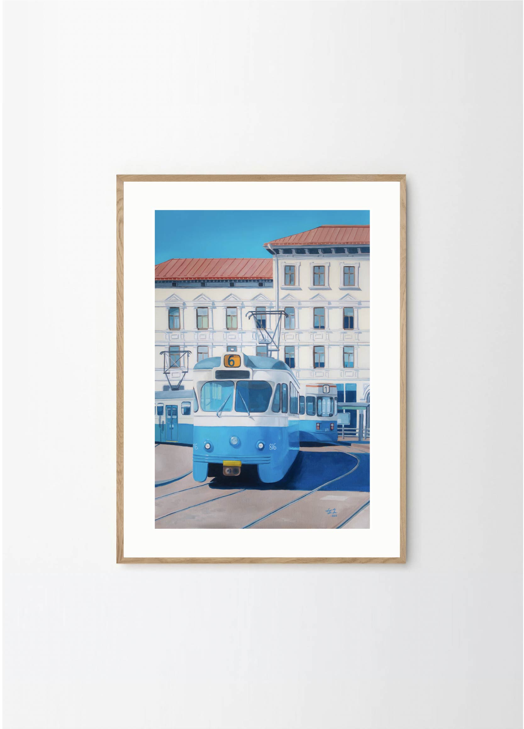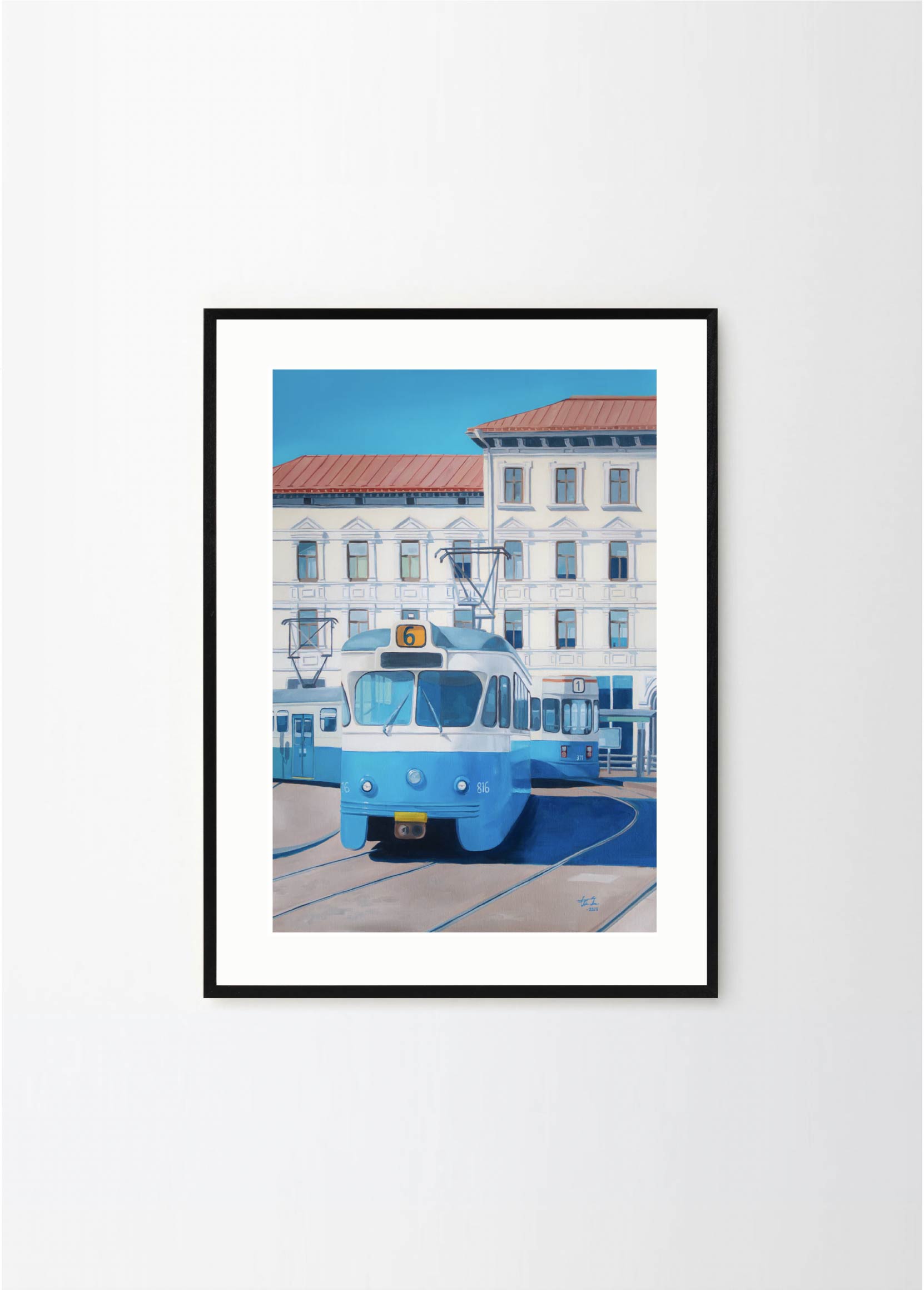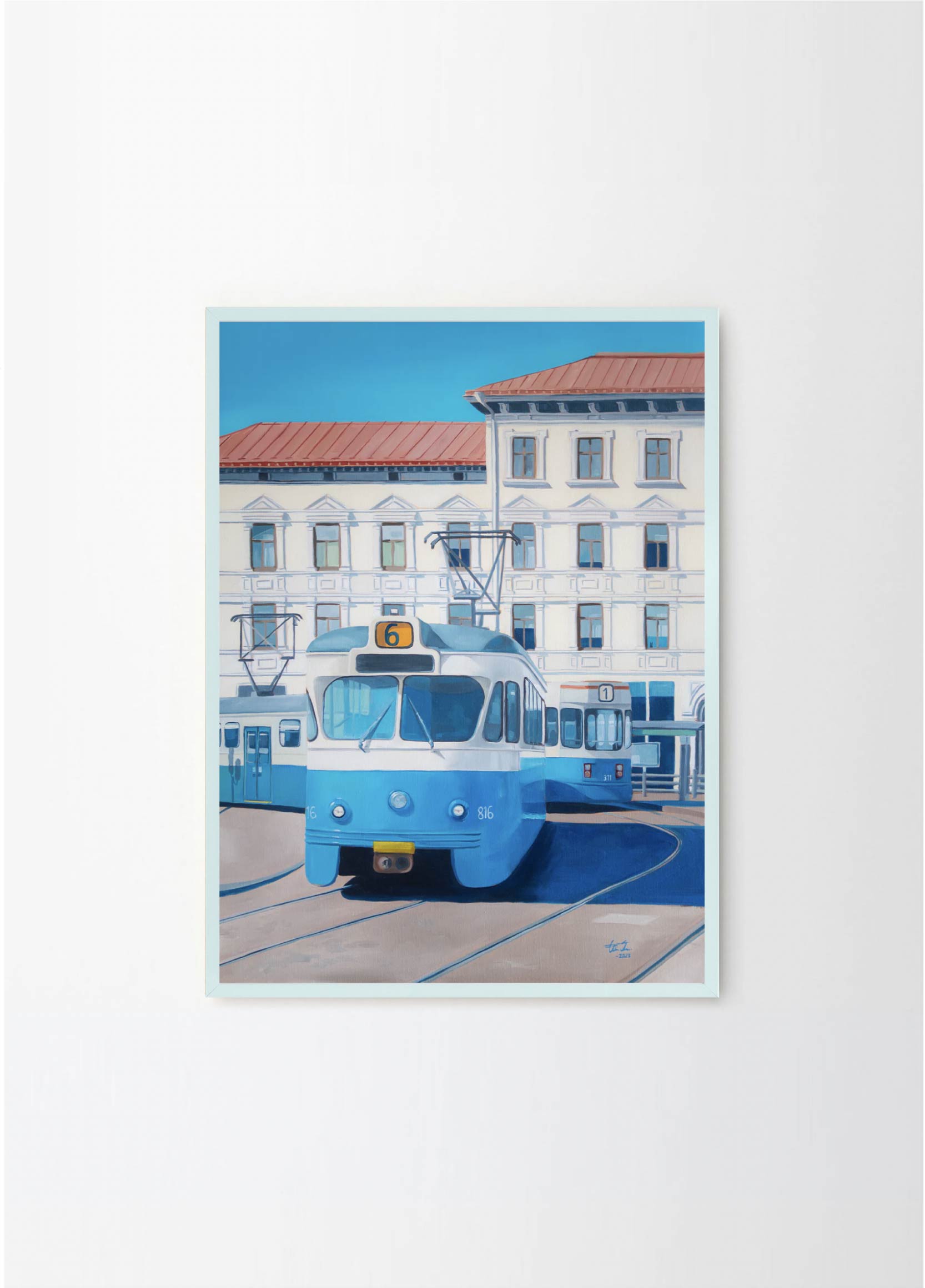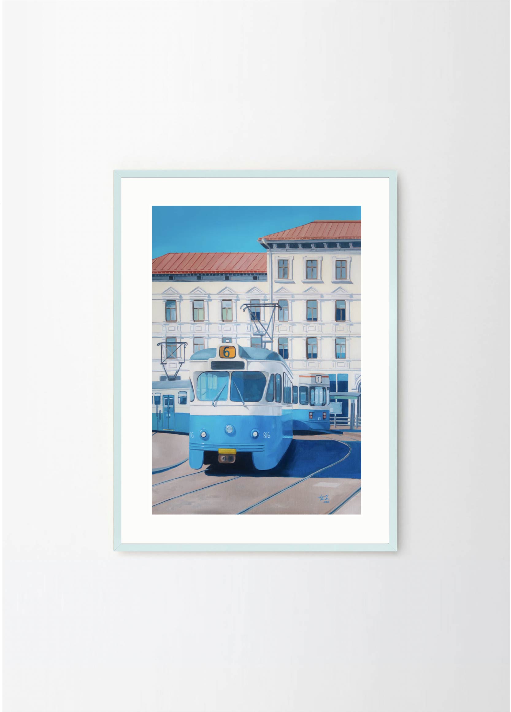 "Now only a memory" - This artwork depicts one of the old trams on a beatiful sunny day in Gothenburg. The lovely blue and beige colors makes it perfect for a pastelle, walnut or green frame , with or without a passepartout.