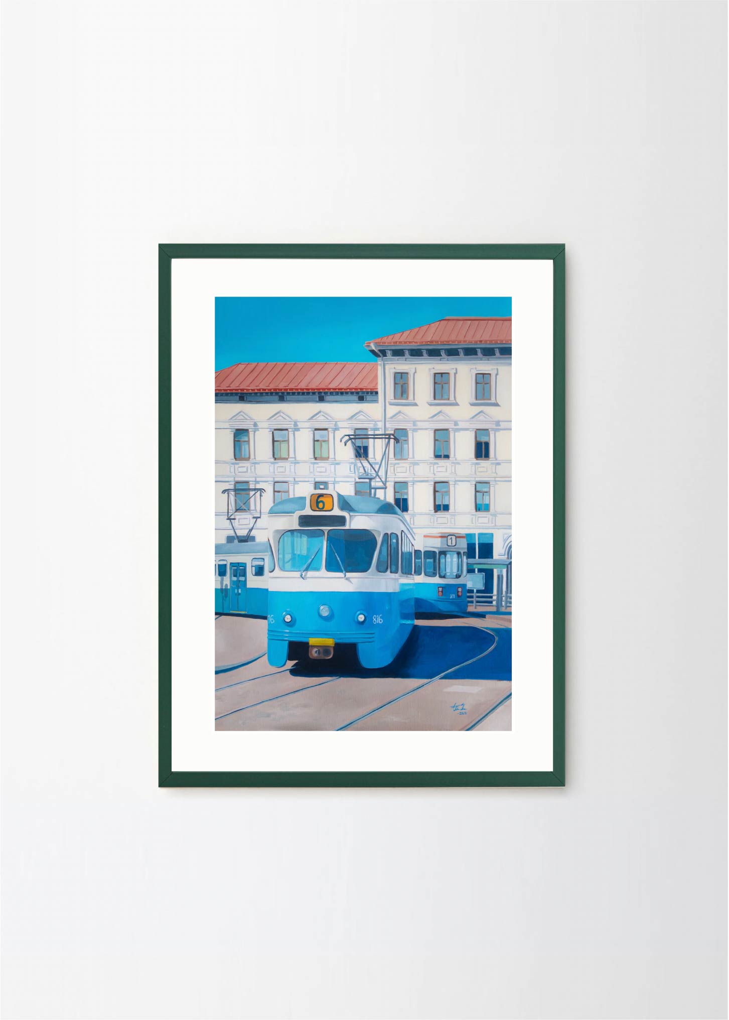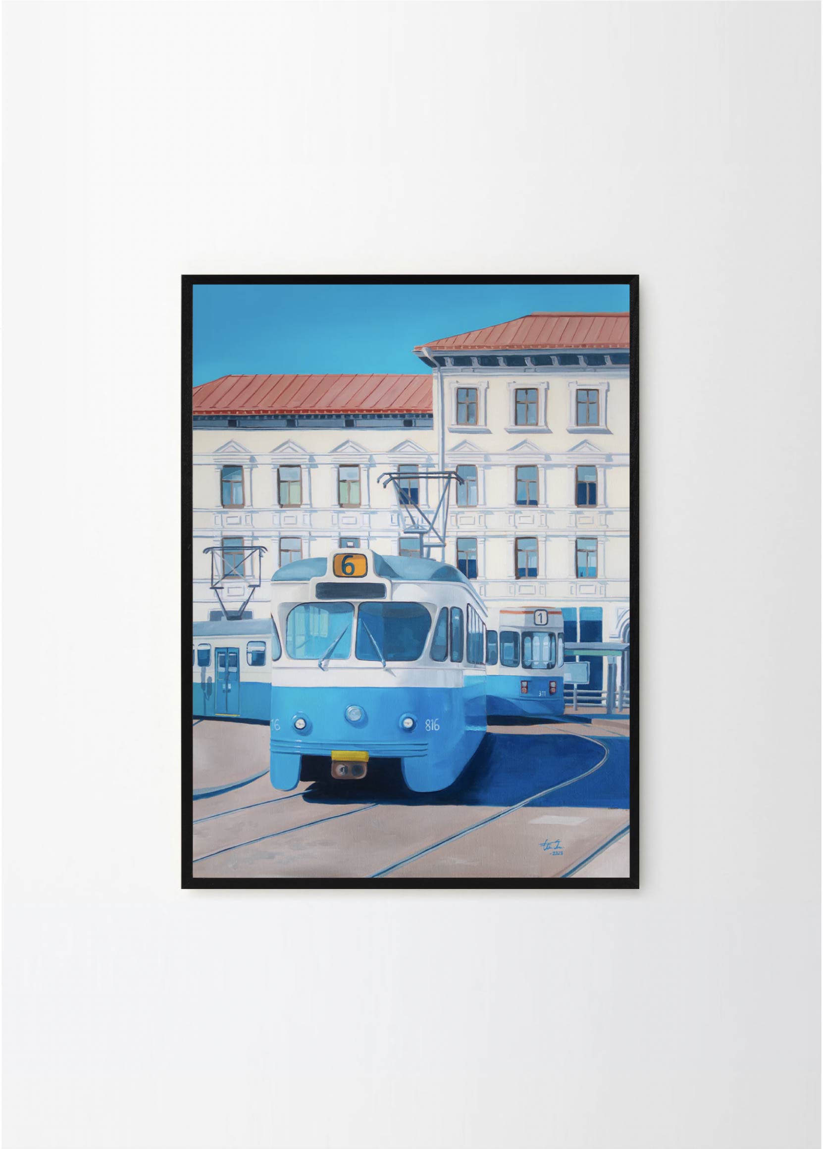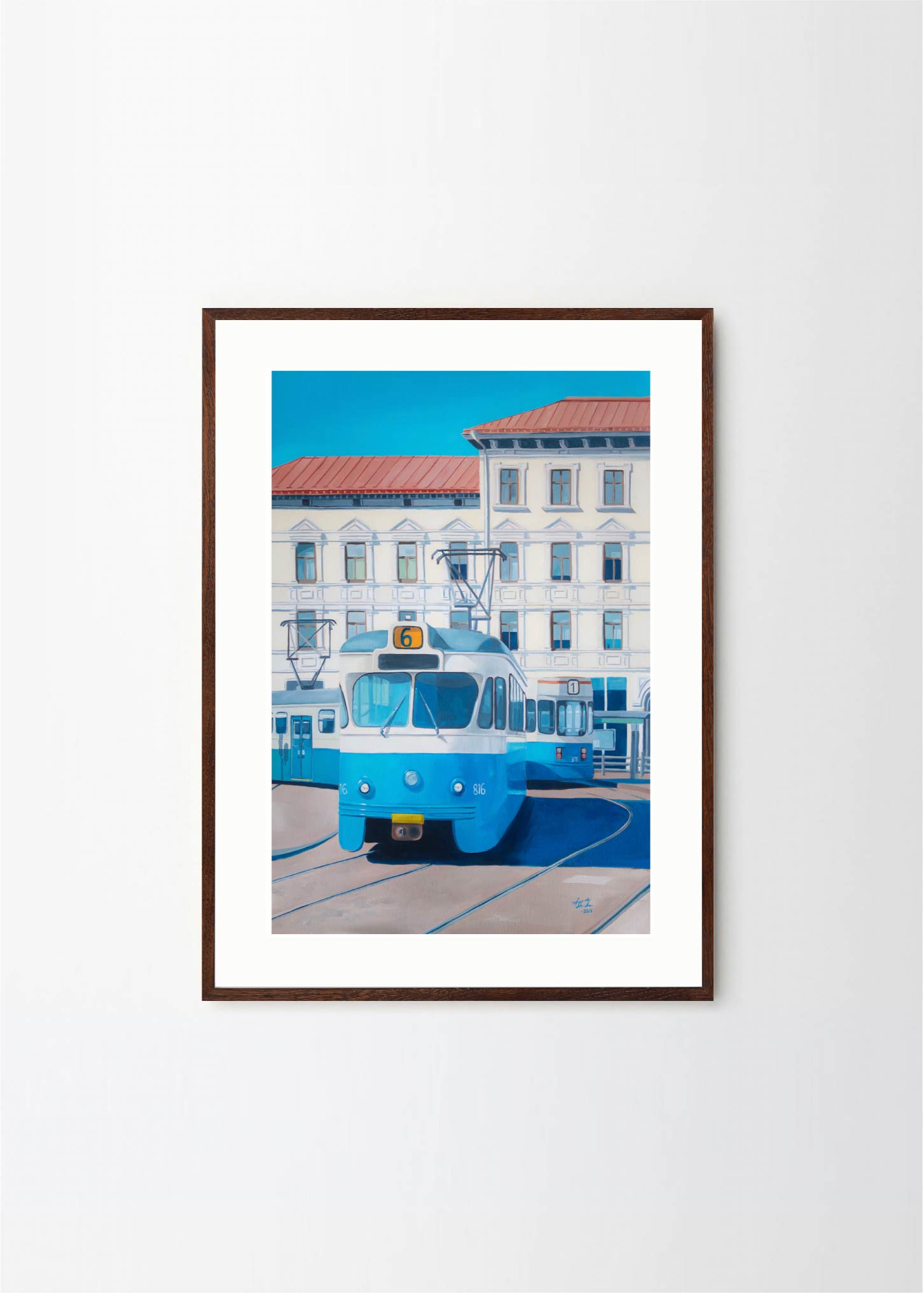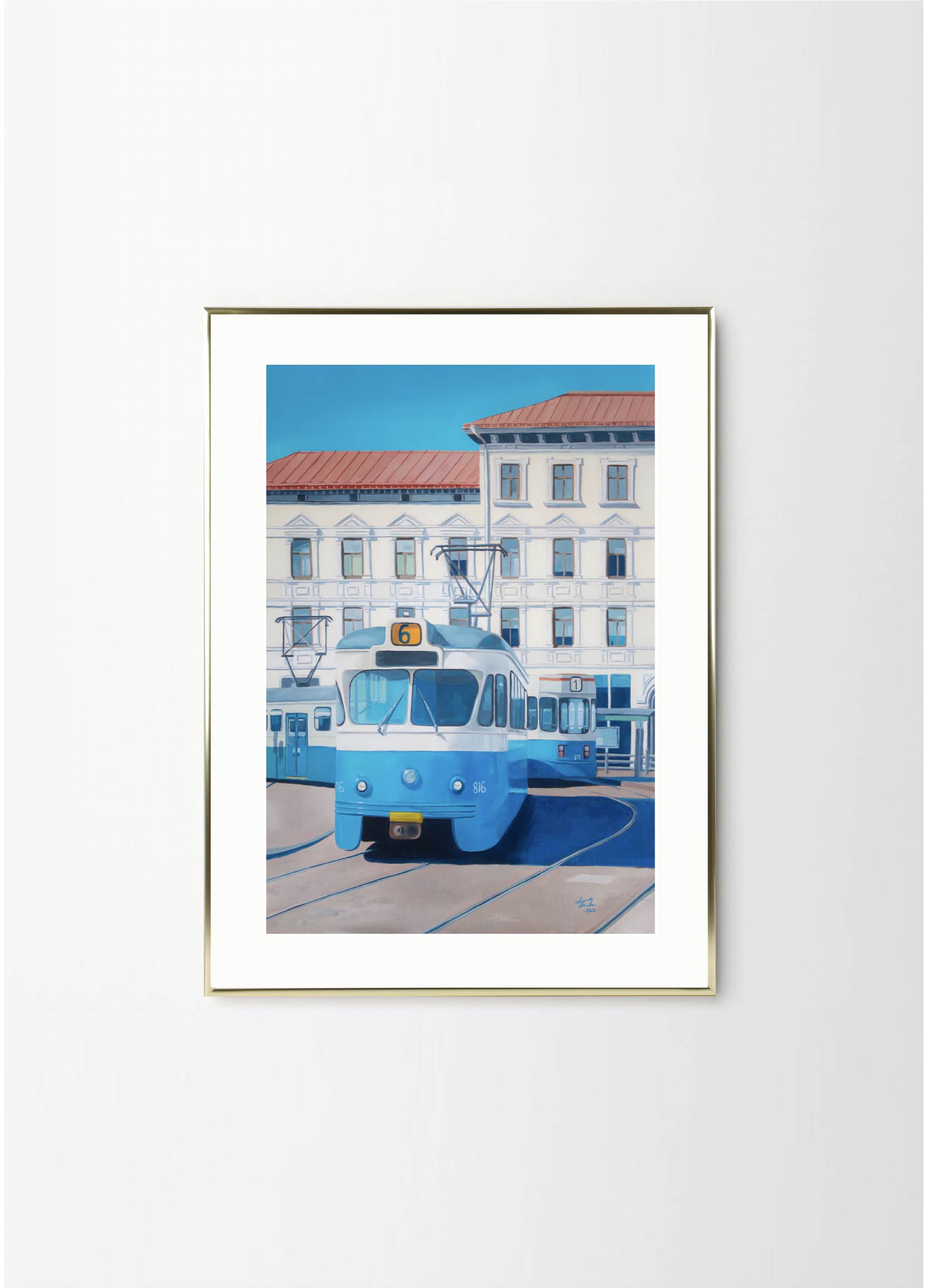 "Now only a memory" - This artwork depicts one of the old trams on a beatiful sunny day in Gothenburg. The lovely blue and beige colors makes it perfect for a pastelle, walnut or green frame , with or without a passepartout.