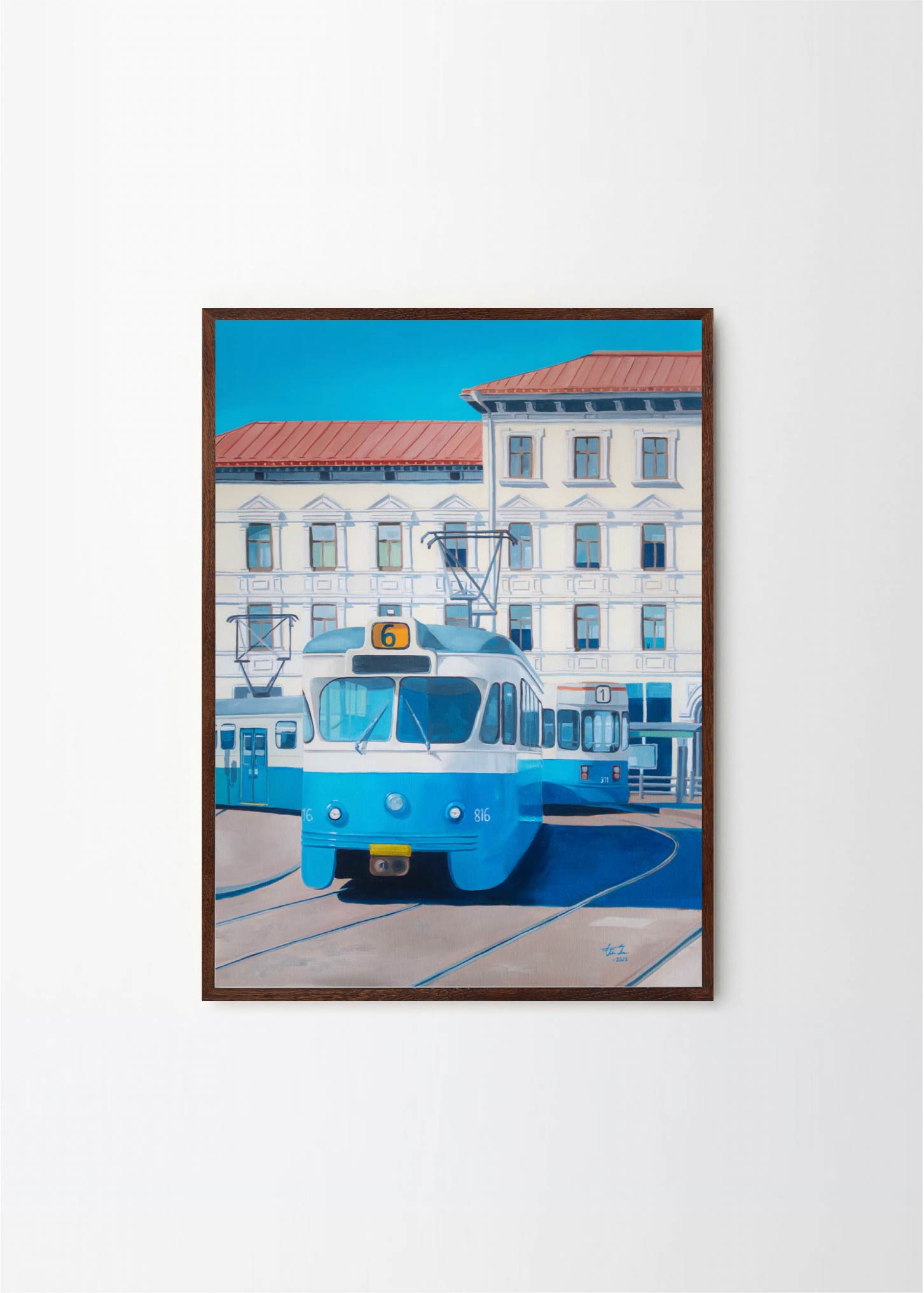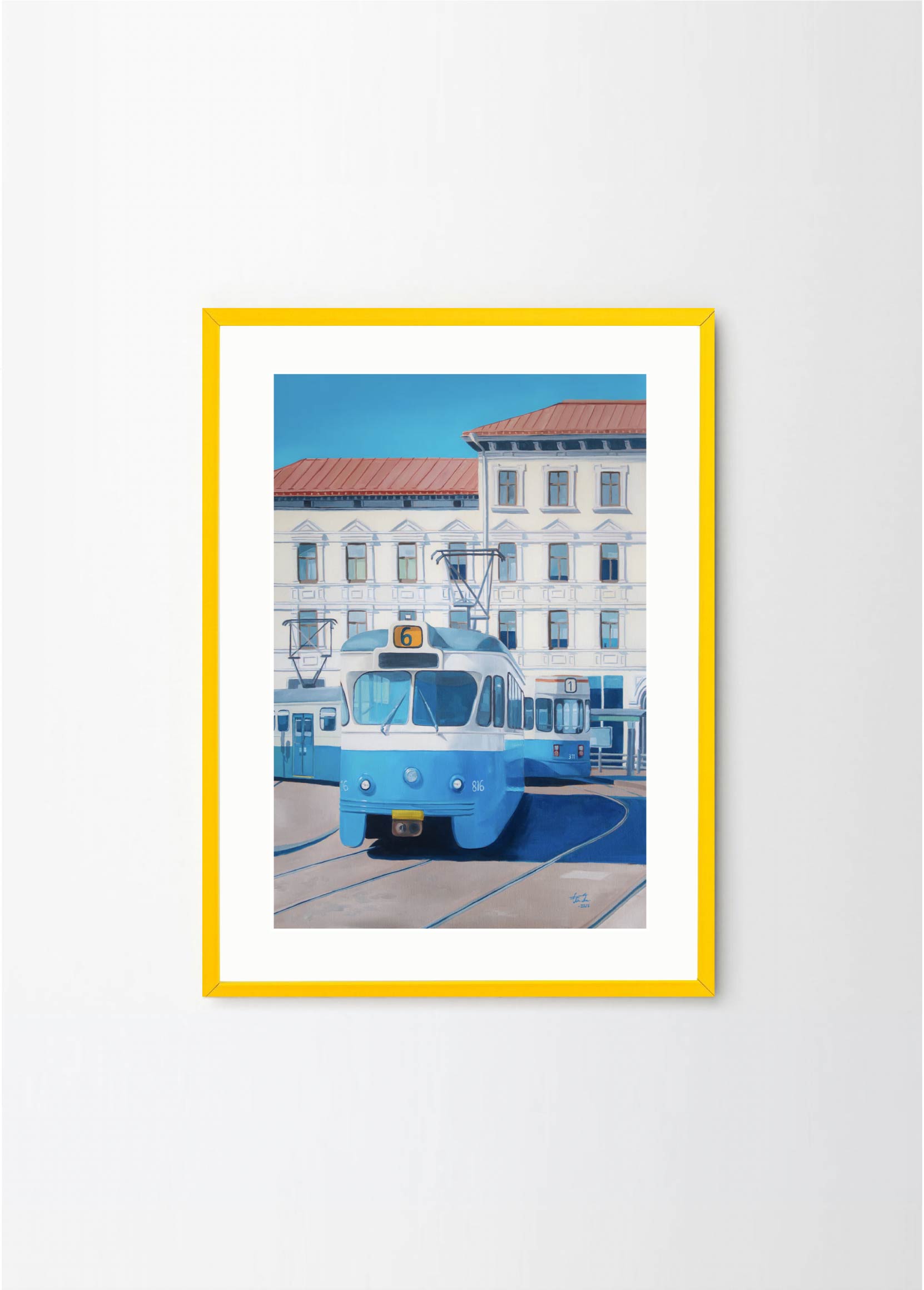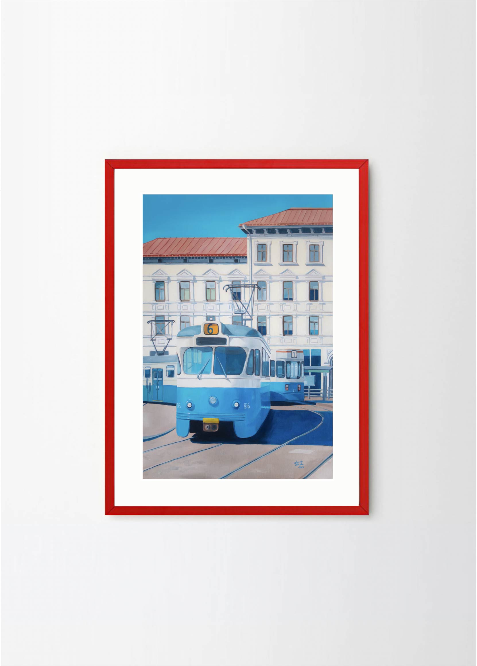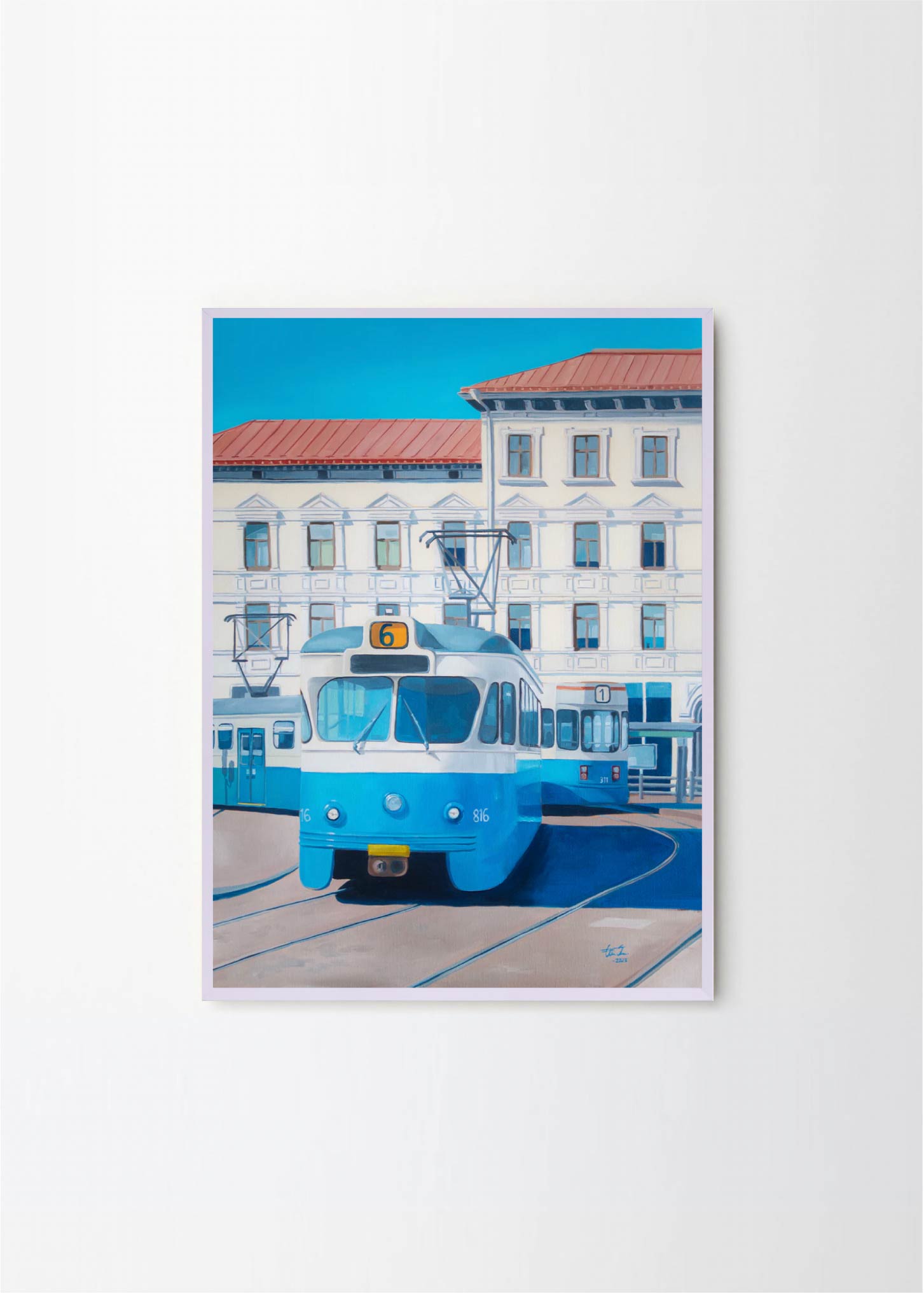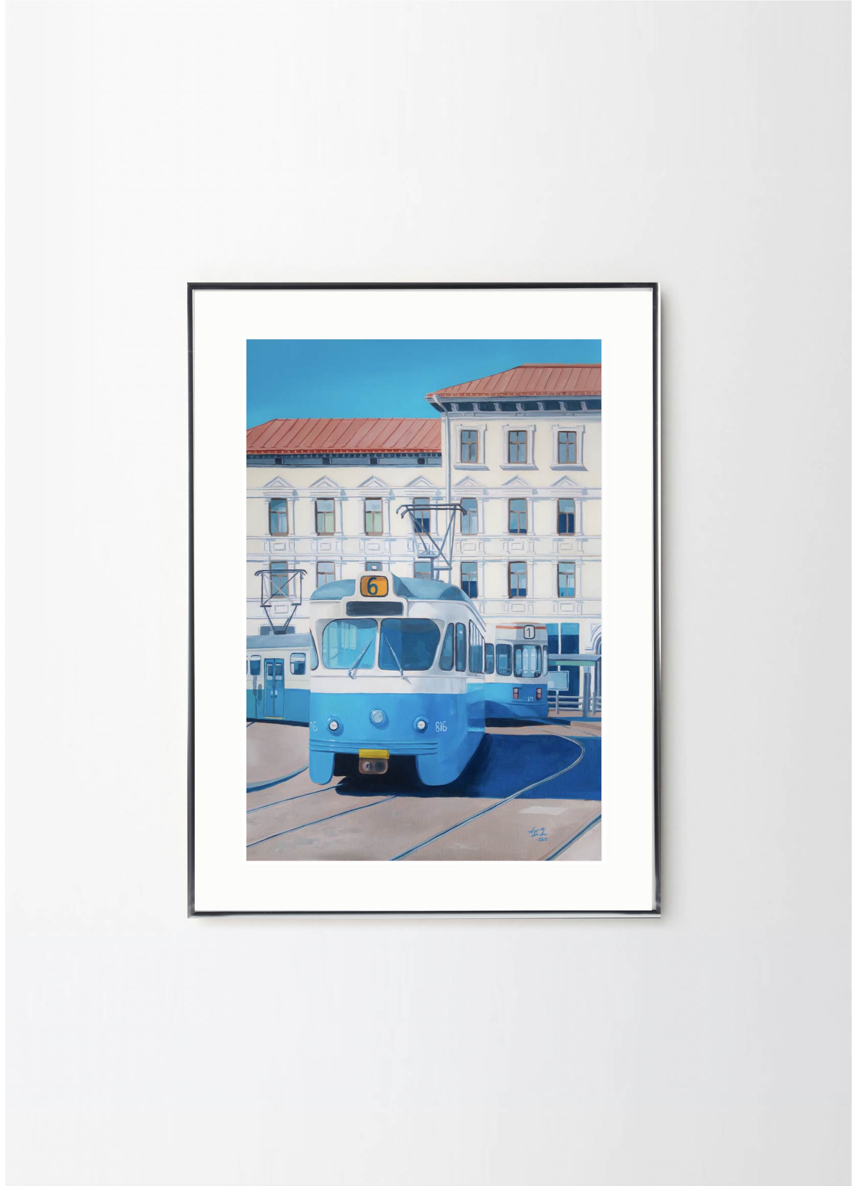 "Now only a memory" - This artwork depicts one of the old trams on a beatiful sunny day in Gothenburg. The lovely blue and beige colors makes it perfect for a pastelle, walnut or green frame , with or without a passepartout.