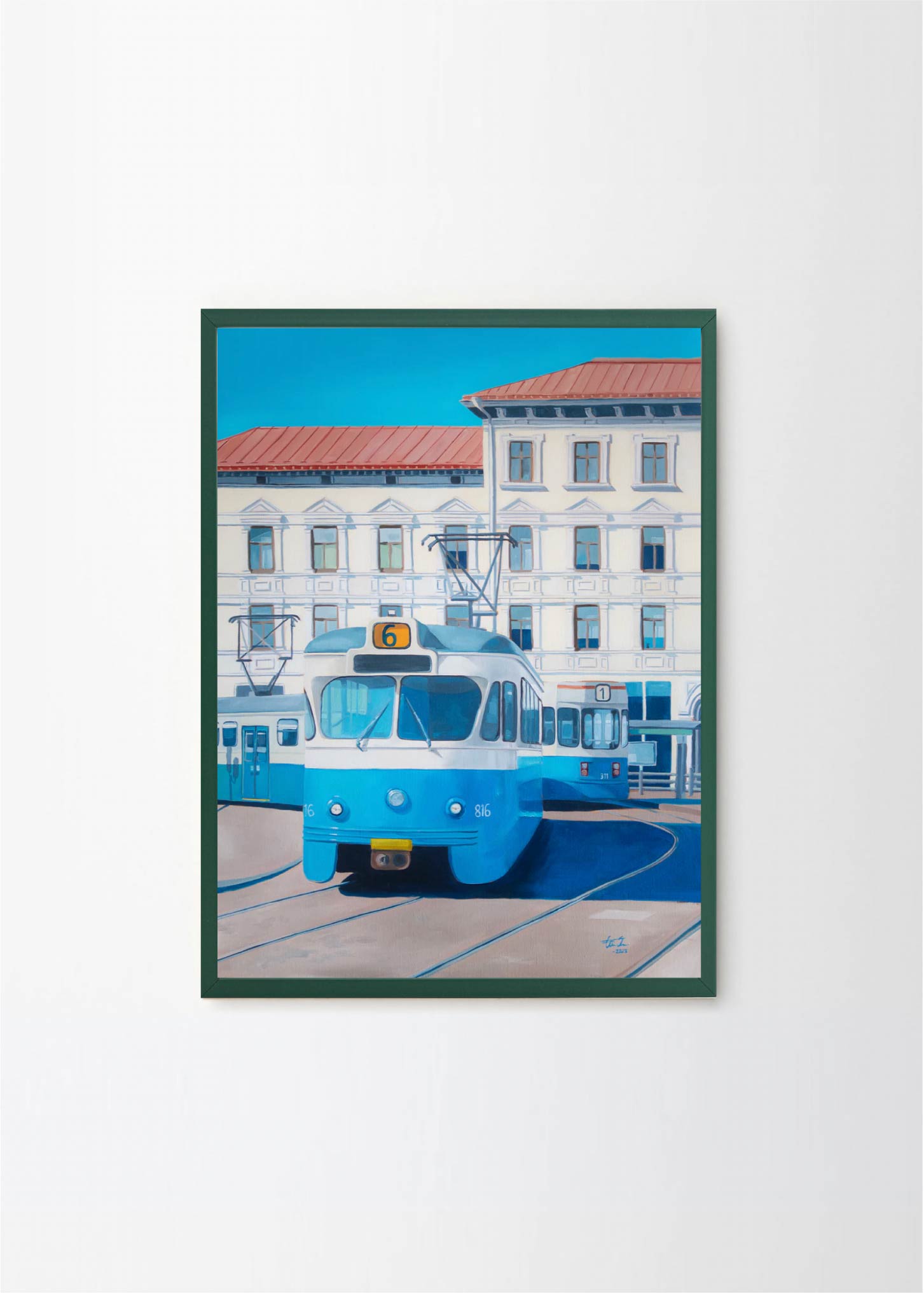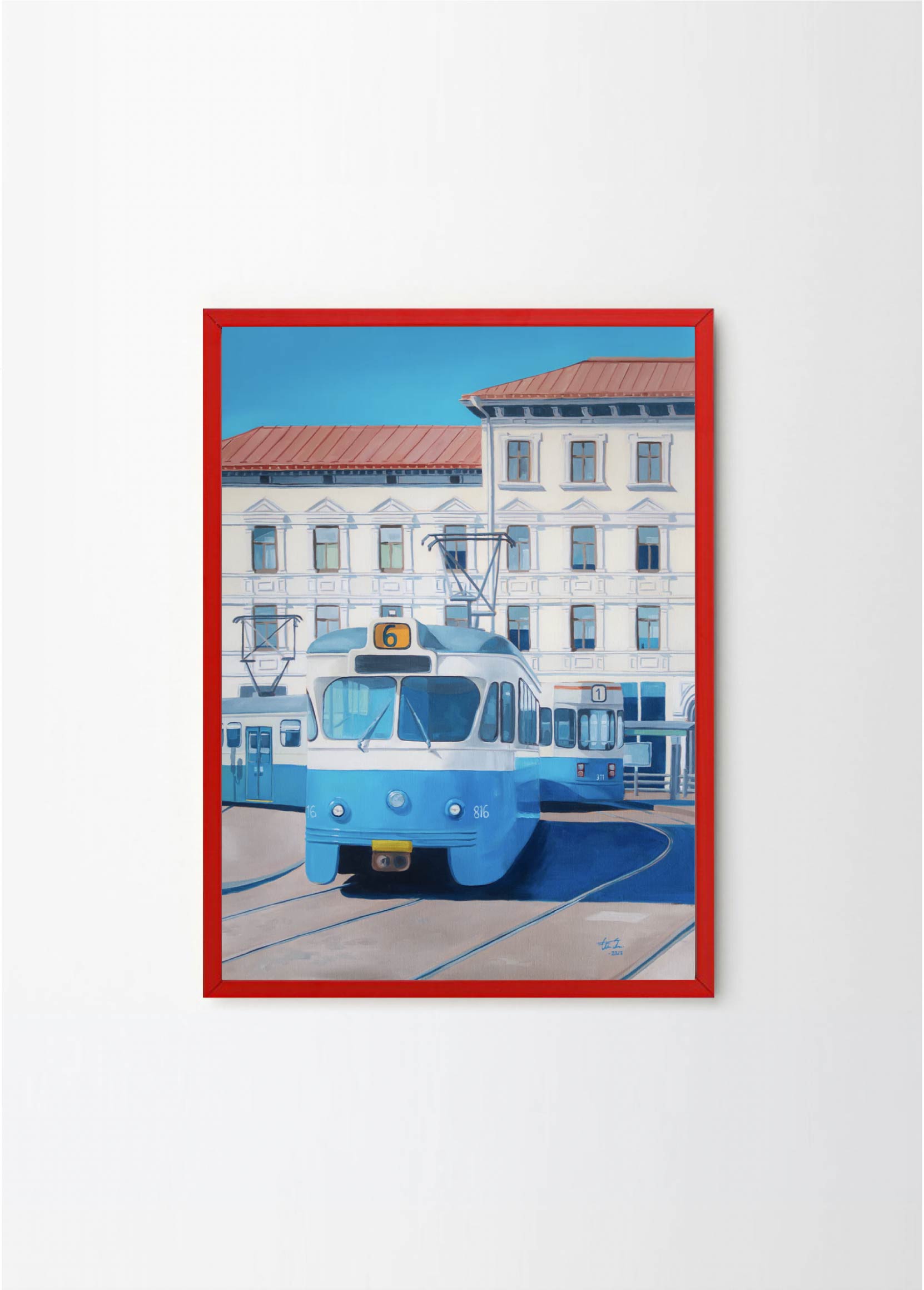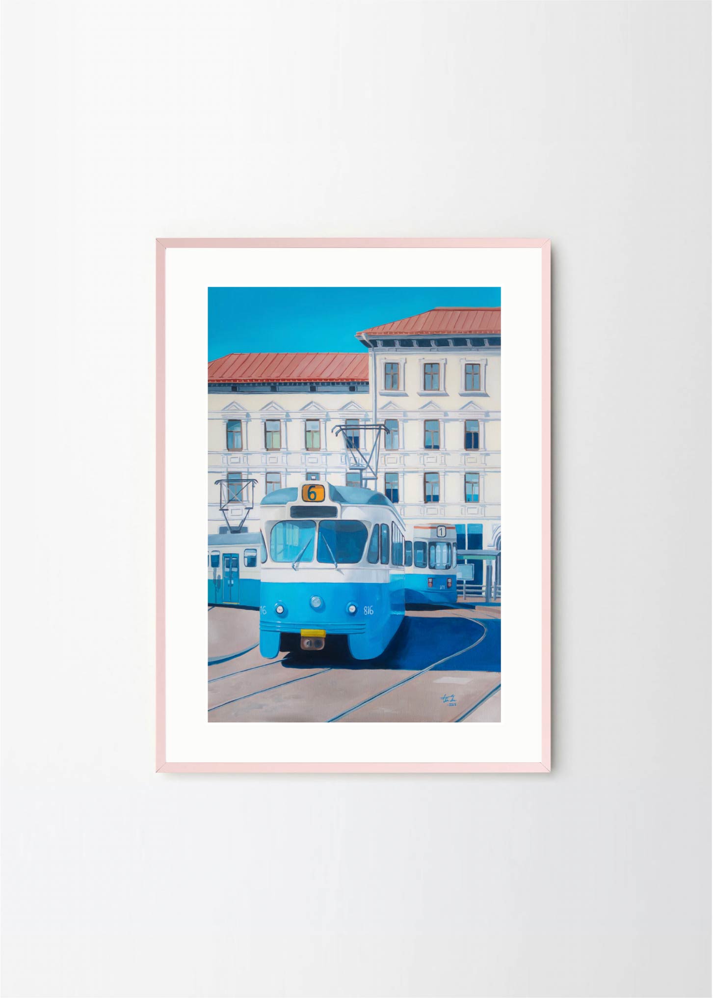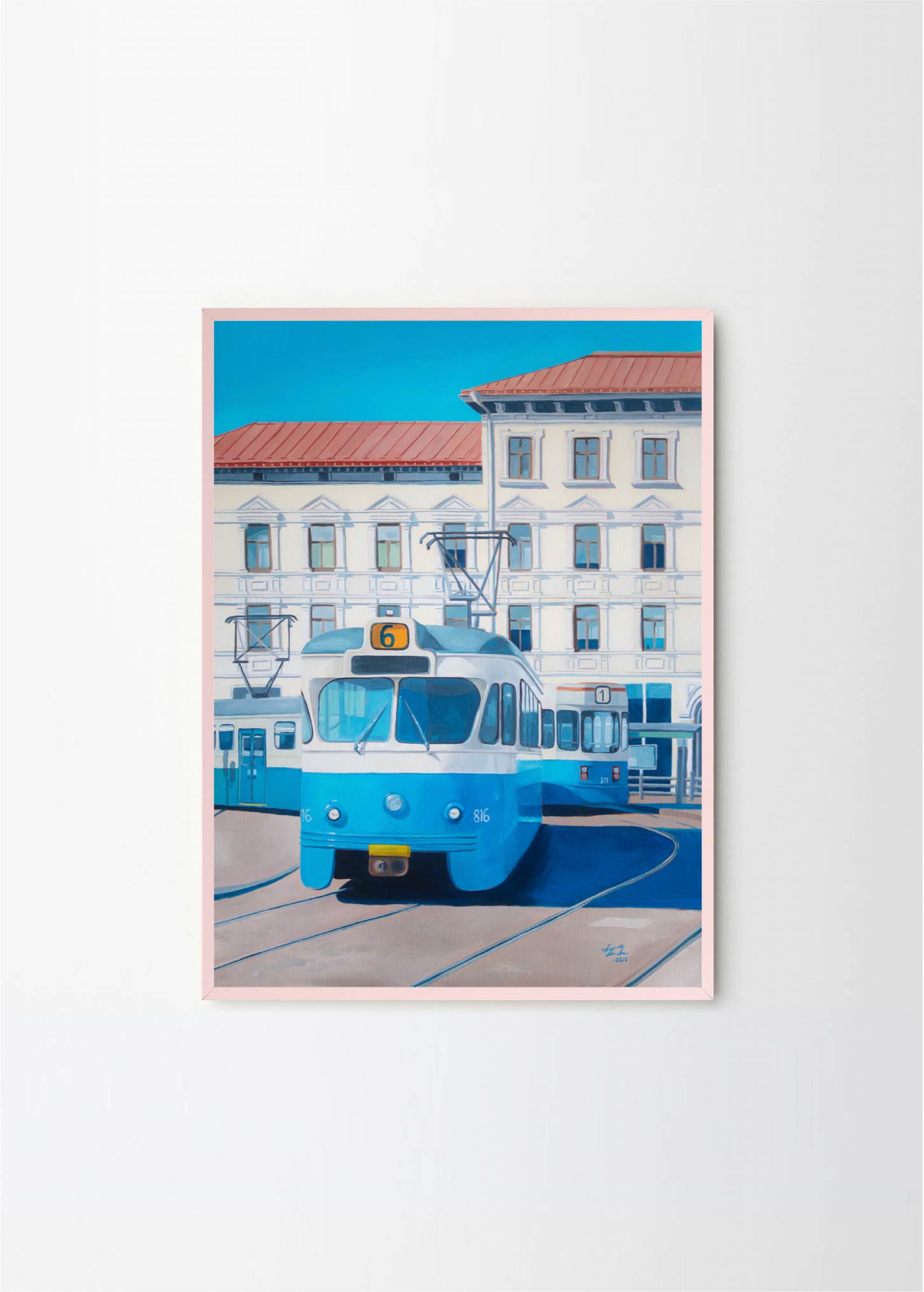 "Now only a memory" - This artwork depicts one of the old trams on a beatiful sunny day in Gothenburg. The lovely blue and beige colors makes it perfect for a pastelle, walnut or green frame , with or without a passepartout.