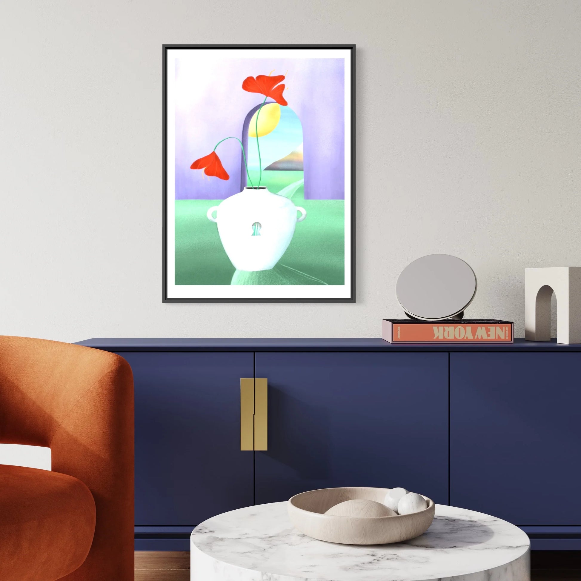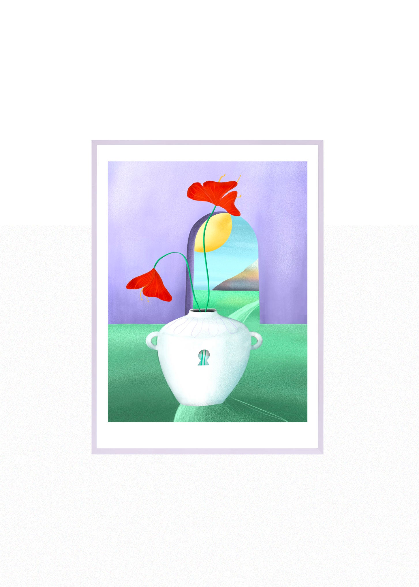 This portrait format poster depicts a floral vase. The delightful purple, green and red, yellow and red colors makes Färden perfect for a pink or purple frame, with or without a passepartout.