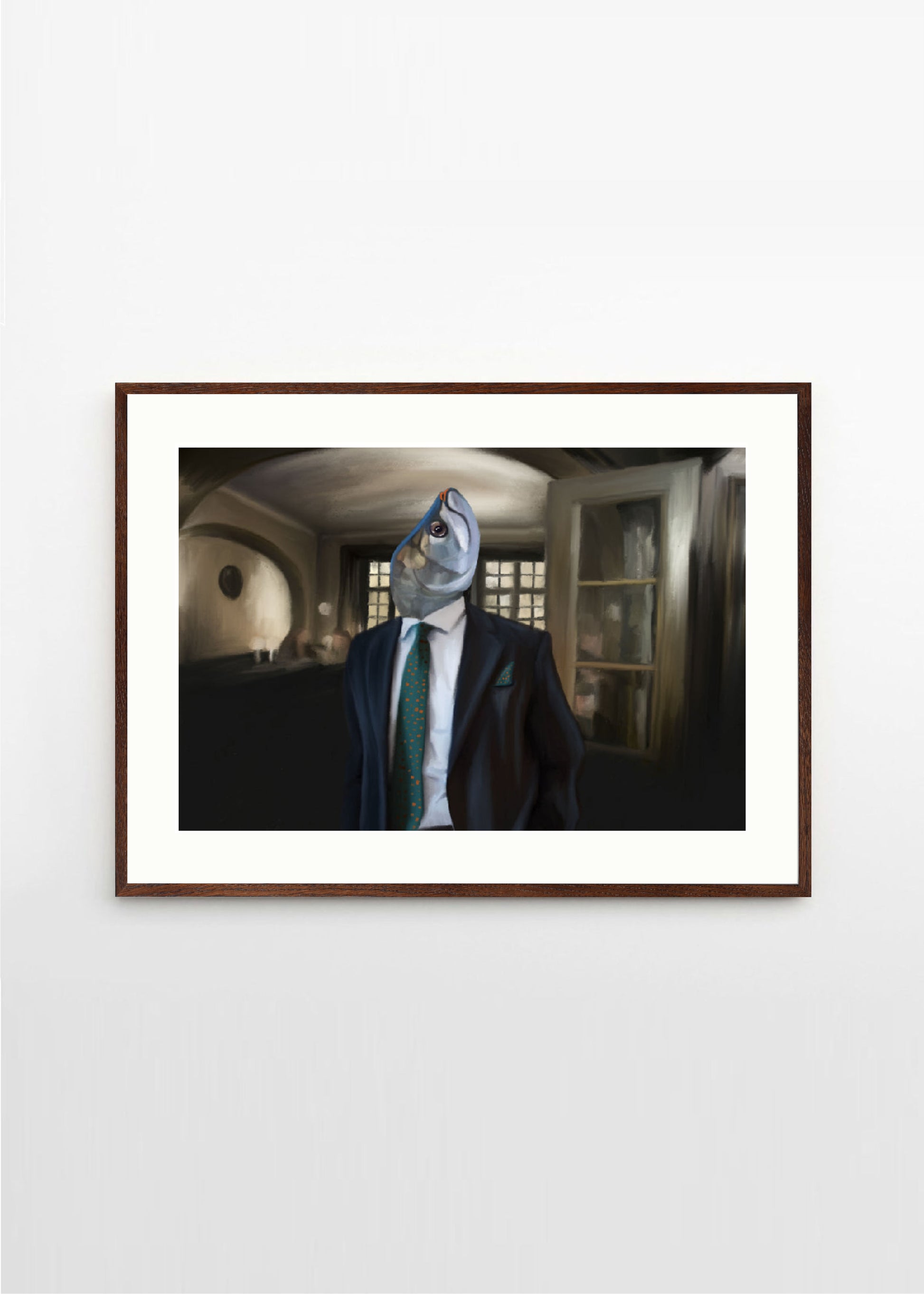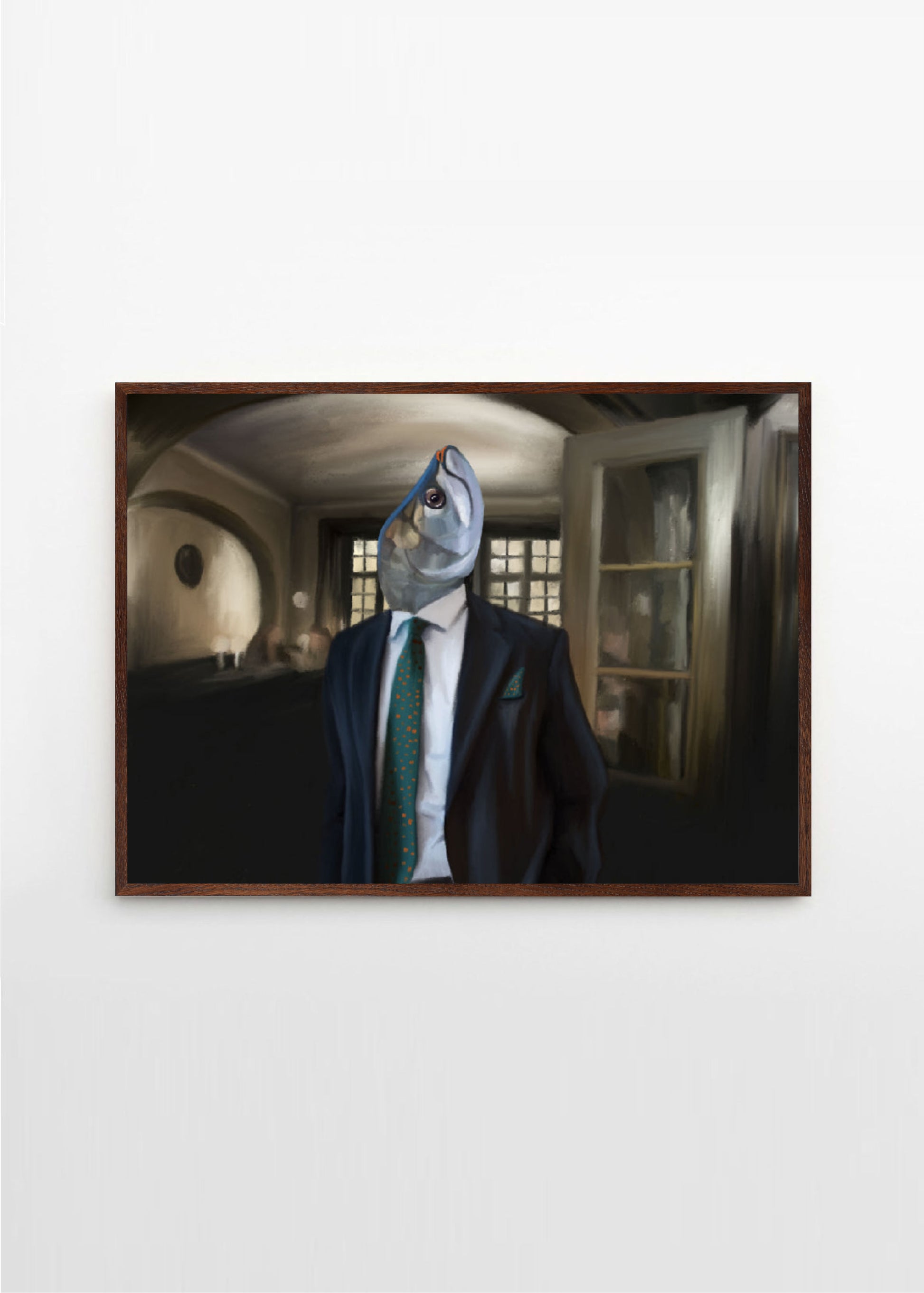 This lovely poster in a lanscape format depicts a fish at the famous restaurant Gyllene Freden in Stockholm. The dark blue brown and greycolors make "Fiskherren På Gyllene Freden" perfect for a black frame with a passepartout.