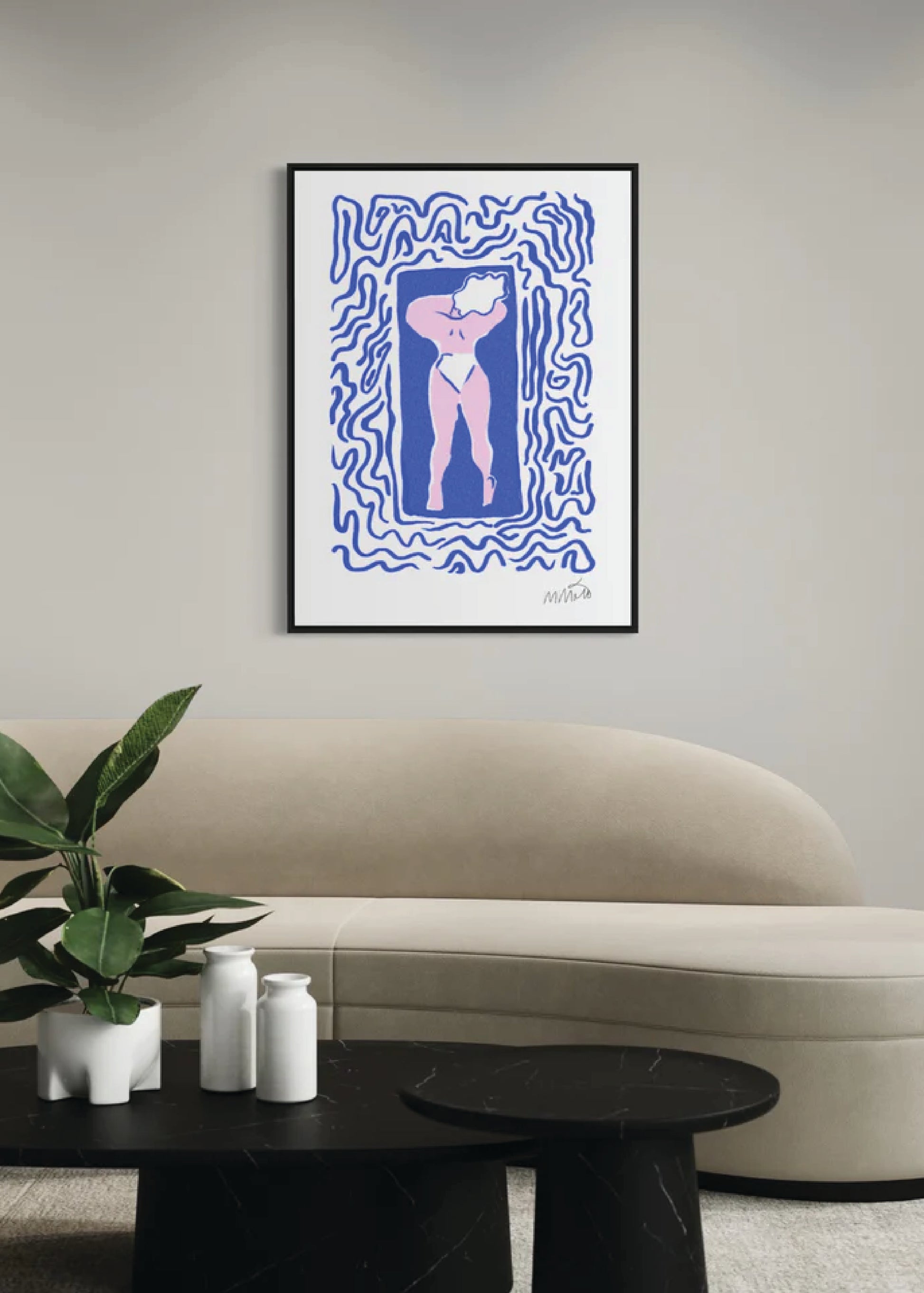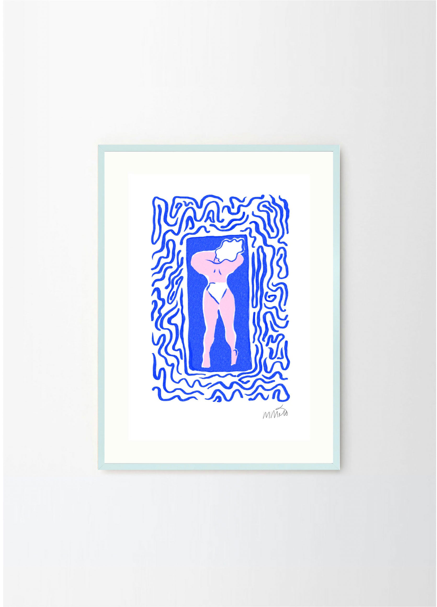 The artwork Floats by Madelen Möllard depicts a blue, pink and white abstract person floating. The colors makes it perfect for a walnut or blue colored frame, with or without passepartout.