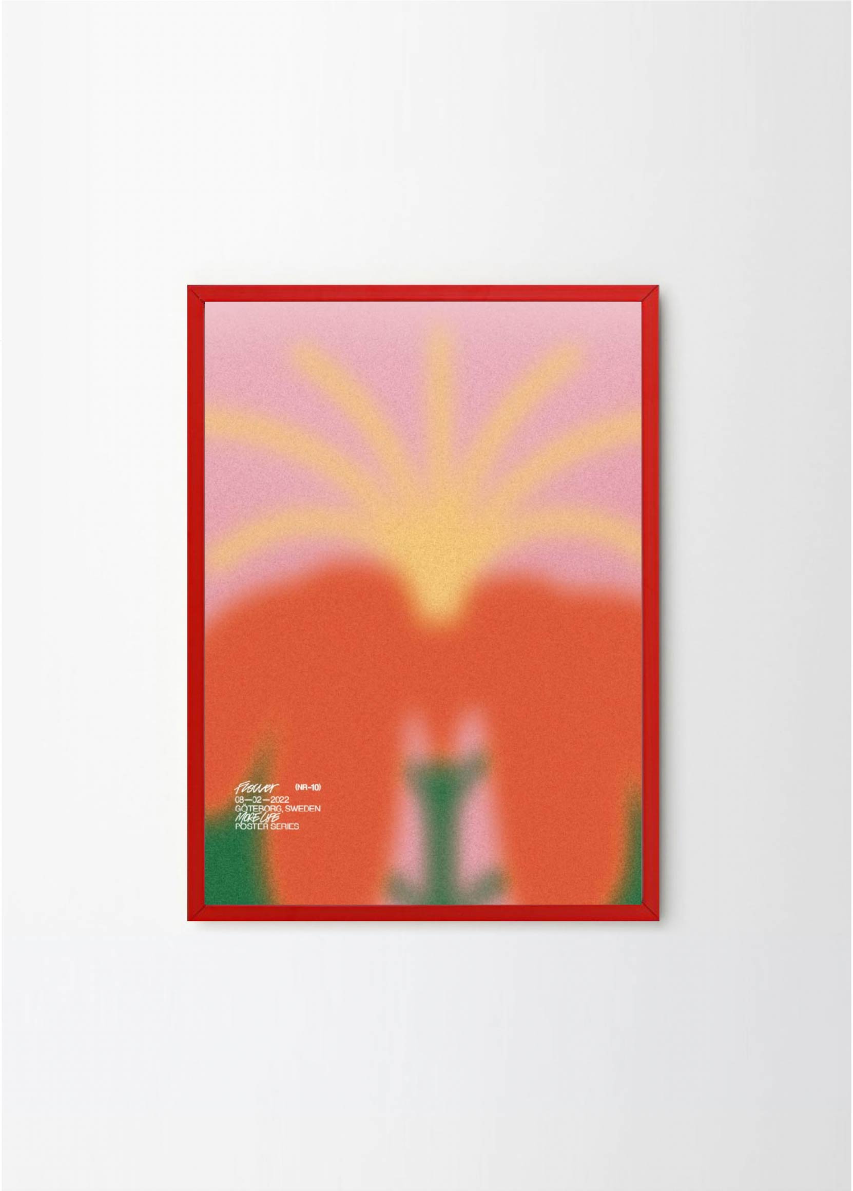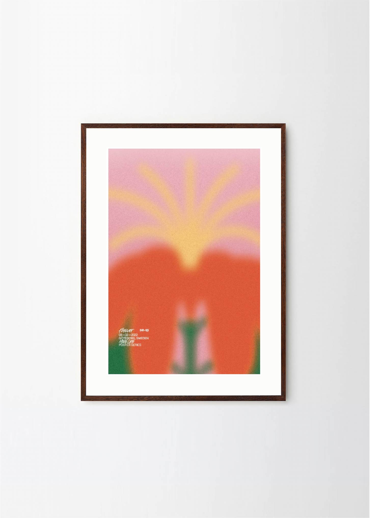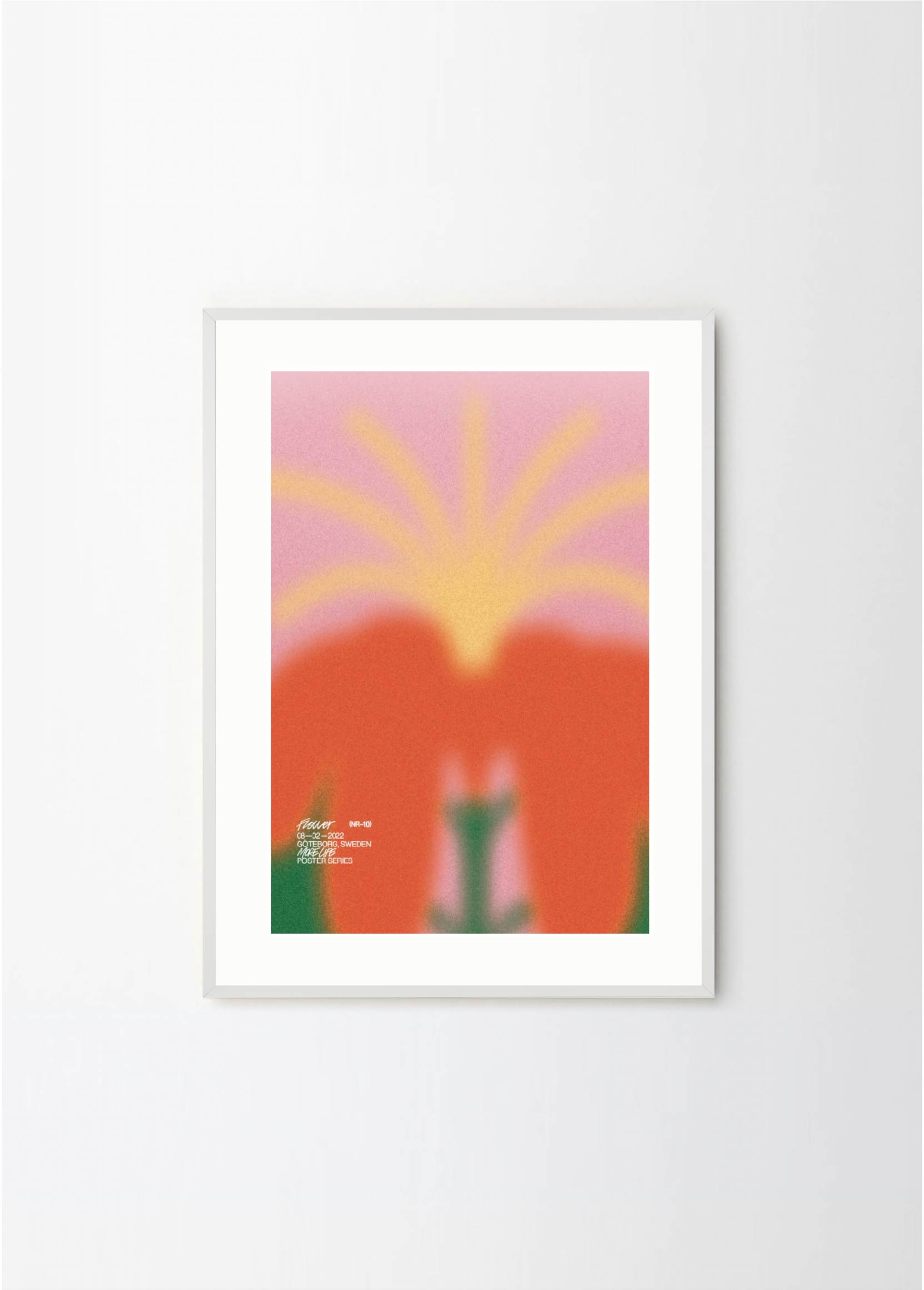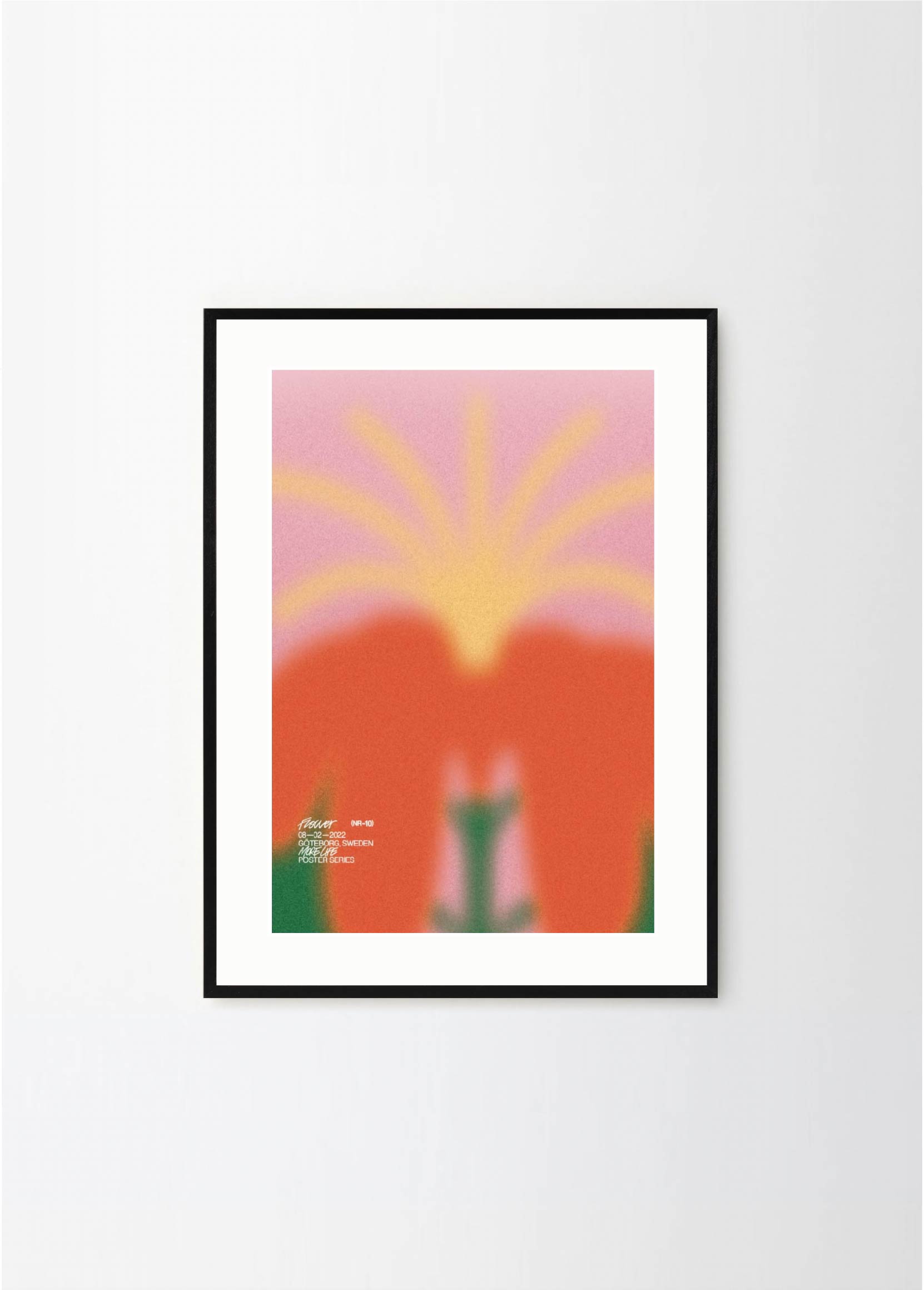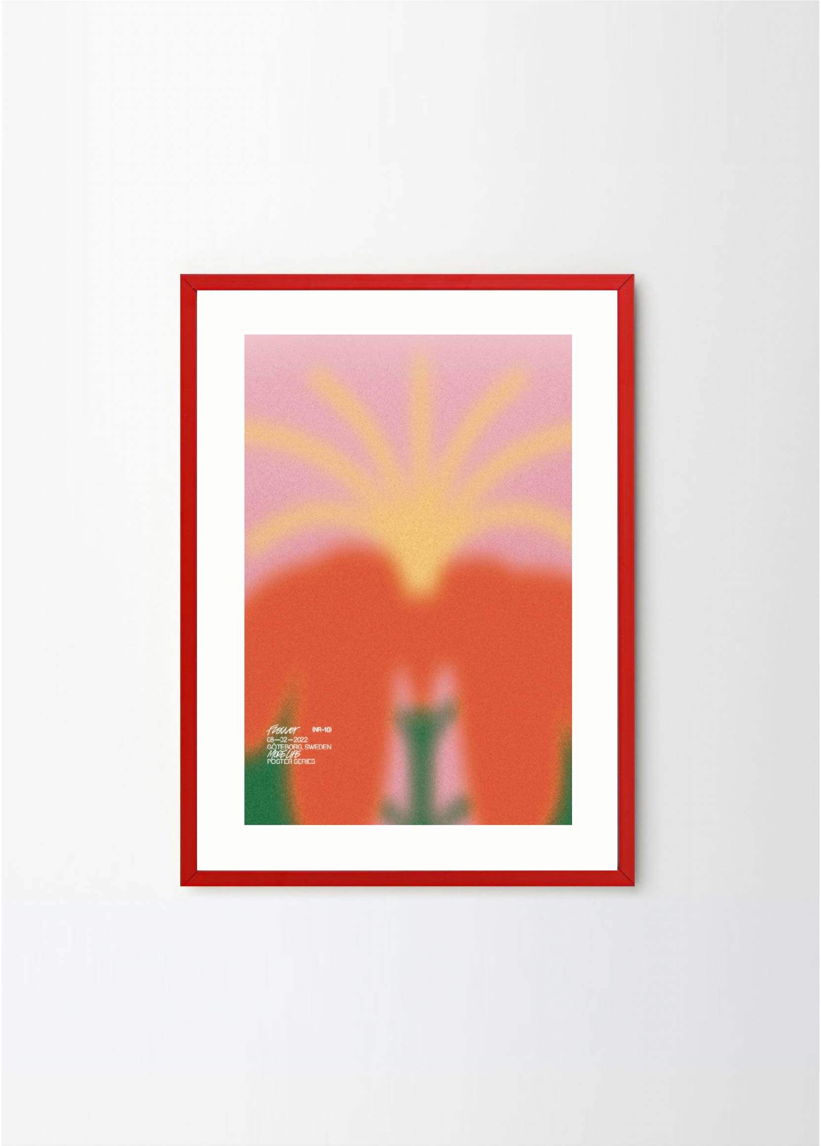 The artwork Flower 10 depicts a red flower with a pastelle pink background in a portrait format. The yellow, pink and red colors make Flower 10 perfect for pink, green or walnut colored frame, with or without passepartout.