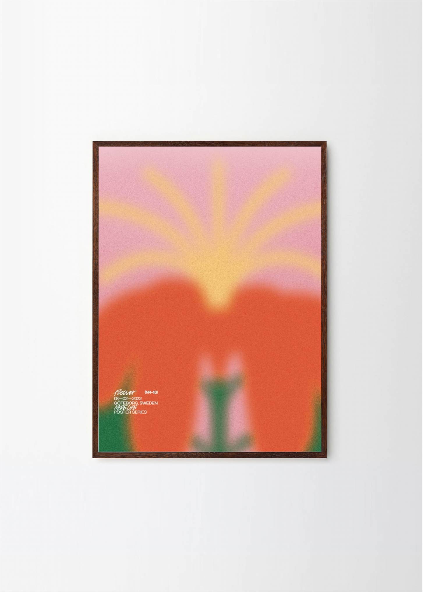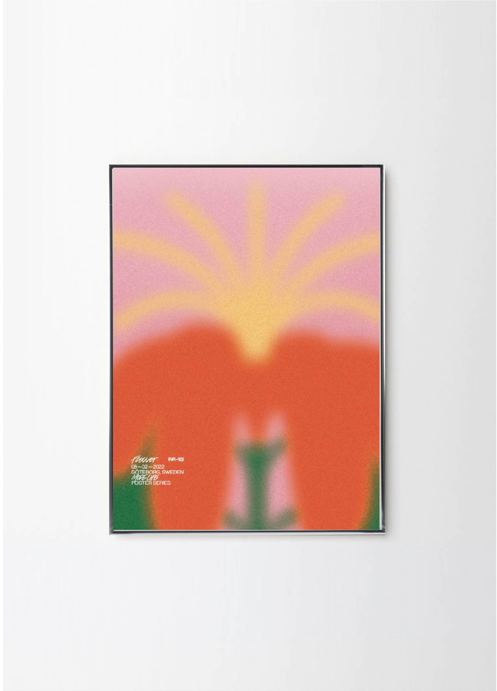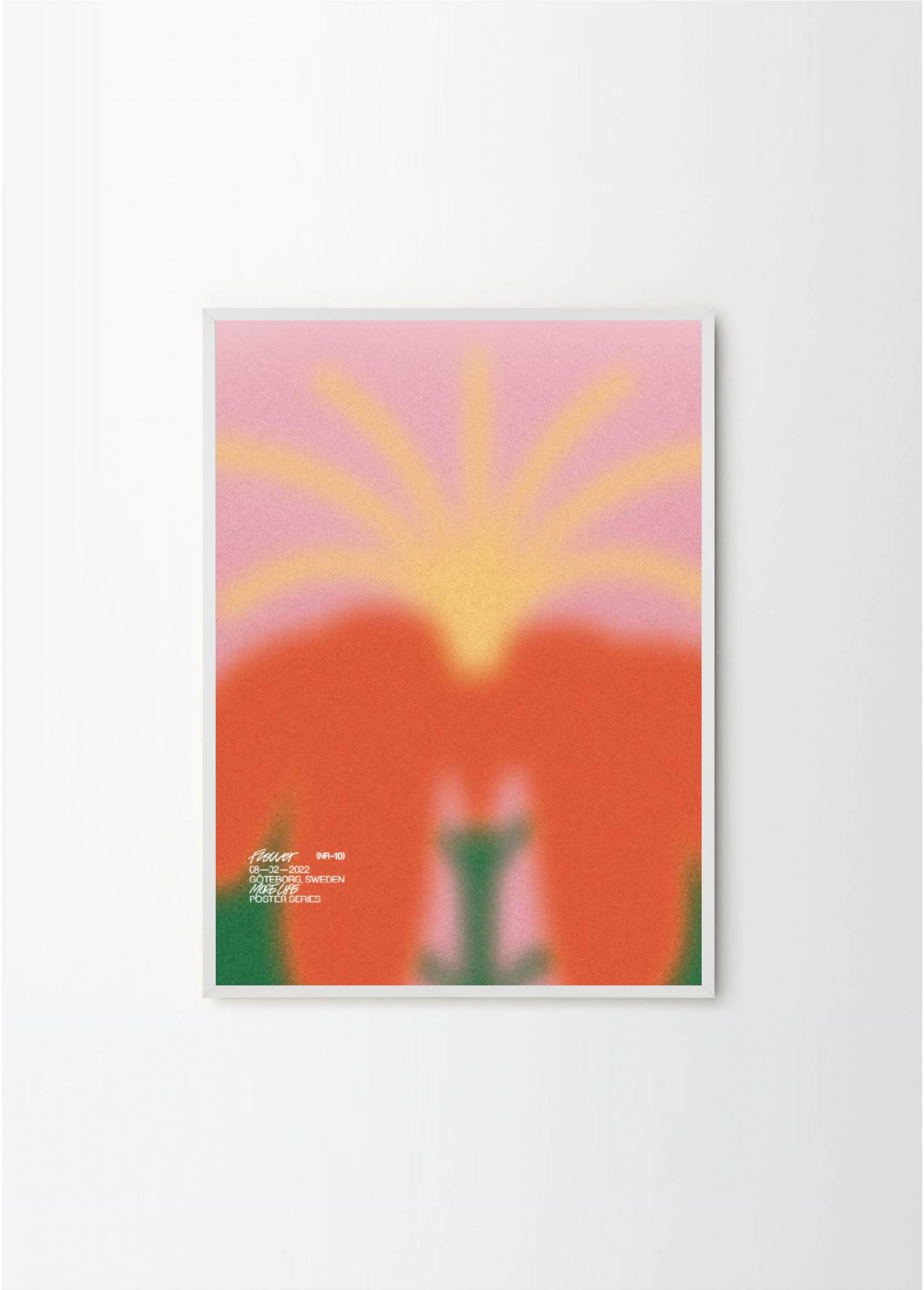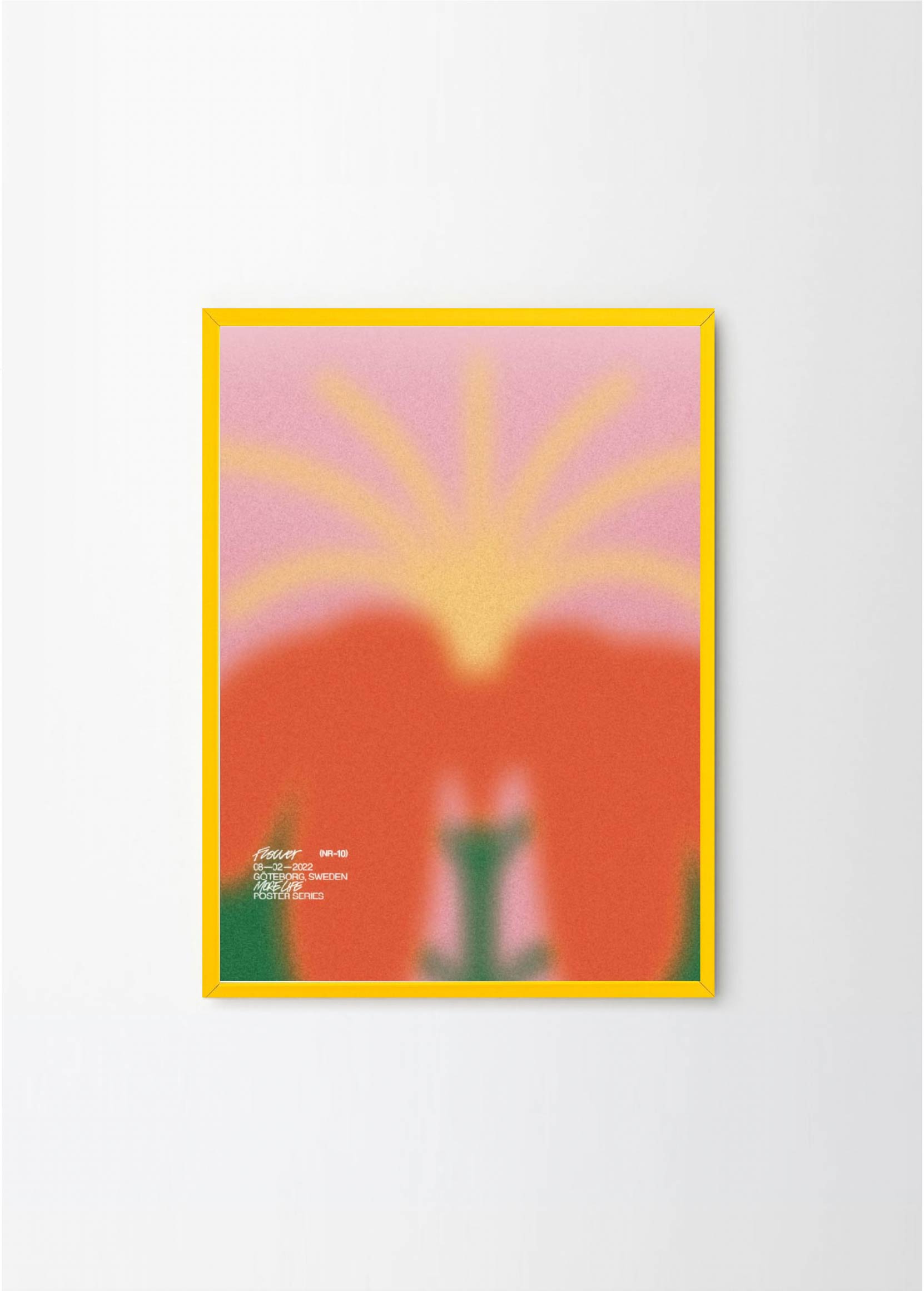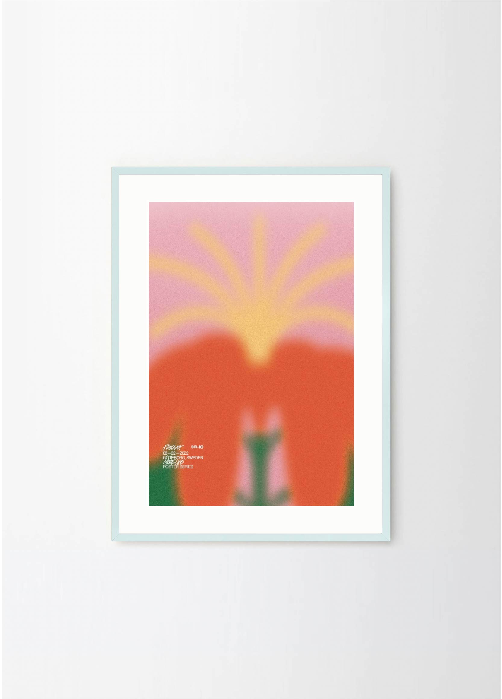 The artwork Flower 10 depicts a red flower with a pastelle pink background in a portrait format. The yellow, pink and red colors make Flower 10 perfect for pink, green or walnut colored frame, with or without passepartout.