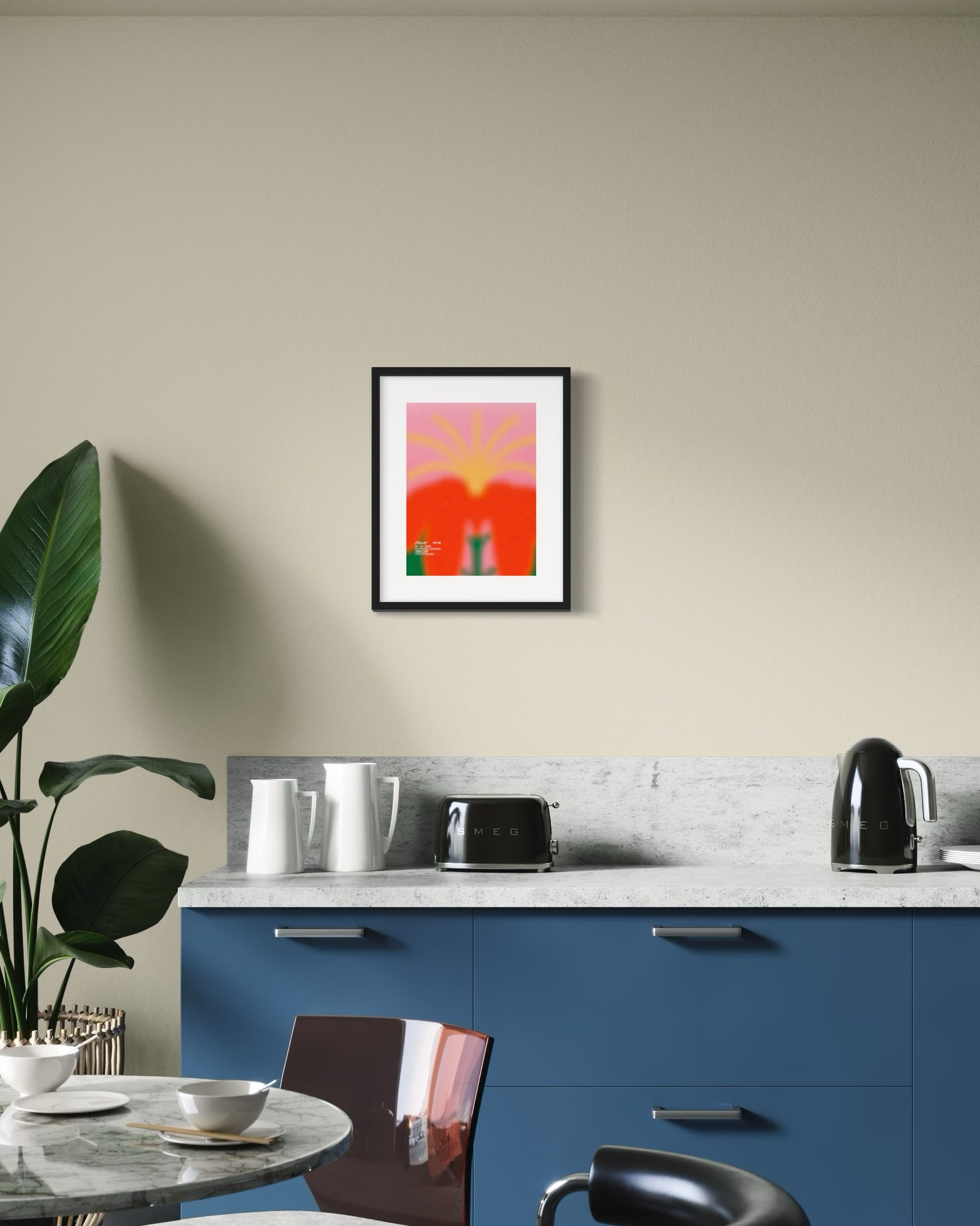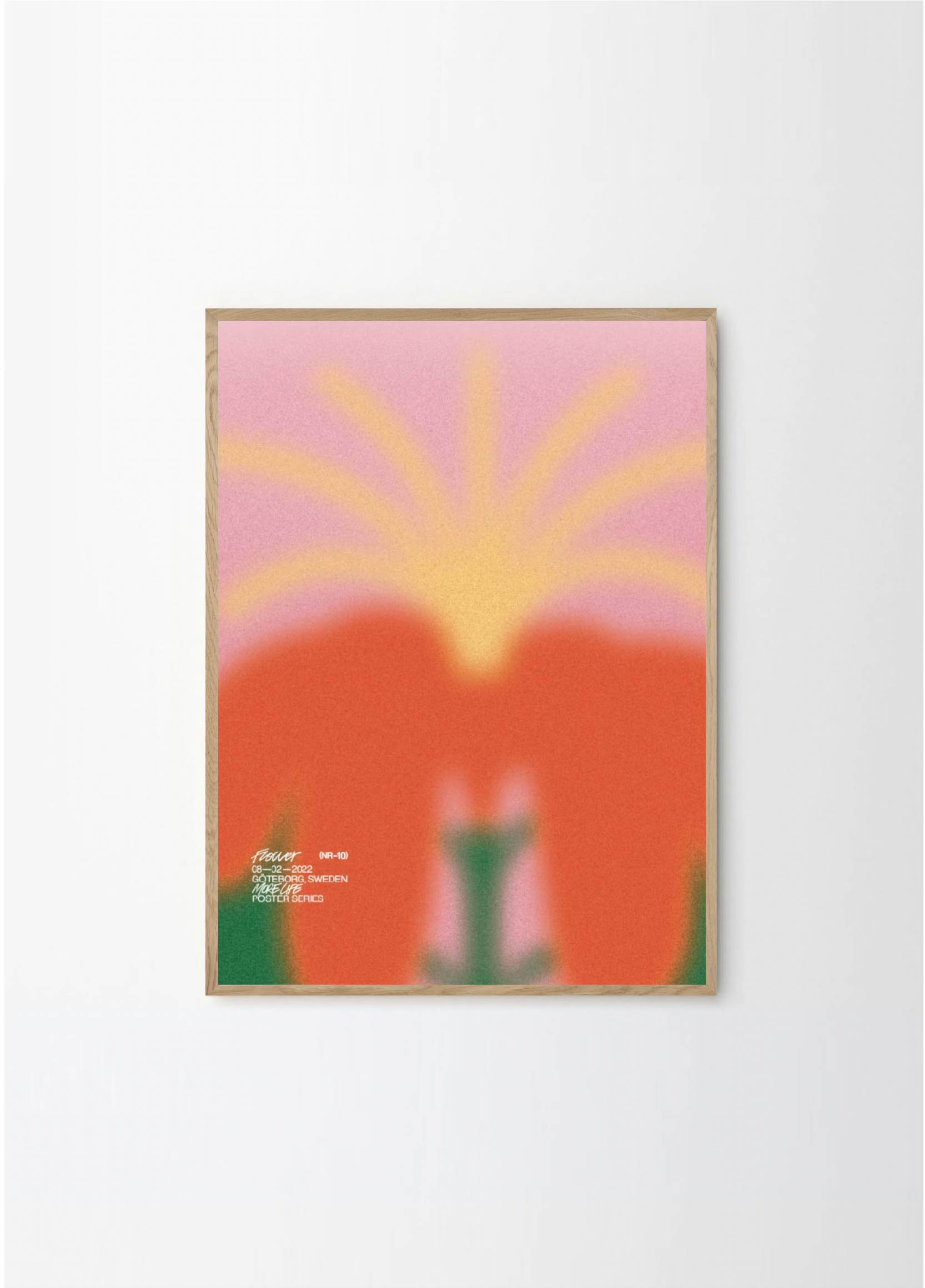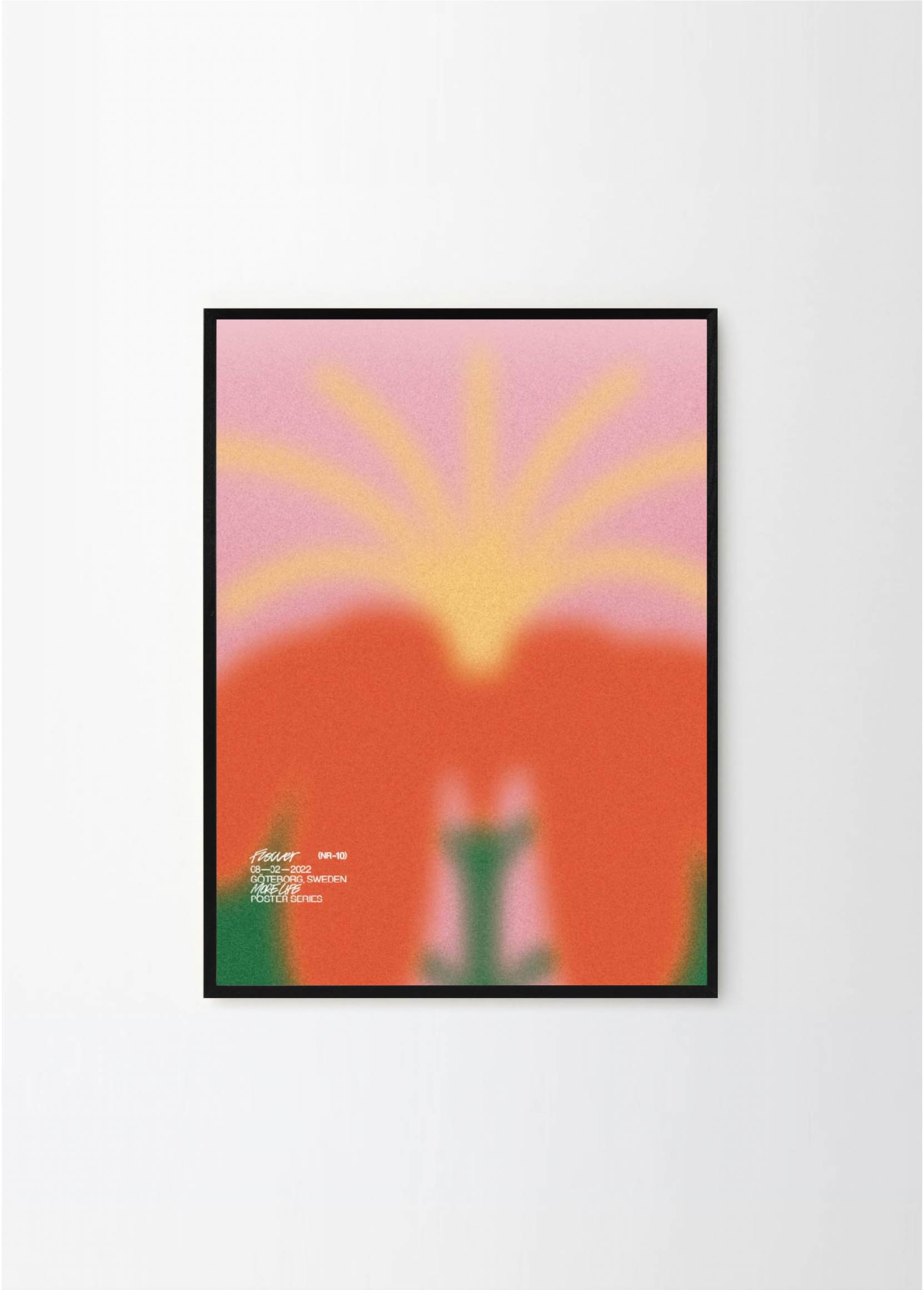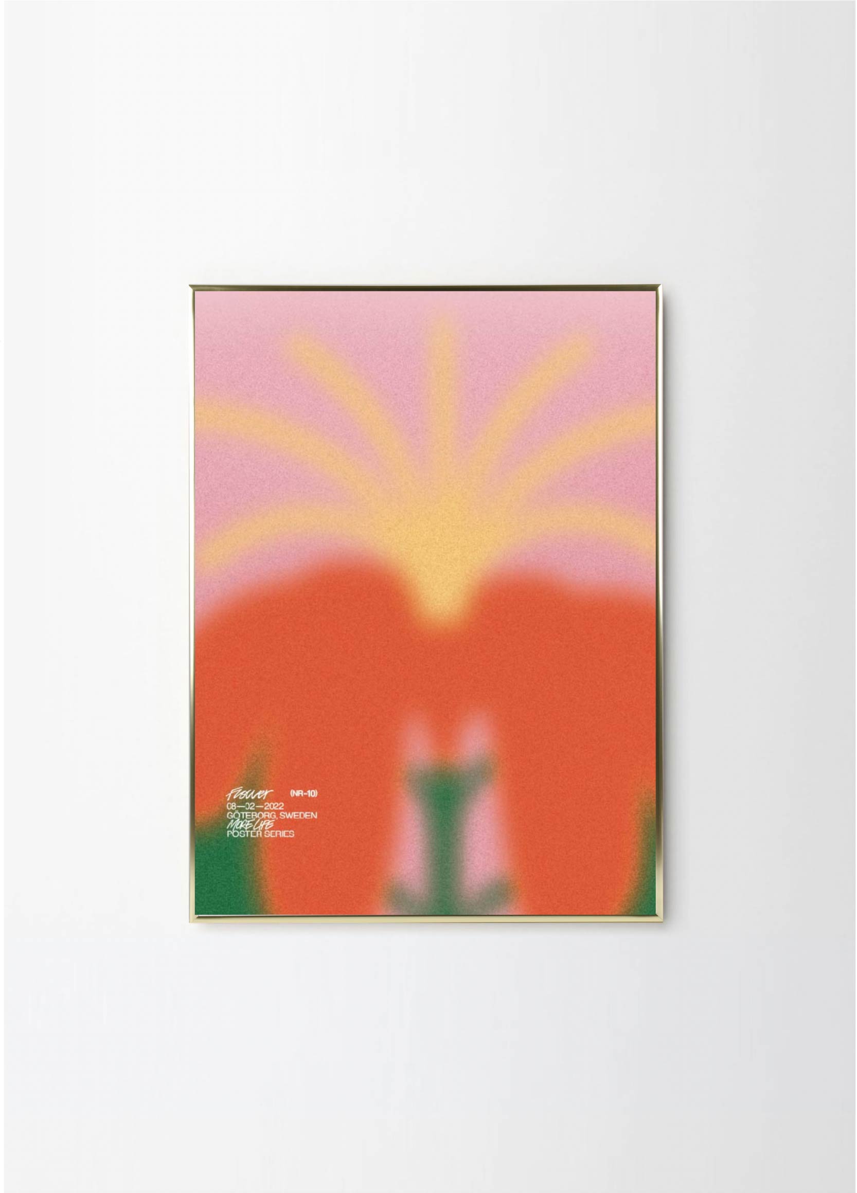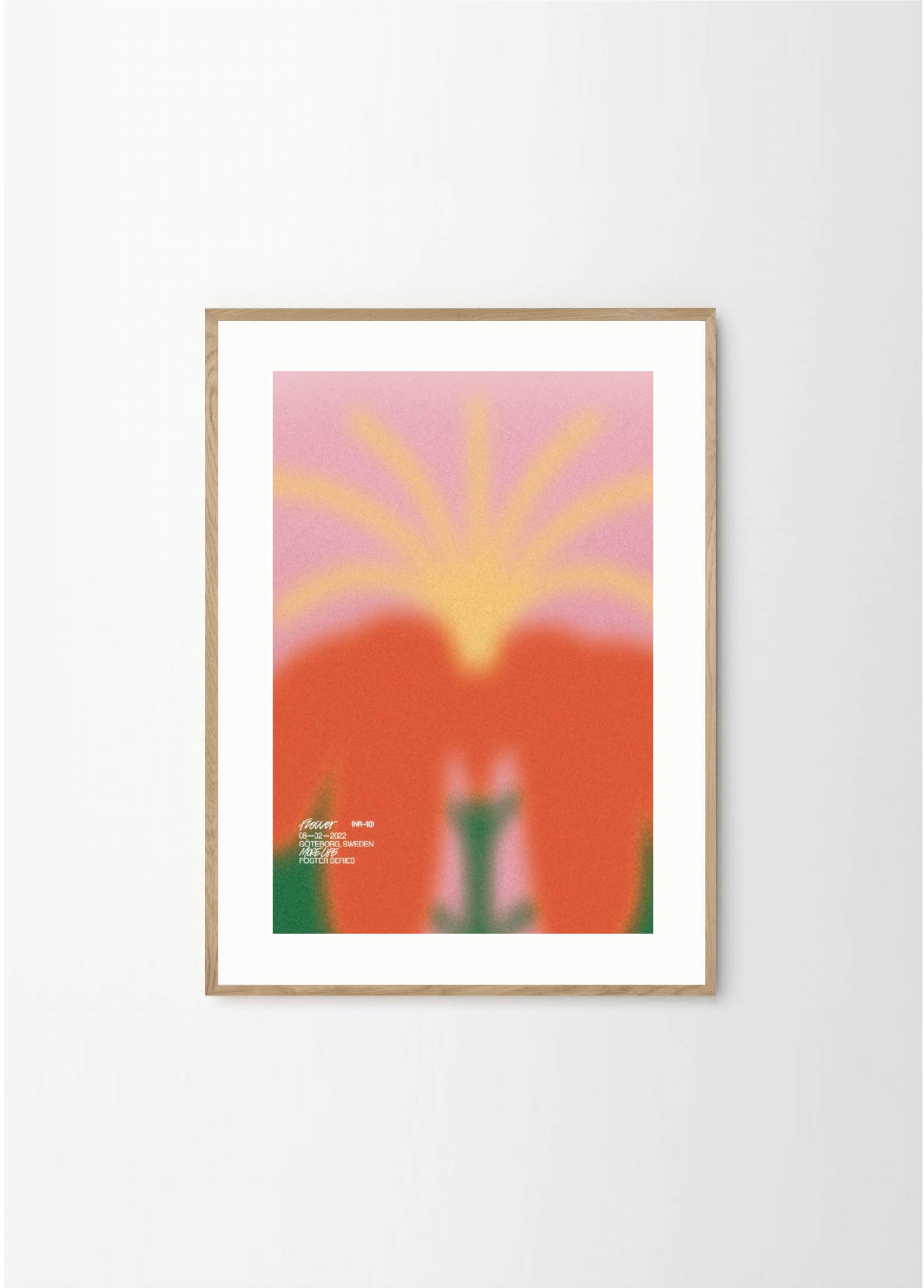 The artwork Flower 10 depicts a red flower with a pastelle pink background in a portrait format. The yellow, pink and red colors make Flower 10 perfect for pink, green or walnut colored frame, with or without passepartout.