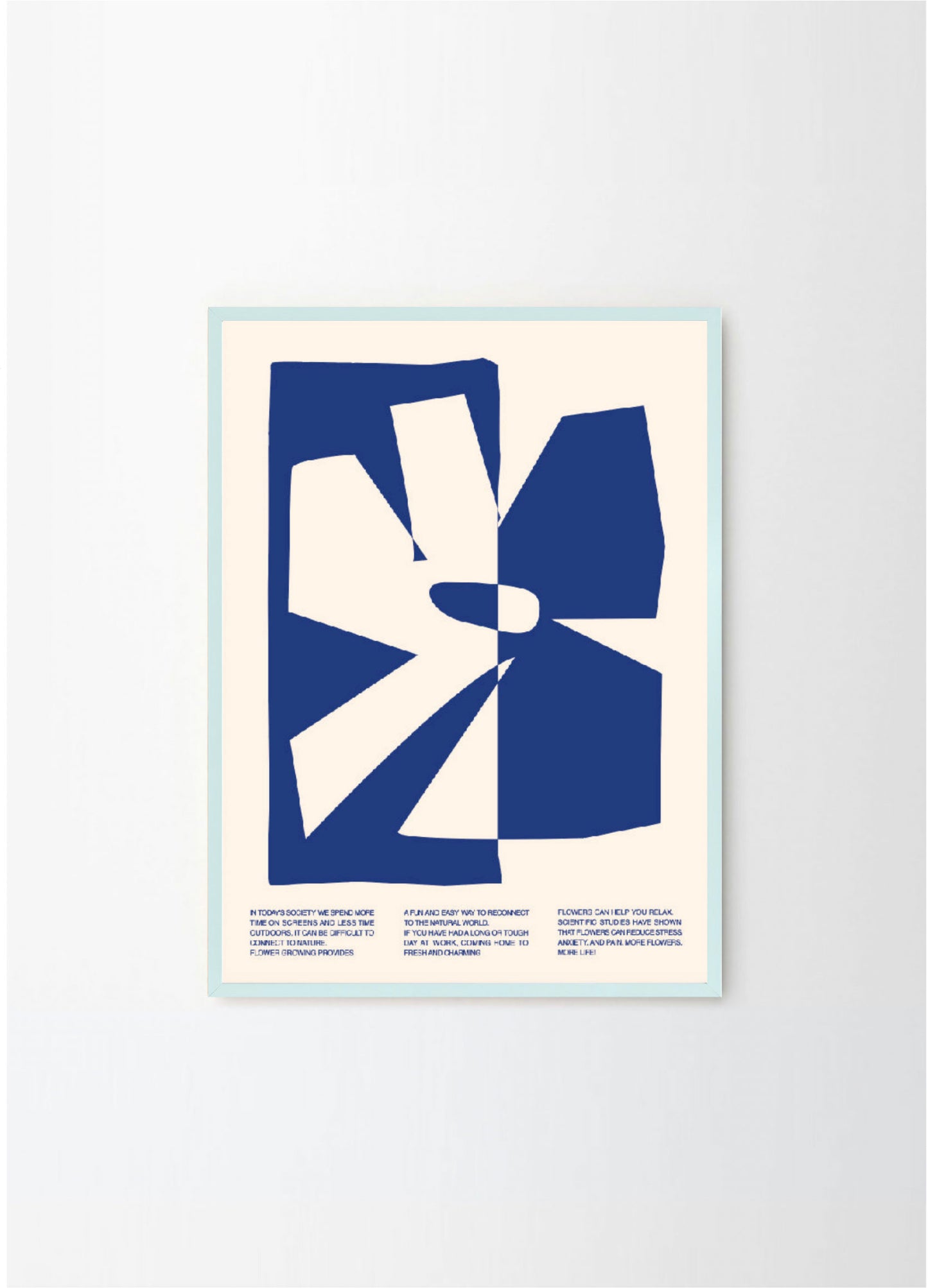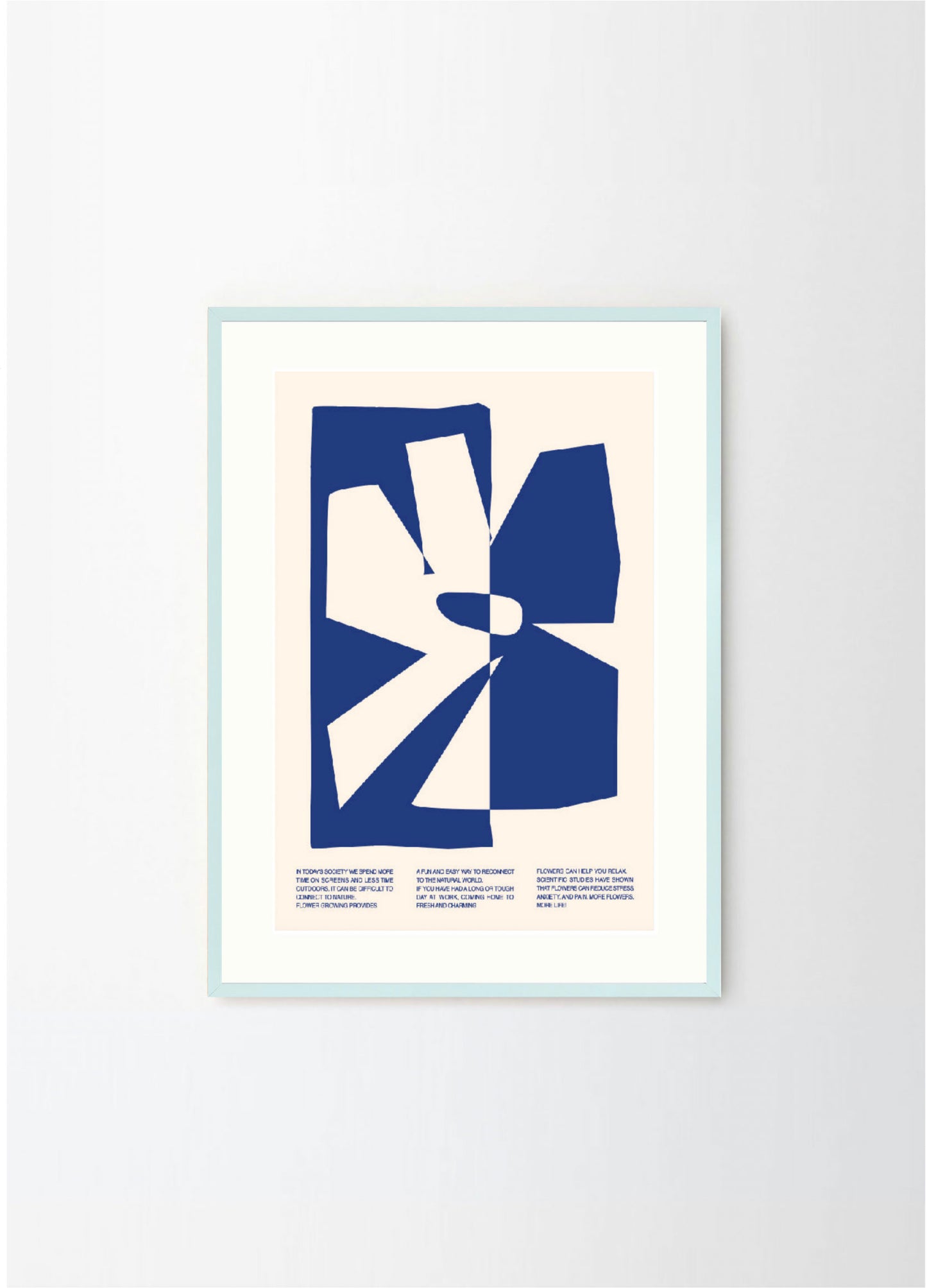 The artwork Flower 2 depicts an abstract white and blue flower in a portrait format. The white and blue colors make Flower 2 perfect for a white, blue or walnut colored frame, with or without passepartout.
