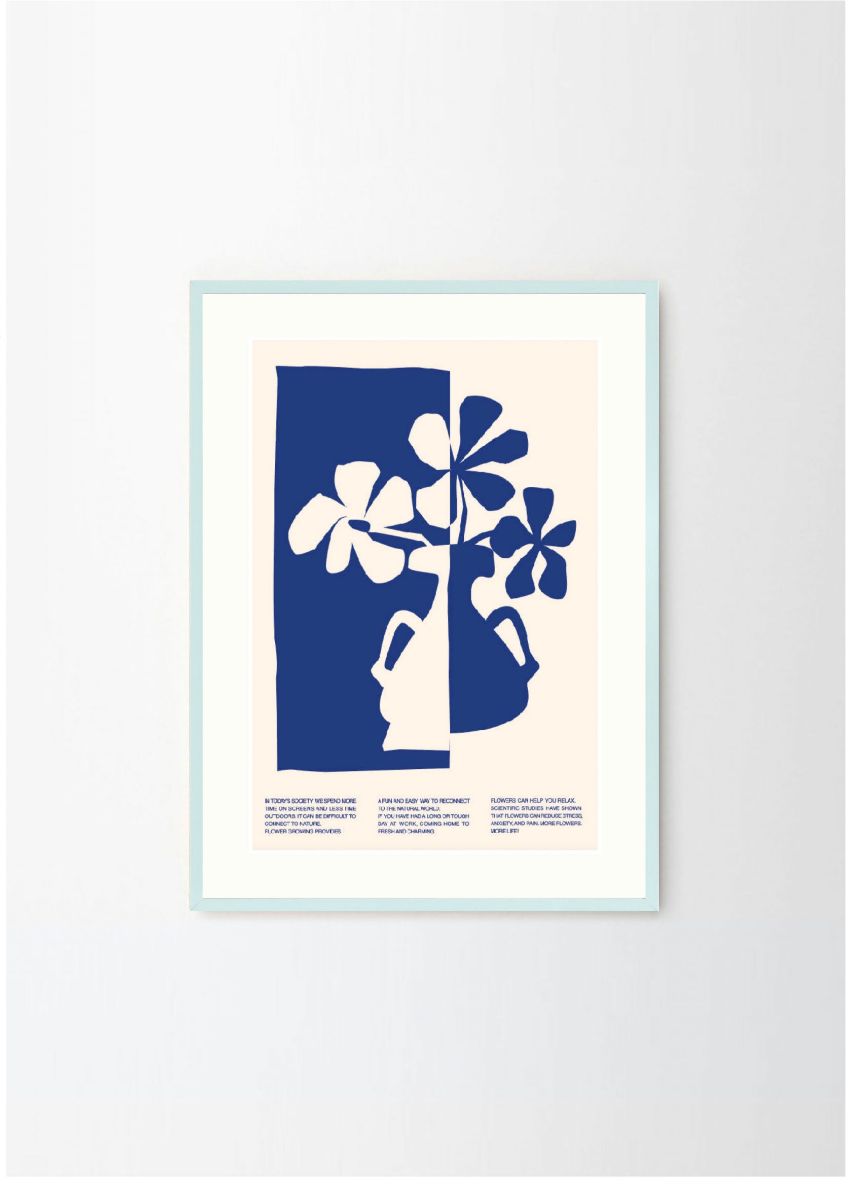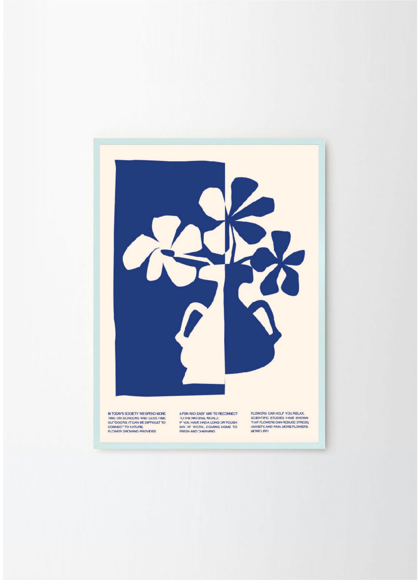 The artwork Flower 3 depicts an abstract white and blue flower in a portrait format. The white and blue colors make Flower 3 perfect for a white, blue or walnut colored frame, with or without passepartout.