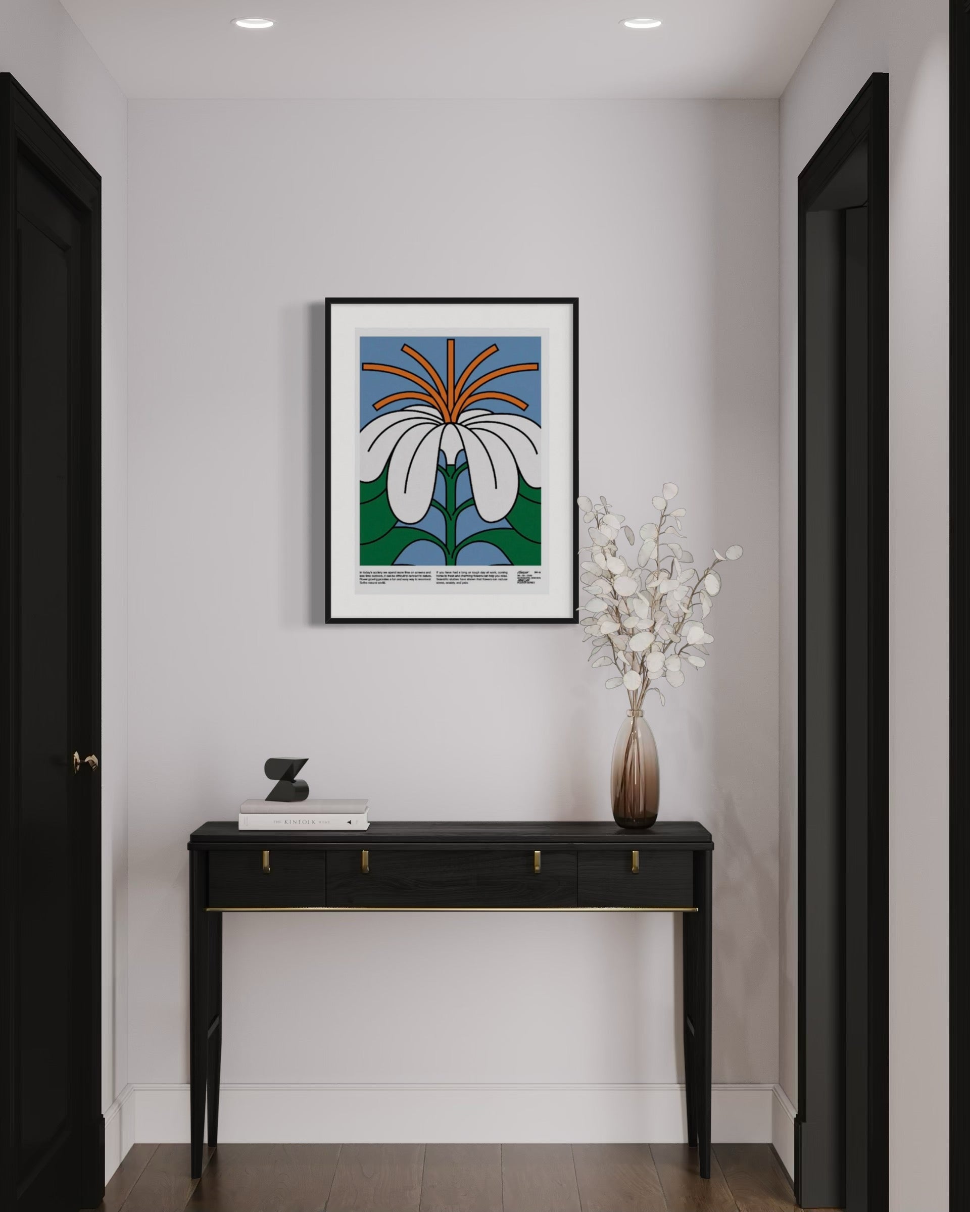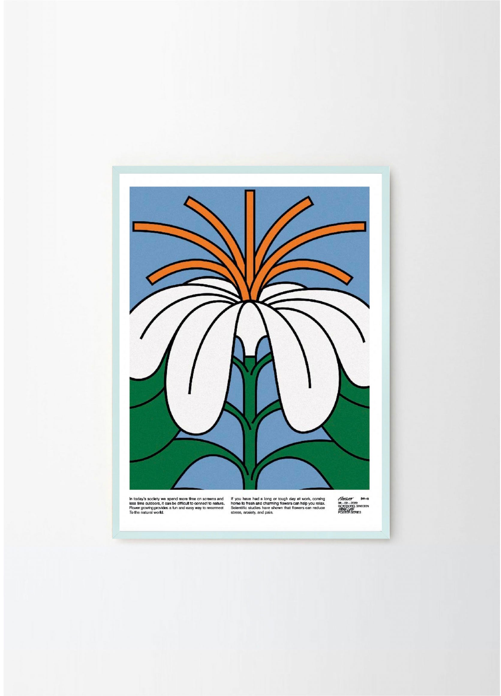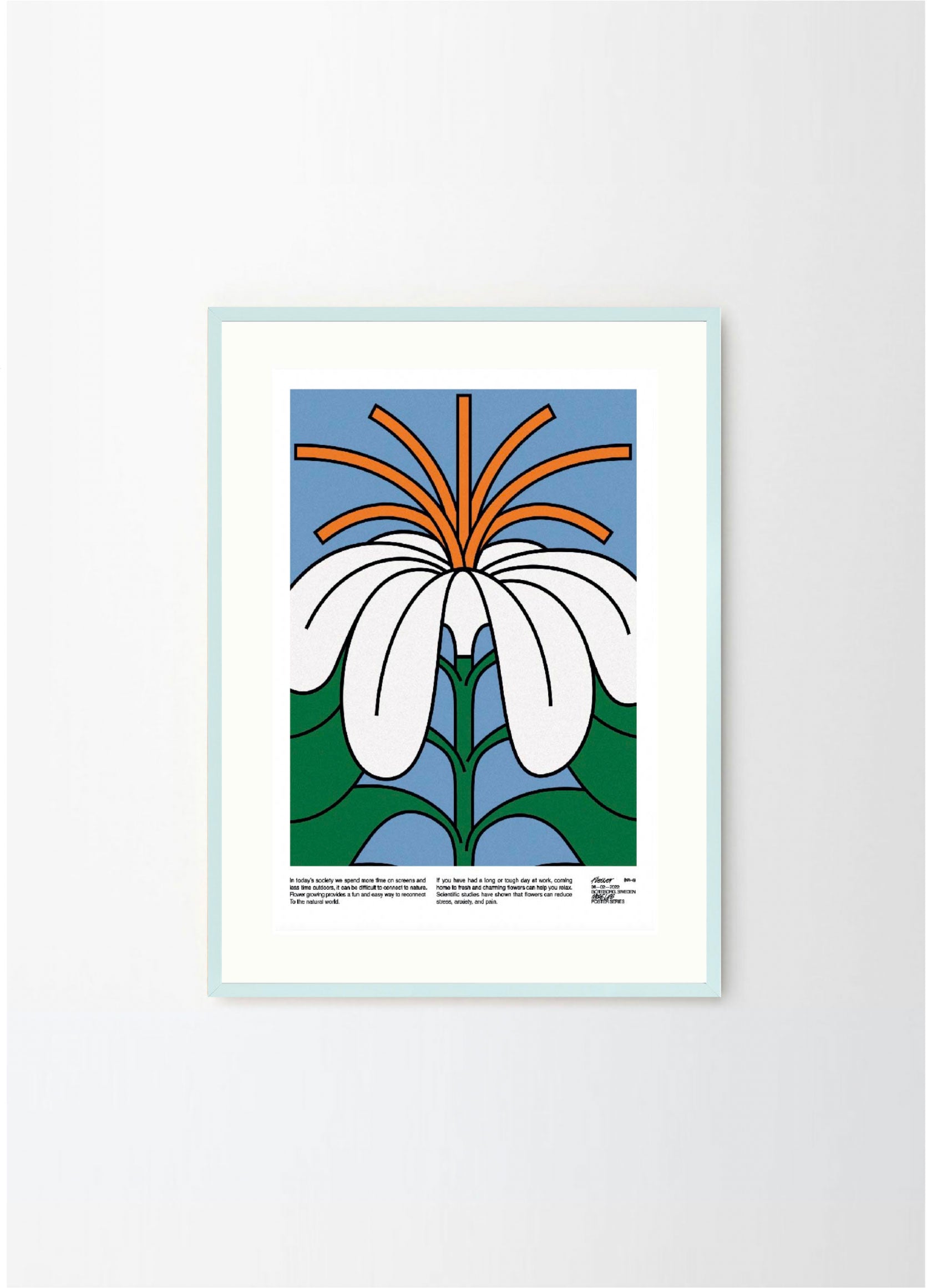 The artwork Flower 8 depicts a white flower on a green base with light blue background in a portrait format. The white, green and blue colors make Flower 8 perfect for a green, pastelle blue or walnut colored frame, with or without passepartout.