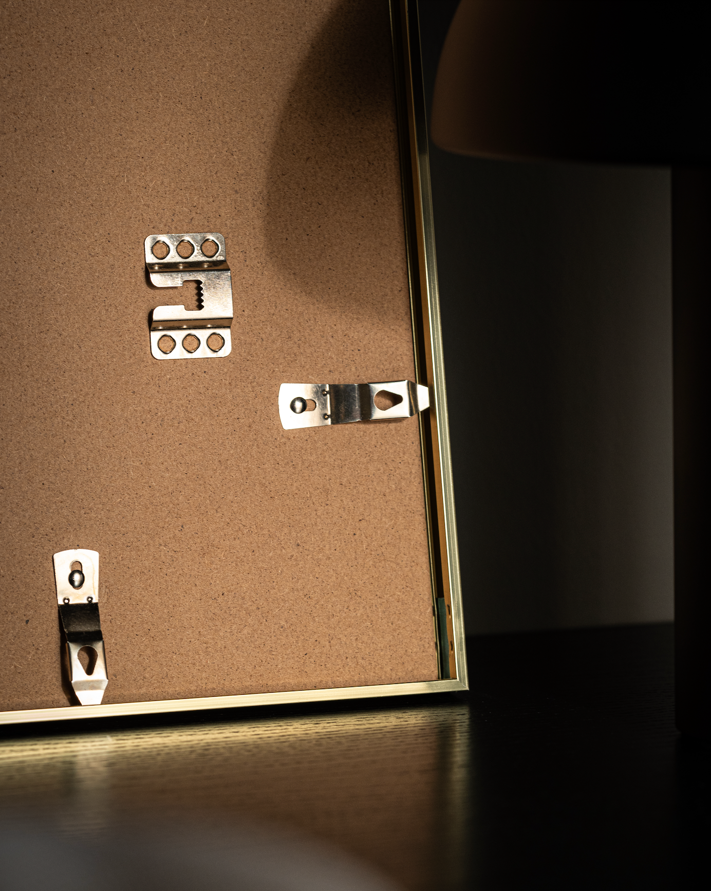Metal Gold frame with plexiglass made of high-quality pine. Simple framing with clips on the back. Two metal hangers allow for both horizontal and vertical hanging. Protective plastic on plexiglass, to be removed before use.