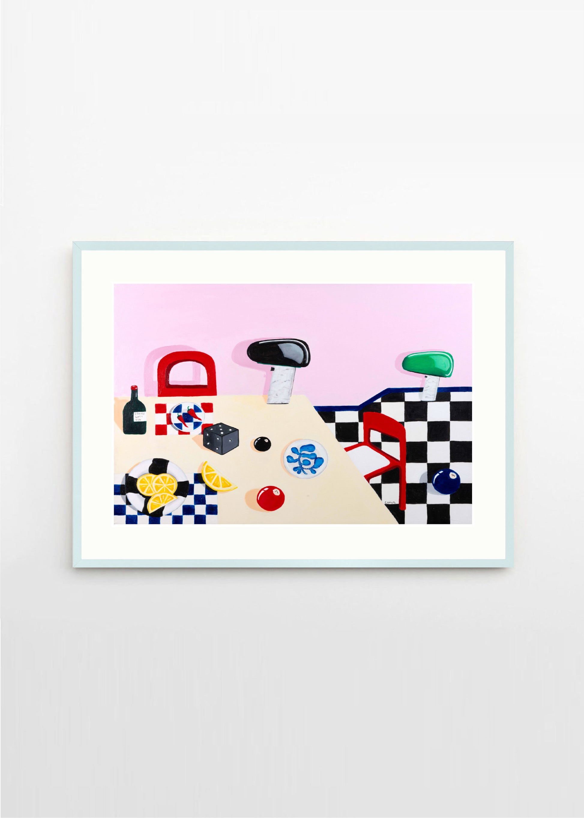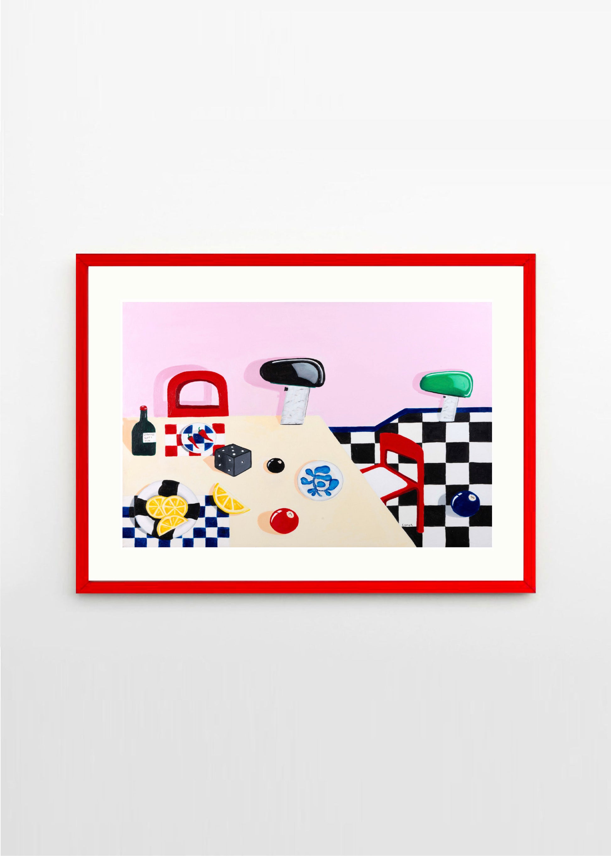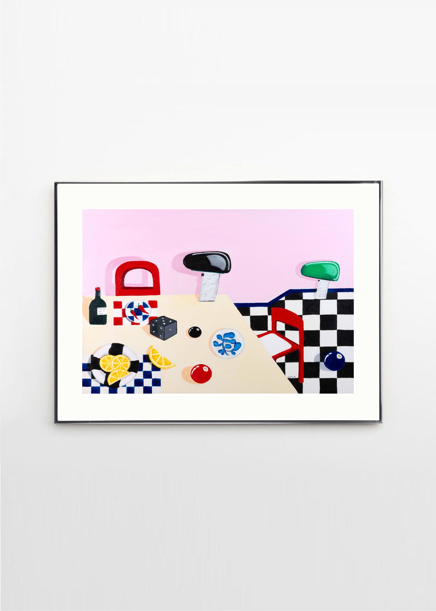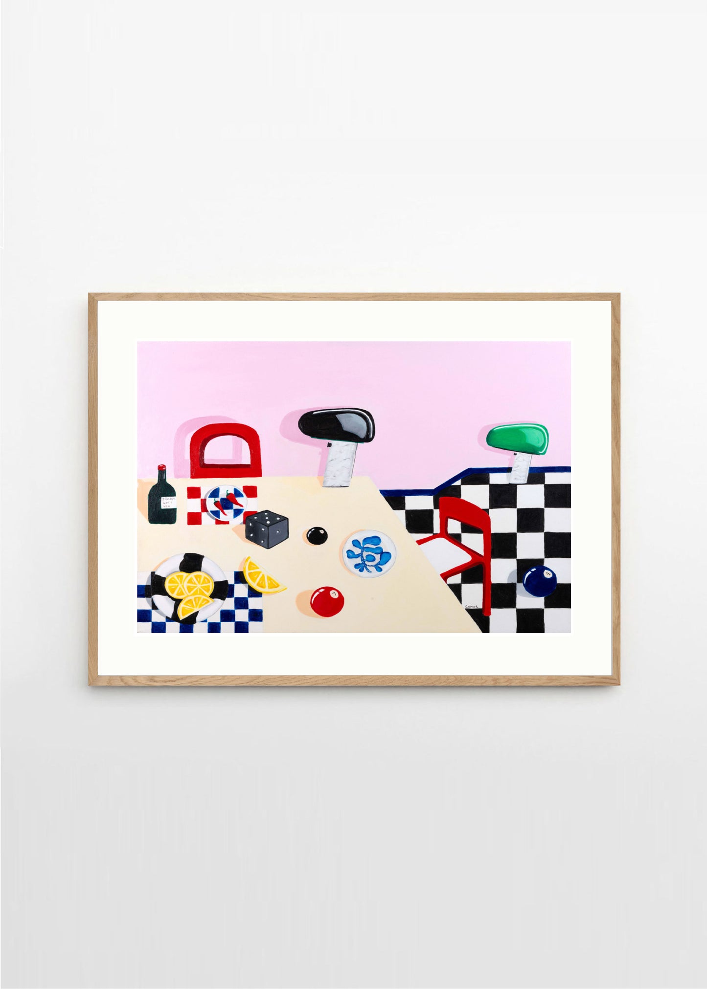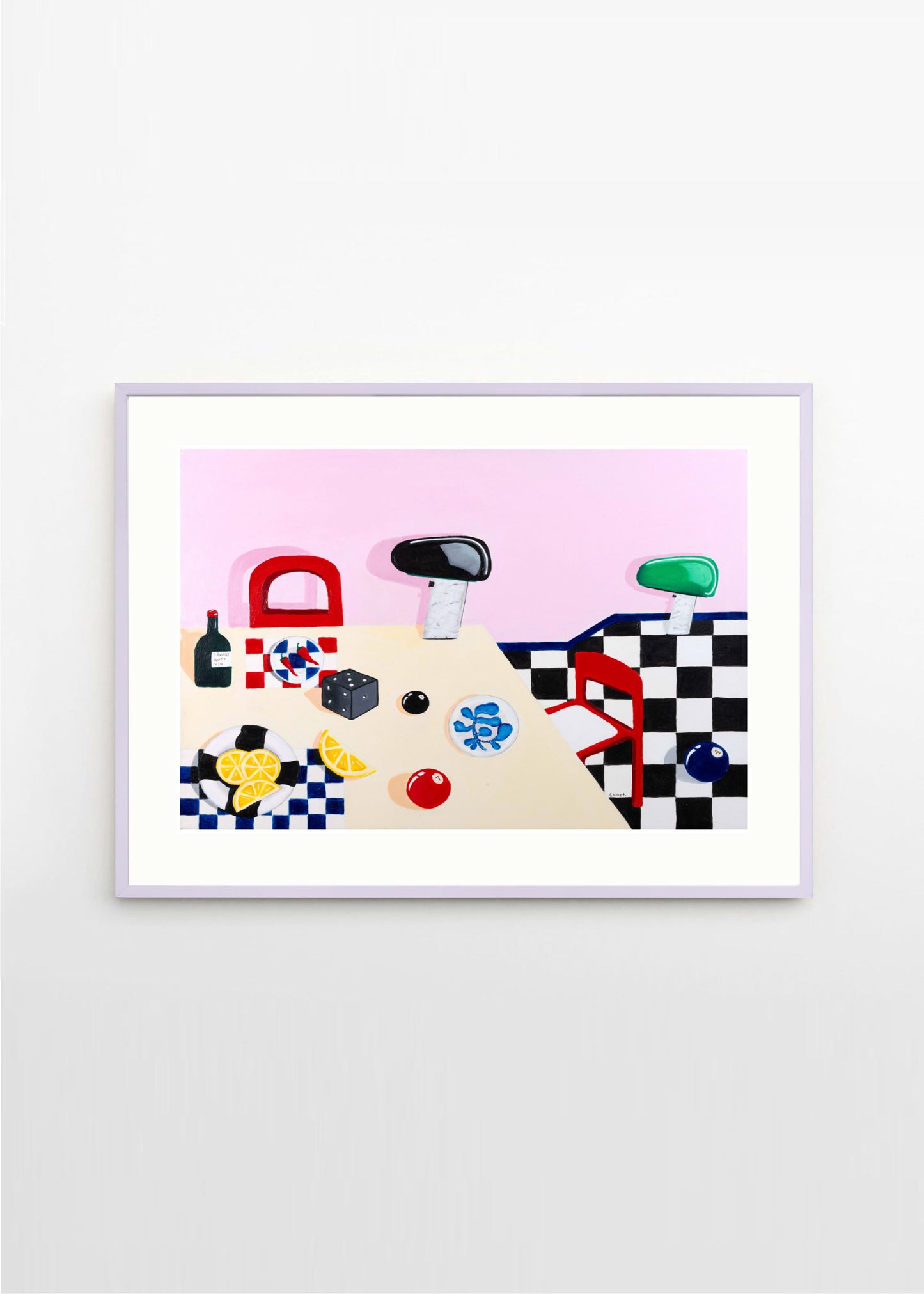 The artwork Good Wine by Moa Comet depicts a dinner setup, the lovely tones of pink etc colors makes it perfect for a pastelle colored frame, with or without passepartout.