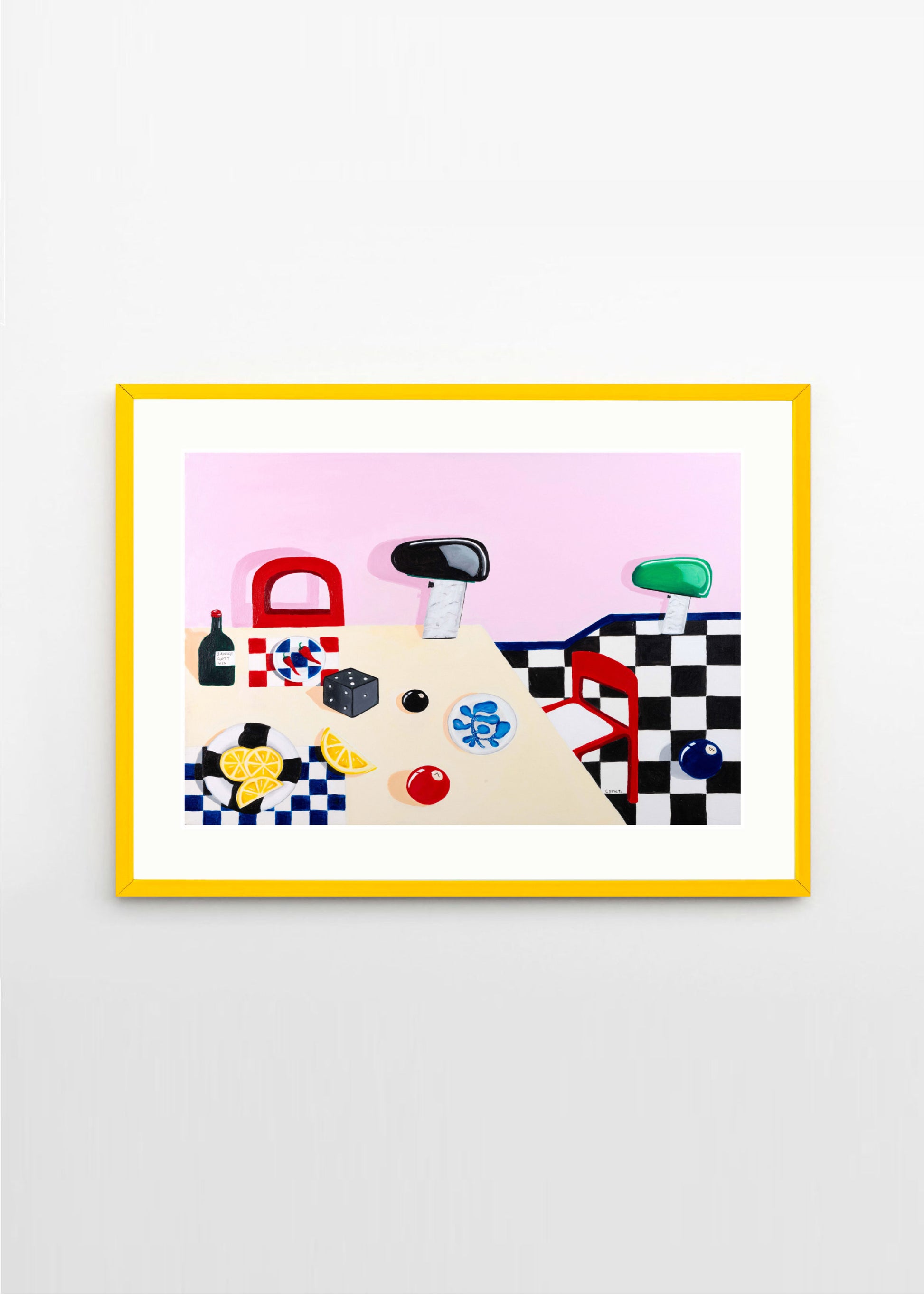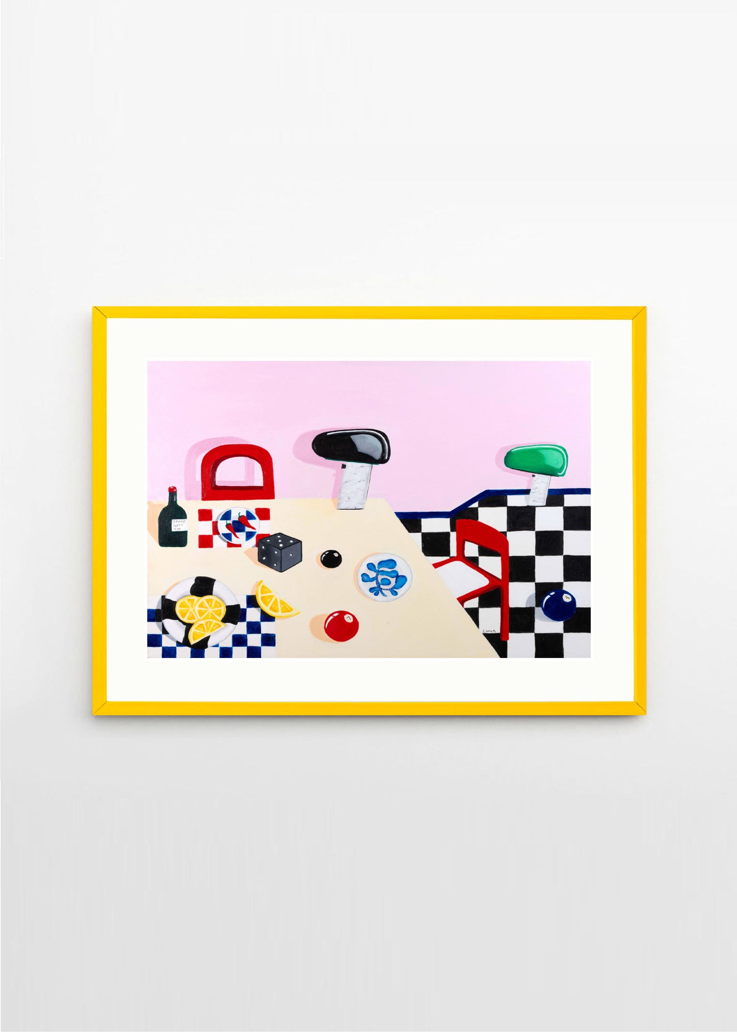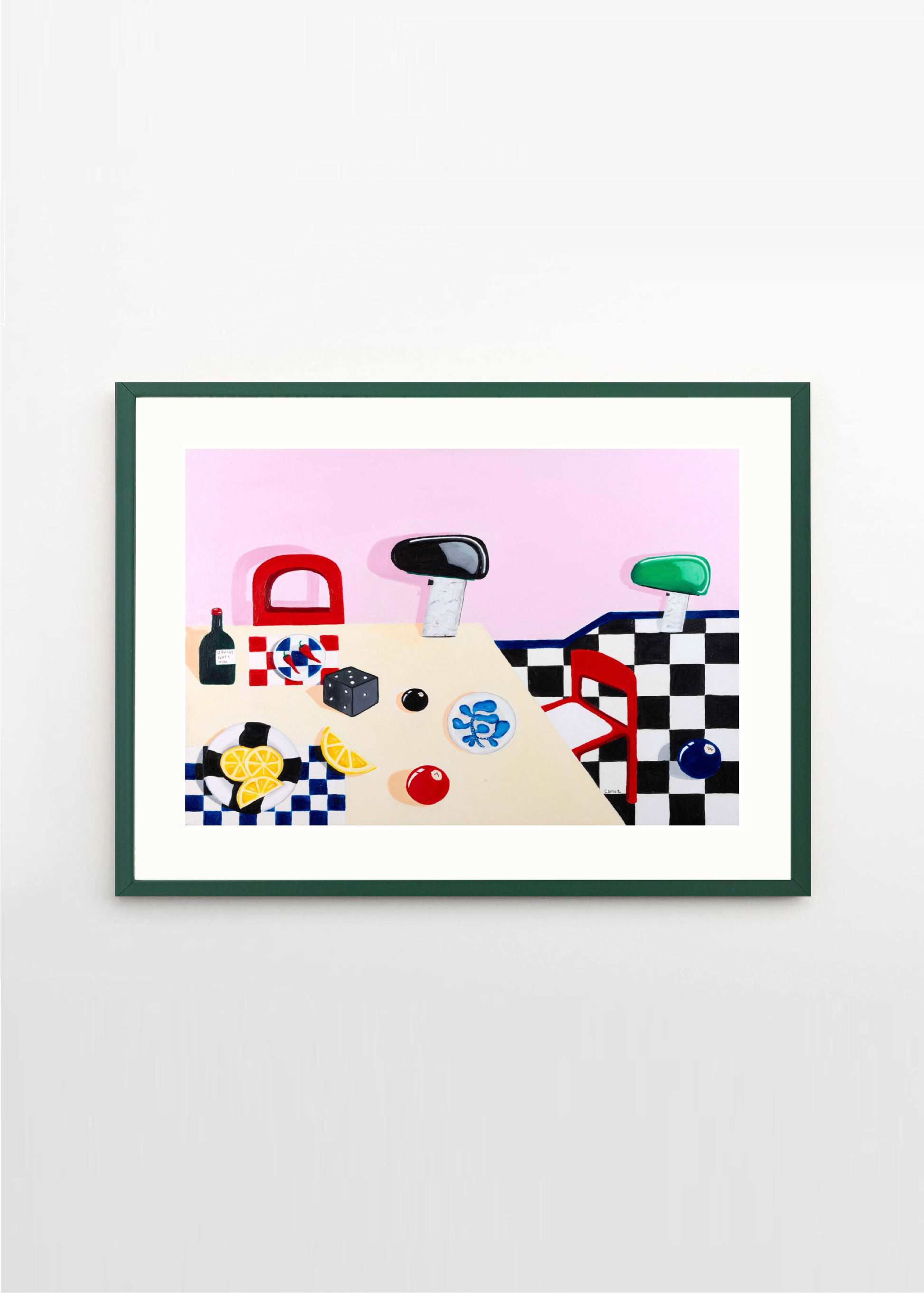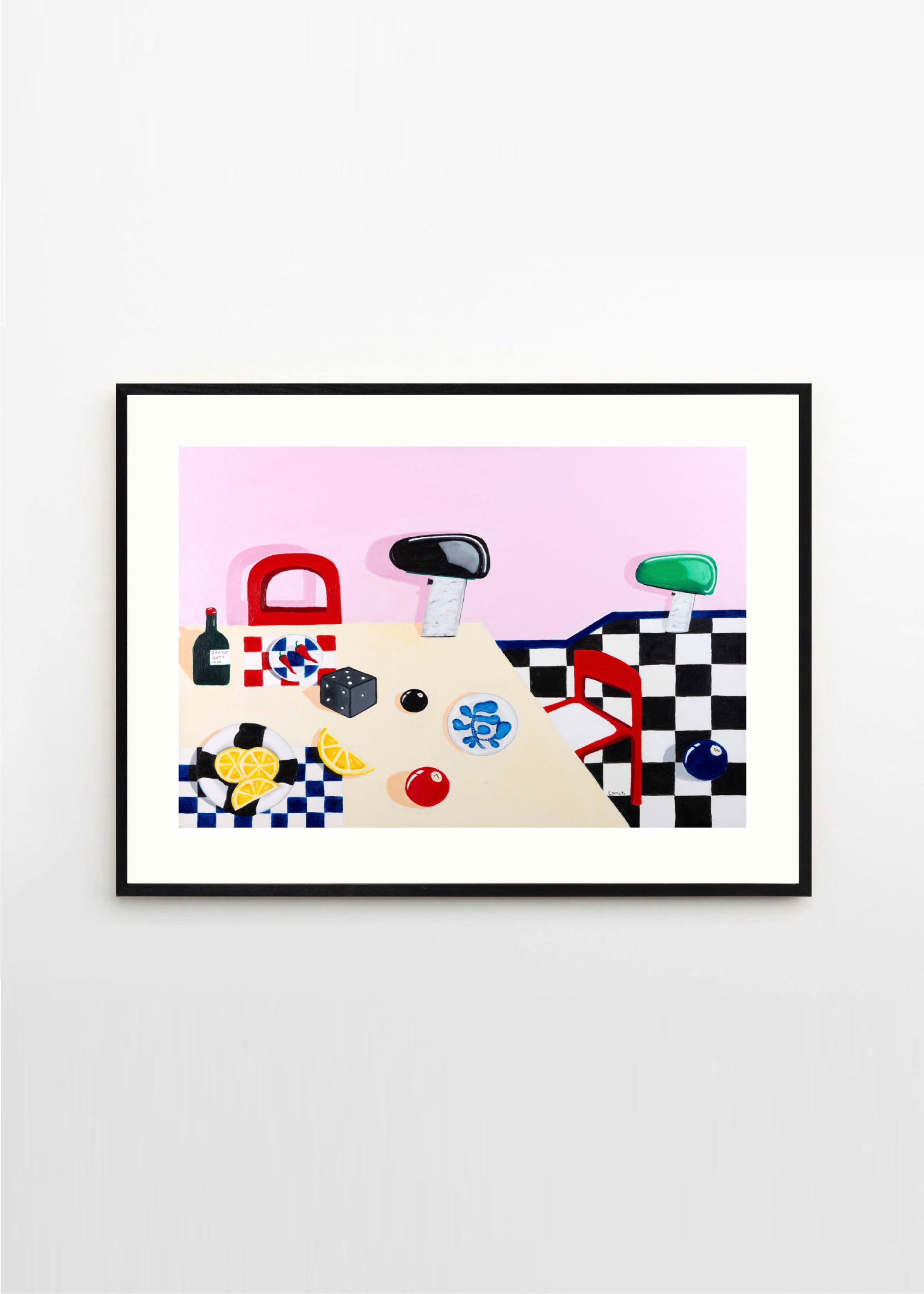 The artwork Good Wine by Moa Comet depicts a dinner setup, the lovely tones of pink etc colors makes it perfect for a pastelle colored frame, with or without passepartout.