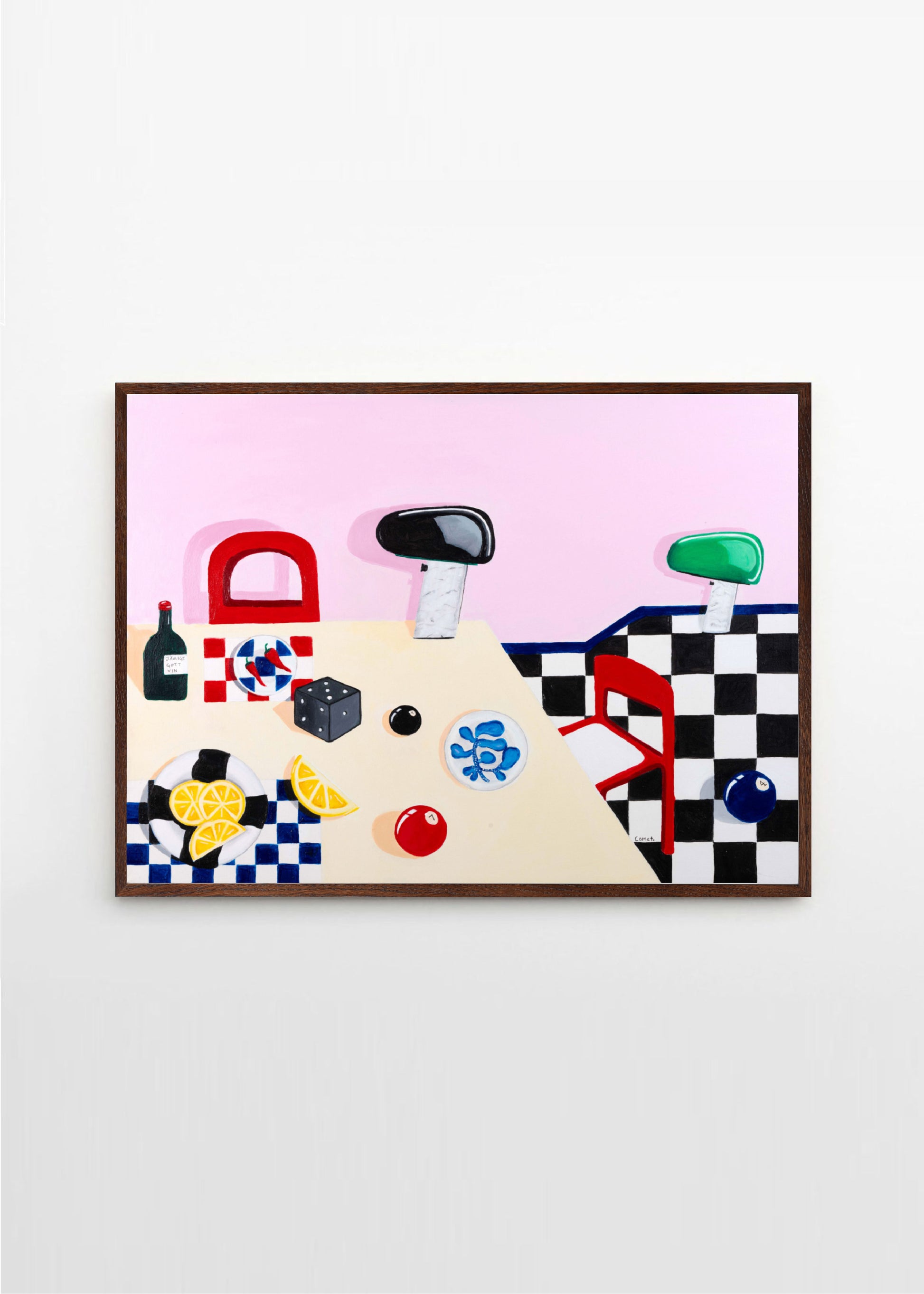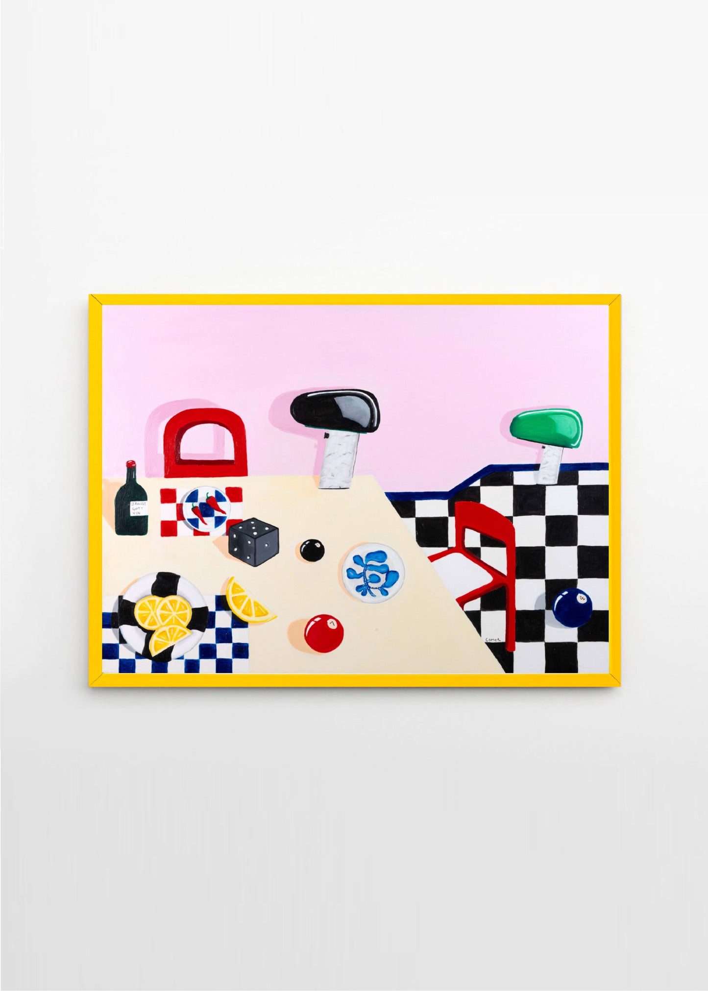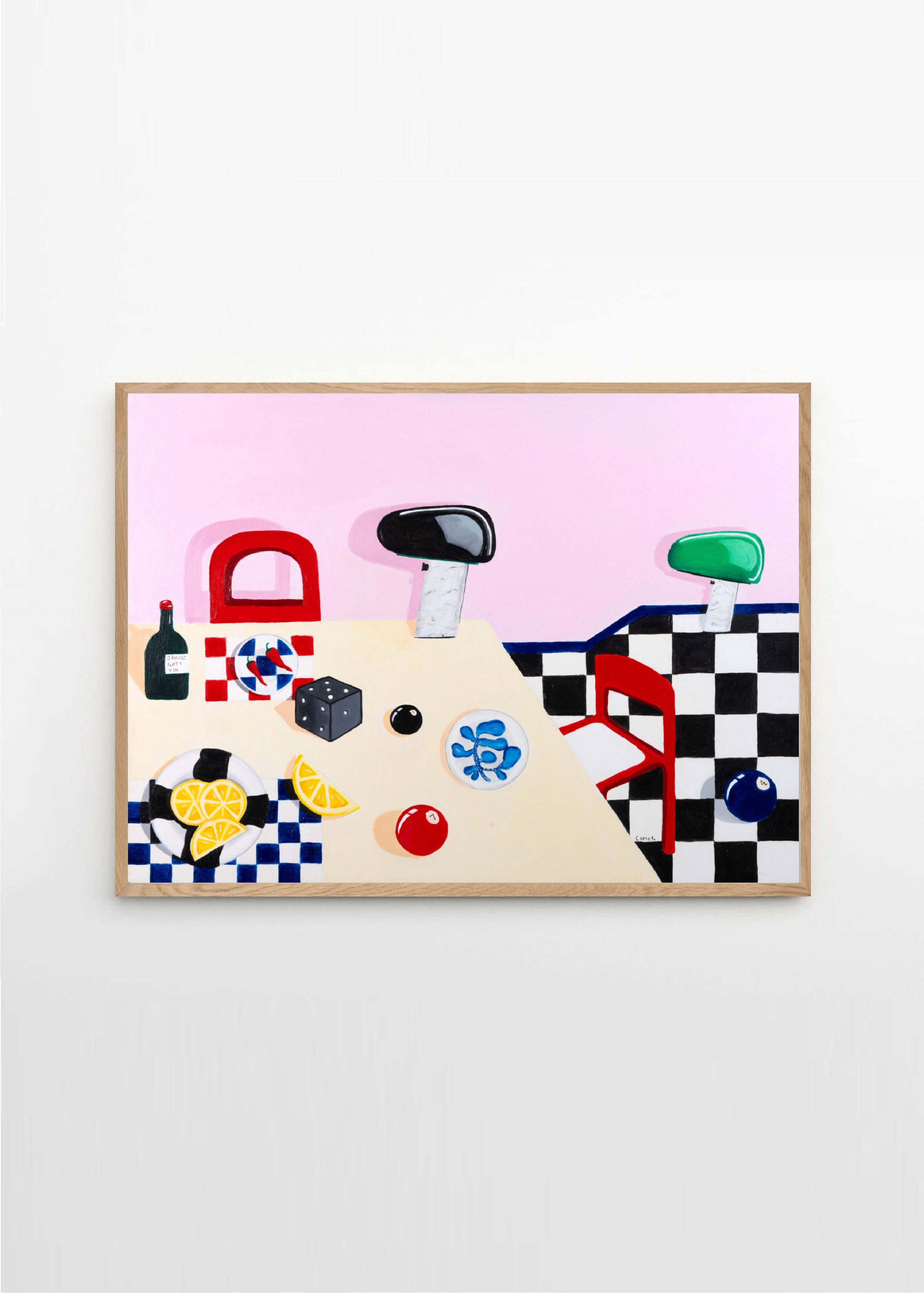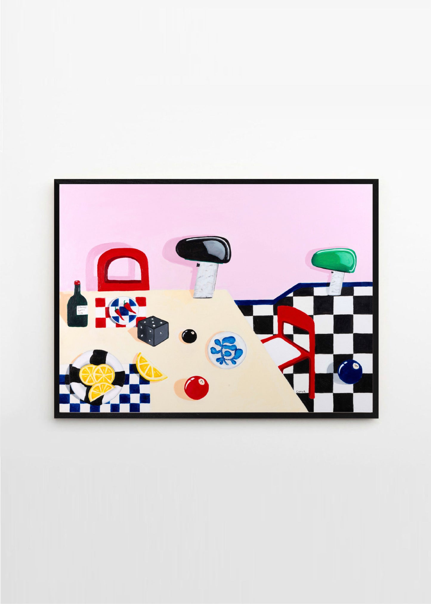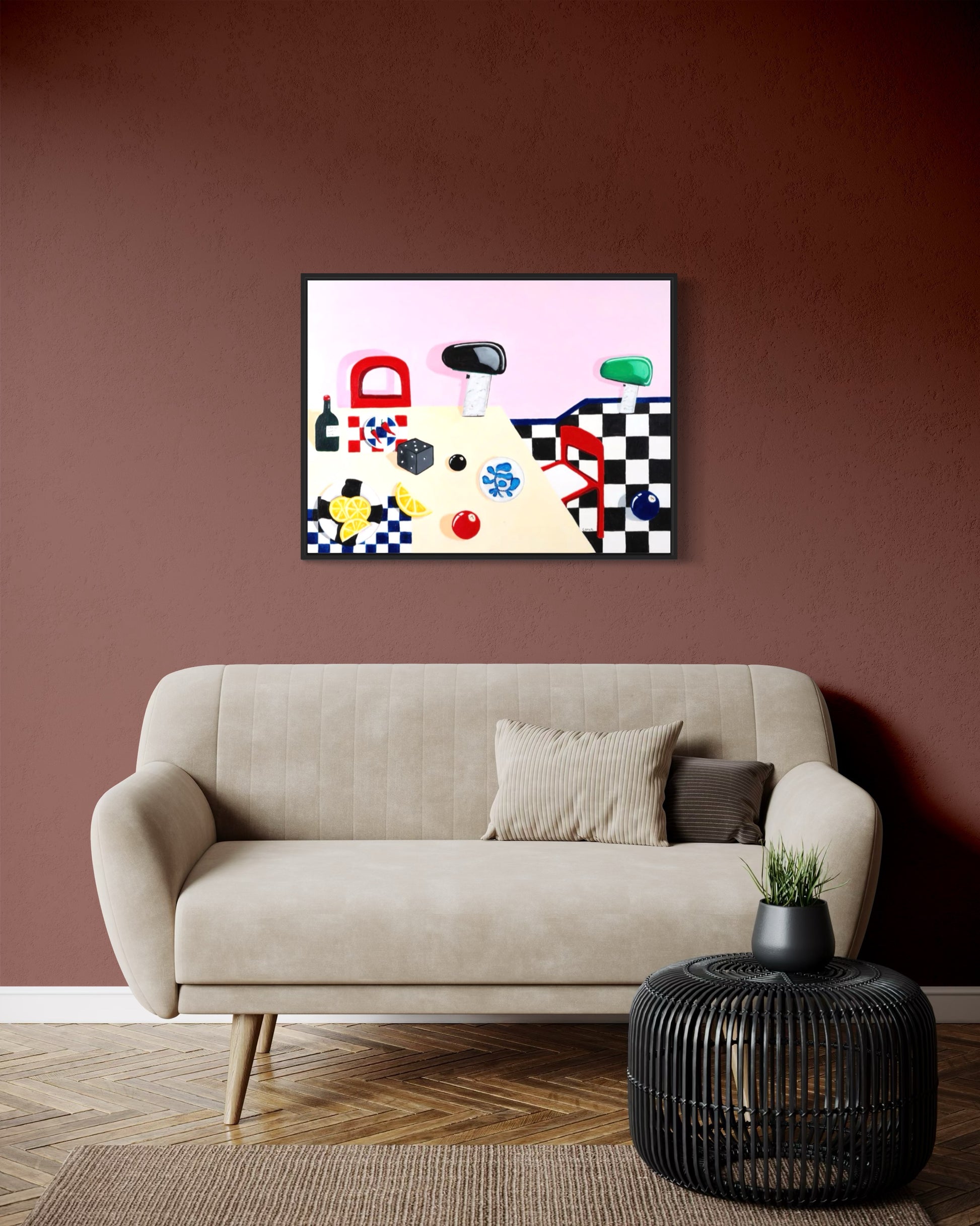 The artwork Good Wine by Moa Comet depicts a dinner setup, the lovely tones of pink etc colors makes it perfect for a pastelle colored frame, with or without passepartout.