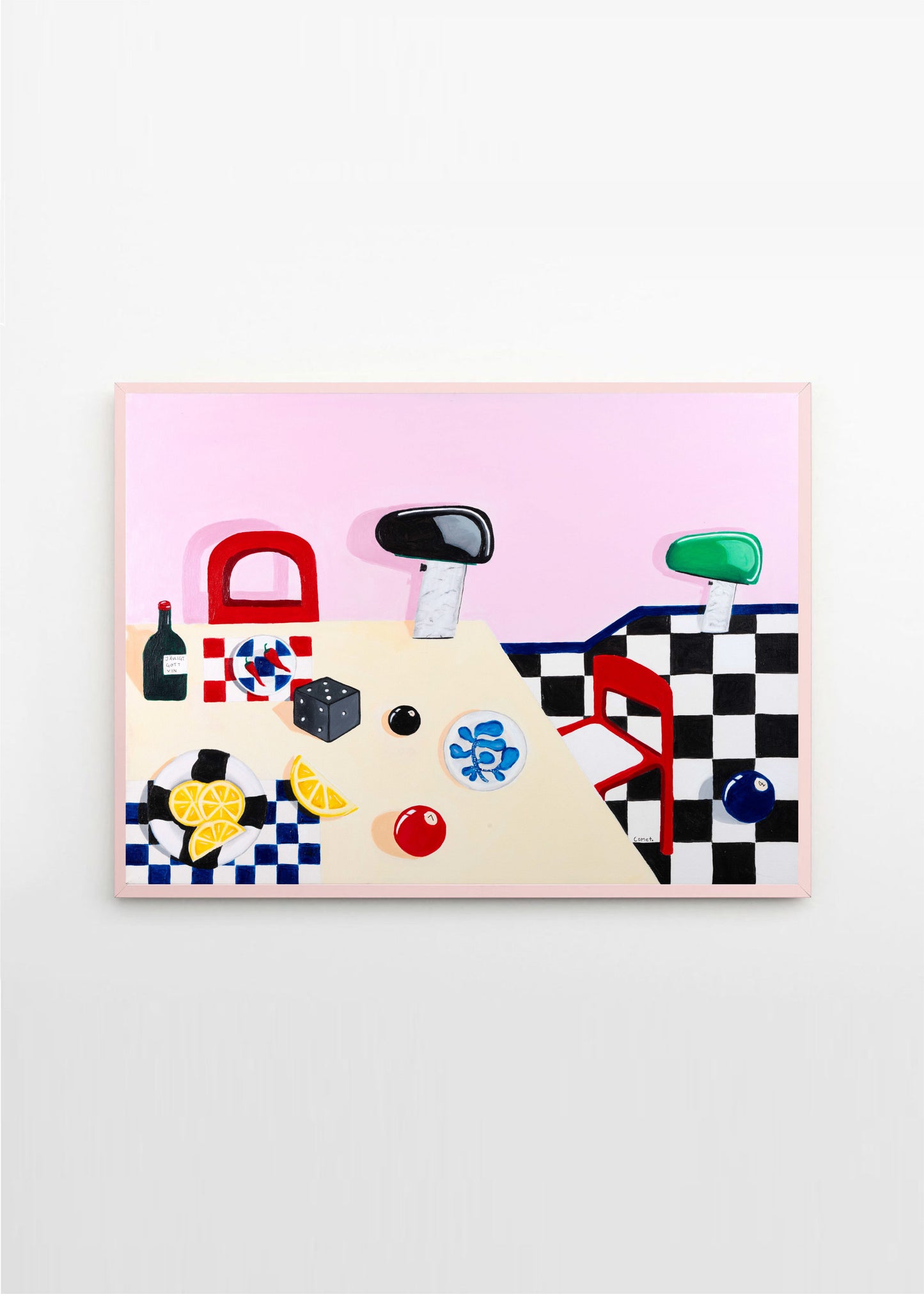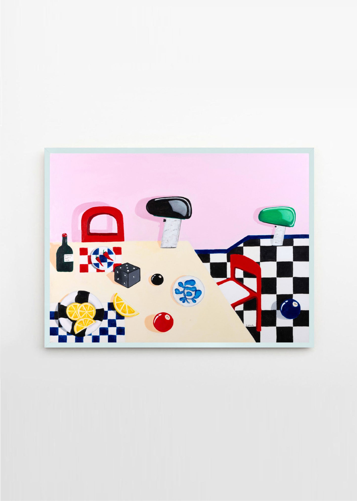 Moa is a Helsingborg based artist who moved to L.A as a 19-year old to study. During her time abroad she decided to pick up the brush and paint between exams, which she believed was a relaxing, yet productive thing to do. Moa gets her inspiration from everyday life and surroundings, and it mostly comes to her at night before bed. She loves to combine her inspiration with colorful and fun motives. Moa uses a lot of different dimensions in her art, since she believes it makes the painting more fun and alive.