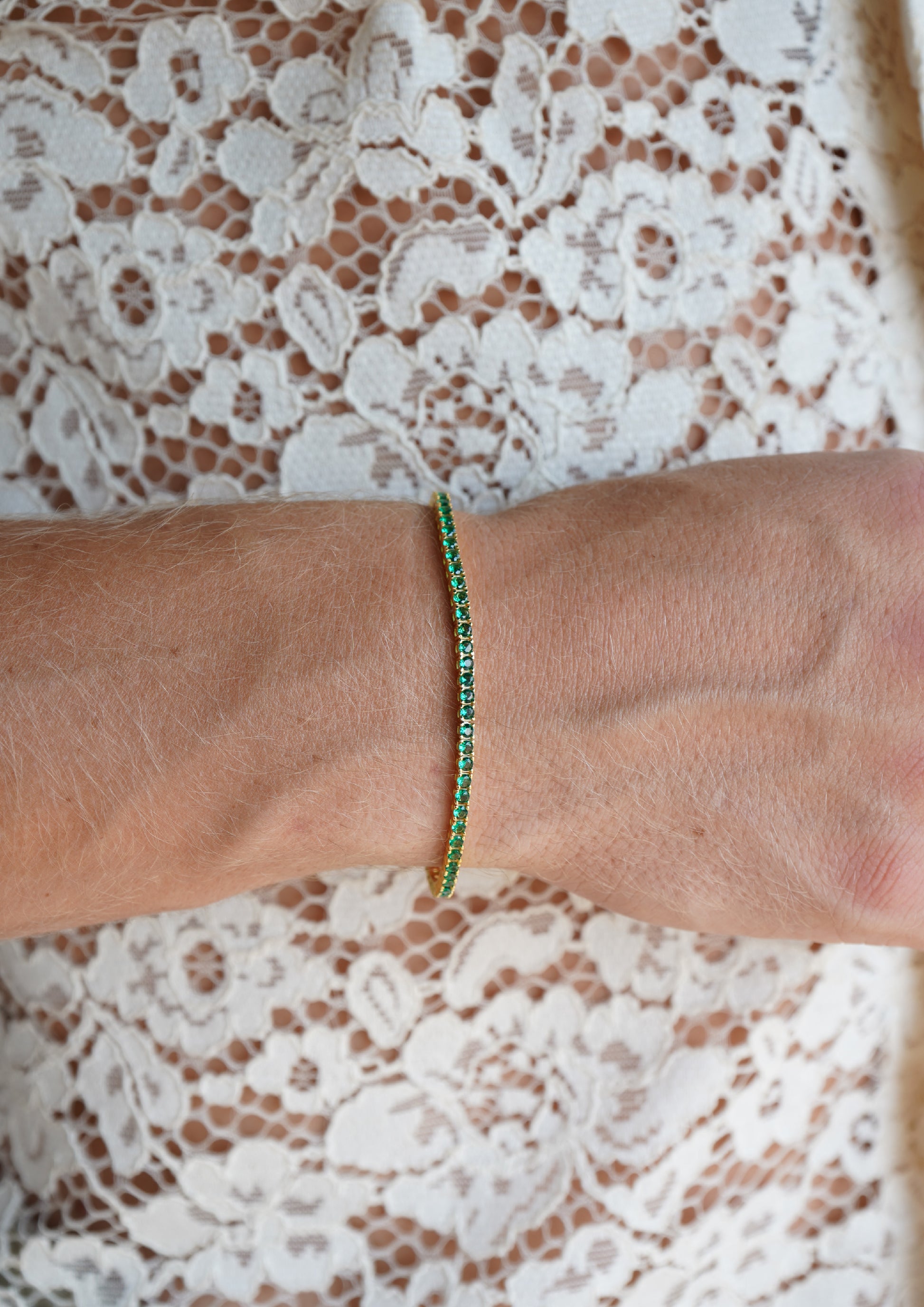 Our 2,5mm tennis bracelet is gold-plated with 0,5 micron and is made in 100% sterling silver. It will last a lifetime if you treat it well. The bracelet is handcrafted with emerald green AAA zirconia stones and a classical tennis lock. It's the perfect piece for women to make an extra statement.