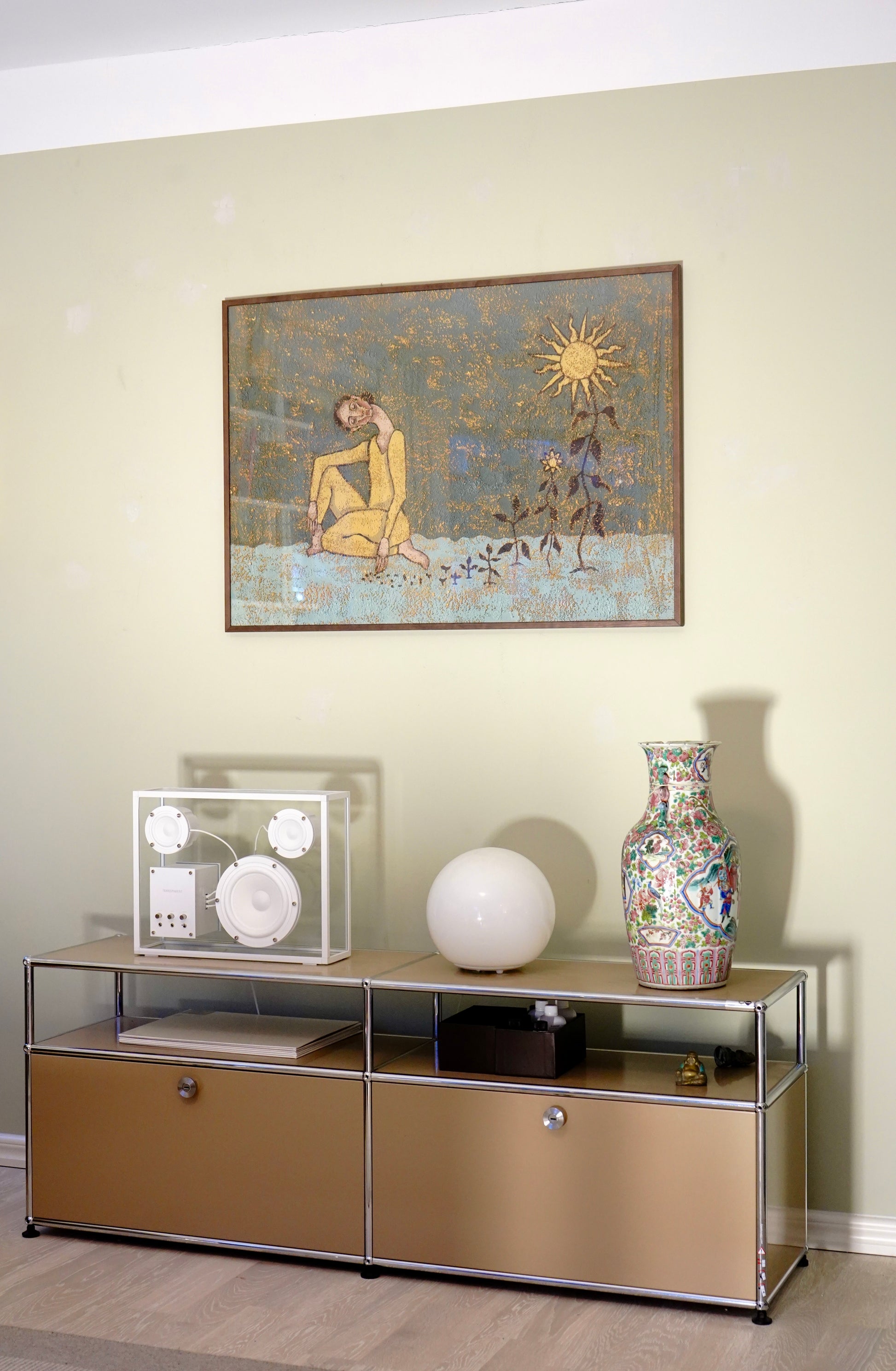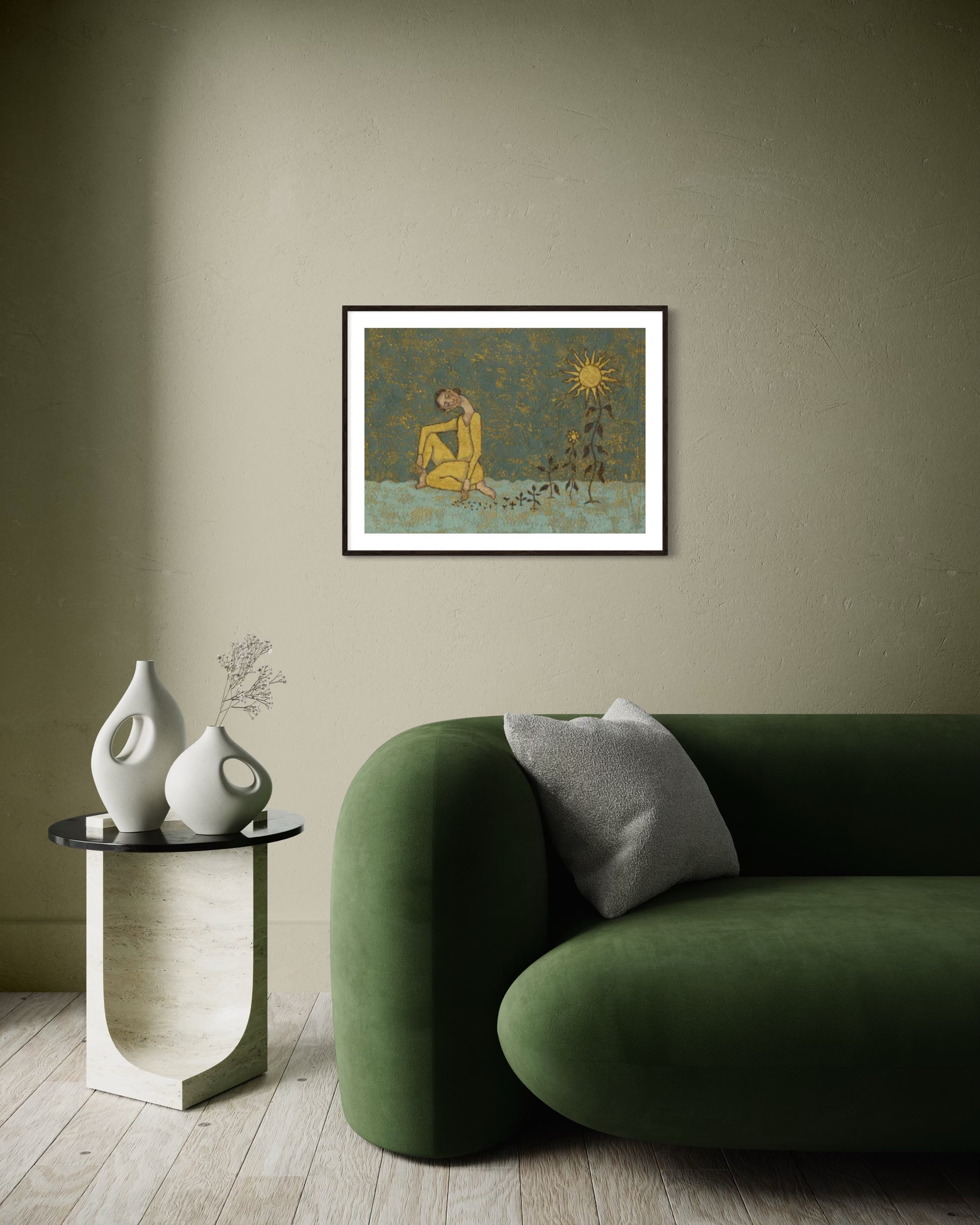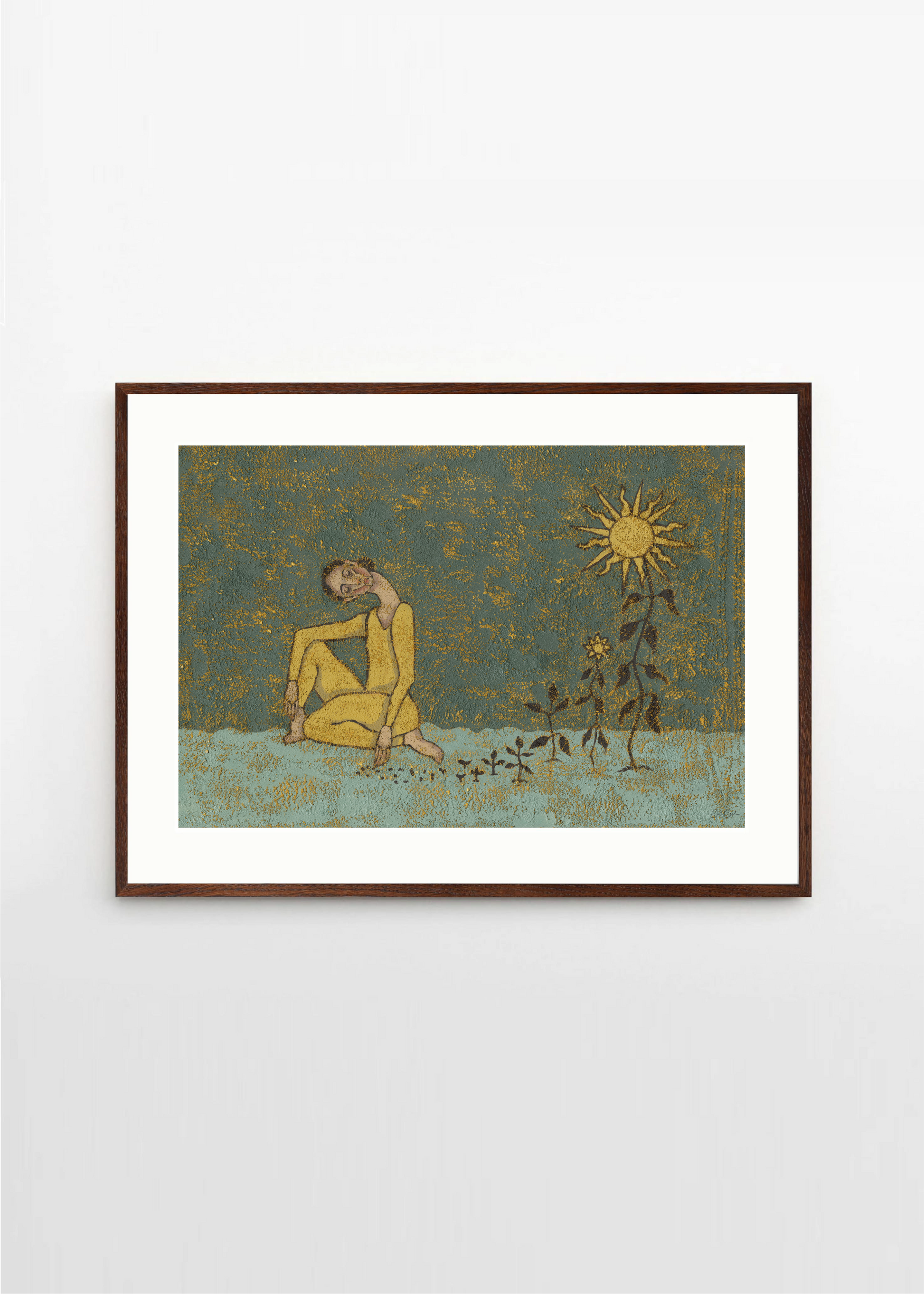 A quiet celebration of inner radiance, Grow Your Own Sunshine by Danish artist Julie Celina captures a solitary figure nested in rich, textured tones of ochre, teal, and golden yellow. Dressed in sunlight and seated among budding flora, the figure becomes a vessel of personal growth—symbolized by the stylized sun hovering above.
