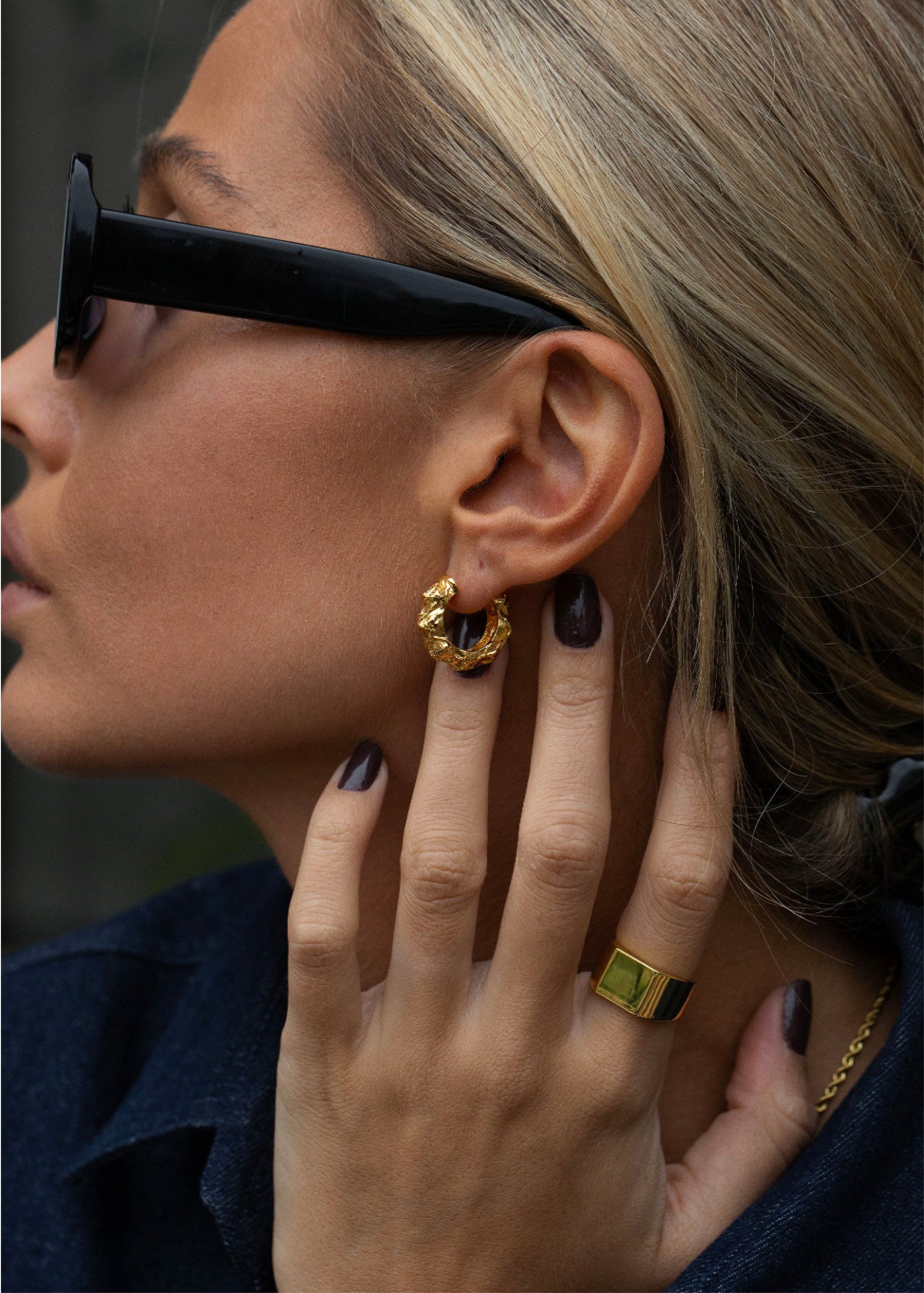 Our Hammered Hoops are chunky and textured which makes them stand out in the crowd. The hoops matches well with our Hammered Ring and our Bold Textured Ring. The earring is also available in silver. These are one of our most popular jewelry and is a perfect everyday earring. Our Hammered Hoops are made from 18k plated brass and is a must have in your jewelry collection.