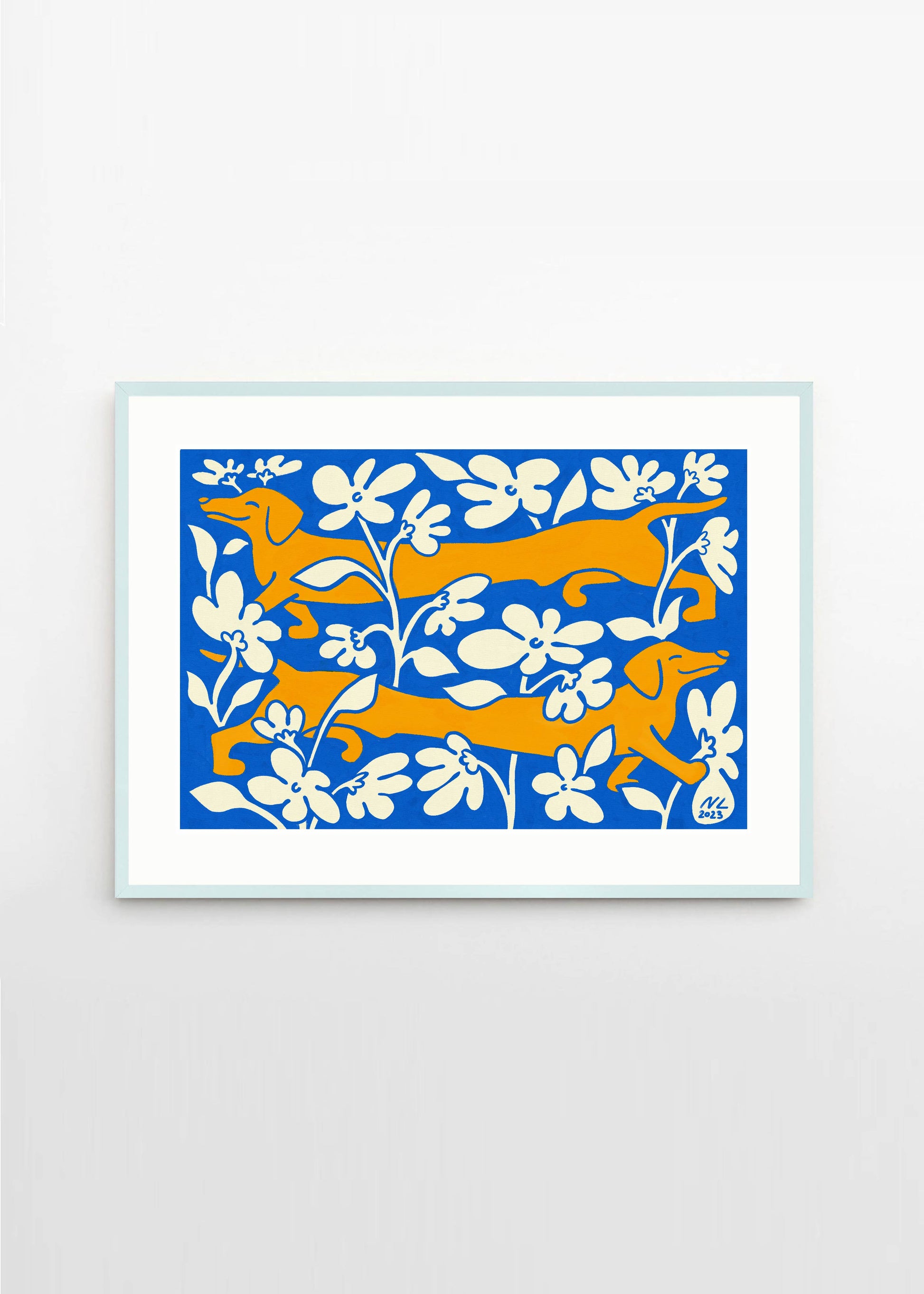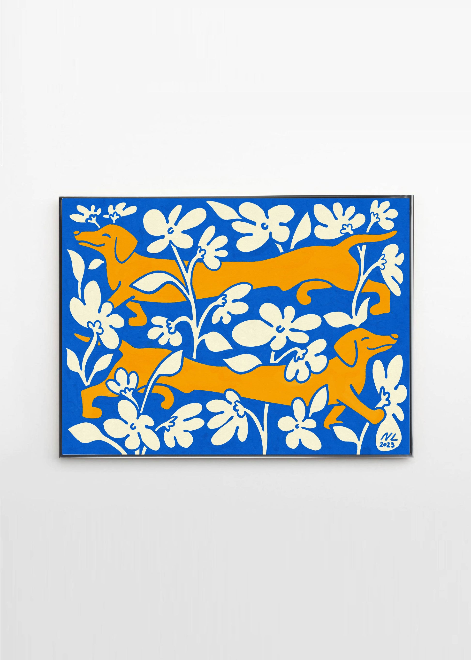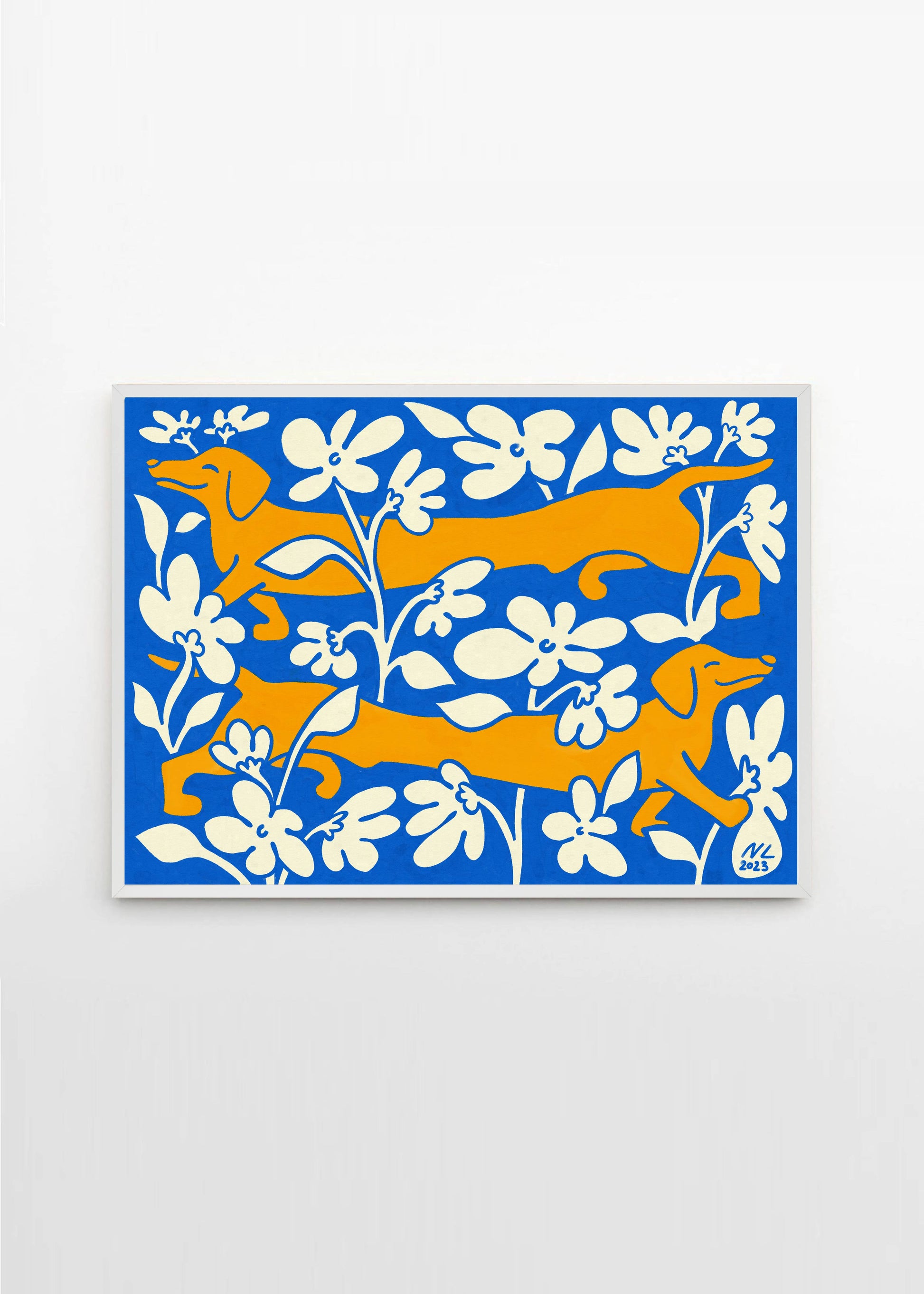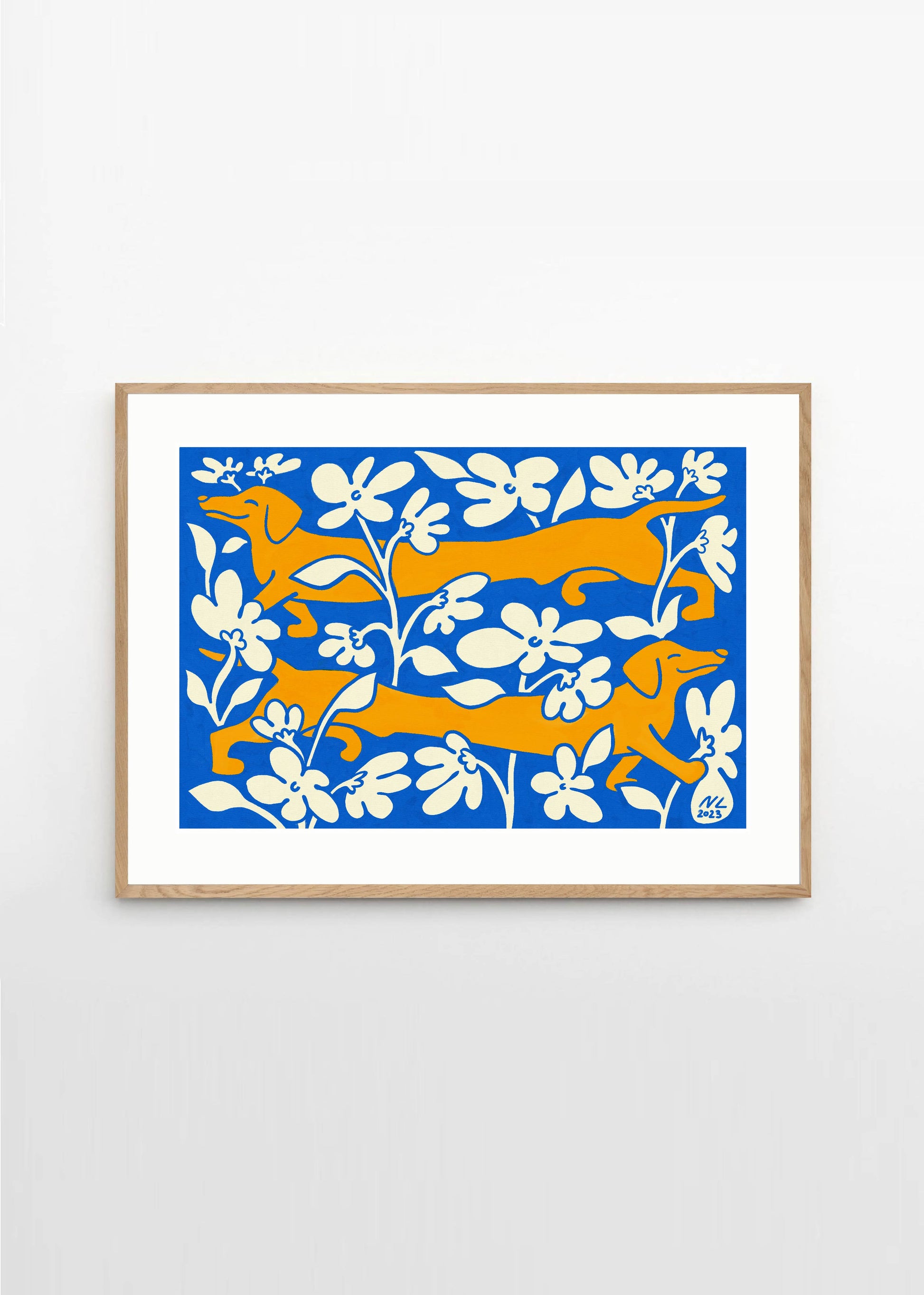 The landscape artwork Hund by Nellie Lindnér depicts two sausage dogs. The blue, white and yellow colors makes it perfect for a colored frame, with or without passepartout.