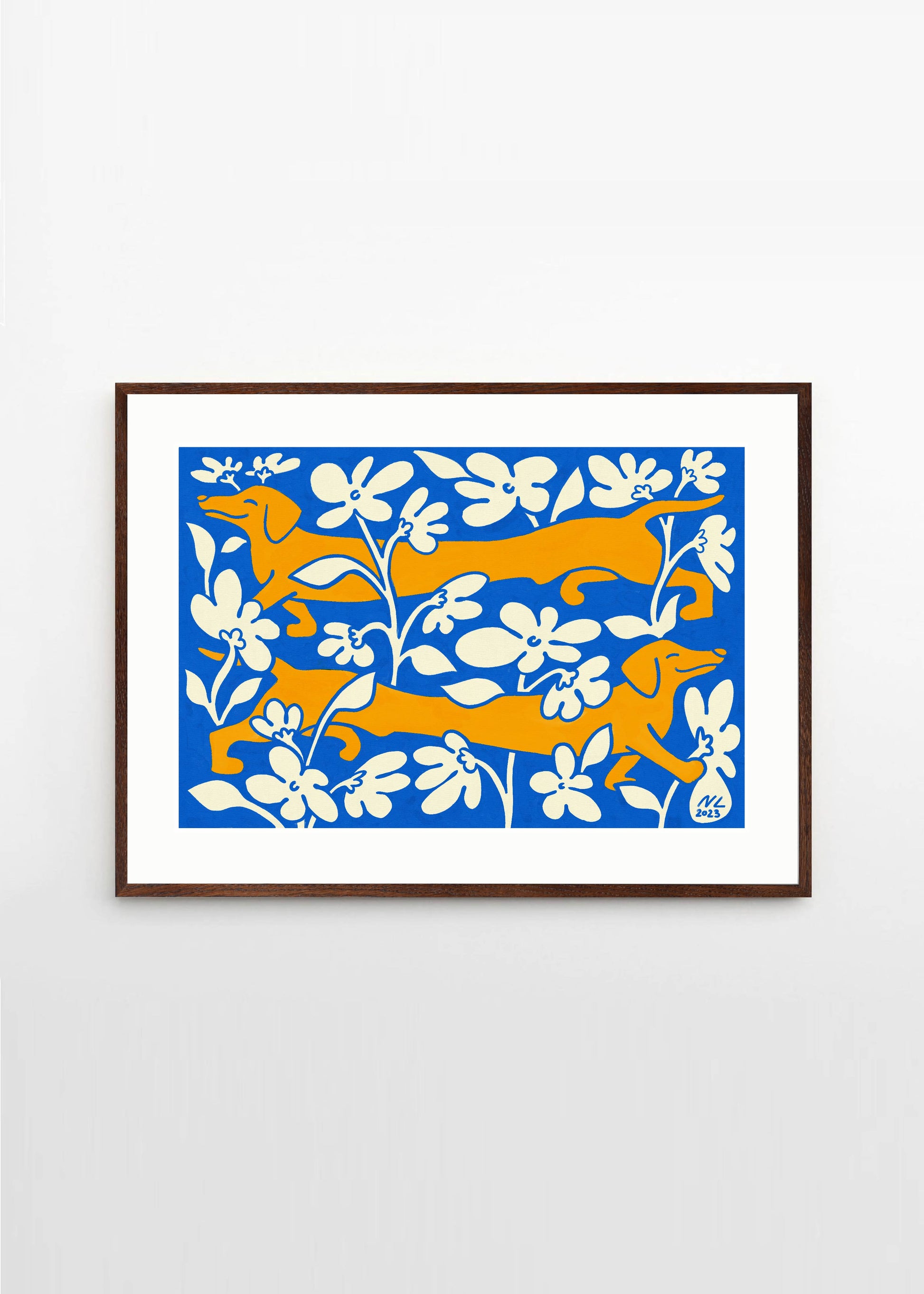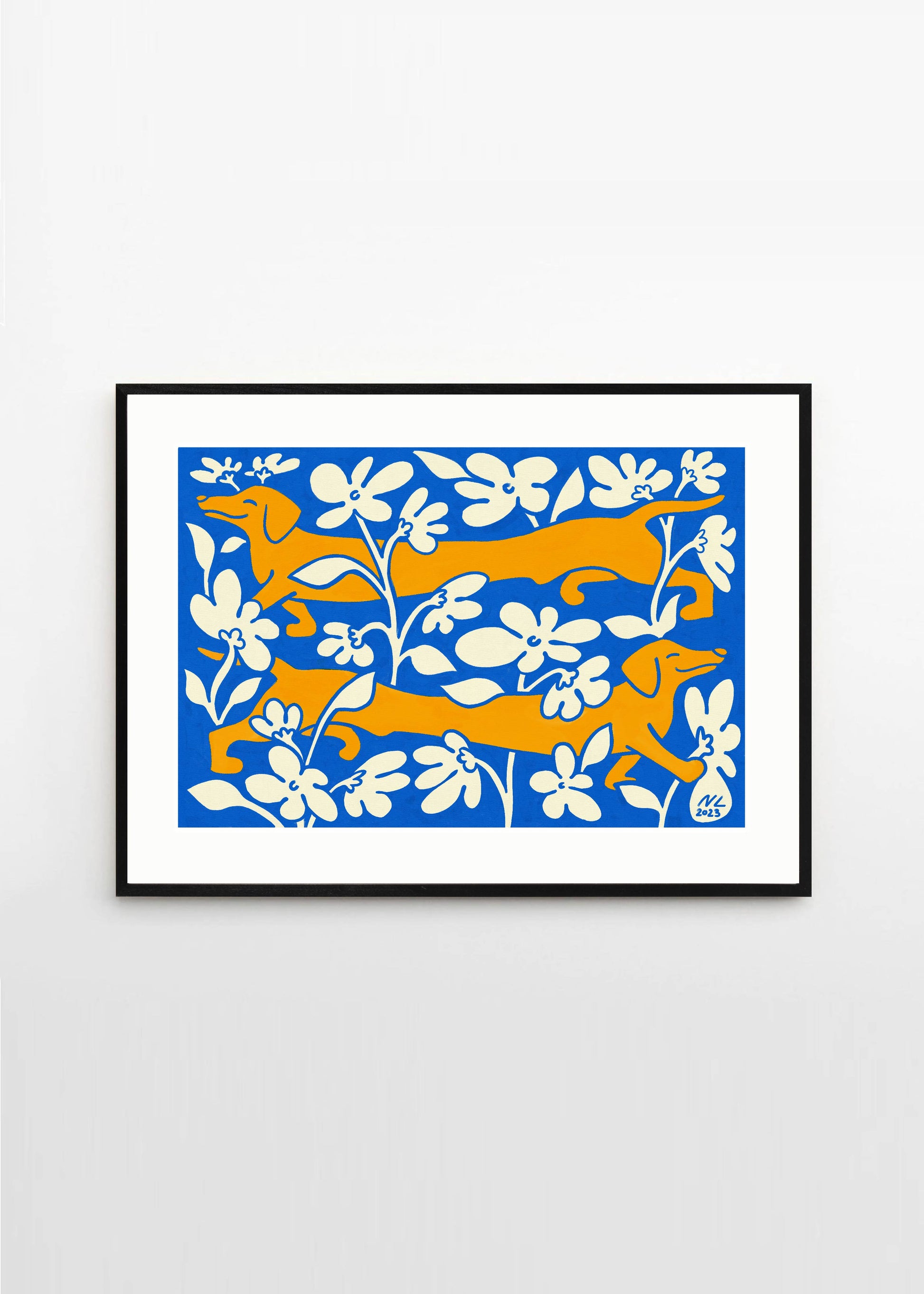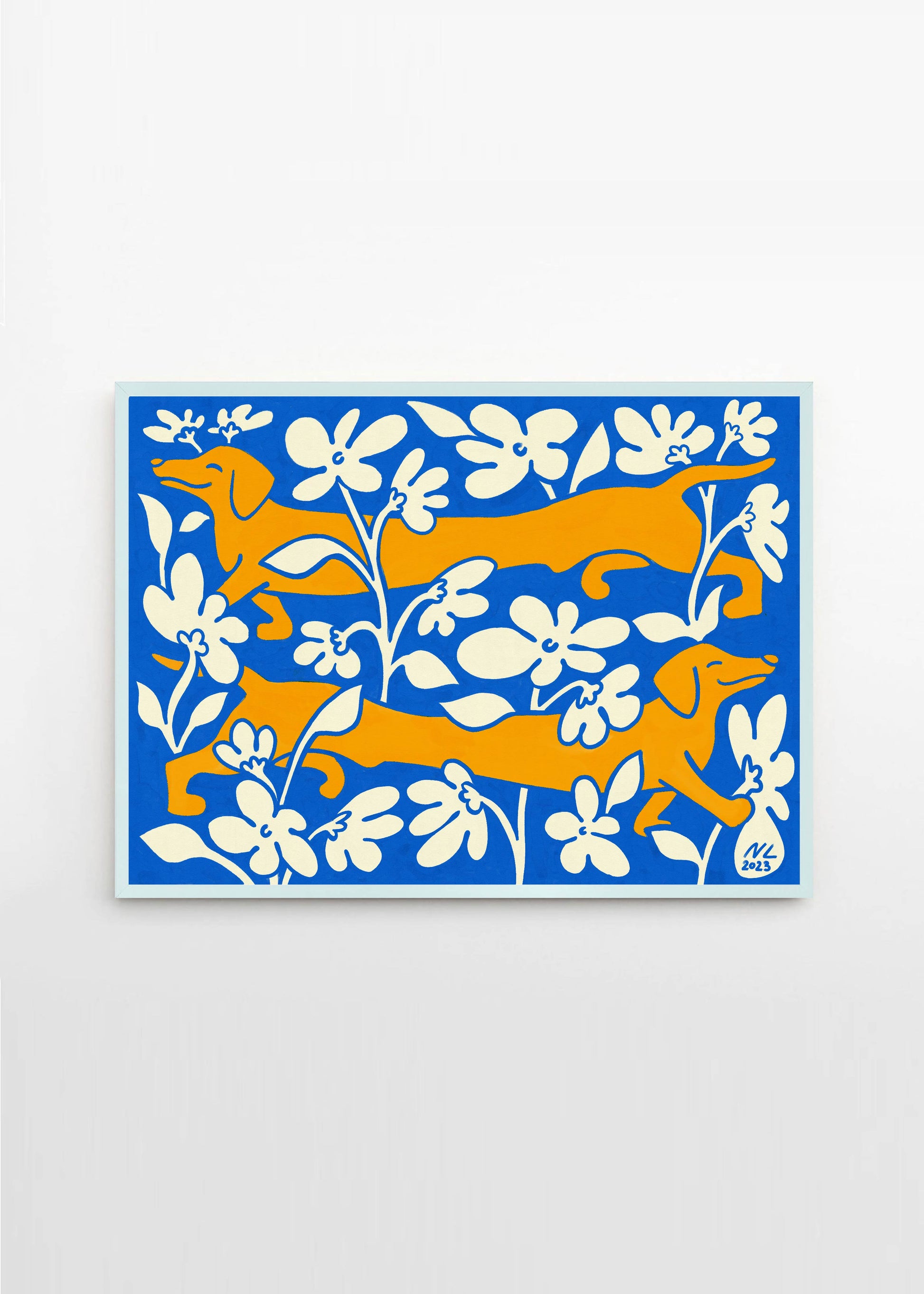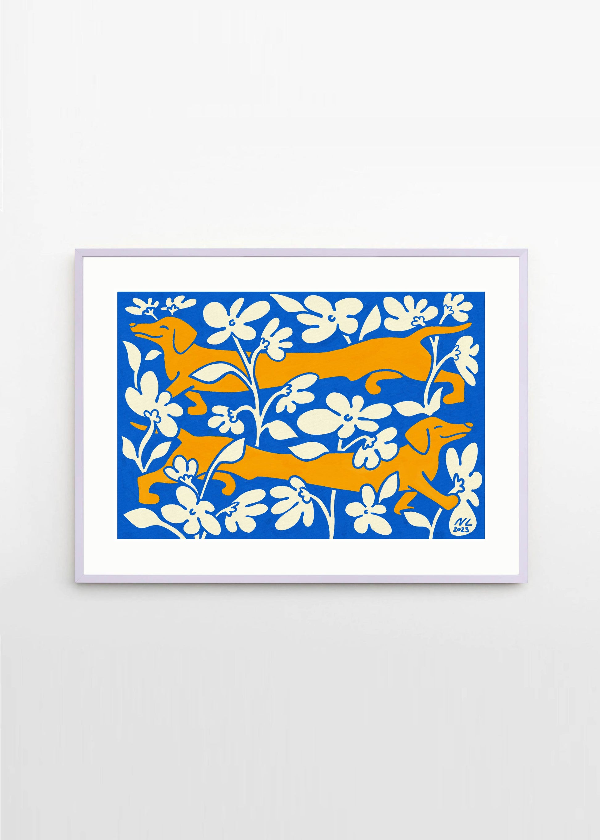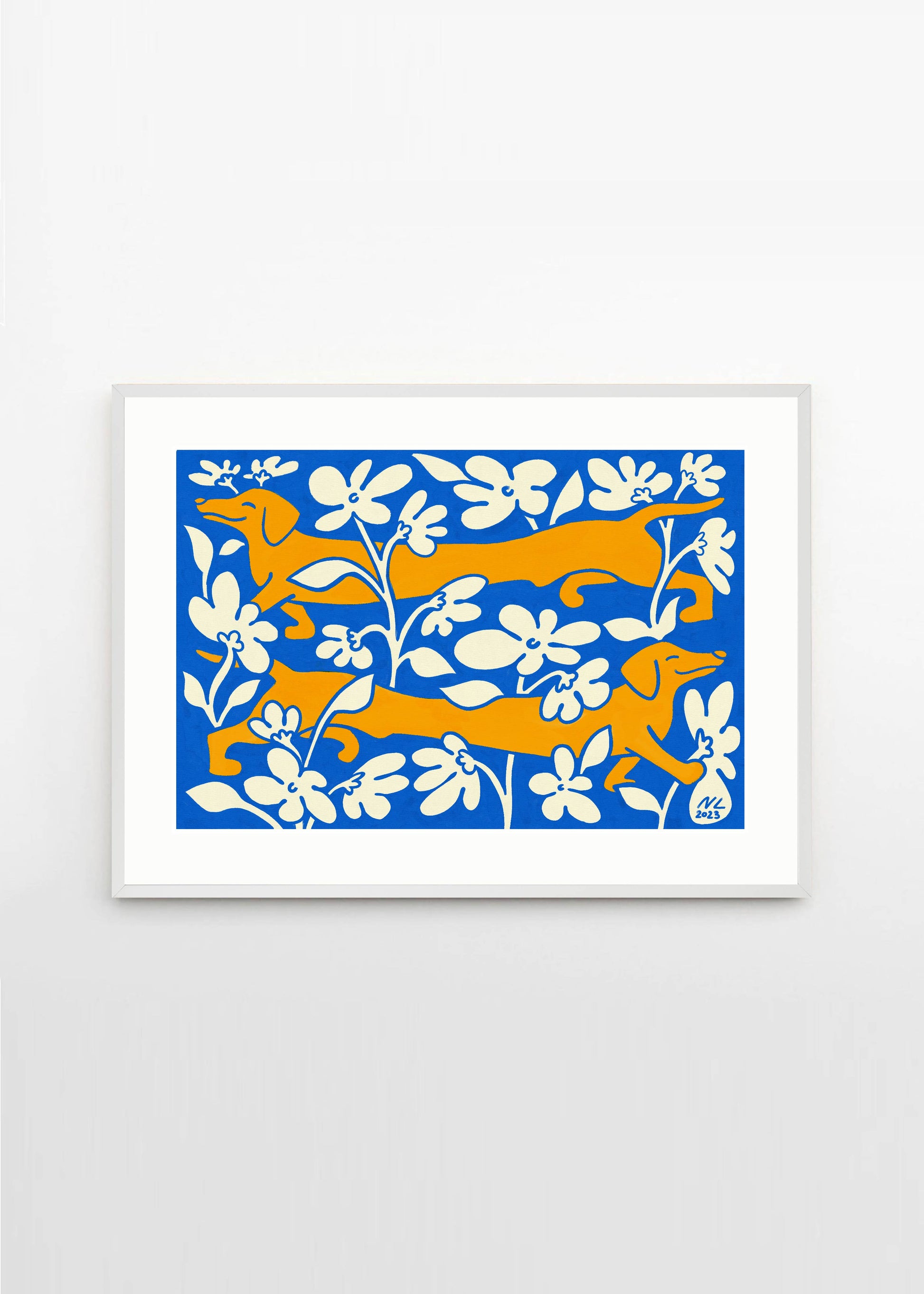 The landscape artwork Hund by Nellie Lindnér depicts two sausage dogs. The blue, white and yellow colors makes it perfect for a colored frame, with or without passepartout.