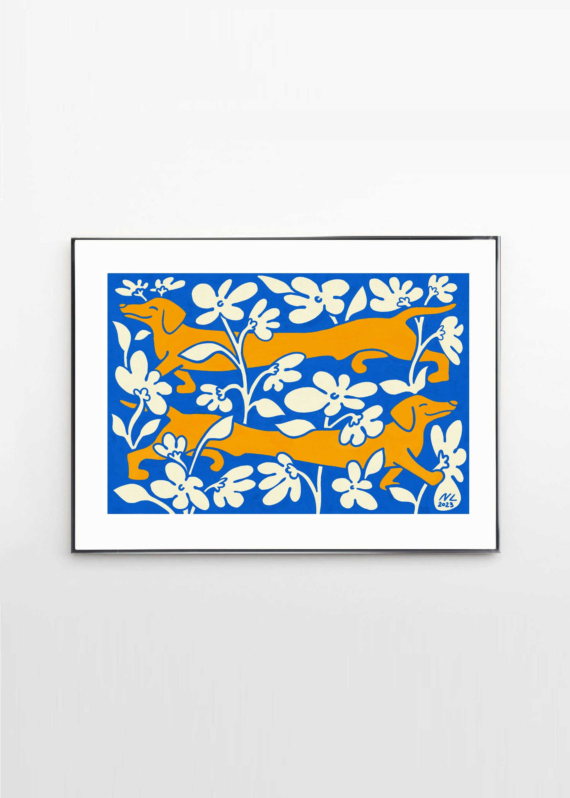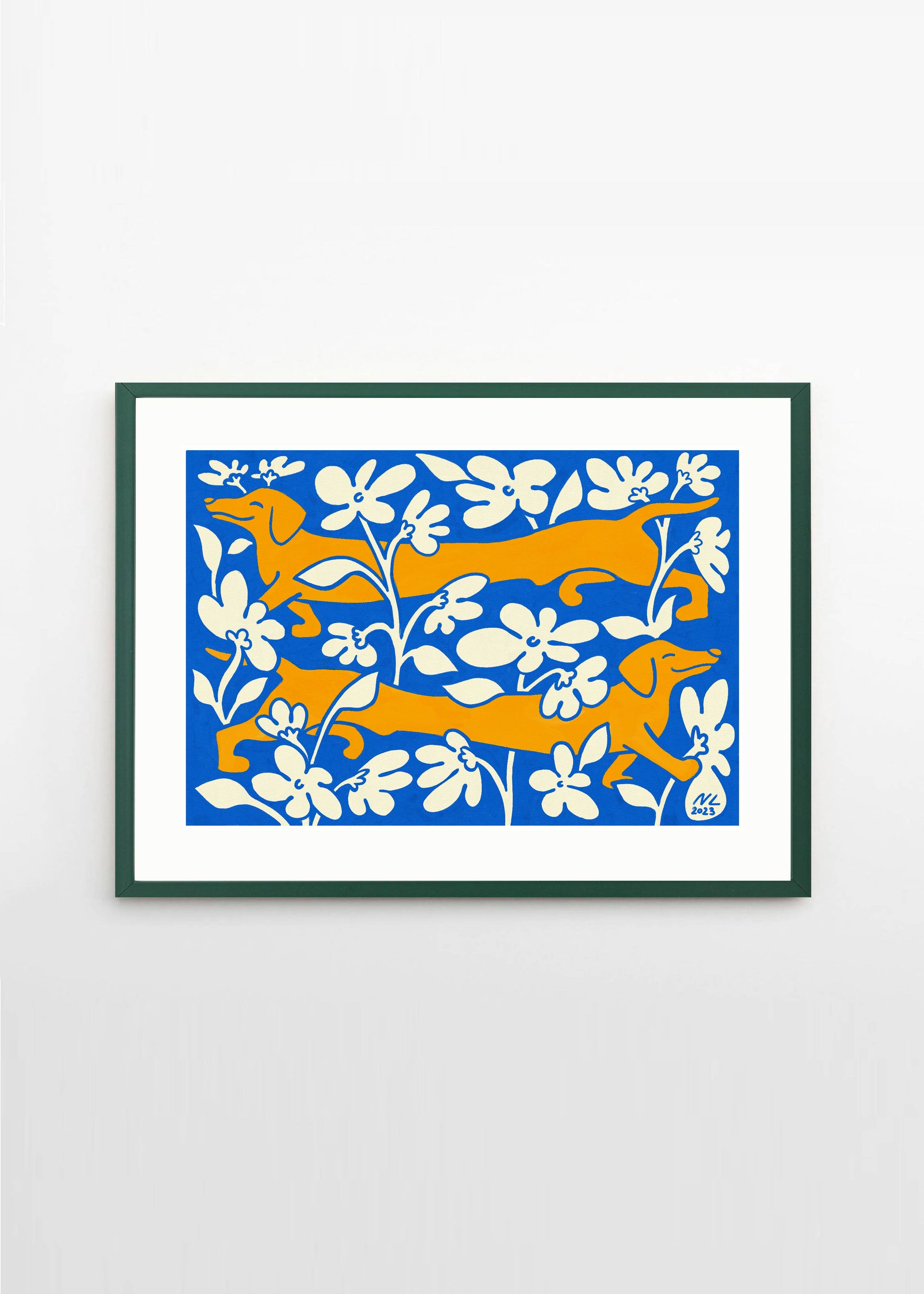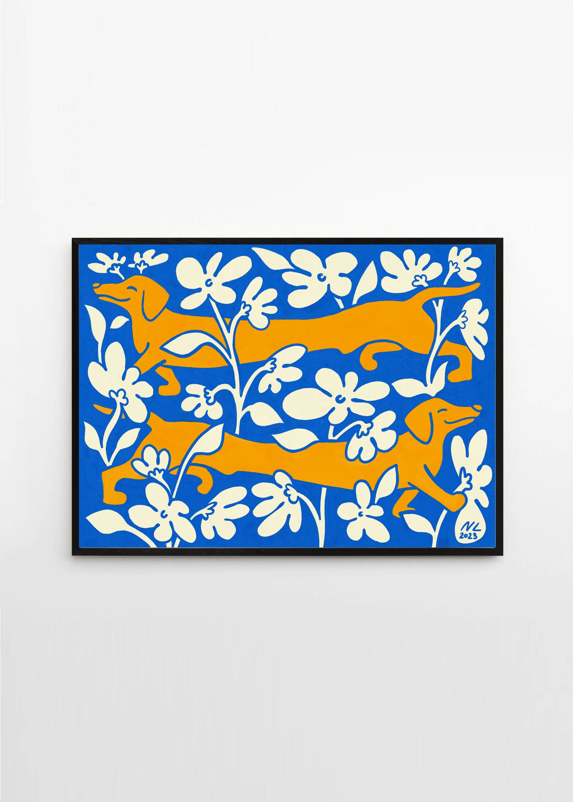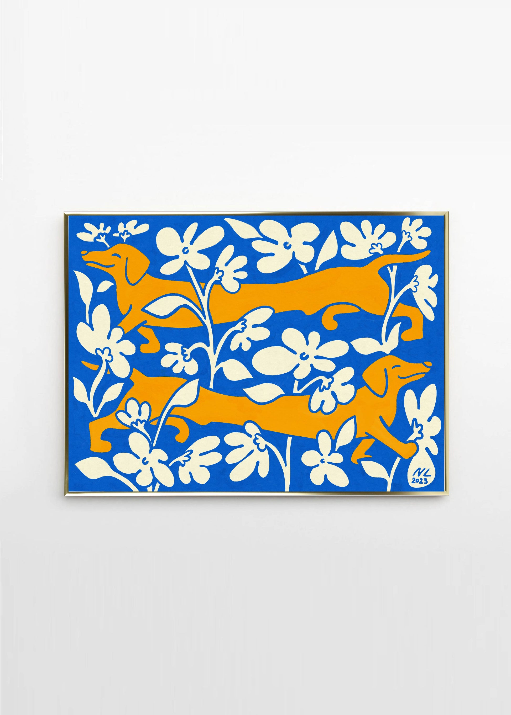 The landscape artwork Hund by Nellie Lindnér depicts two sausage dogs. The blue, white and yellow colors makes it perfect for a colored frame, with or without passepartout.