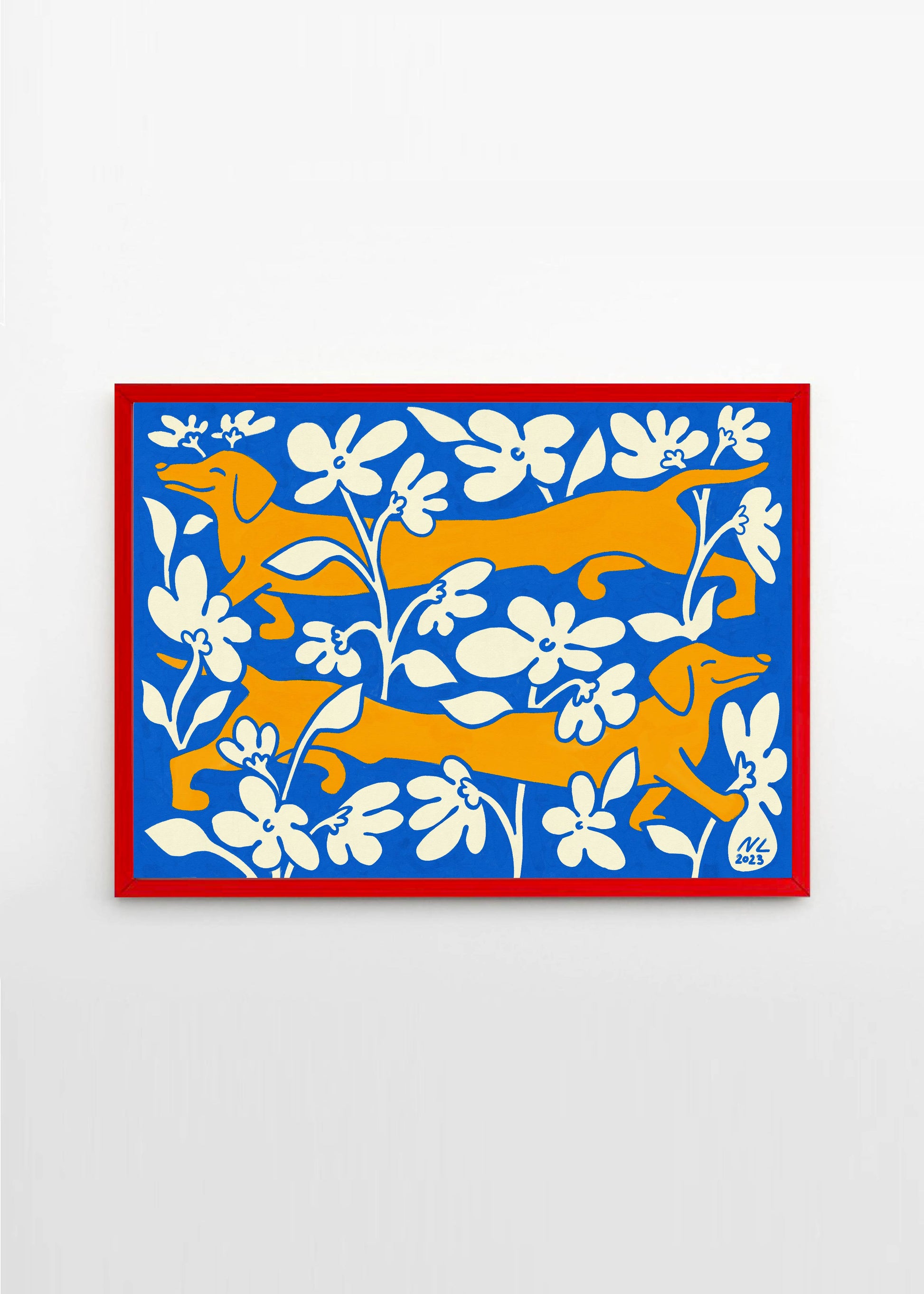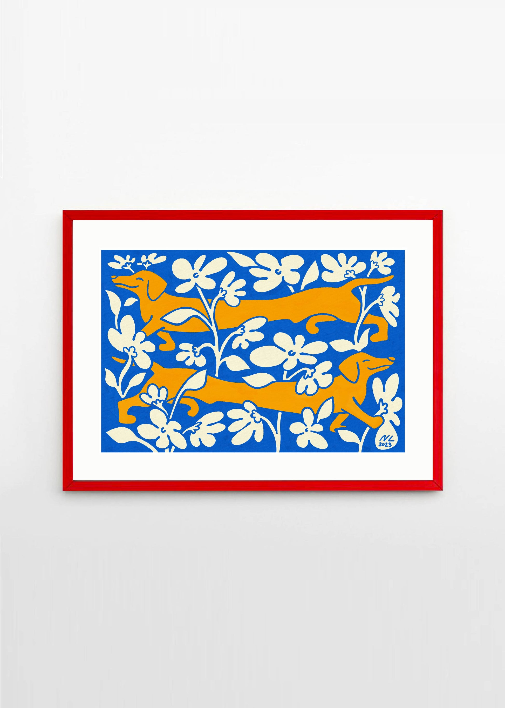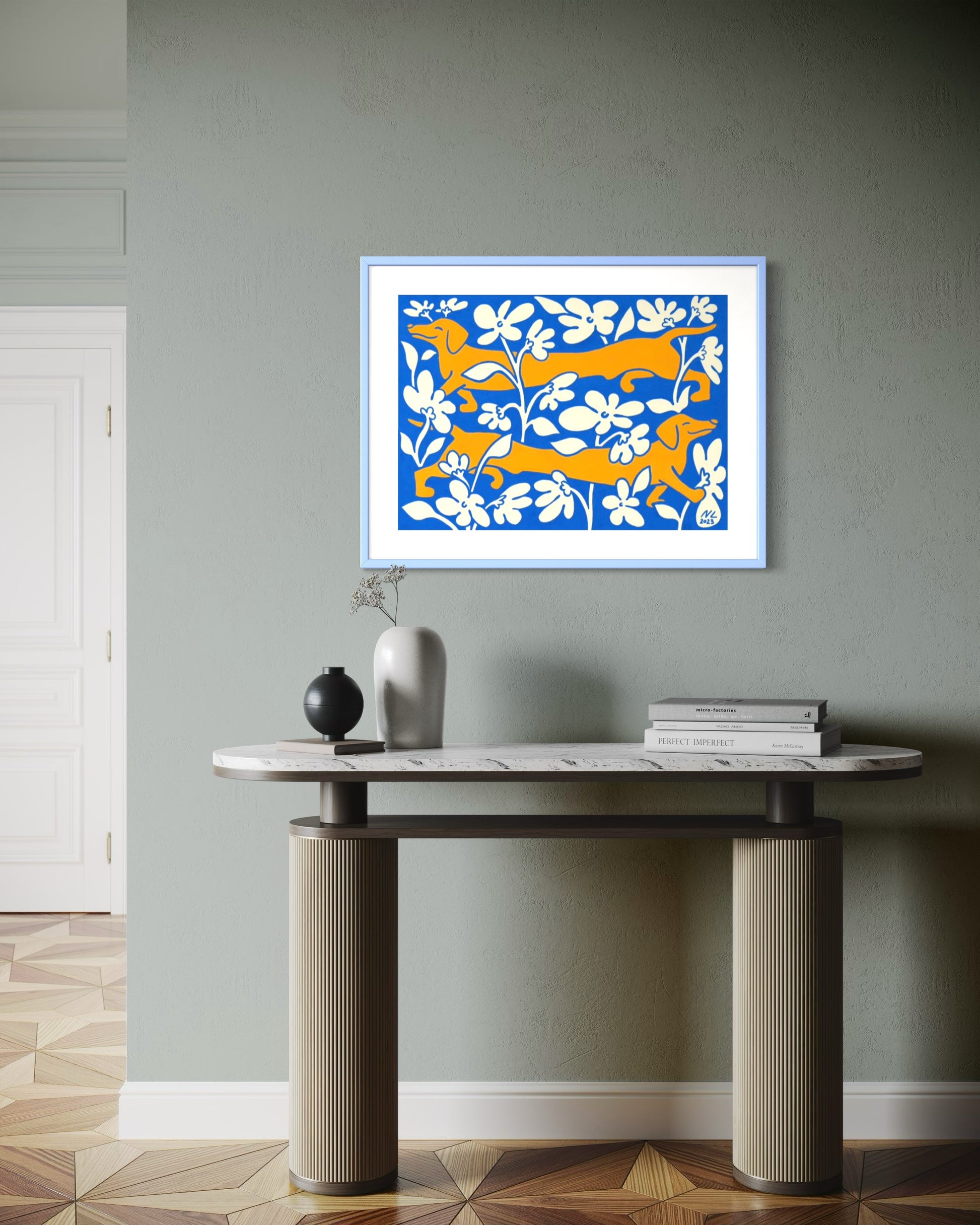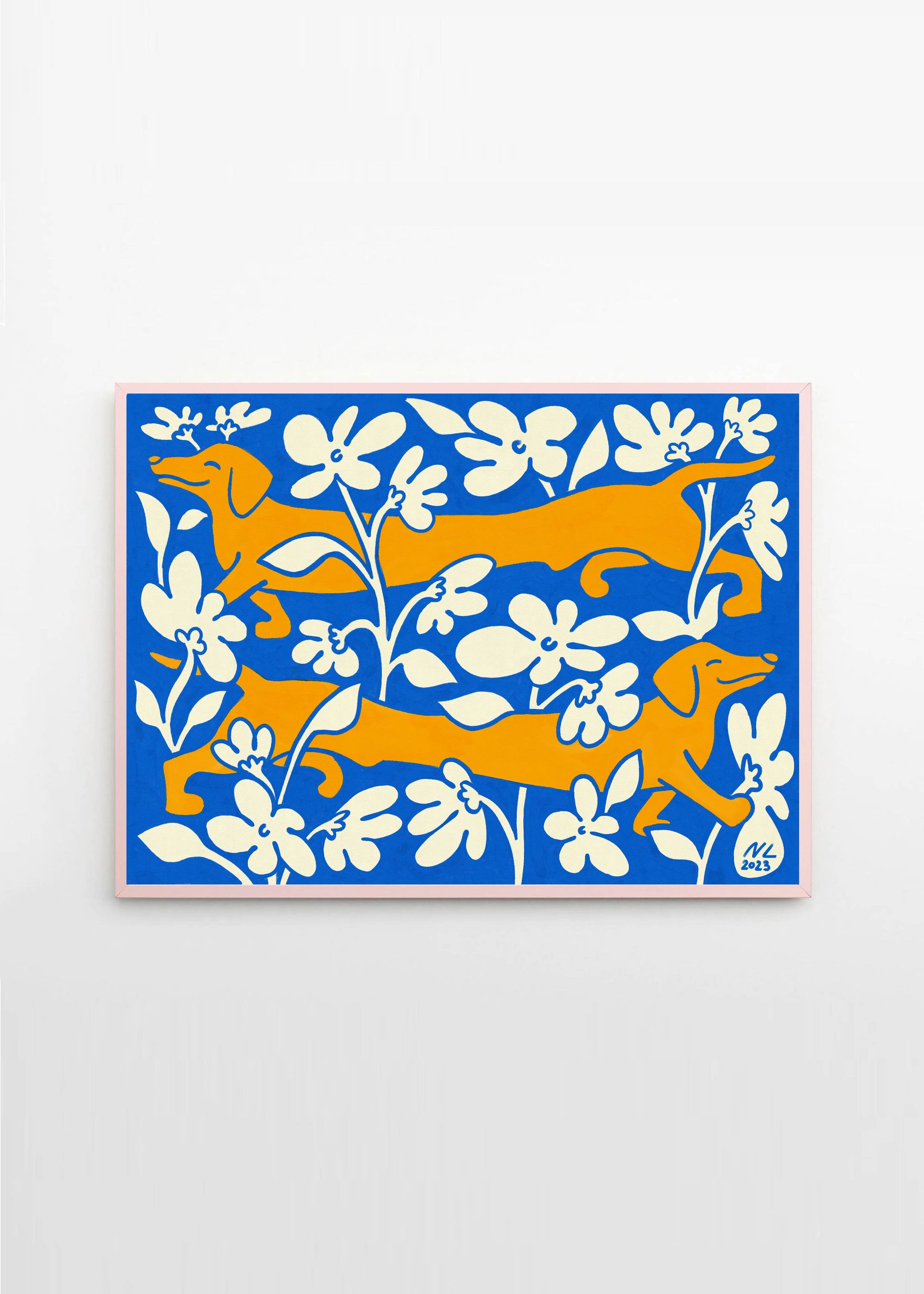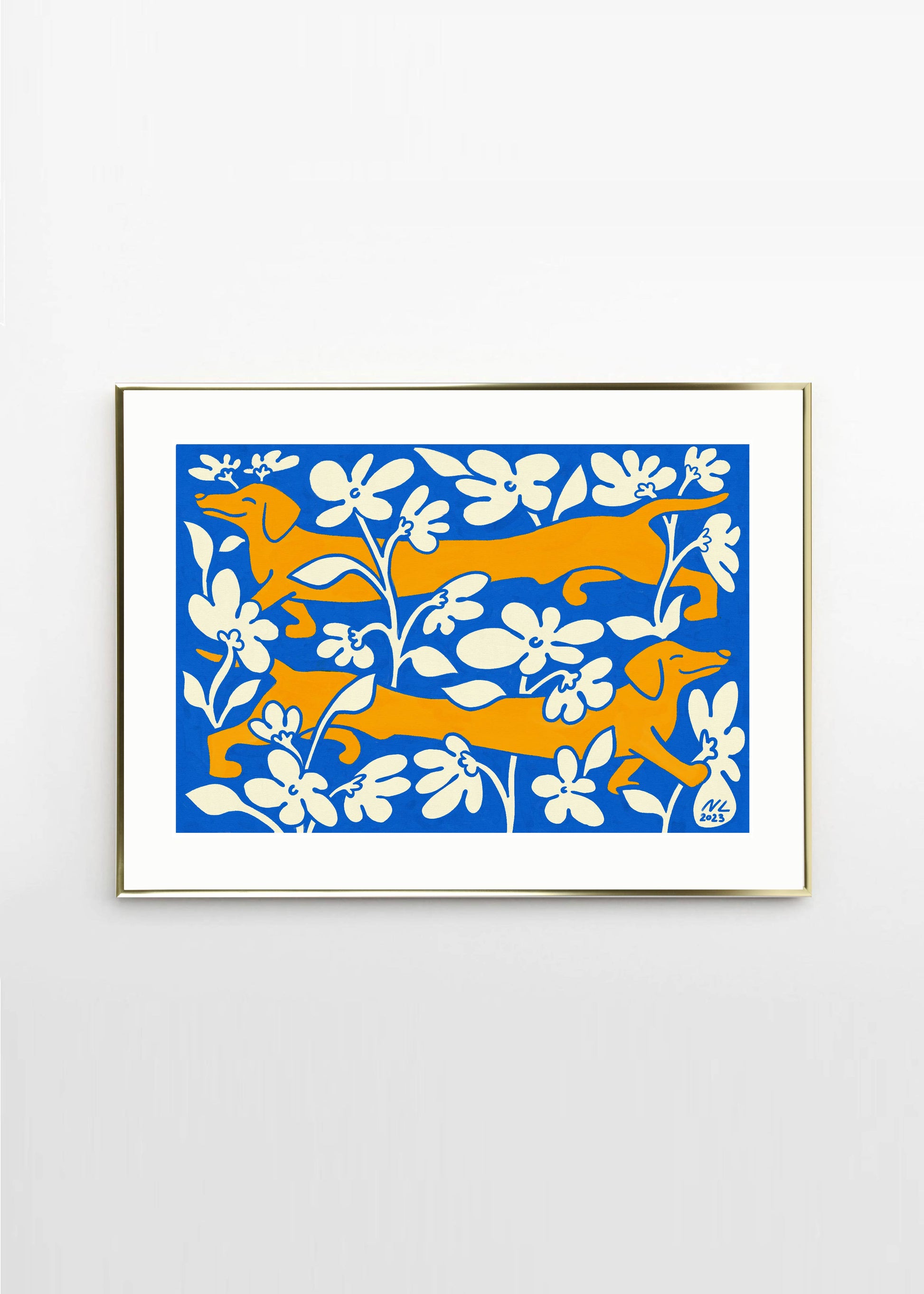 The landscape artwork Hund by Nellie Lindnér depicts two sausage dogs. The blue, white and yellow colors makes it perfect for a colored frame, with or without passepartout.