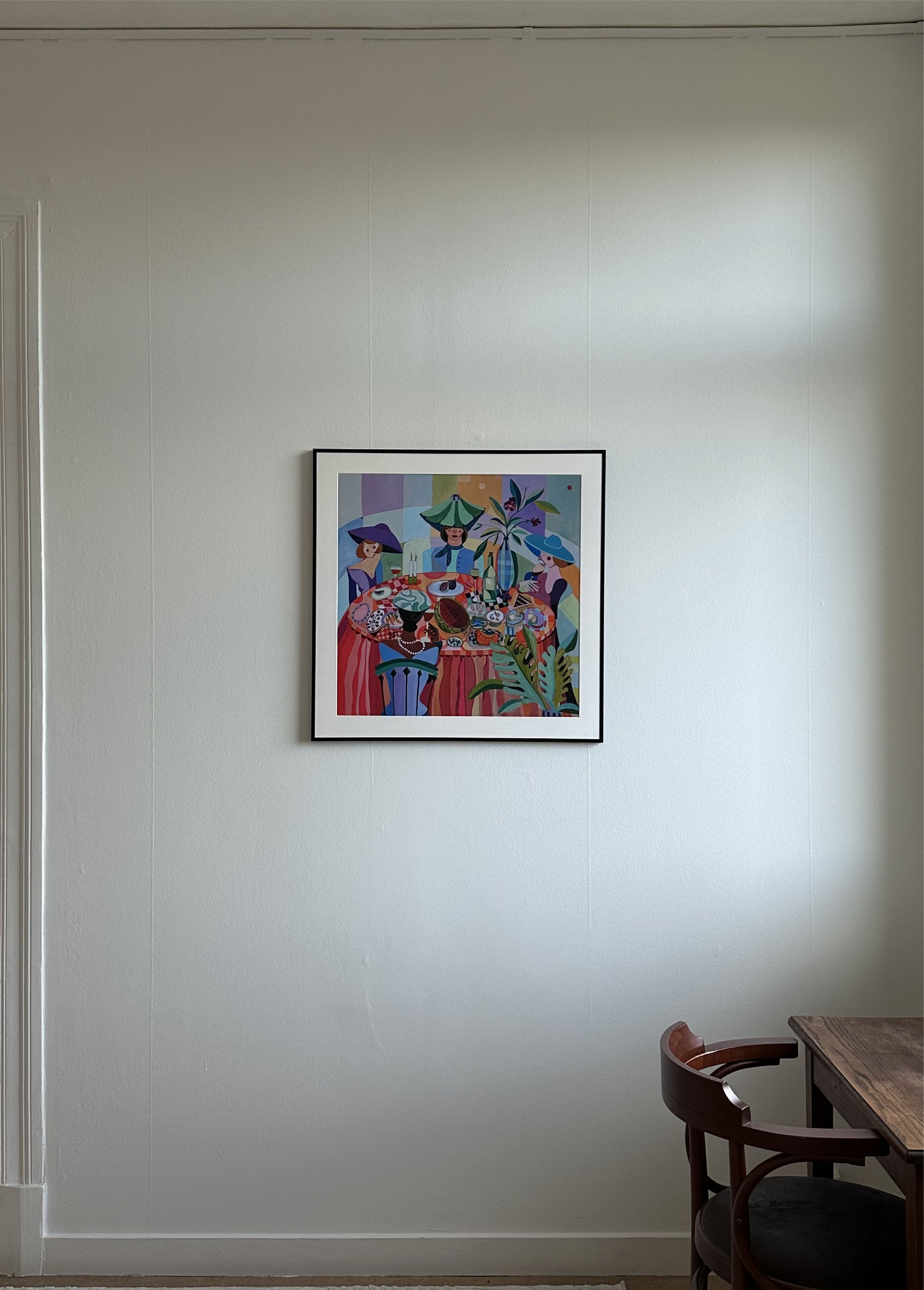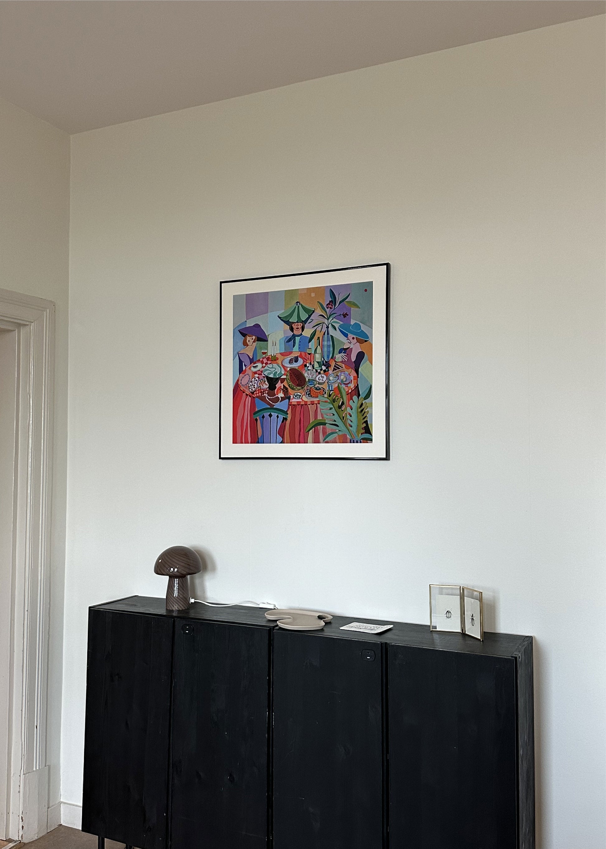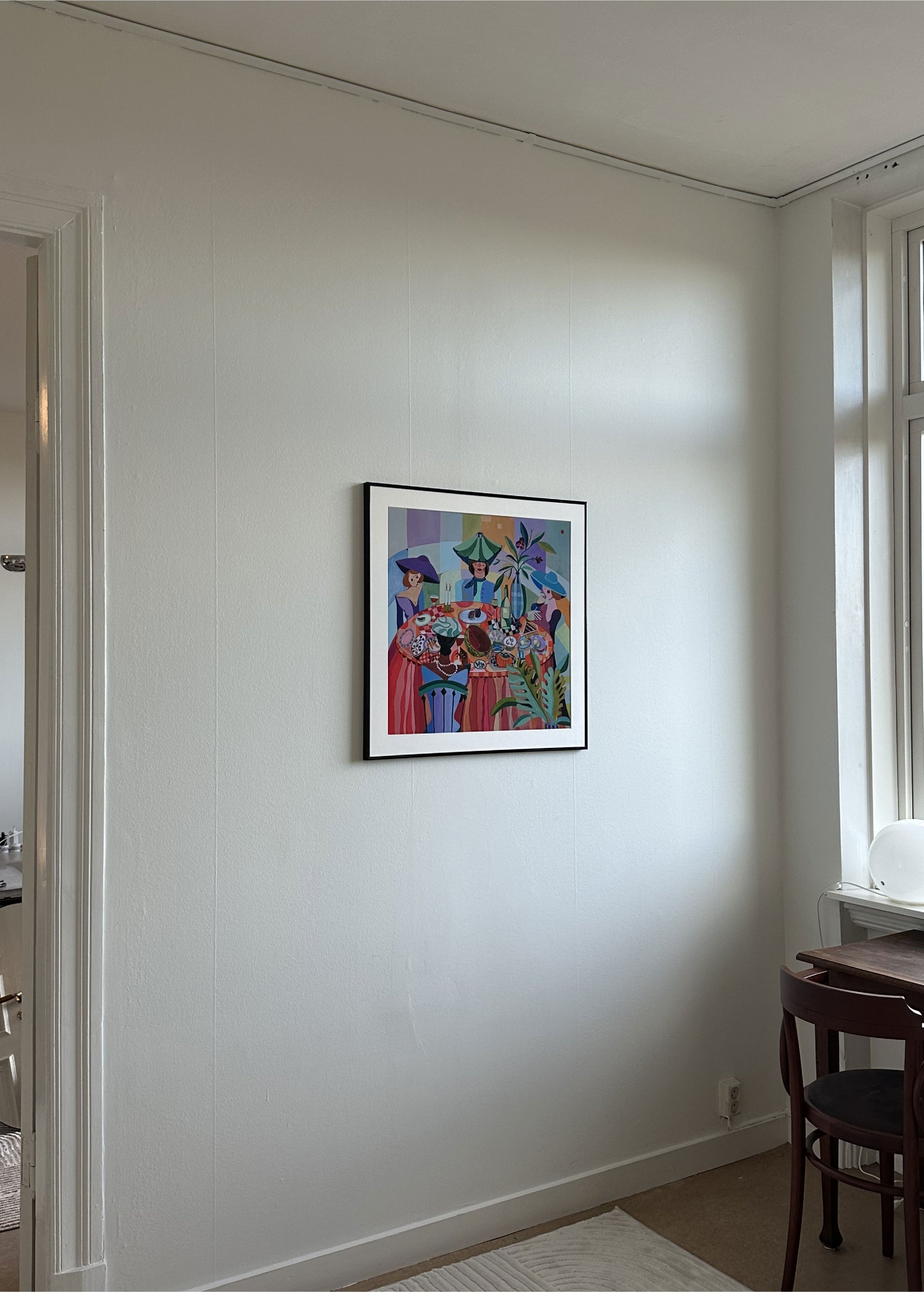 The square artwork Big Baby by Oscar Berg depicts an illustration of a boy in his LA vibe room. The black, brown and blue colors makes it perfect for a walnut or black frame.