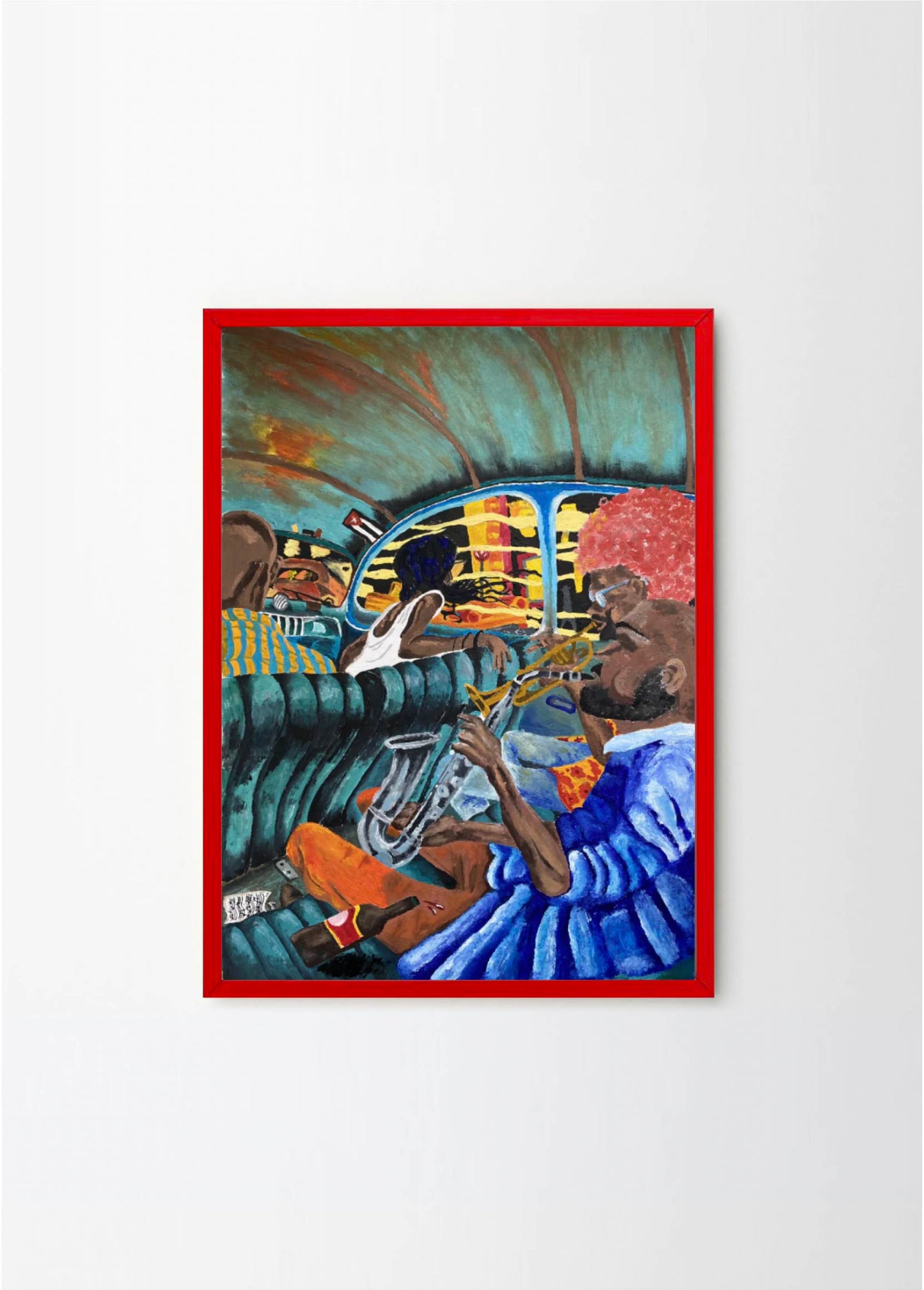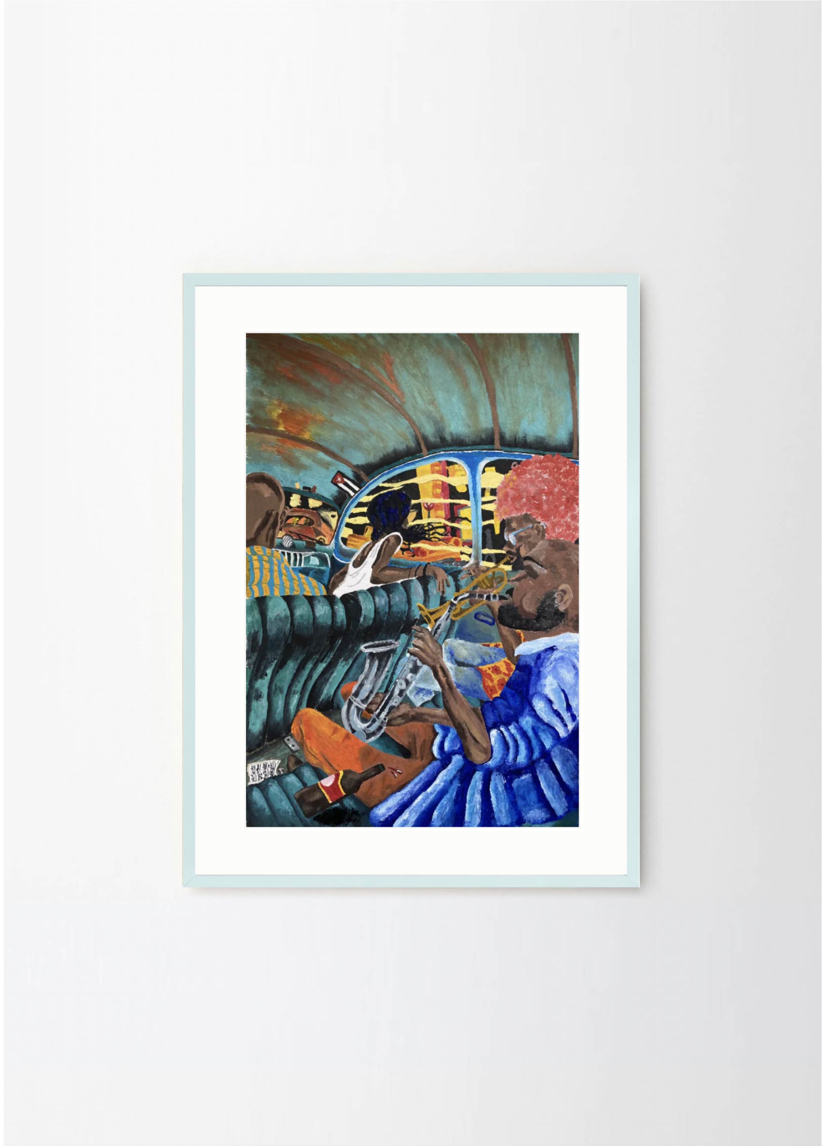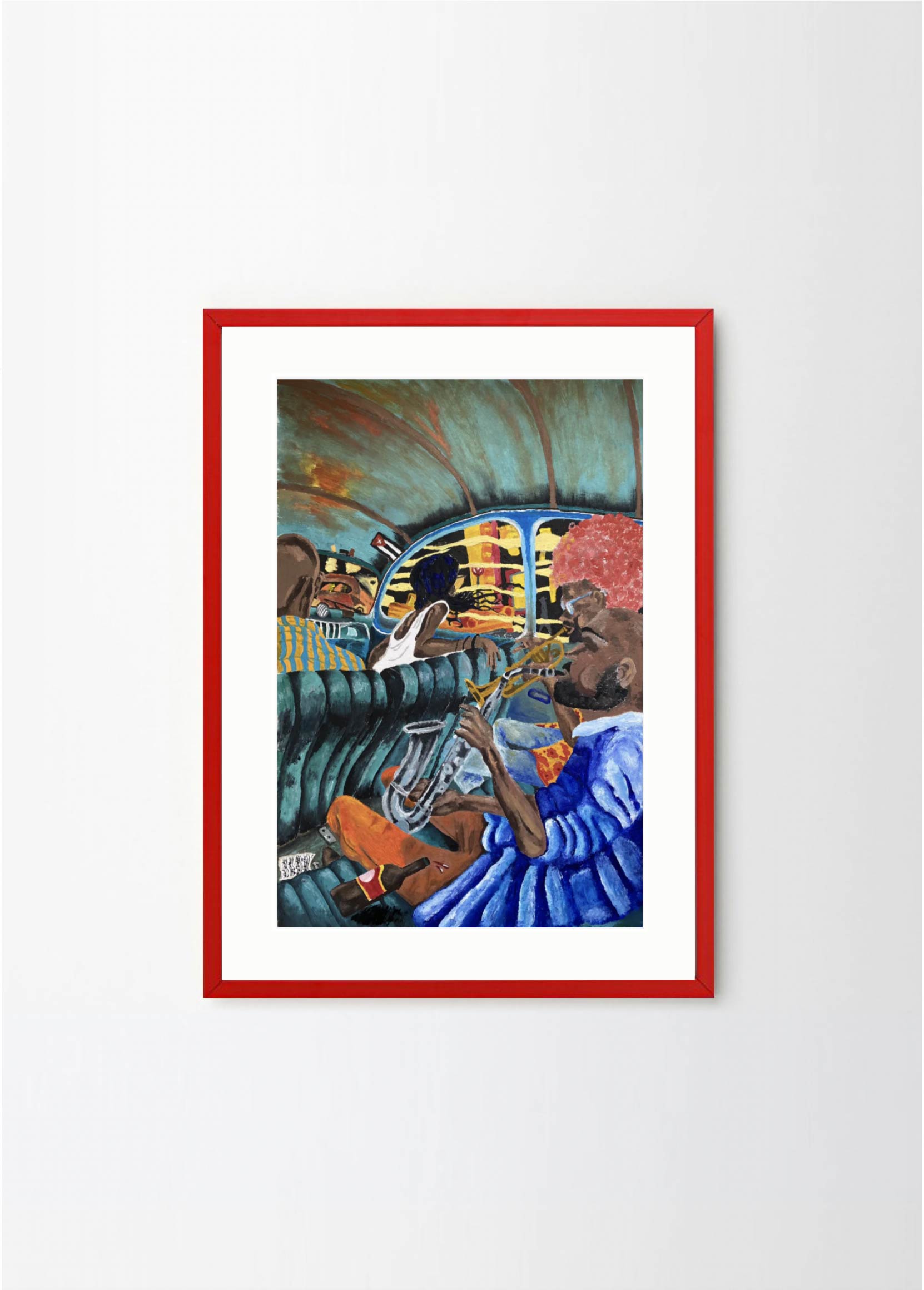 The artwork Jazz Ride by Minja Ajo depicts a blue, red and brown illustration of musicians playing in the back seat of a car.. The colors makes it perfect for a walnut or blue colored frame, with or without passepartout.